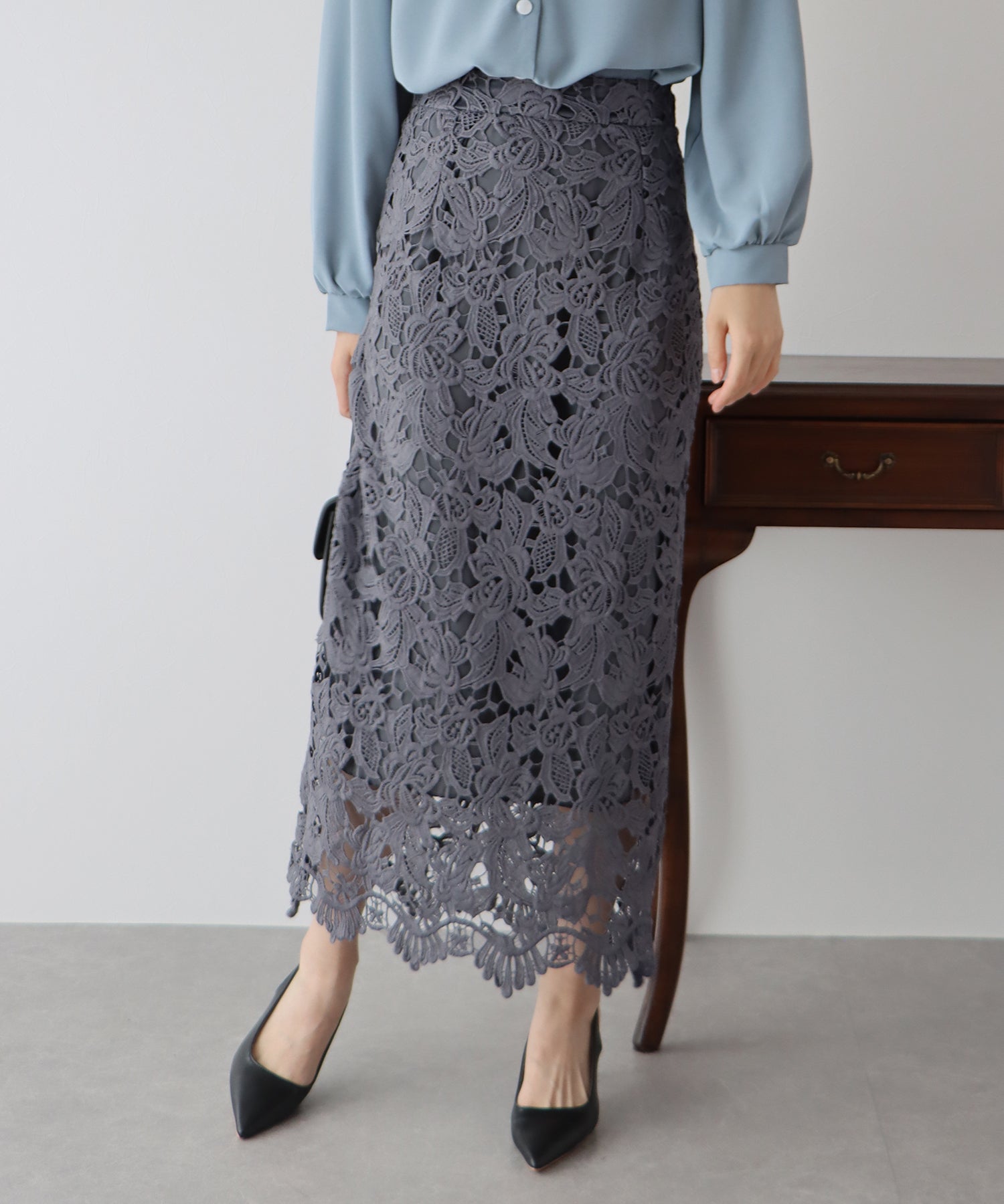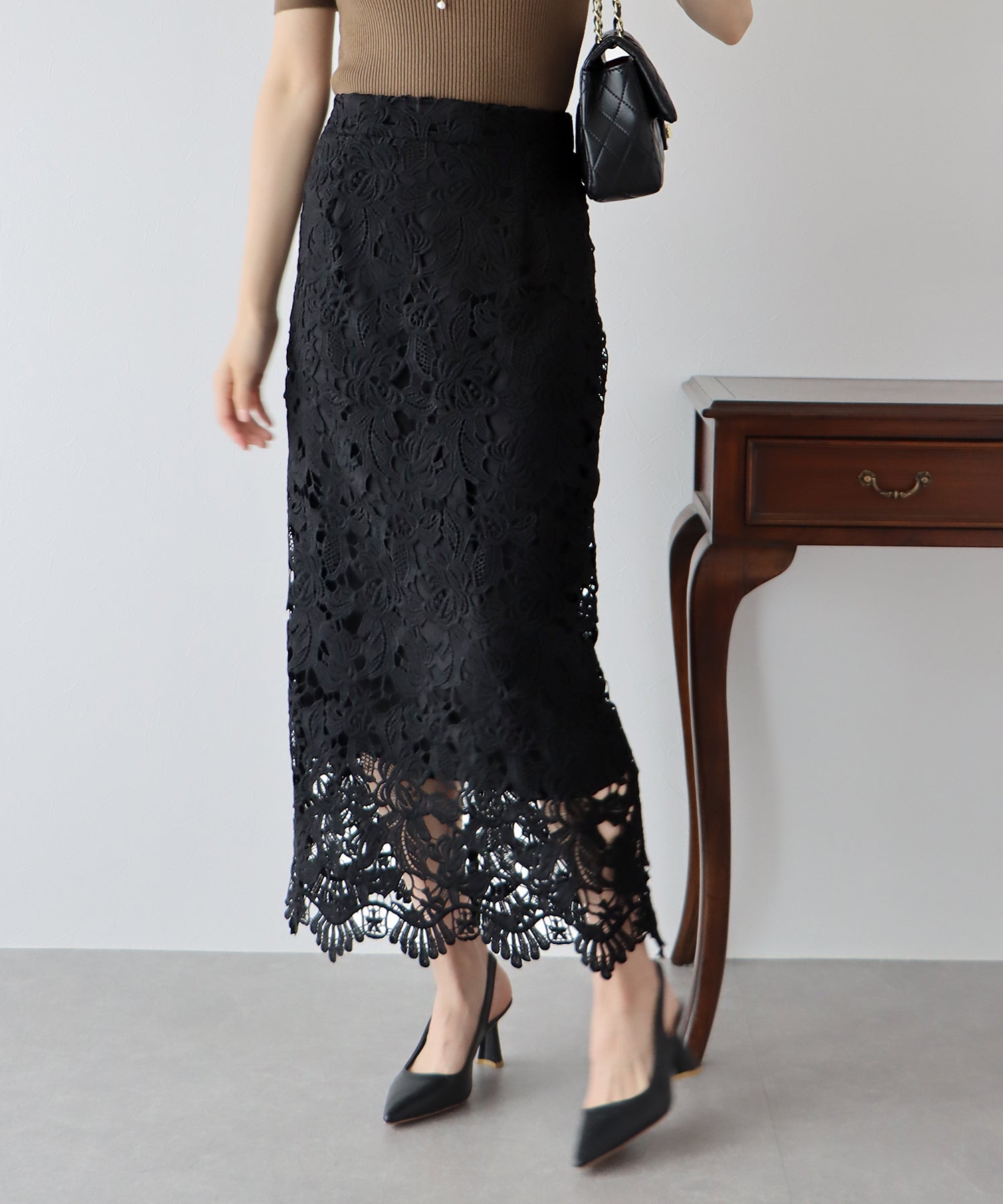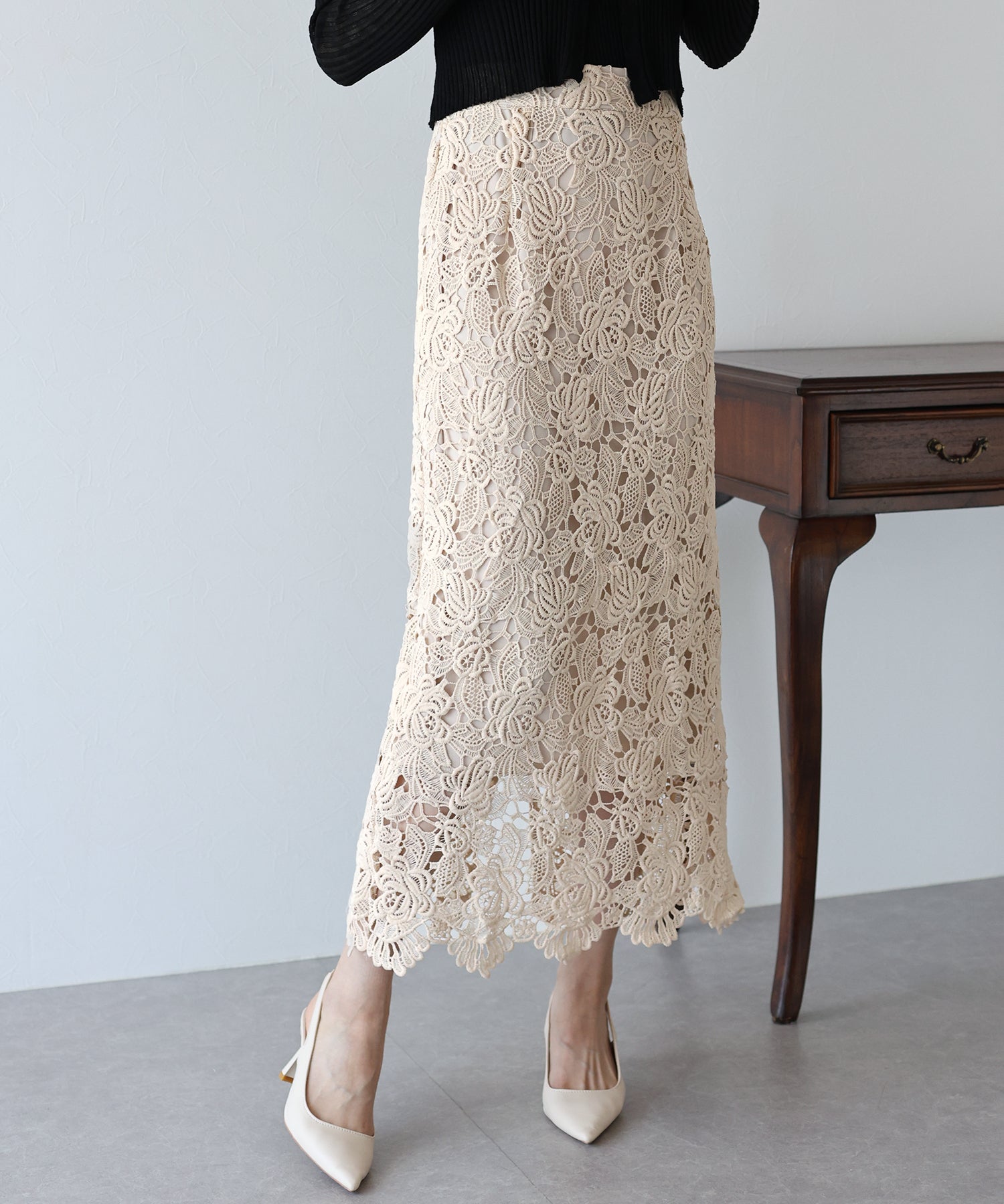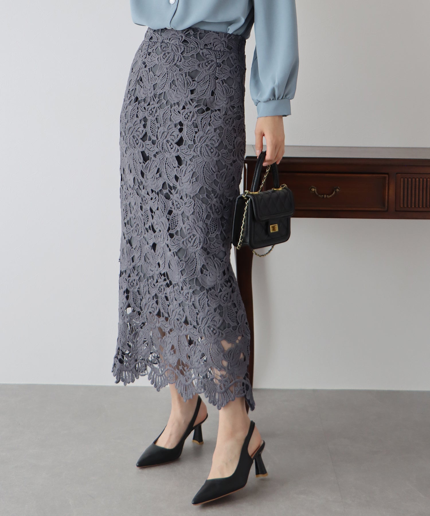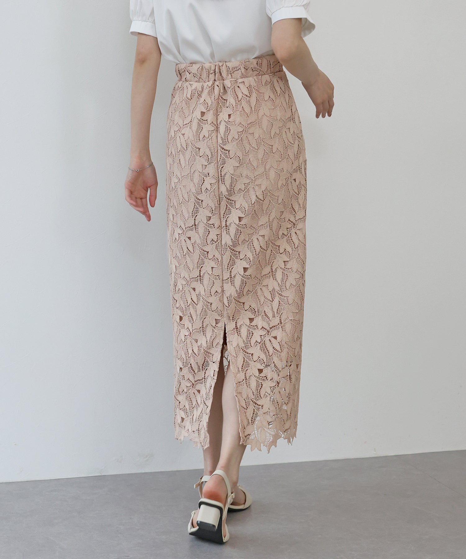 ?POINT 大人っぽく着こなせるタイトラインの総レーススカート。 ウエストはゴムが入っているので着心地も良く、 すっきりとしたIライン&ハイウエストで美脚効果&腰回りのラインもカバーしてくれます。 裾はレースの雰囲気を活かした透け感のあるスカラップで軽やかな足元に。ON/OFF問わず着まわせる万能アイテムです。