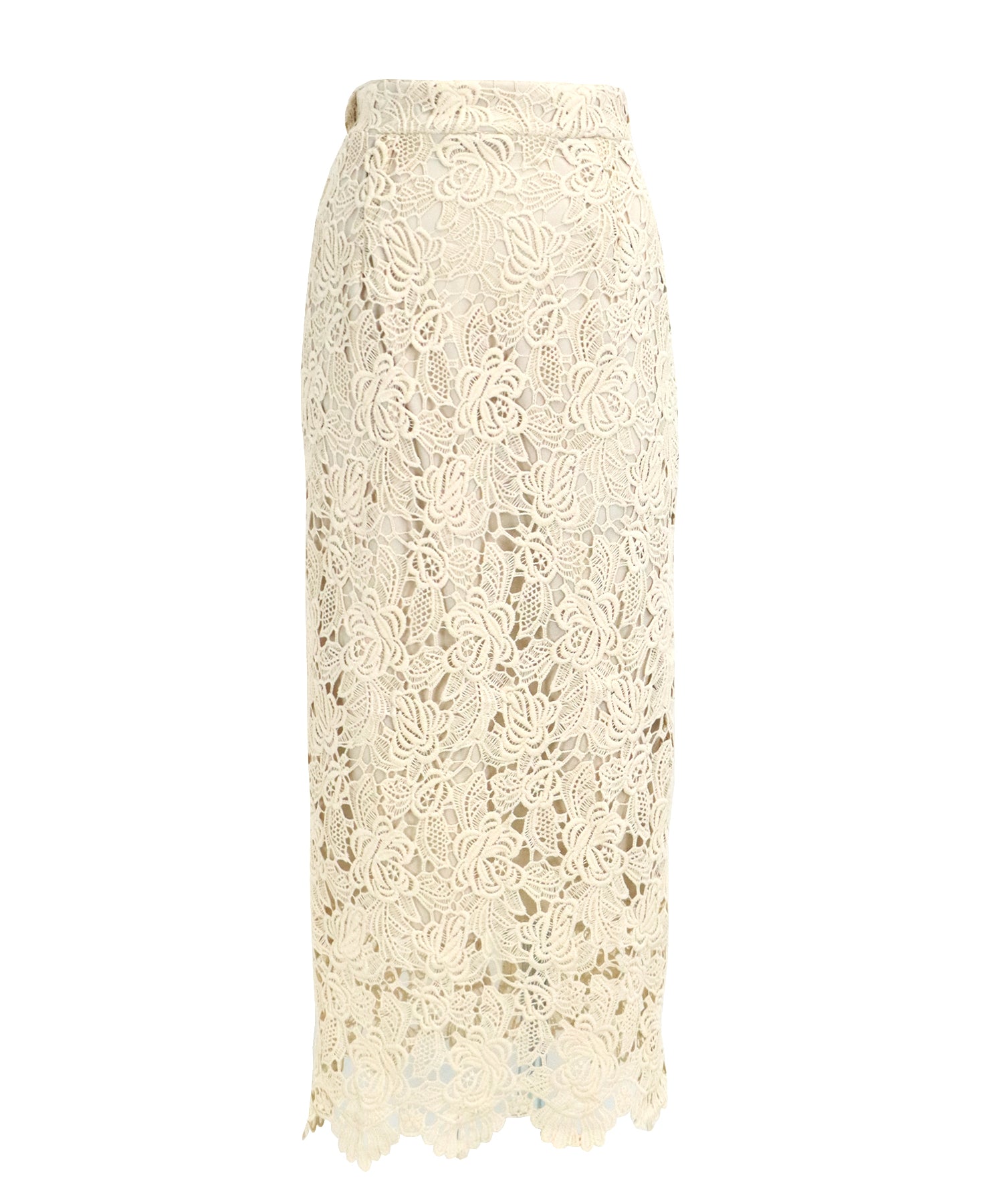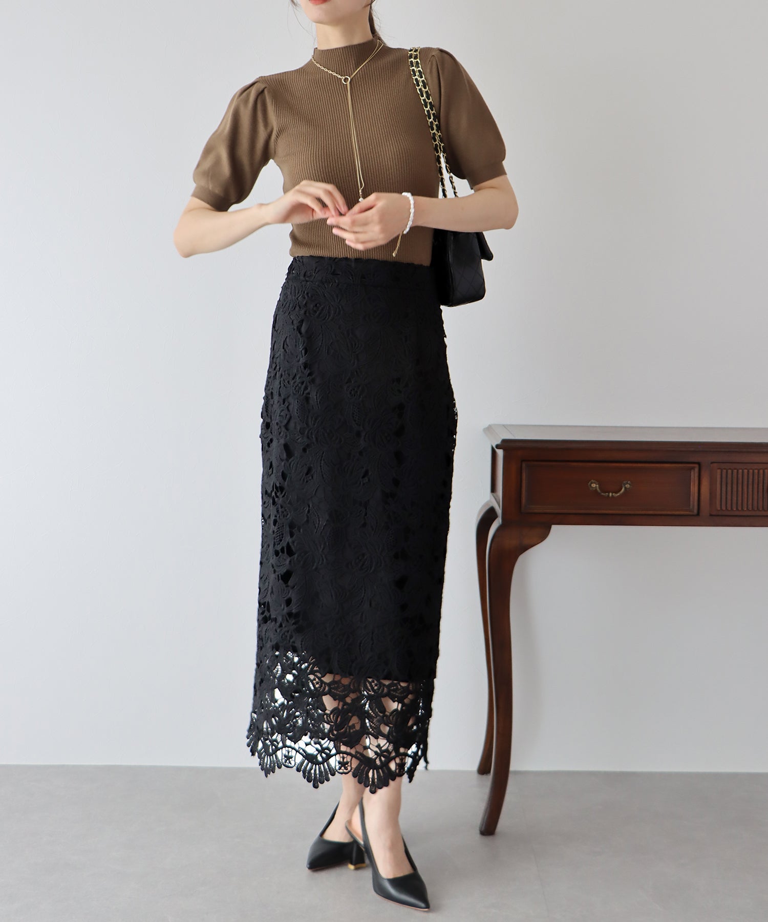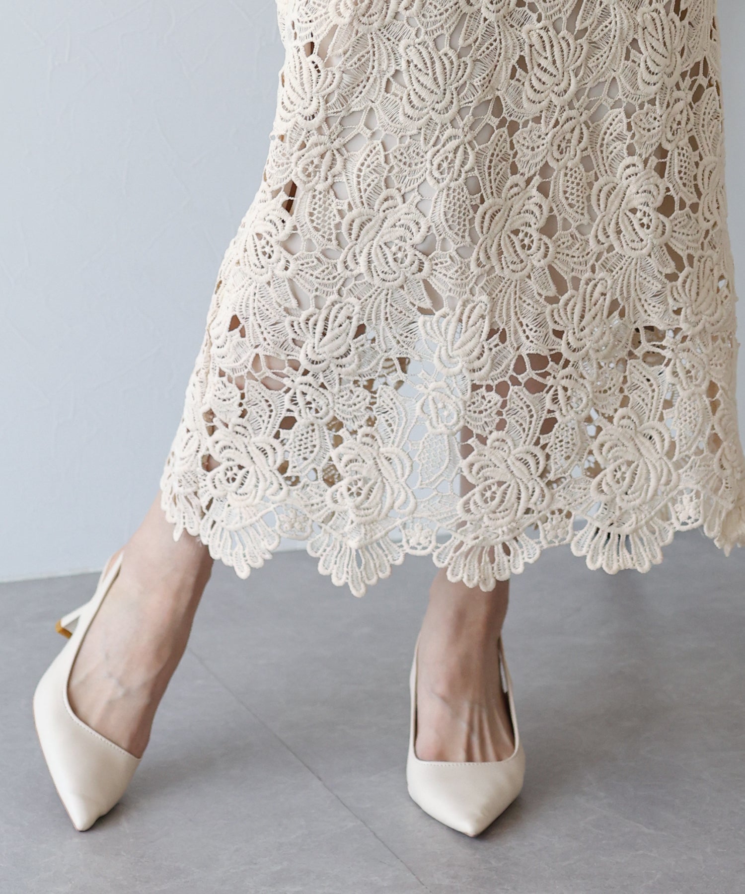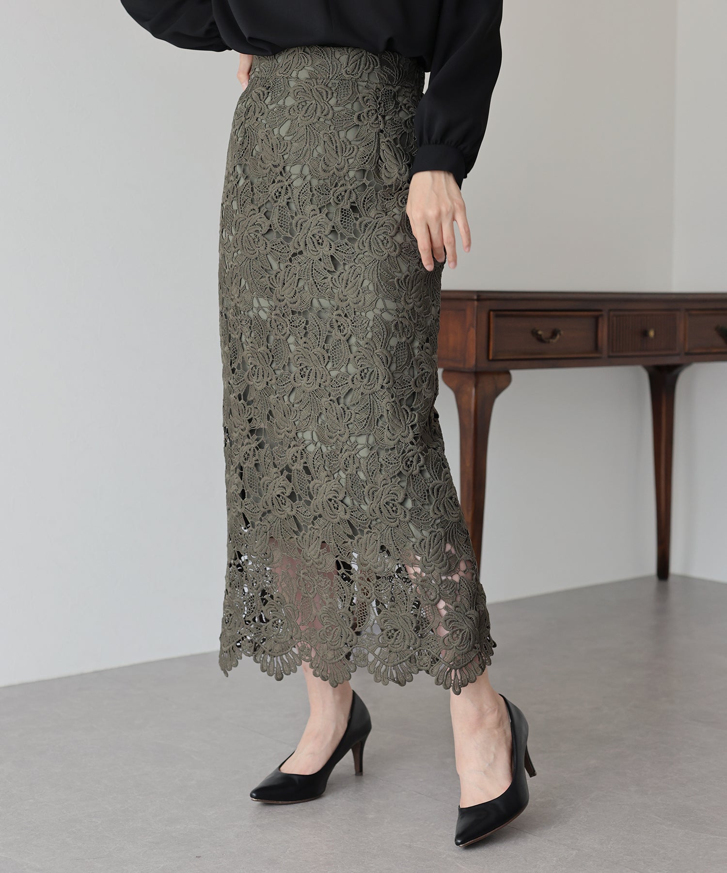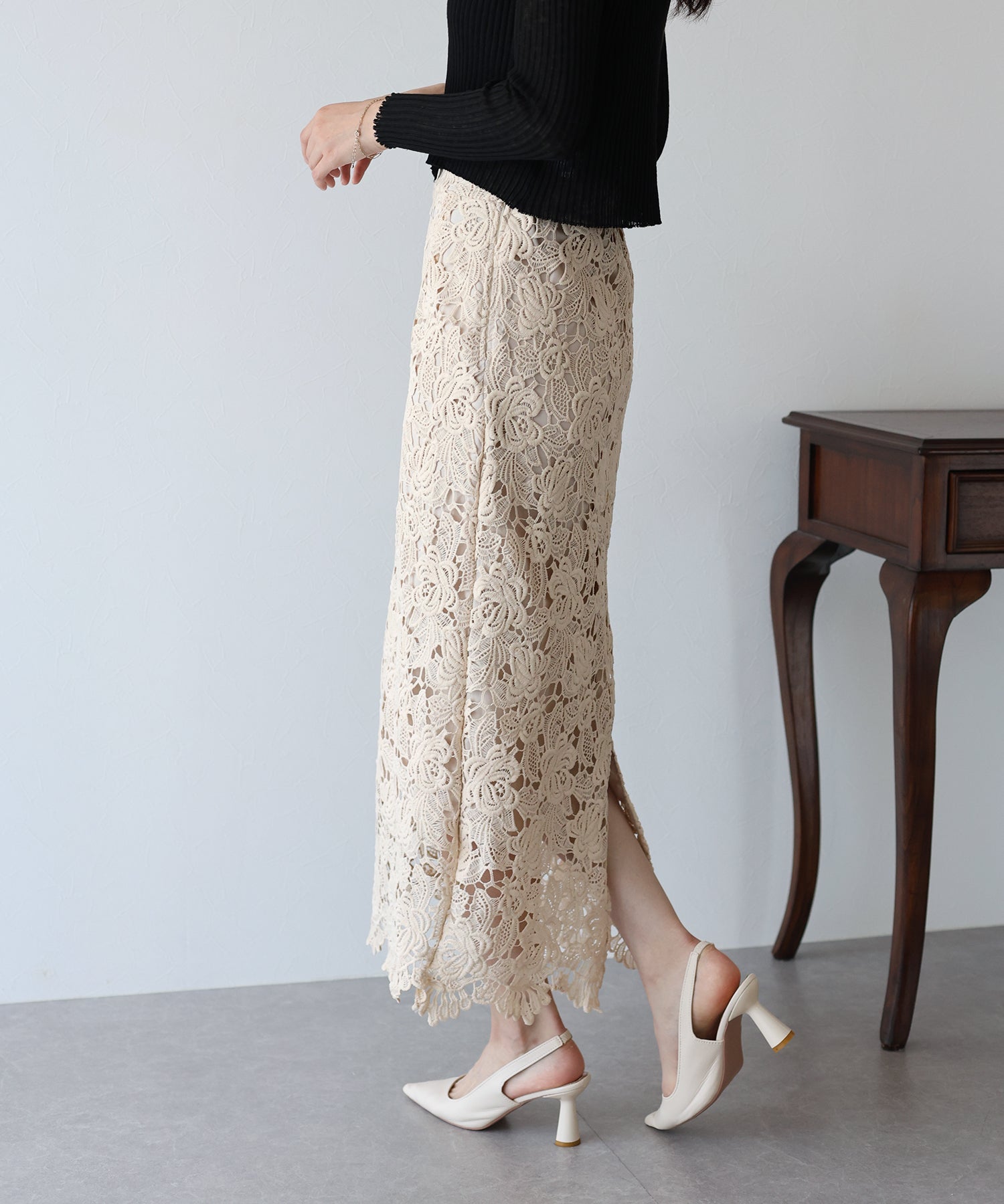 ?POINT 大人っぽく着こなせるタイトラインの総レーススカート。 ウエストはゴムが入っているので着心地も良く、 すっきりとしたIライン&ハイウエストで美脚効果&腰回りのラインもカバーしてくれます。 裾はレースの雰囲気を活かした透け感のあるスカラップで軽やかな足元に。ON/OFF問わず着まわせる万能アイテムです。