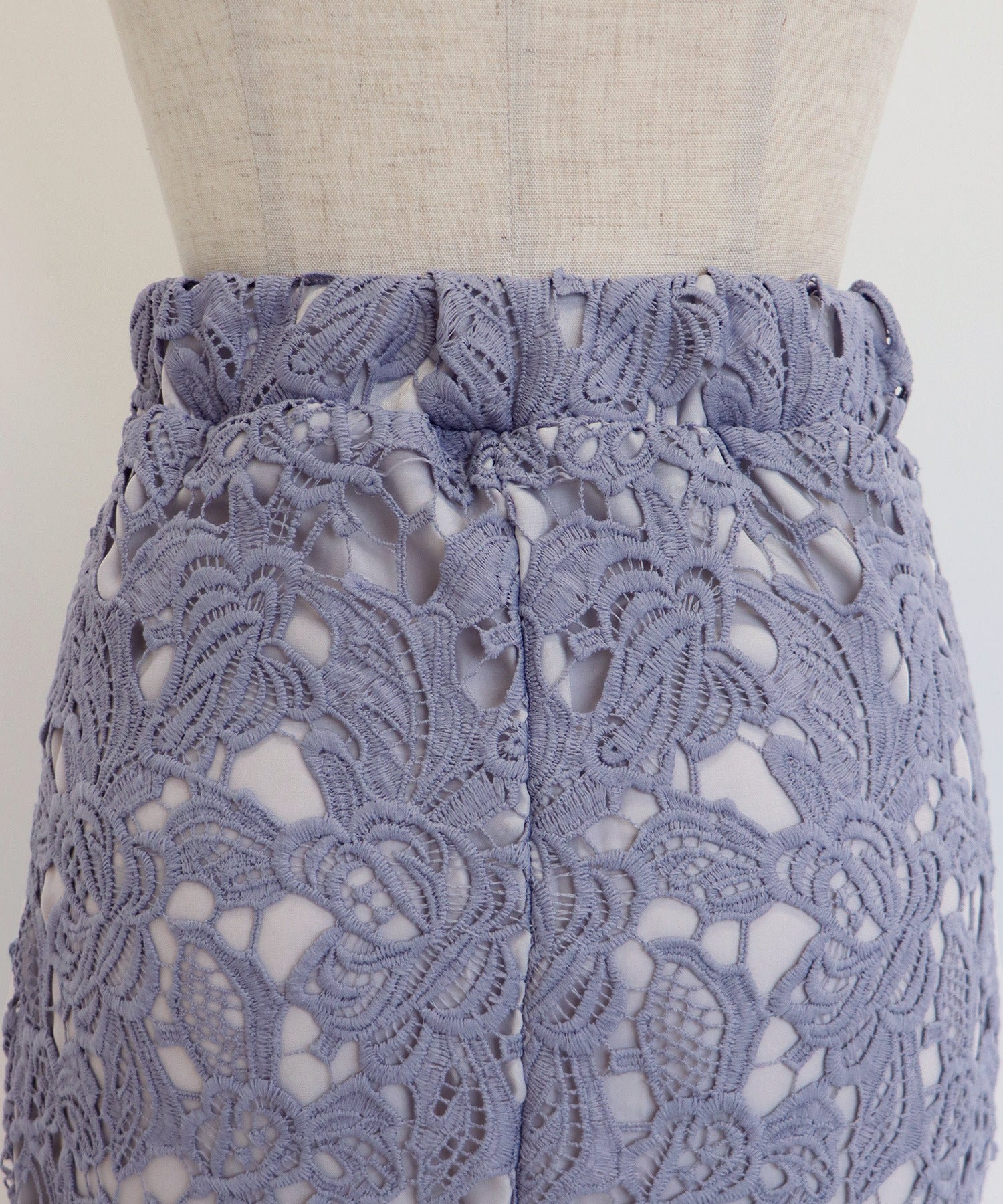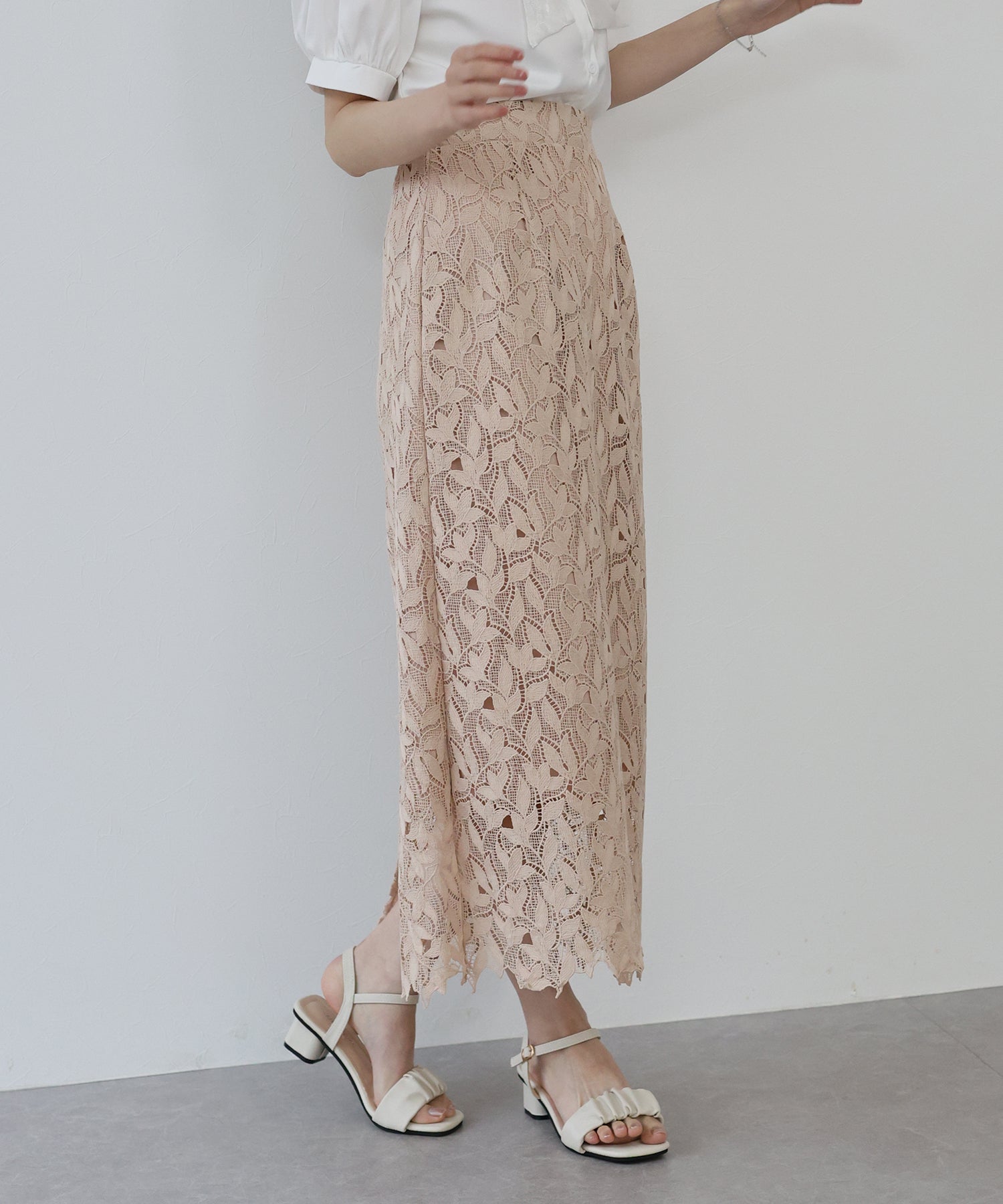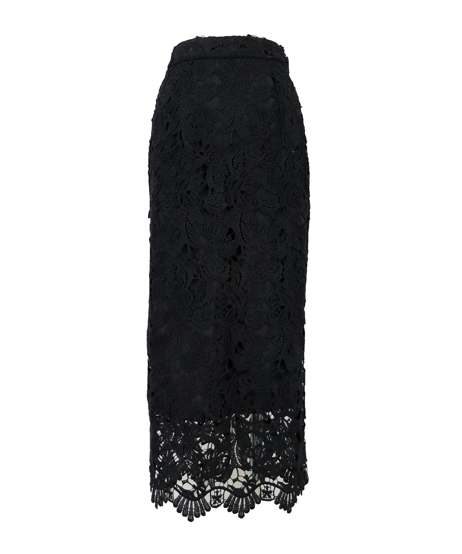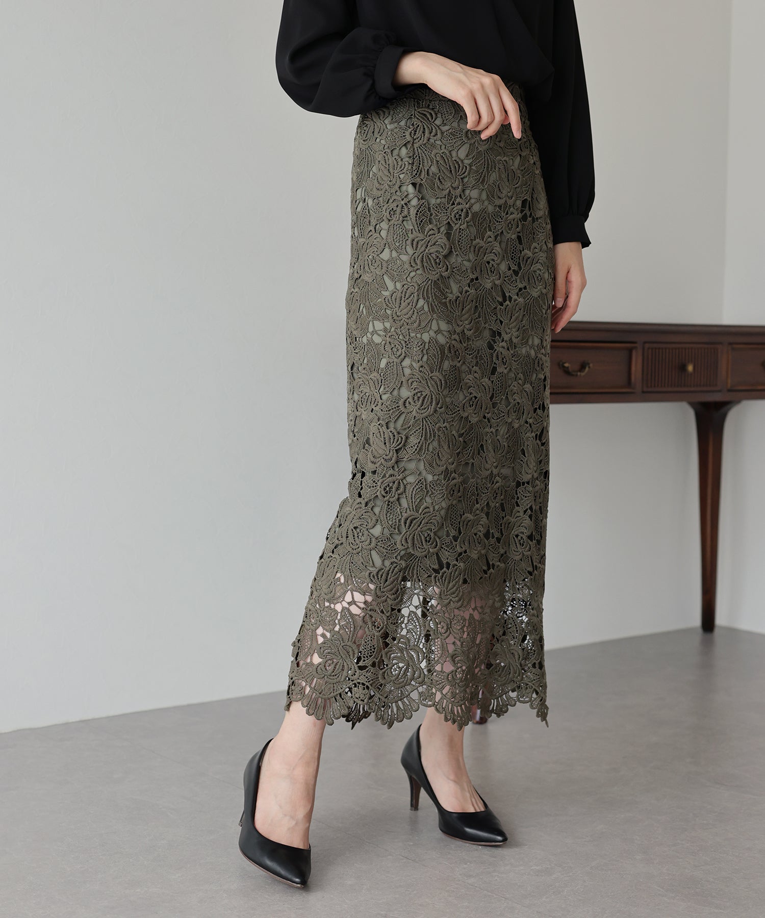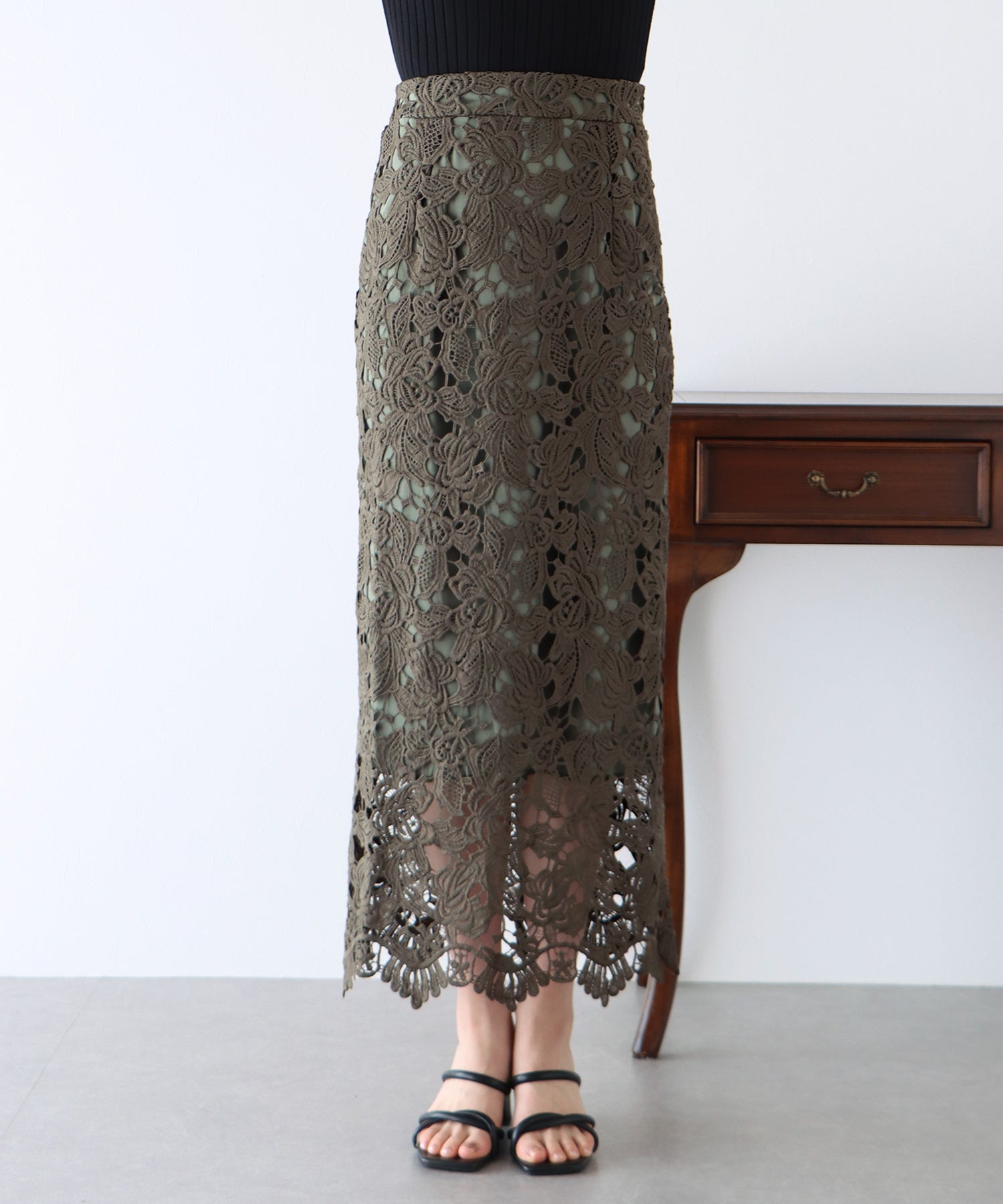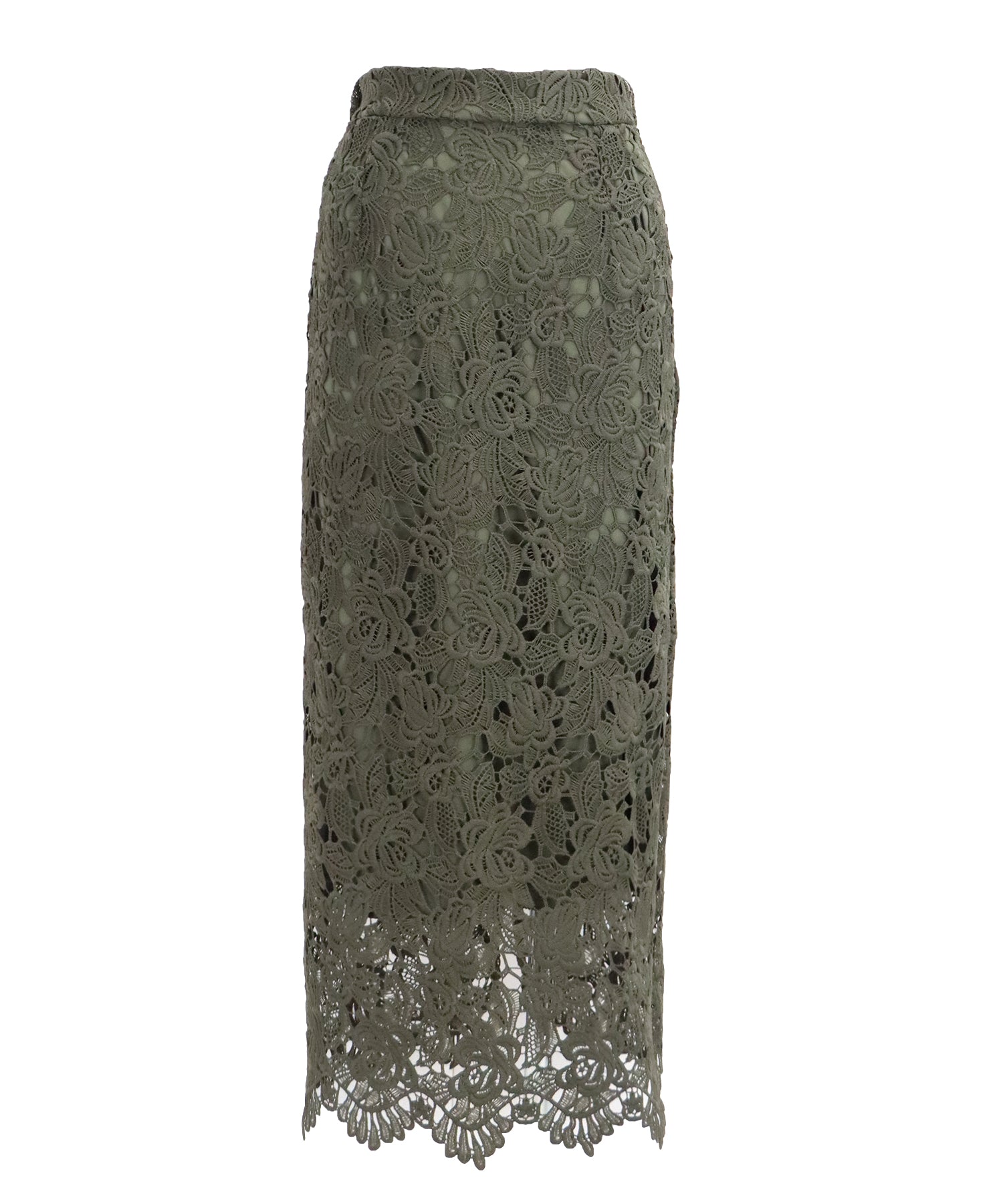 ?POINT 大人っぽく着こなせるタイトラインの総レーススカート。 ウエストはゴムが入っているので着心地も良く、 すっきりとしたIライン&ハイウエストで美脚効果&腰回りのラインもカバーしてくれます。 裾はレースの雰囲気を活かした透け感のあるスカラップで軽やかな足元に。ON/OFF問わず着まわせる万能アイテムです。