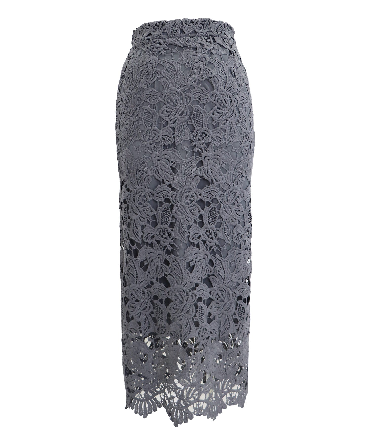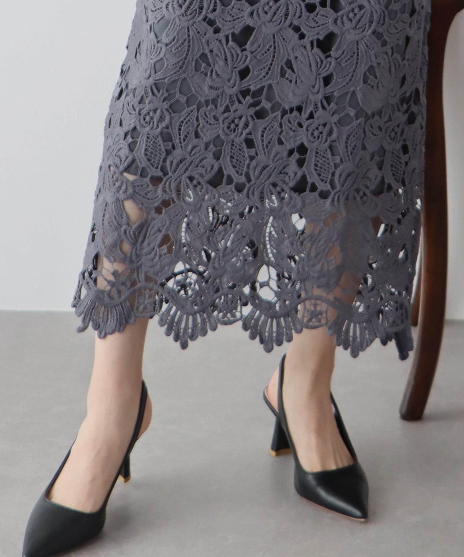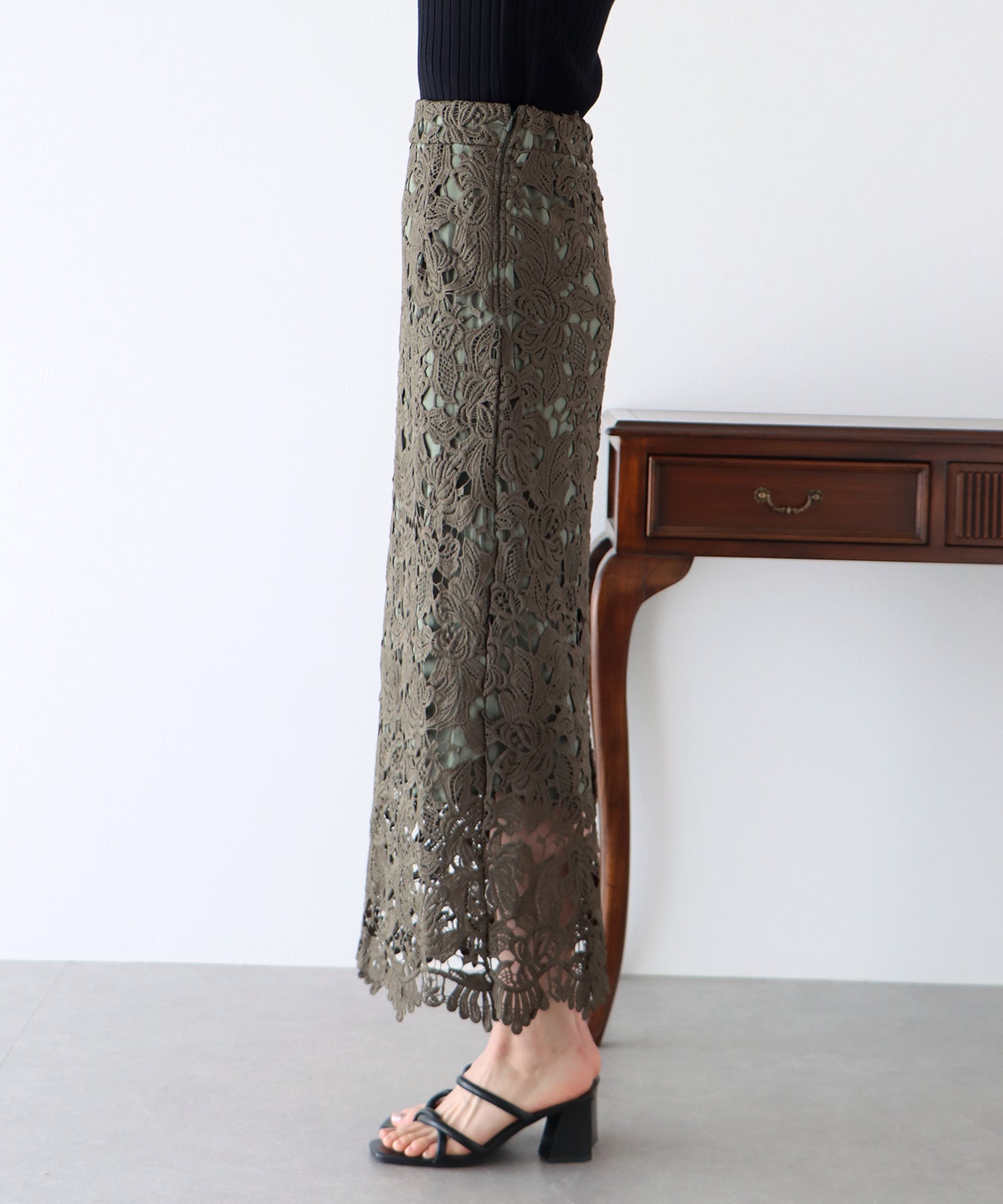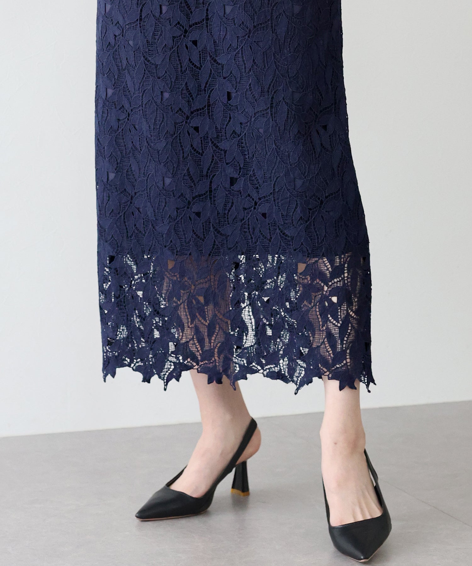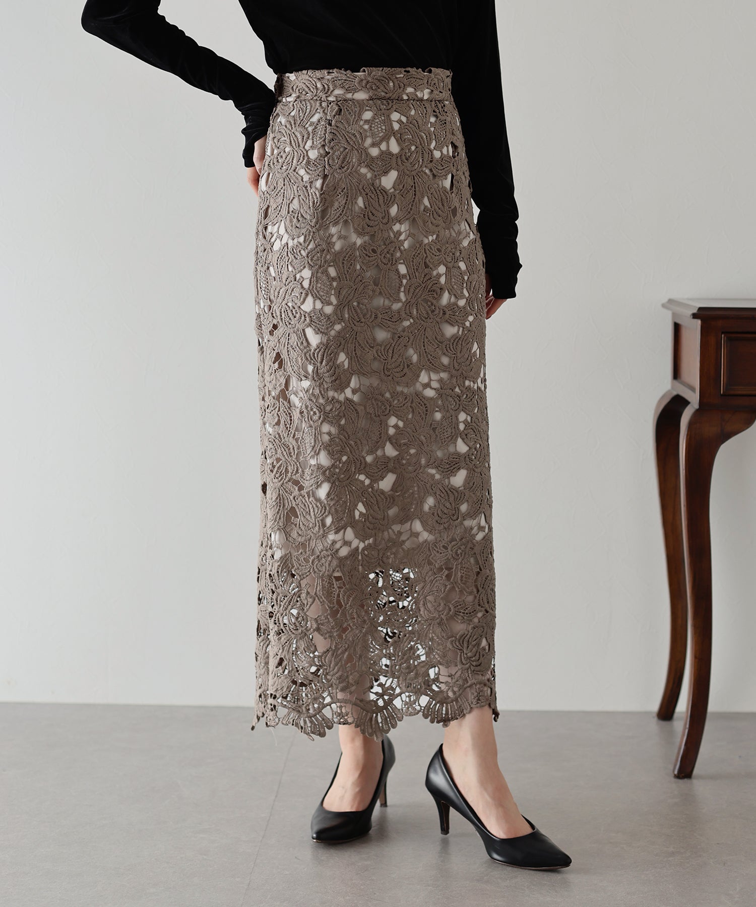 ?POINT 大人っぽく着こなせるタイトラインの総レーススカート。 ウエストはゴムが入っているので着心地も良く、 すっきりとしたIライン&ハイウエストで美脚効果&腰回りのラインもカバーしてくれます。 裾はレースの雰囲気を活かした透け感のあるスカラップで軽やかな足元に。ON/OFF問わず着まわせる万能アイテムです。