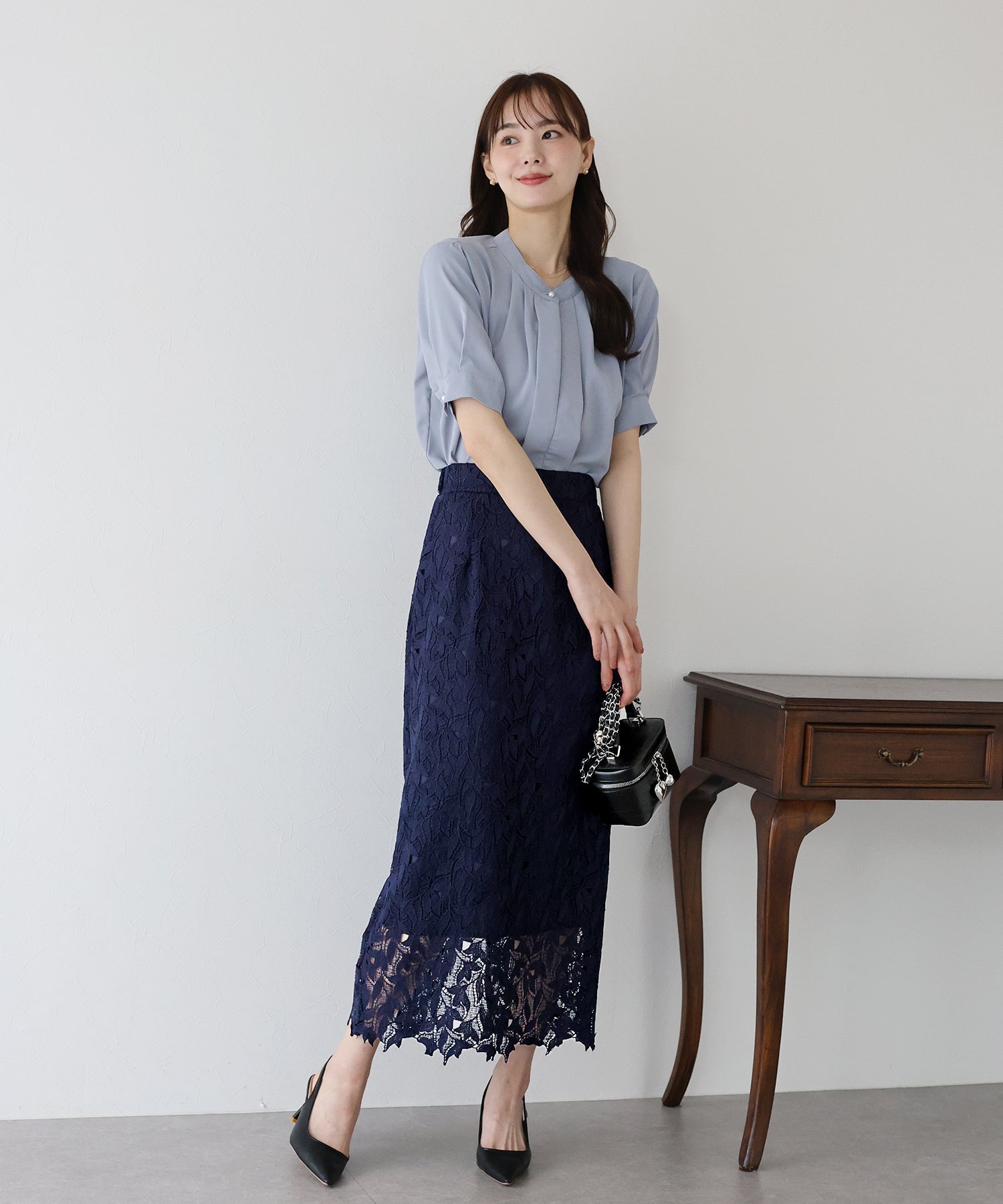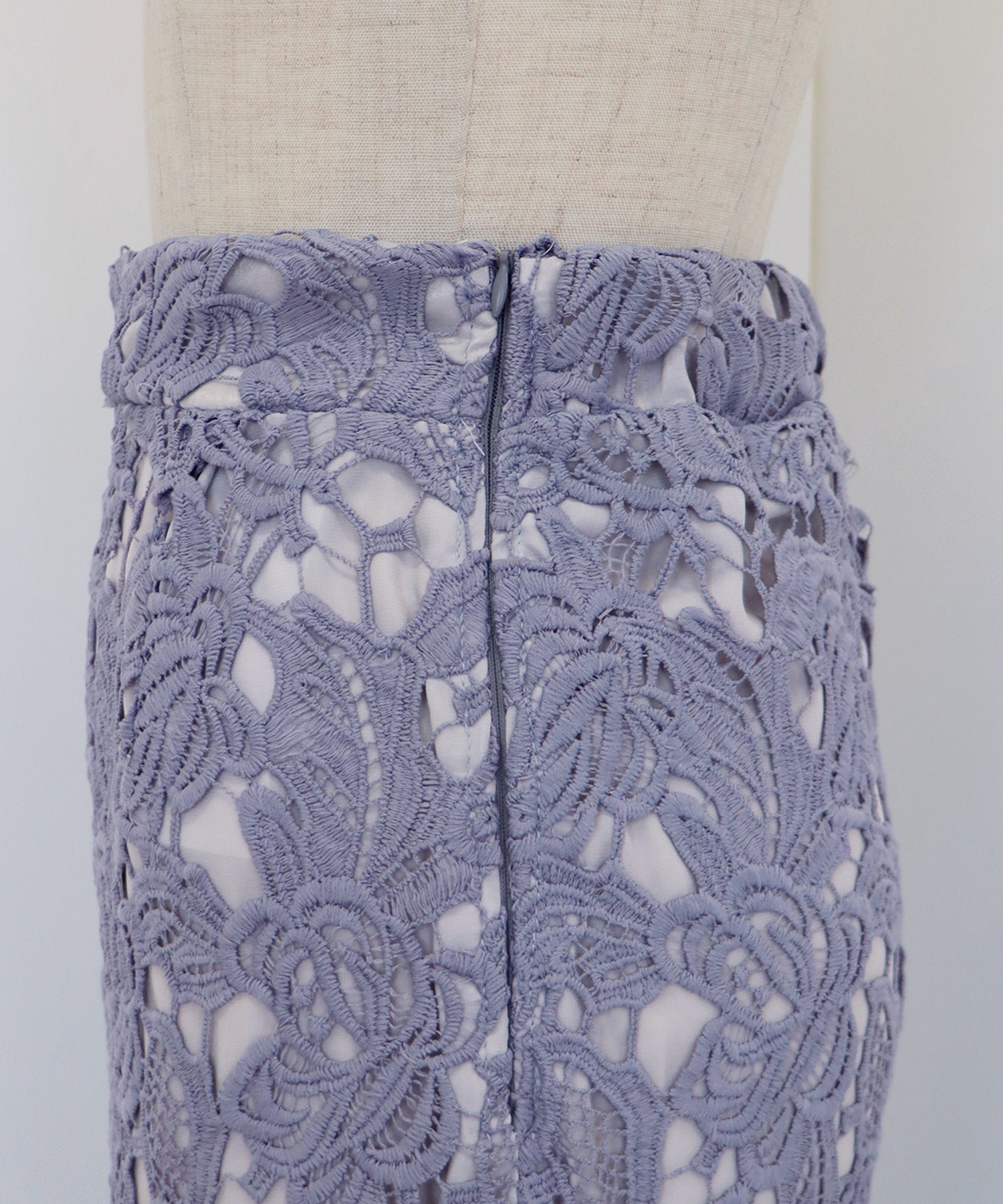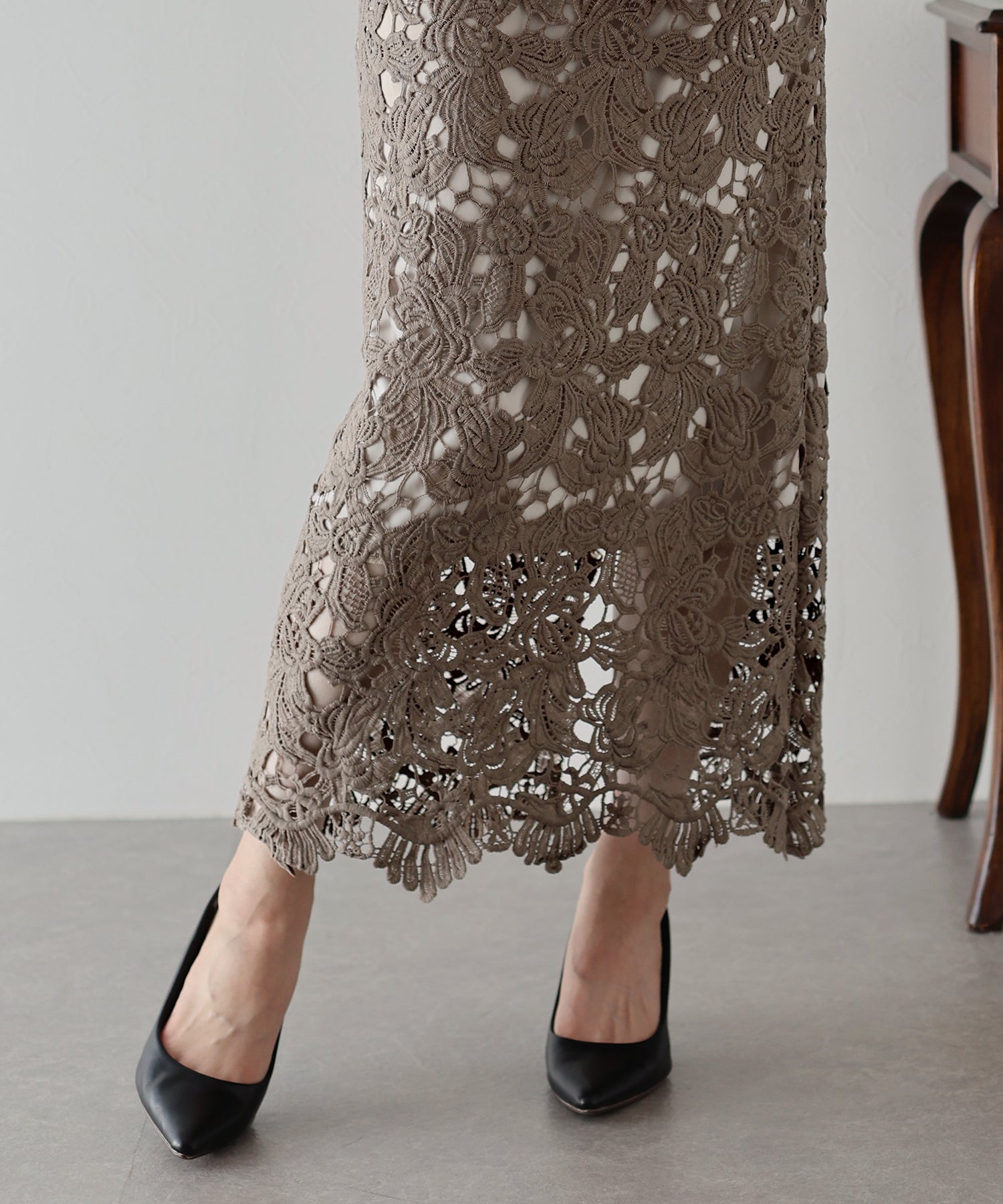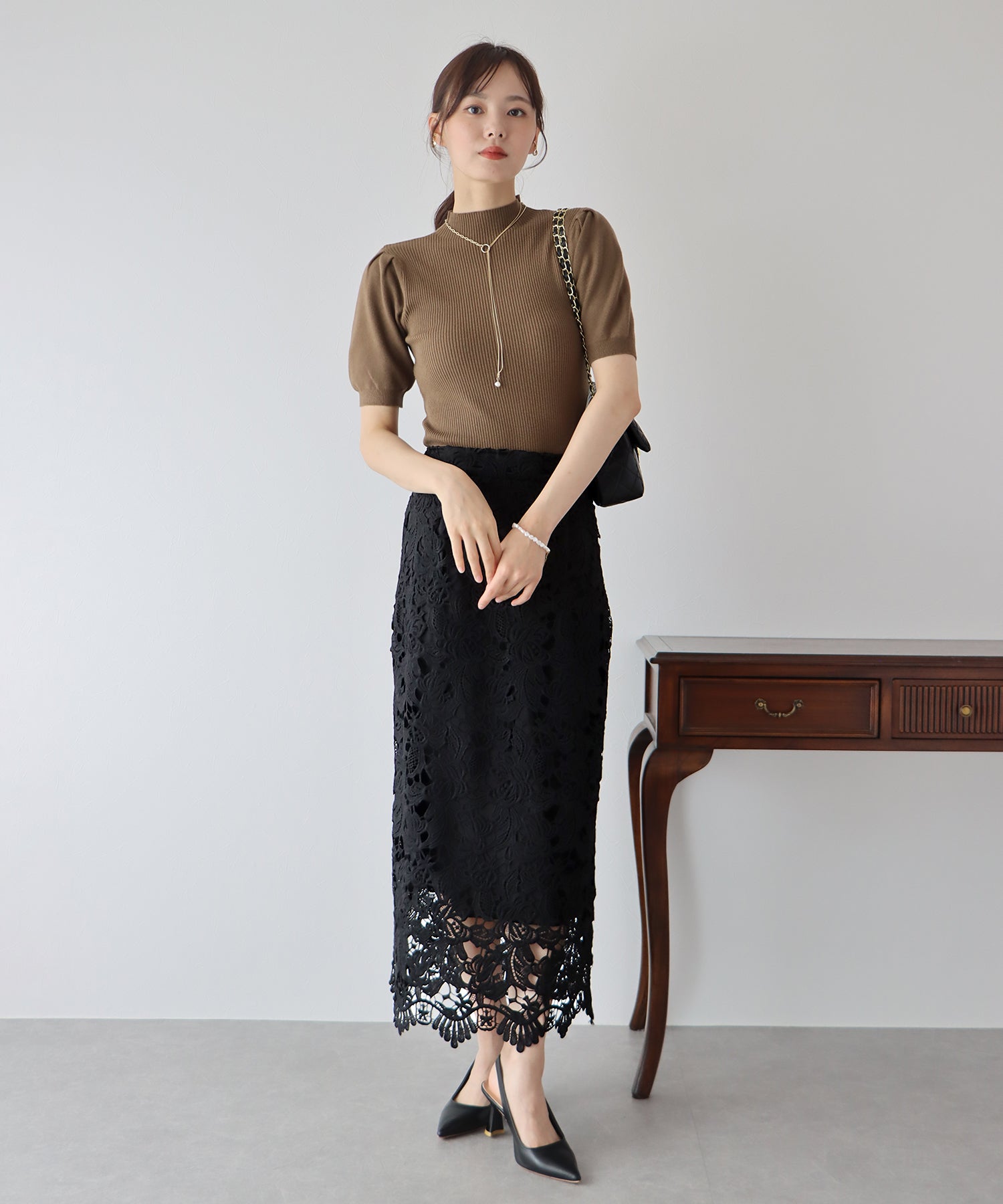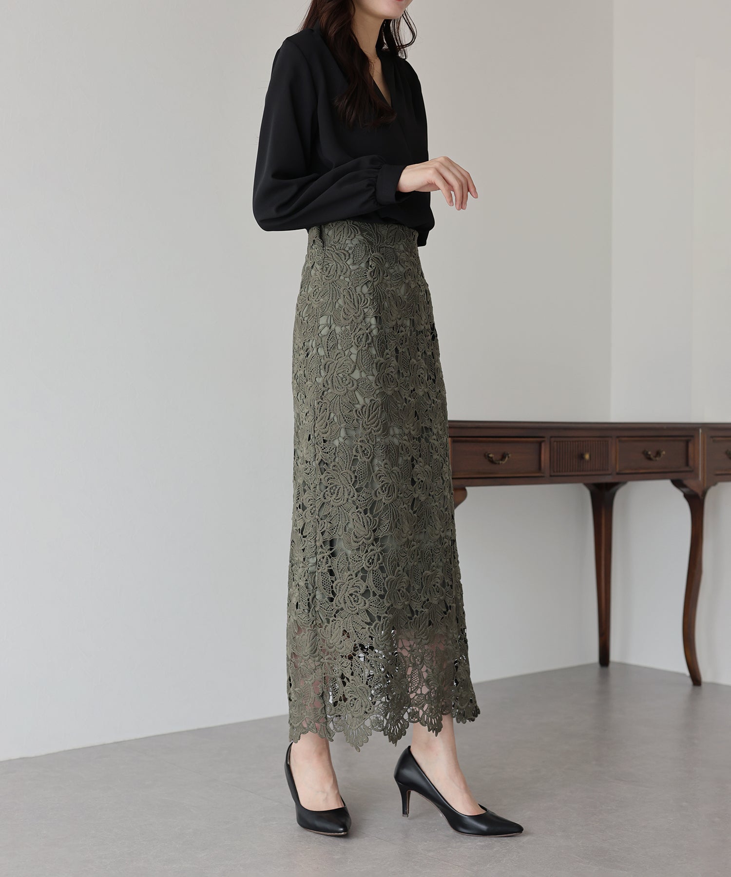 ?POINT 大人っぽく着こなせるタイトラインの総レーススカート。 ウエストはゴムが入っているので着心地も良く、 すっきりとしたIライン&ハイウエストで美脚効果&腰回りのラインもカバーしてくれます。 裾はレースの雰囲気を活かした透け感のあるスカラップで軽やかな足元に。ON/OFF問わず着まわせる万能アイテムです。