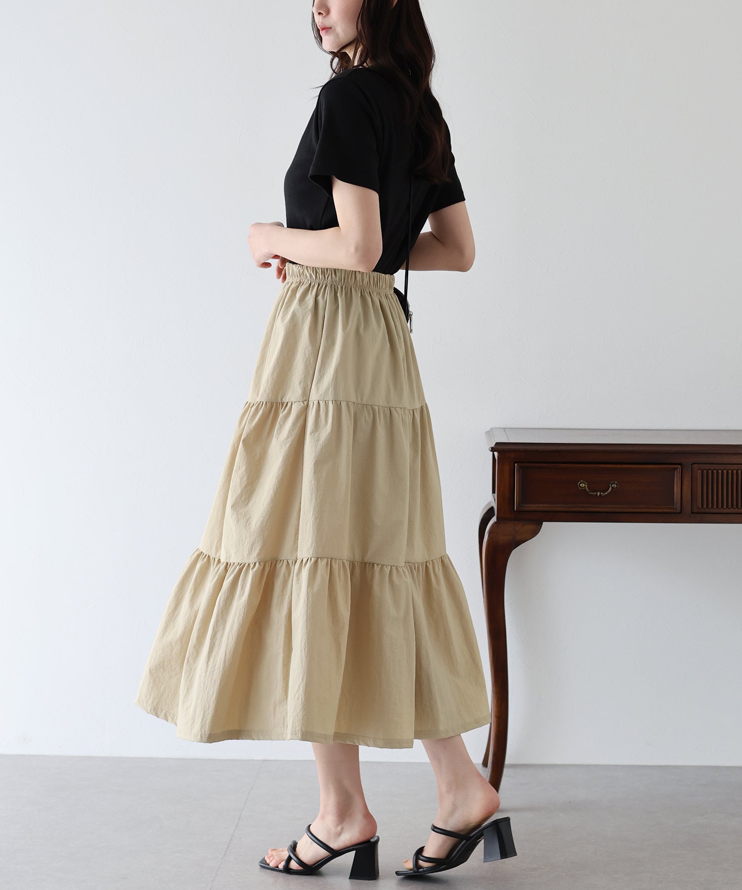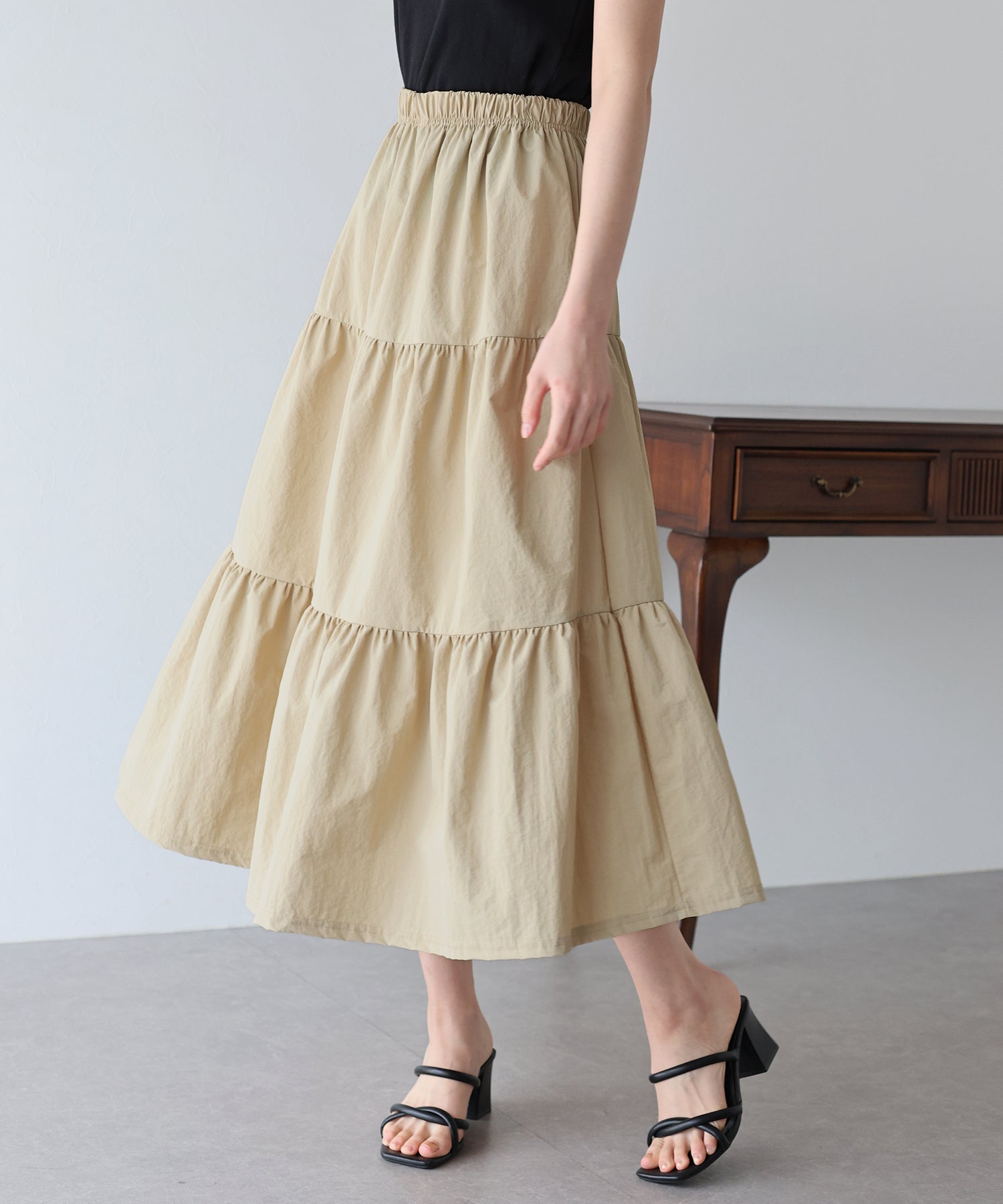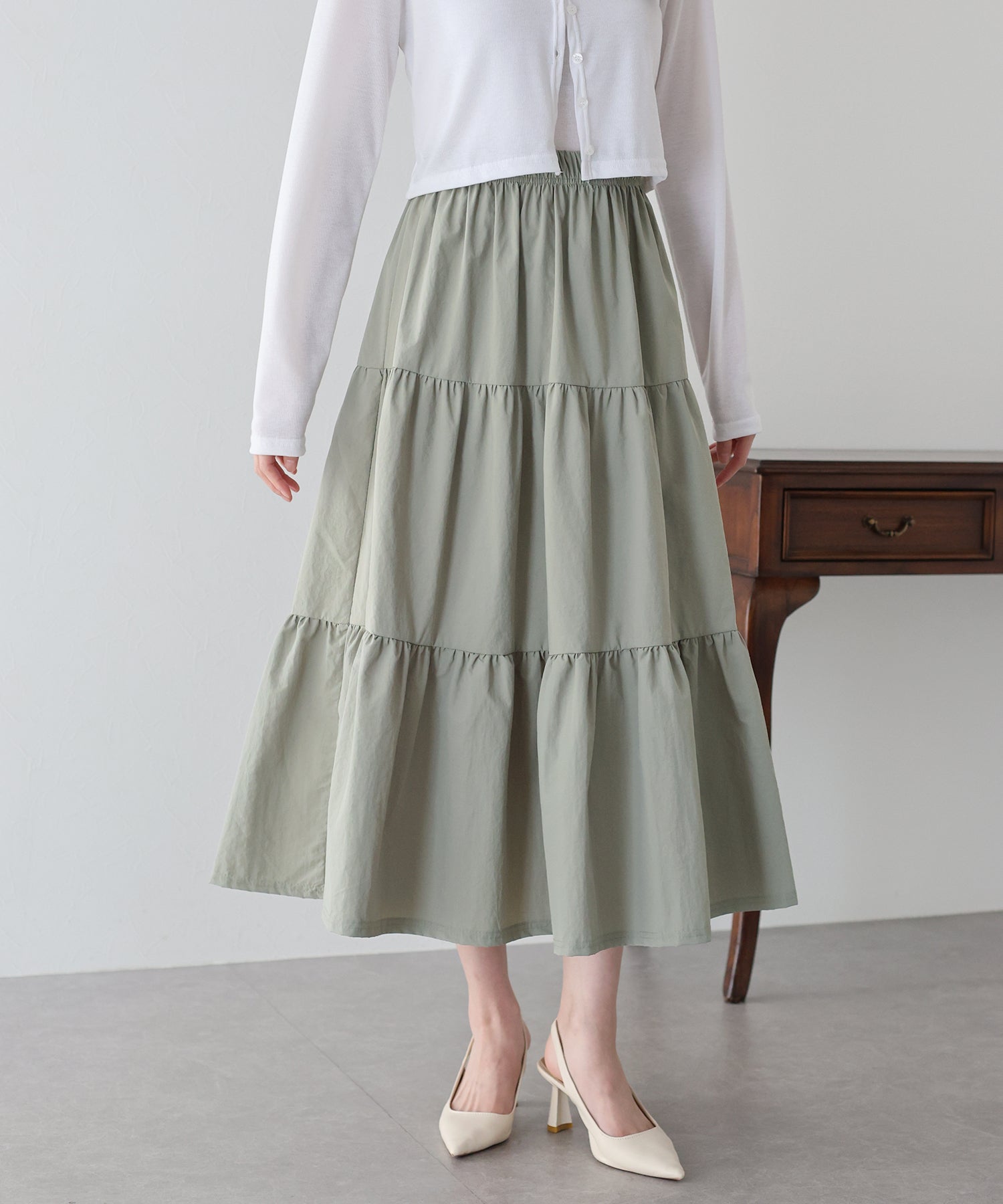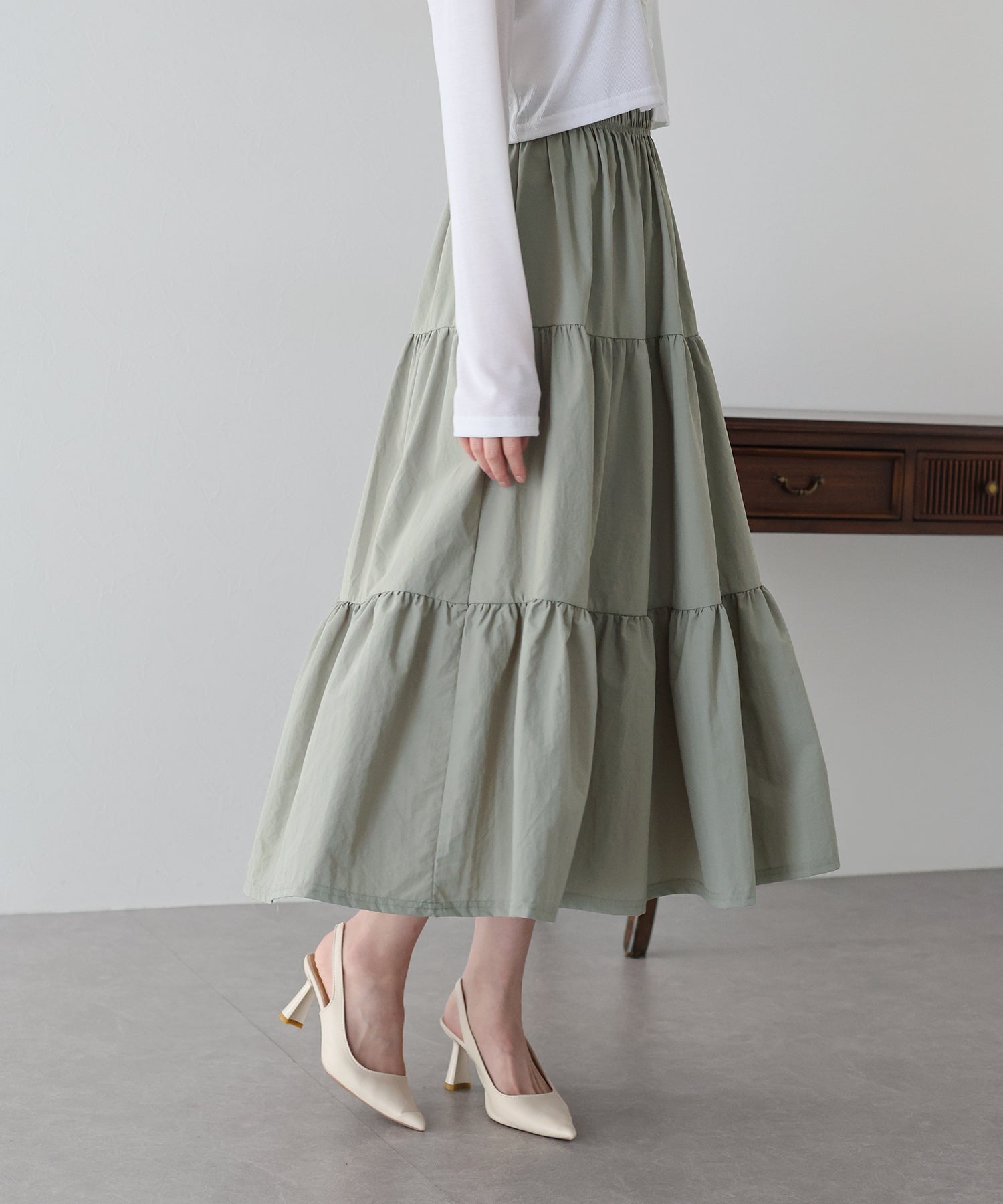 ?POINT 軽やかなナイロン素材を使用した、ウエストゴム仕様のティアードスカート。 ふんわりと広がるティアードデザインが、華やかで女性らしいシルエットを演出します。 程よいハリ感のある素材が立体的なフォルムをキープし、動くたびに表情の変わるデザインが魅力。 ウエストはゴム仕様でフィット感があり、ストレスフリーな履き心地も嬉しいポイント。 シーズンレスで使える素材感で、ロングシーズン活躍する一枚です。