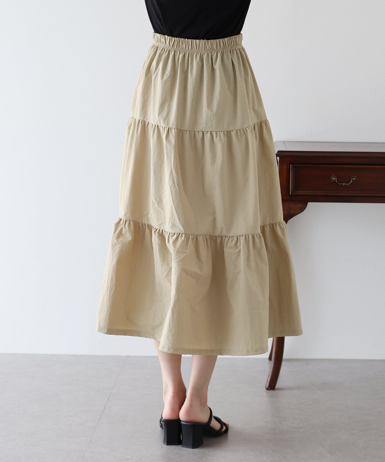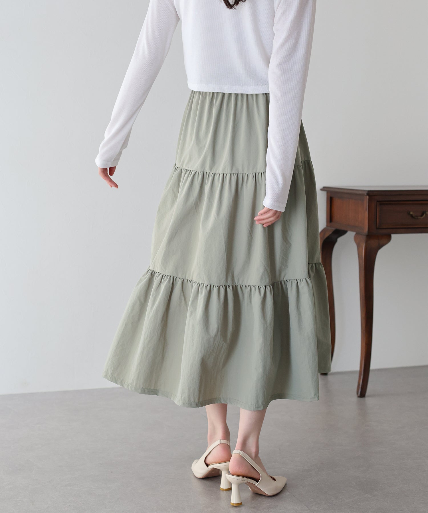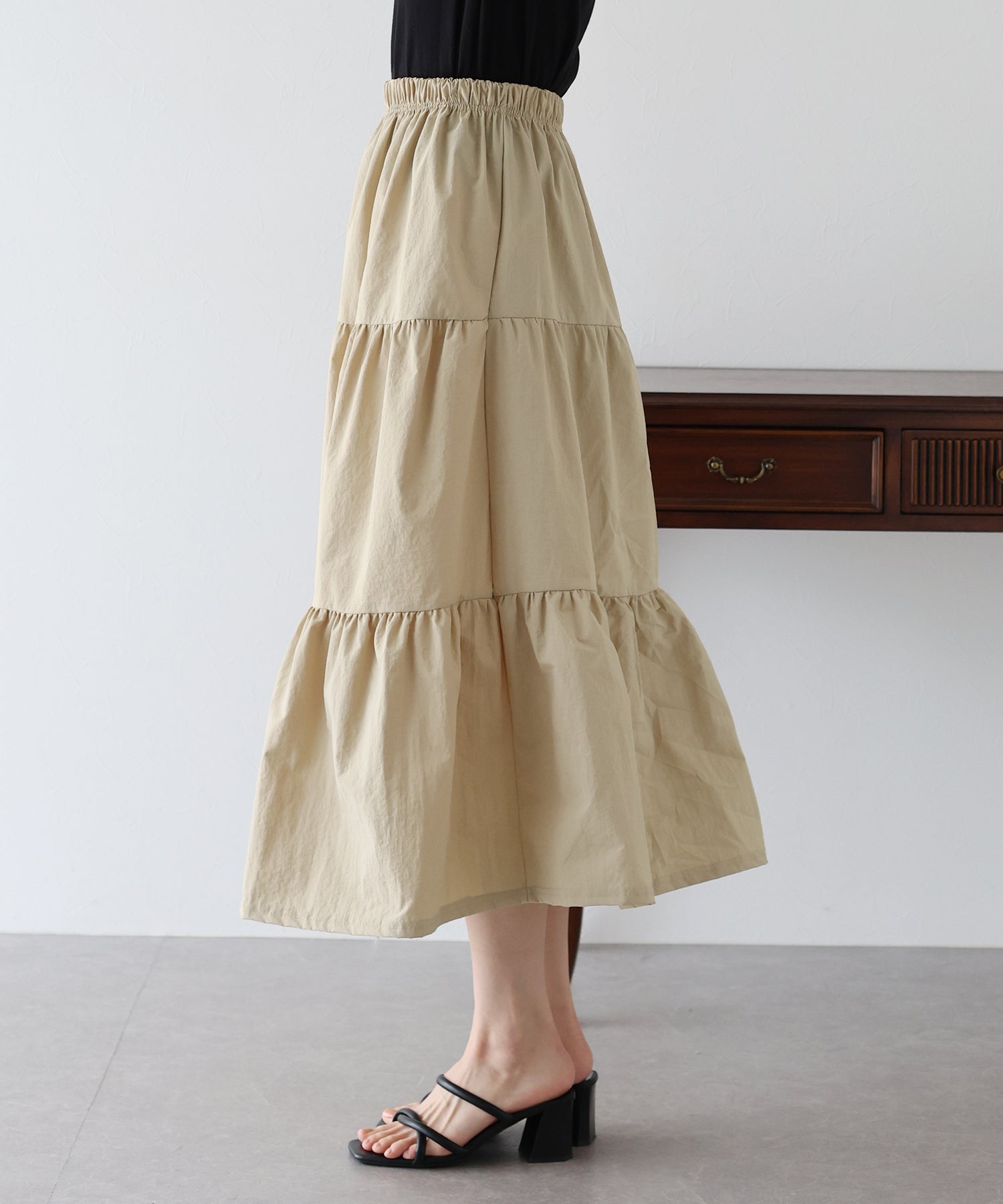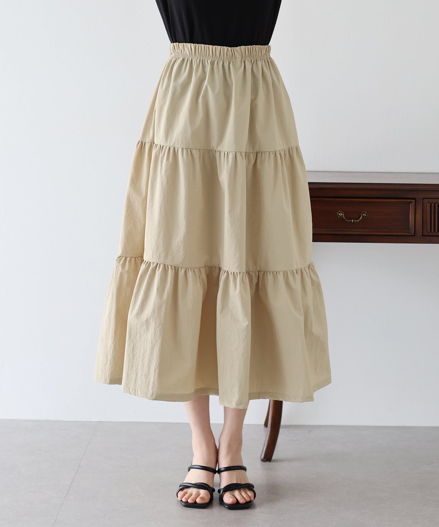 ?POINT 軽やかなナイロン素材を使用した、ウエストゴム仕様のティアードスカート。 ふんわりと広がるティアードデザインが、華やかで女性らしいシルエットを演出します。 程よいハリ感のある素材が立体的なフォルムをキープし、動くたびに表情の変わるデザインが魅力。 ウエストはゴム仕様でフィット感があり、ストレスフリーな履き心地も嬉しいポイント。 シーズンレスで使える素材感で、ロングシーズン活躍する一枚です。
