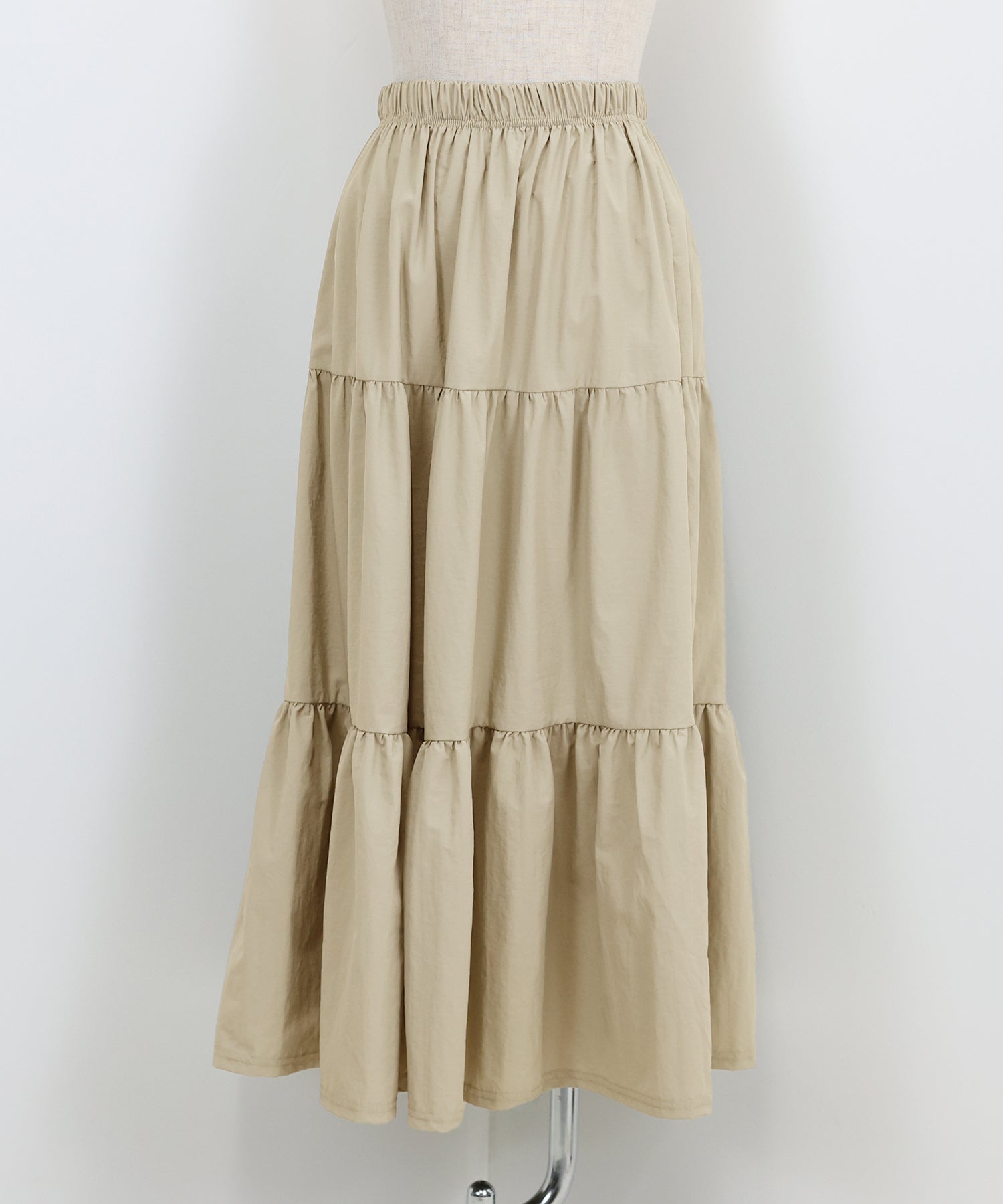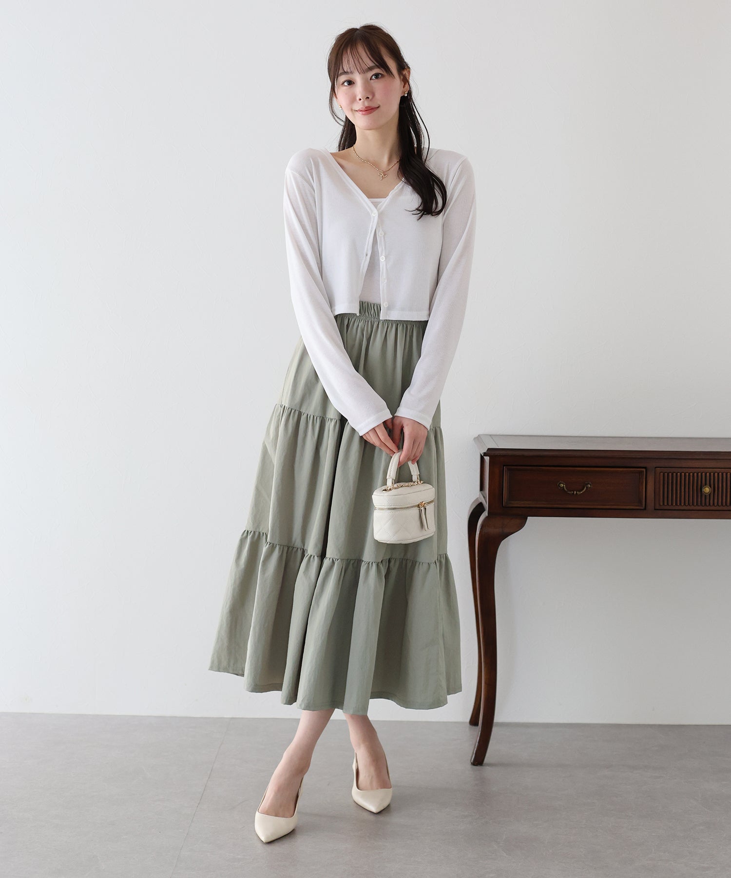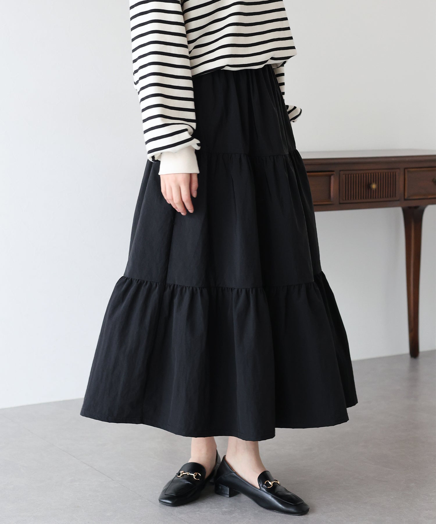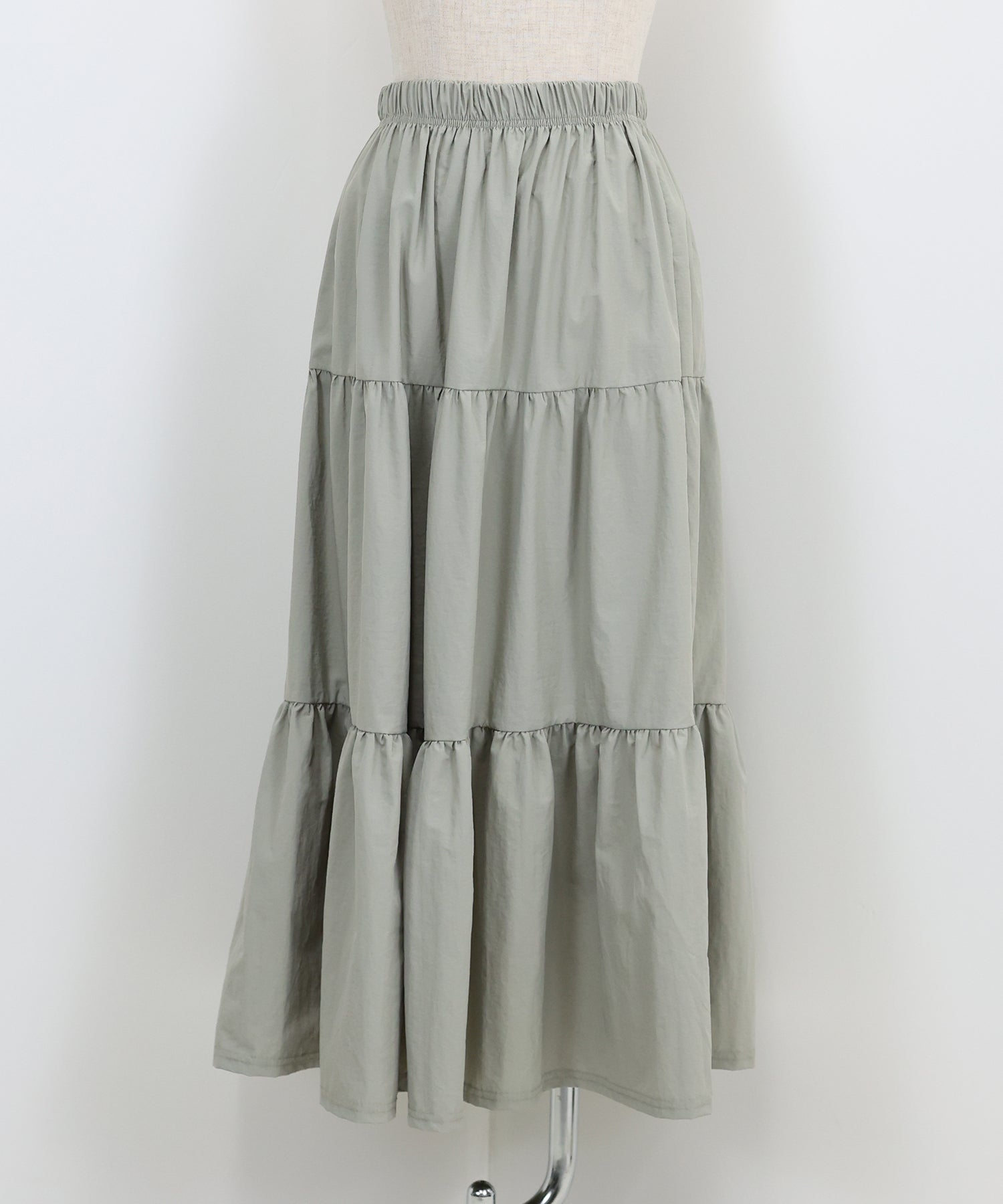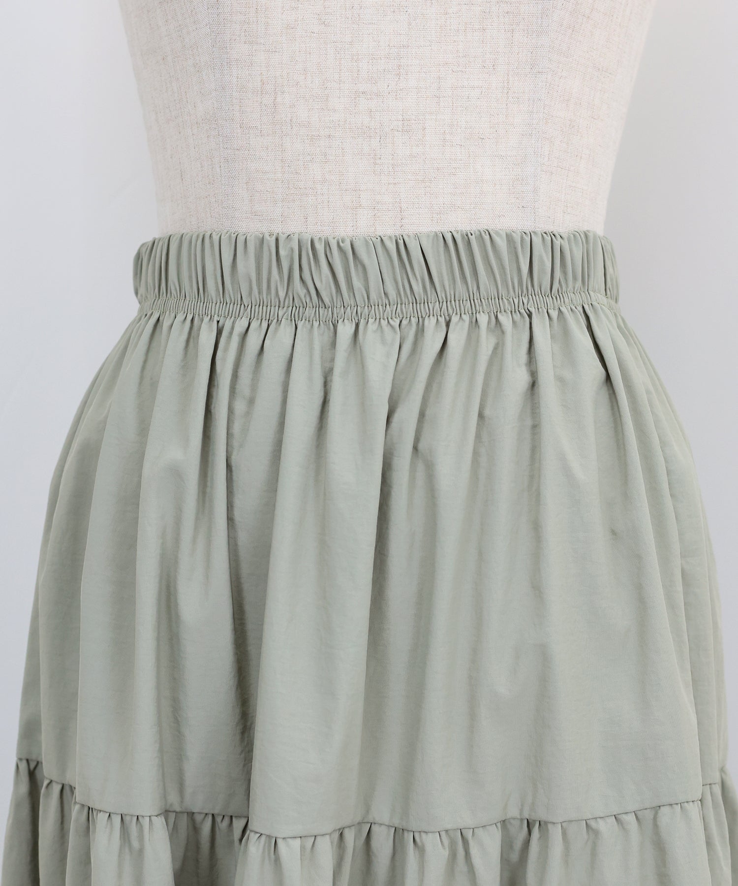 ?POINT 軽やかなナイロン素材を使用した、ウエストゴム仕様のティアードスカート。 ふんわりと広がるティアードデザインが、華やかで女性らしいシルエットを演出します。 程よいハリ感のある素材が立体的なフォルムをキープし、動くたびに表情の変わるデザインが魅力。 ウエストはゴム仕様でフィット感があり、ストレスフリーな履き心地も嬉しいポイント。 シーズンレスで使える素材感で、ロングシーズン活躍する一枚です。
