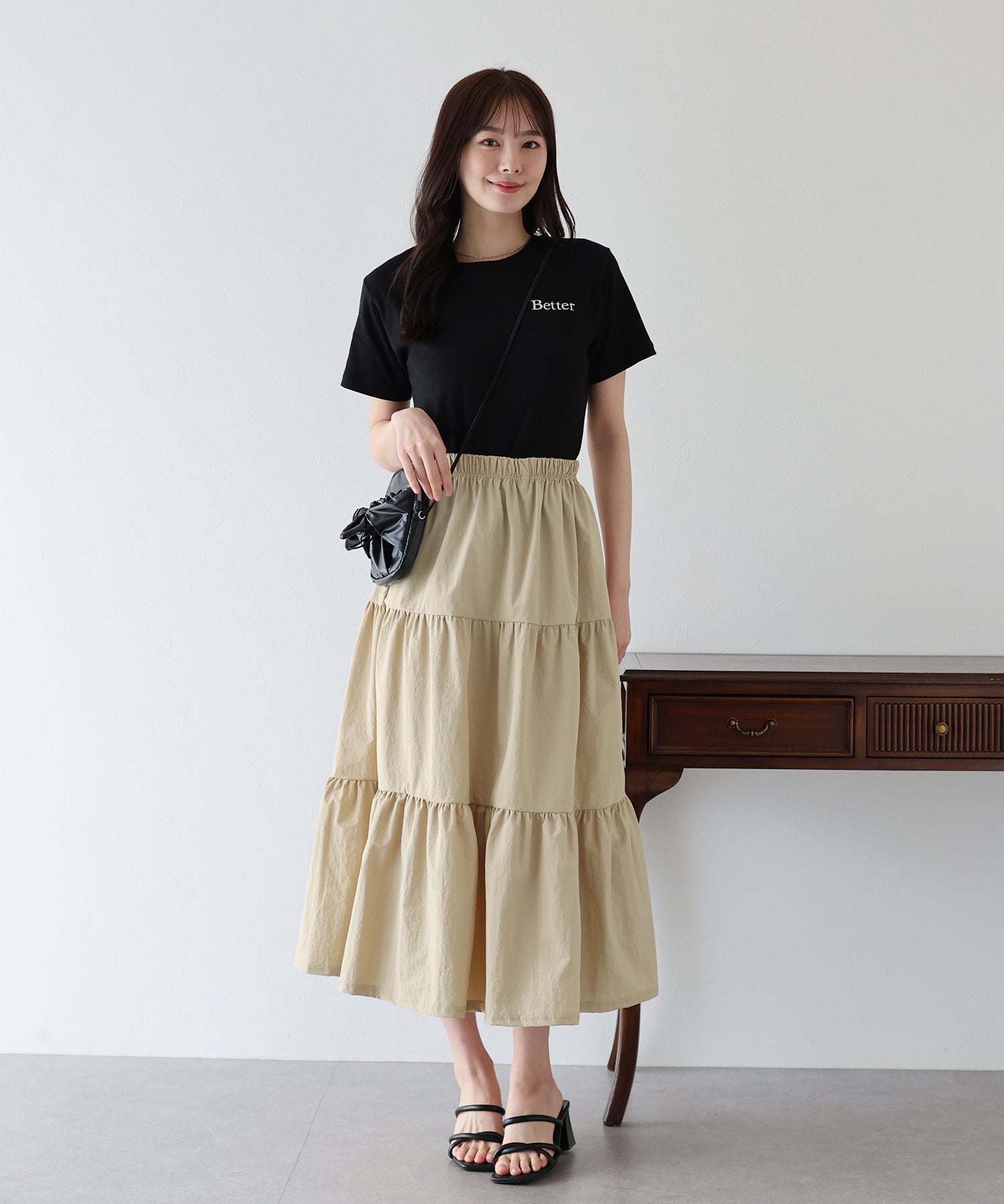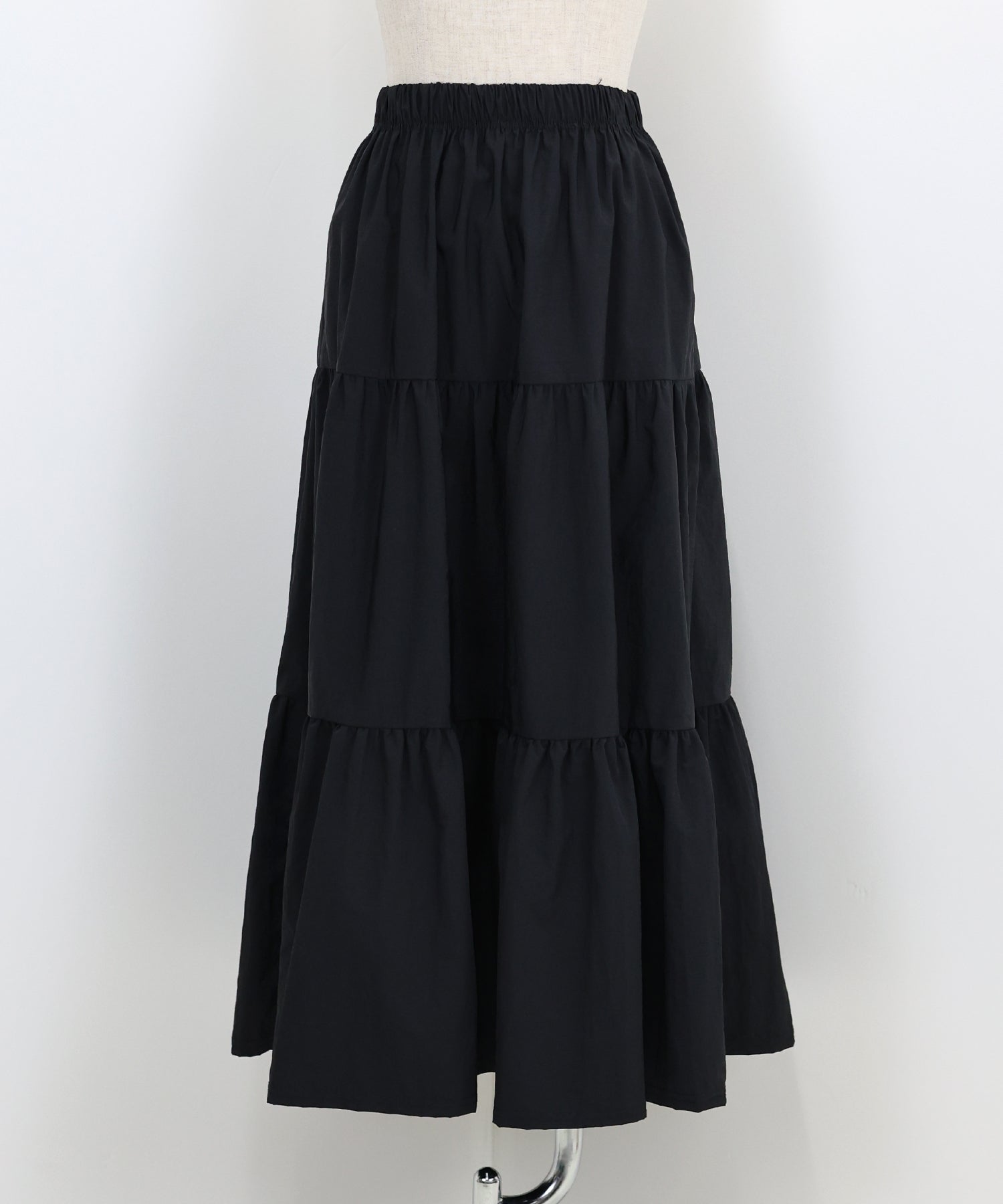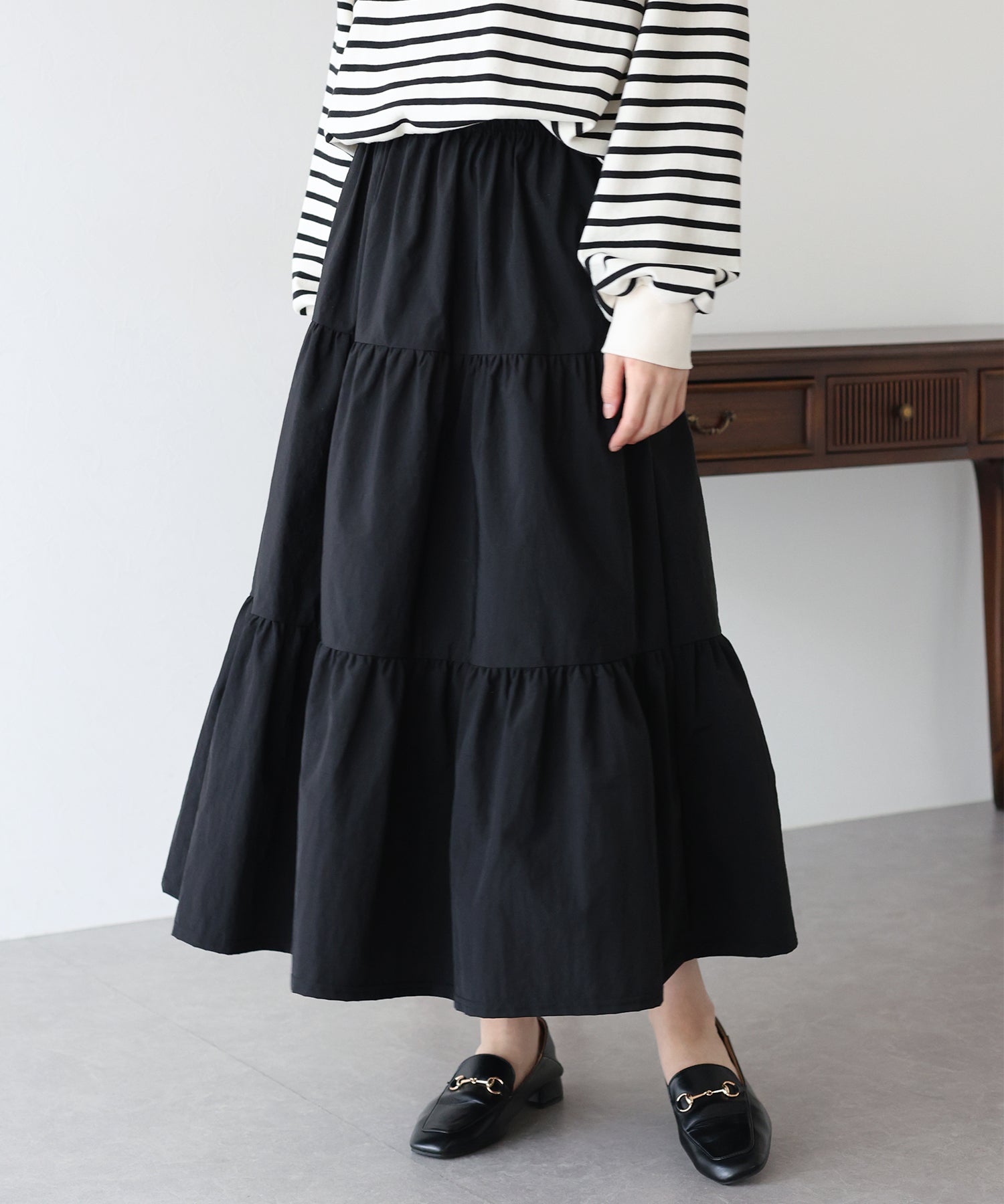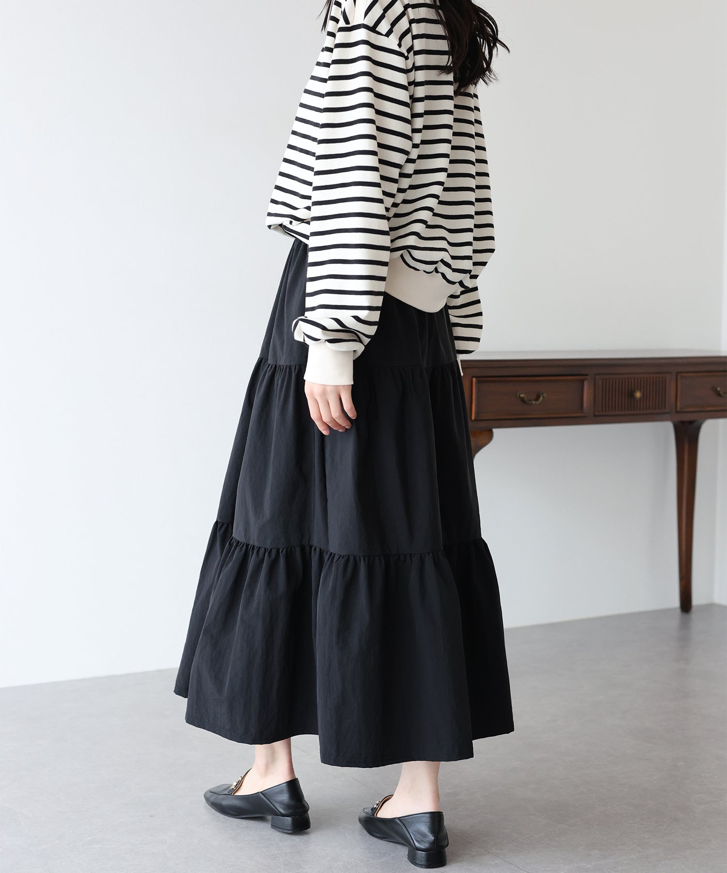 ?POINT 軽やかなナイロン素材を使用した、ウエストゴム仕様のティアードスカート。 ふんわりと広がるティアードデザインが、華やかで女性らしいシルエットを演出します。 程よいハリ感のある素材が立体的なフォルムをキープし、動くたびに表情の変わるデザインが魅力。 ウエストはゴム仕様でフィット感があり、ストレスフリーな履き心地も嬉しいポイント。 シーズンレスで使える素材感で、ロングシーズン活躍する一枚です。