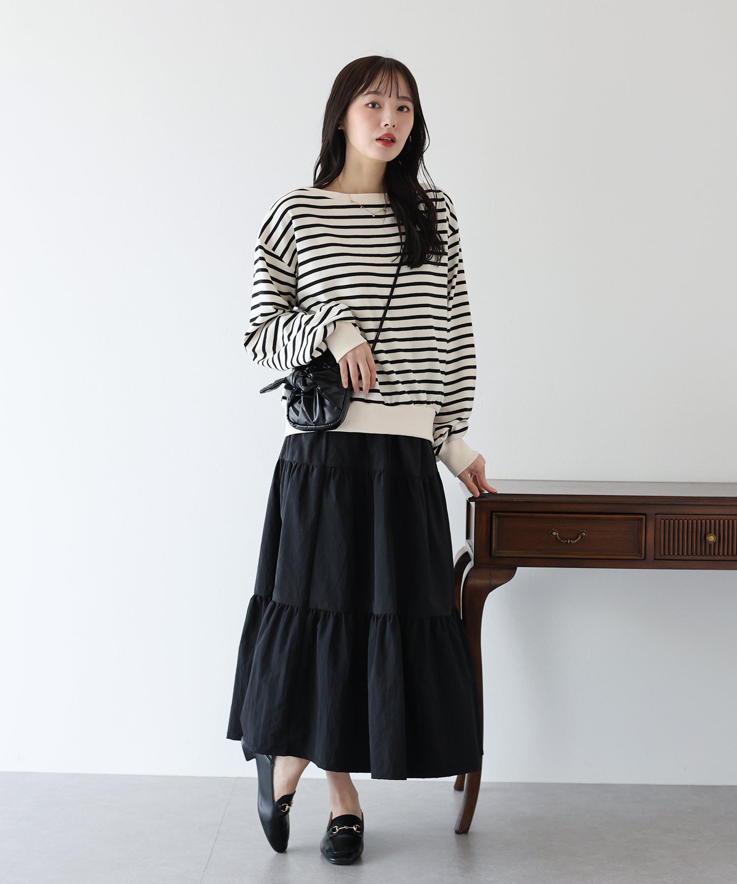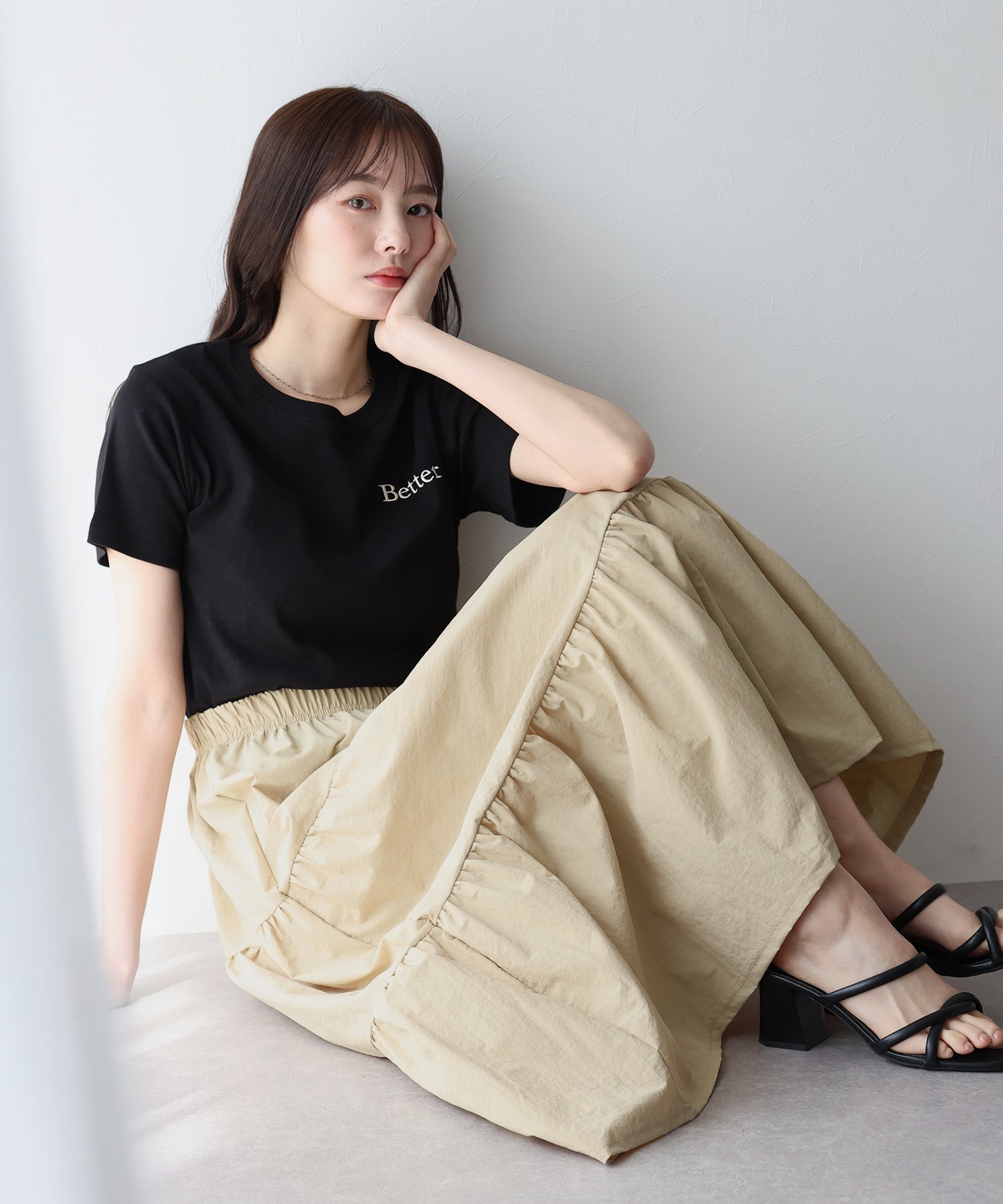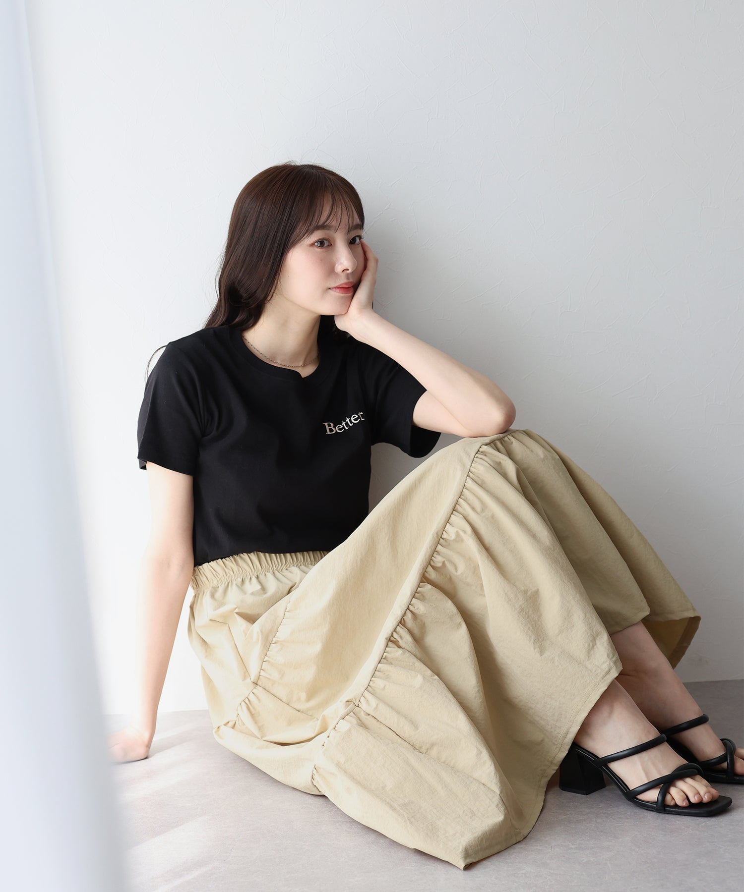 ?STYLING シンプルなトップスを合わせるだけで、コーディネートの主役に。 Tシャツやスウェットと合わせれば、程よくカジュアルダウンしたこなれたスタイルに。 ブラウスやコンパクトなトップスと組み合わせて、フェミニンな着こなしを楽しむのも◎。 ショートブーツやスニーカーを合わせて、幅広いスタイルに馴染む万能スカートです。