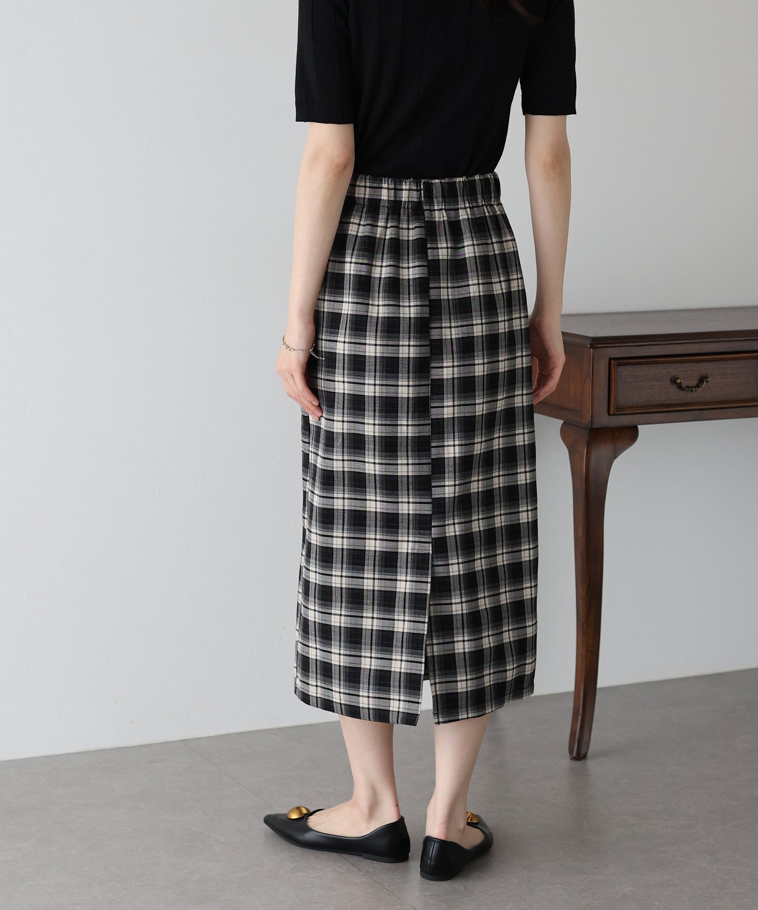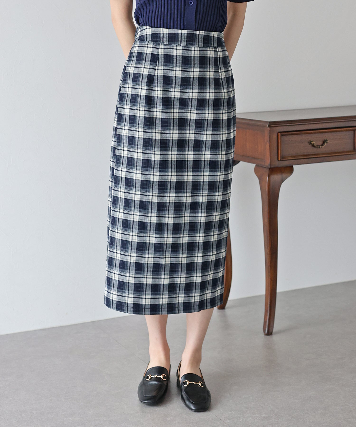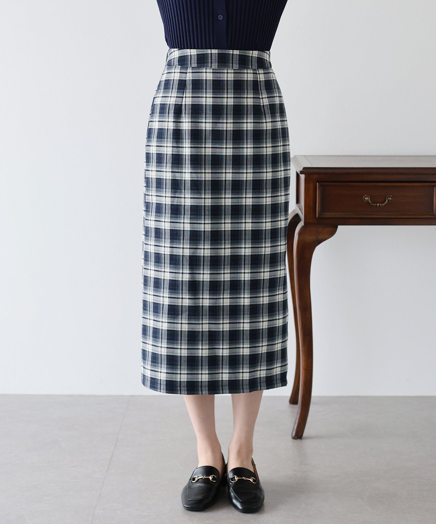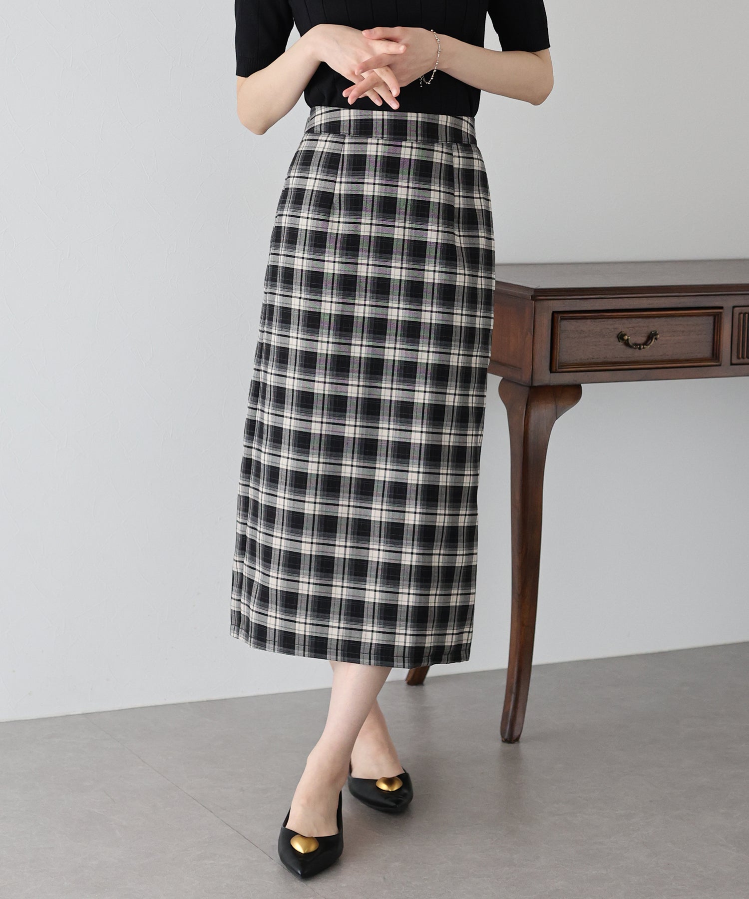 チェック柄が目を引くタイトスカート。