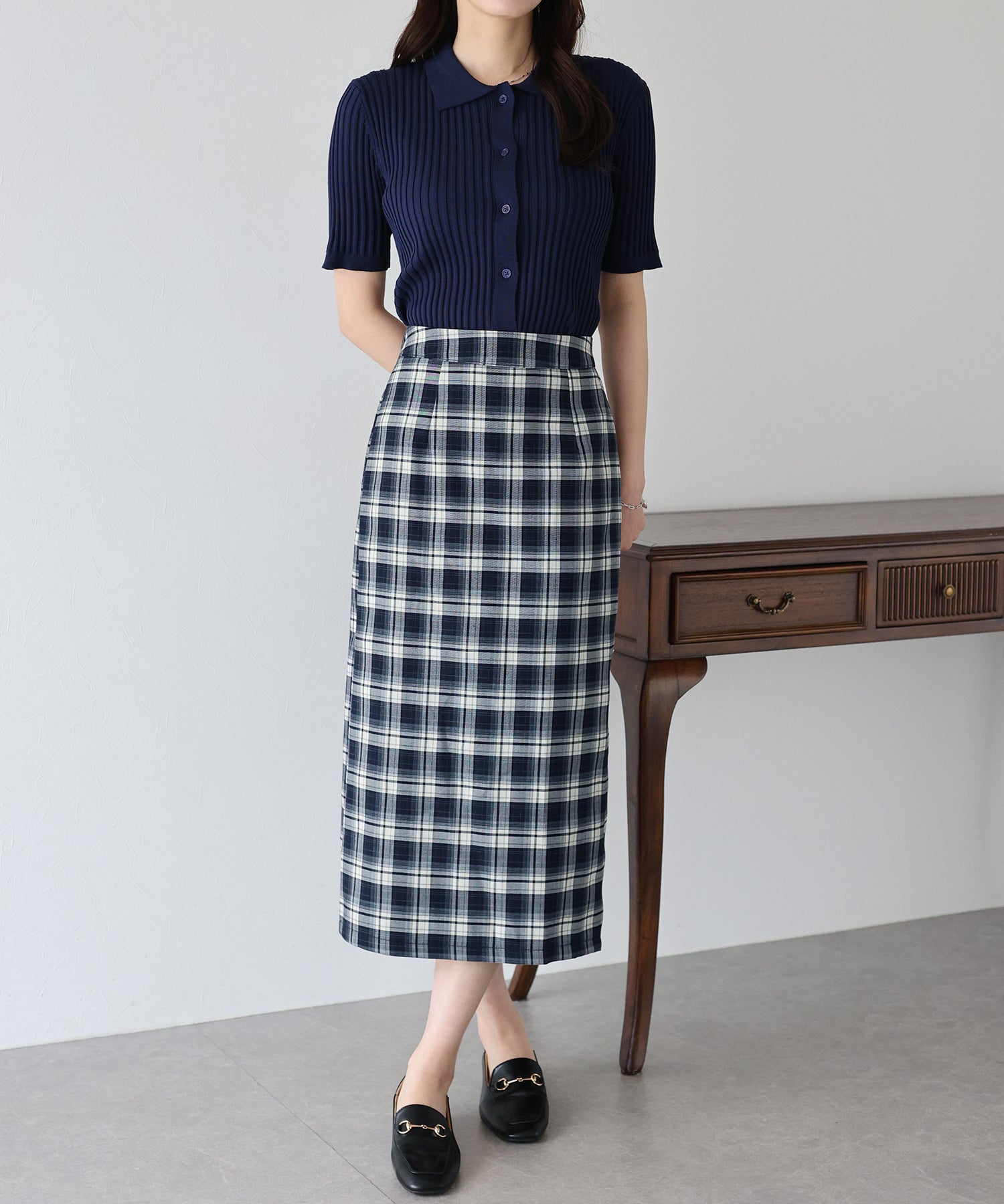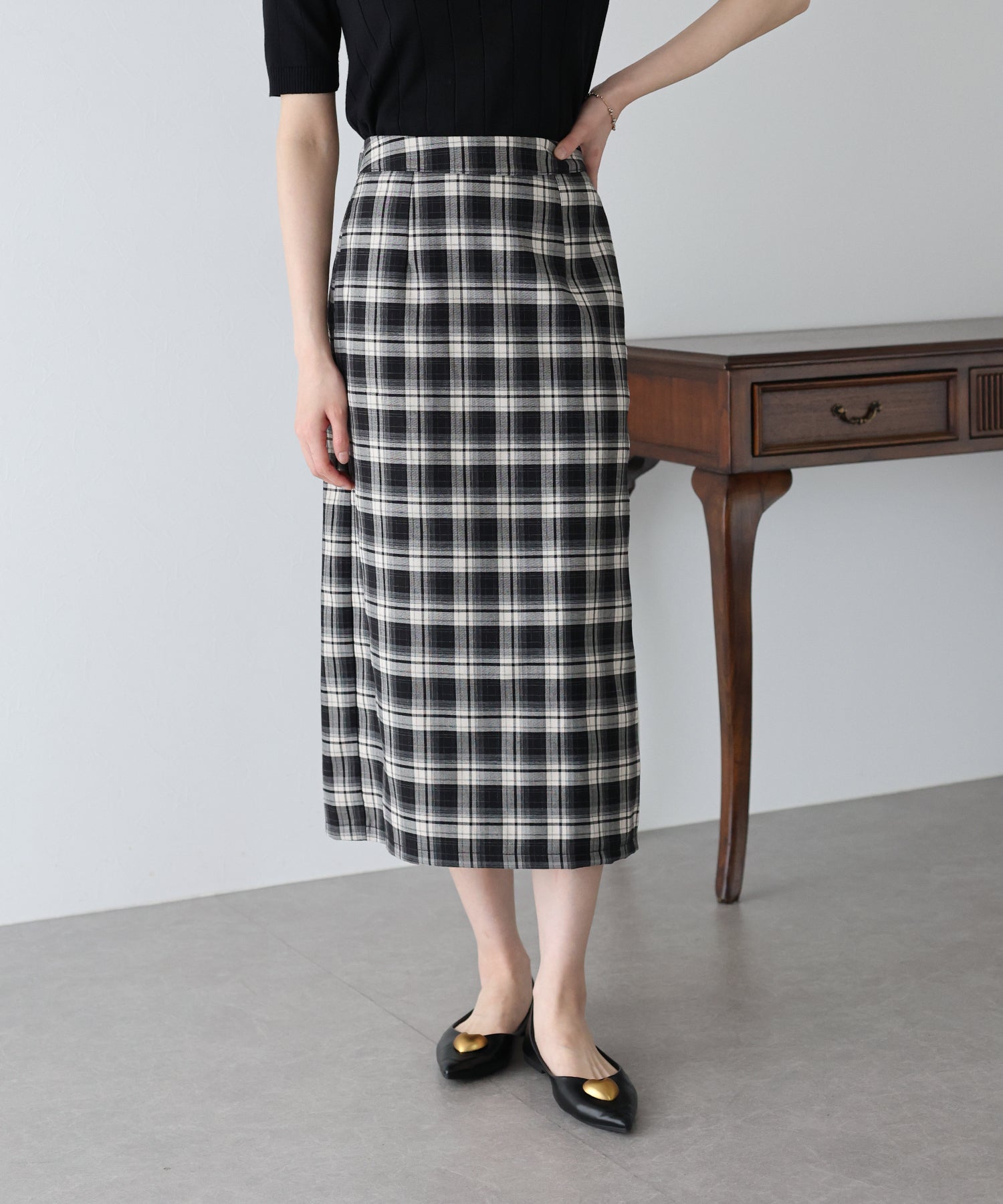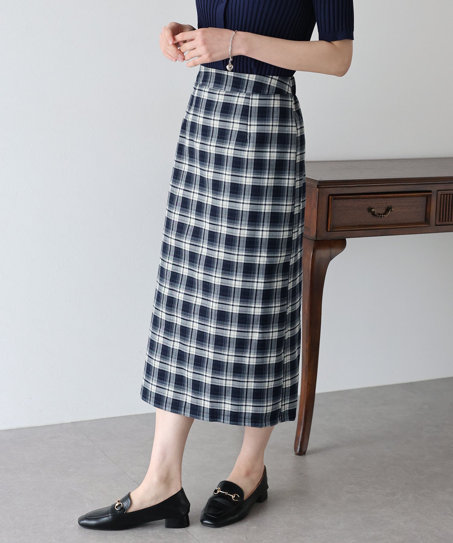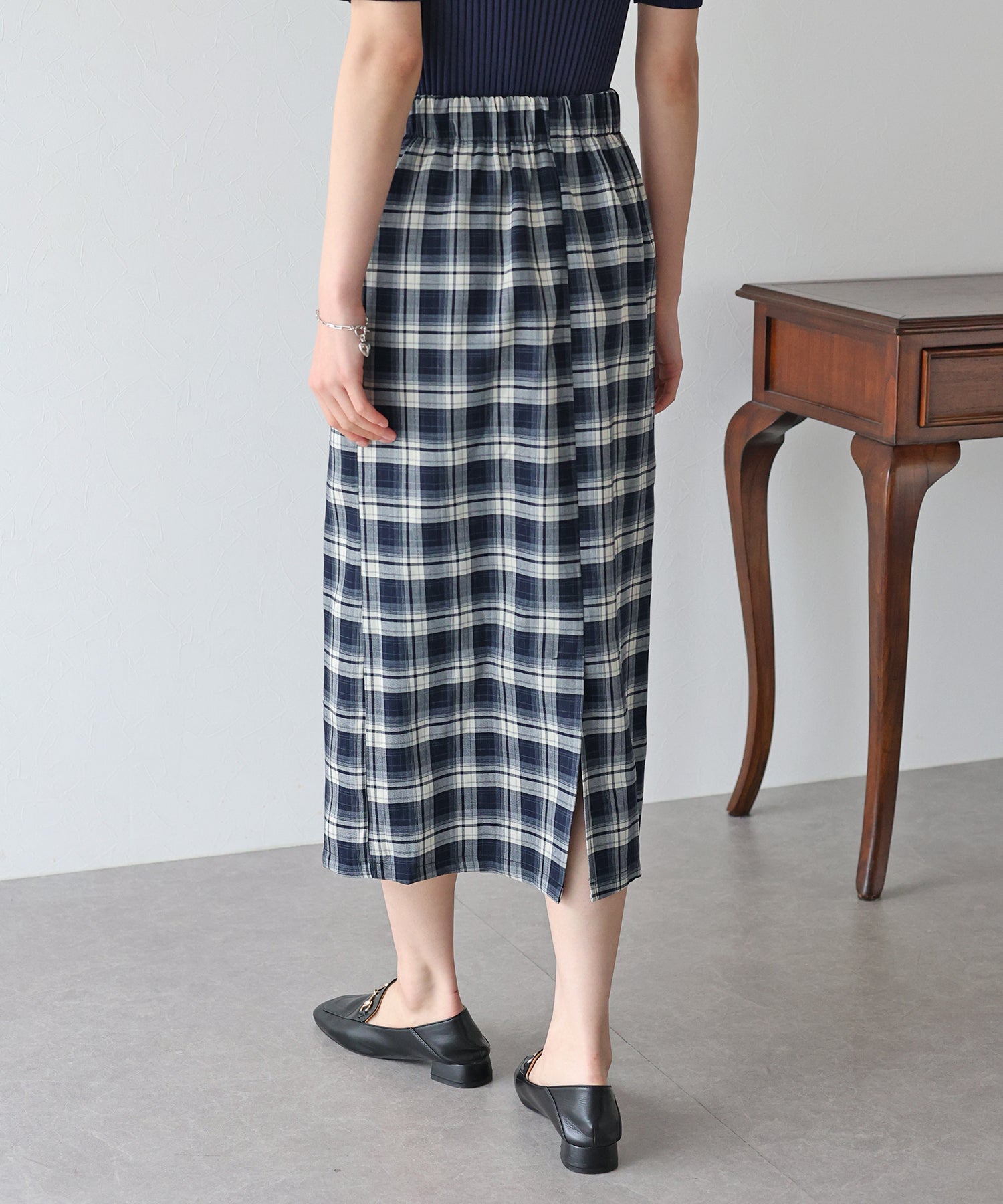 チェック柄が目を引くタイトスカート。