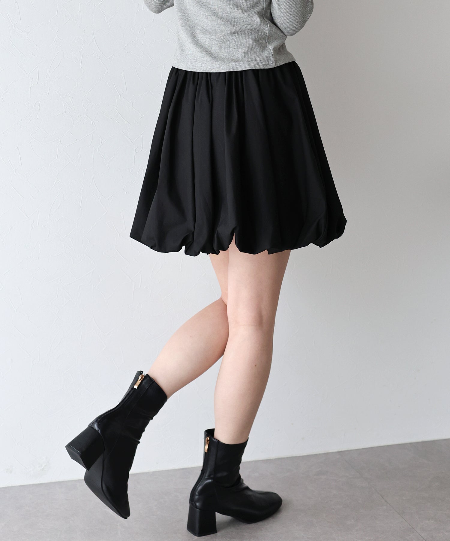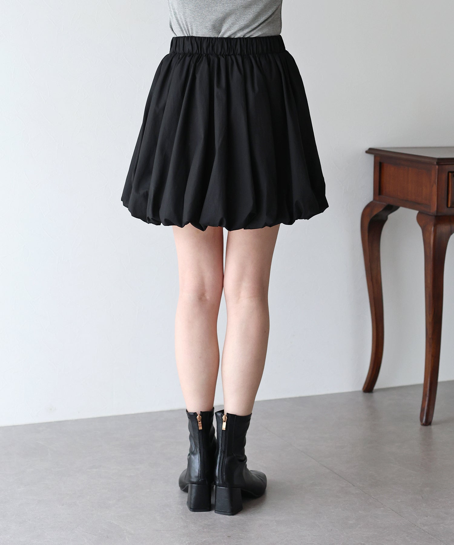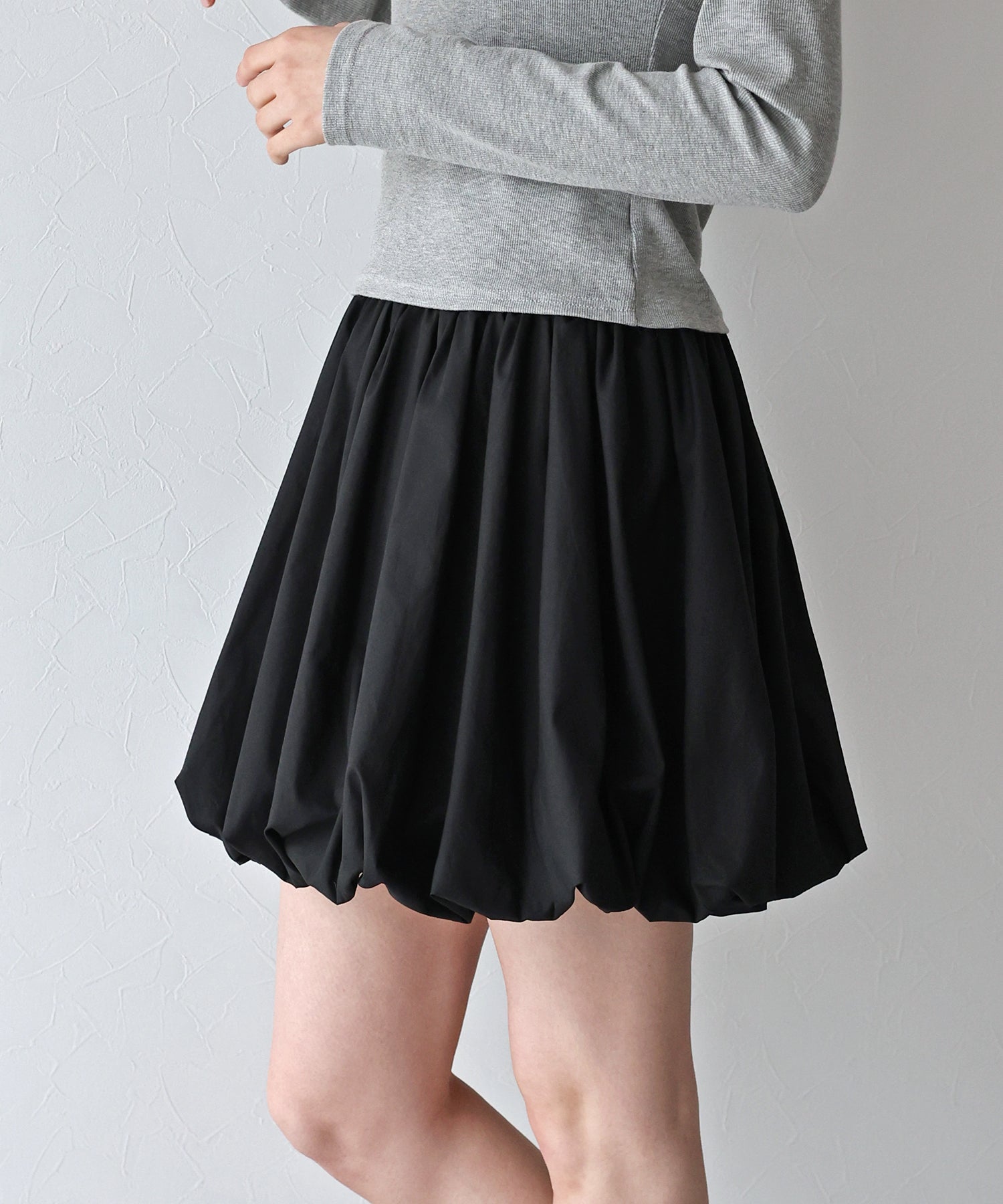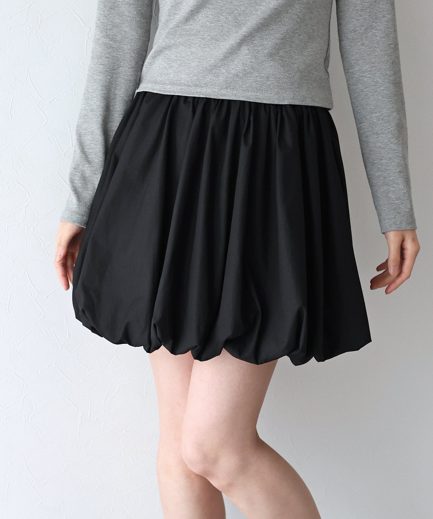 ふんわりとしたボリューム感が目を惹くトレンドガーリーなバルーンスカート ?POINT たっぷりとボリュームを出したバルーンシルエットで、より立体感のあるルックスに仕上げたミニスカート。 ハリ感のある素材感と内側のゴムできれいなシルエットをキープします。 腰回りと太ももの体形カバーをしてくれるので、メリハリが出てスタイリングアップ効果も◎ ウエスト部分がゴム仕様になっているので、ラクに着られます。 大人も着られる短すぎない丈感も嬉しいポイント! 一枚持っているだけでトレンド感のあるコーデがキマるおすすめアイテムです。
