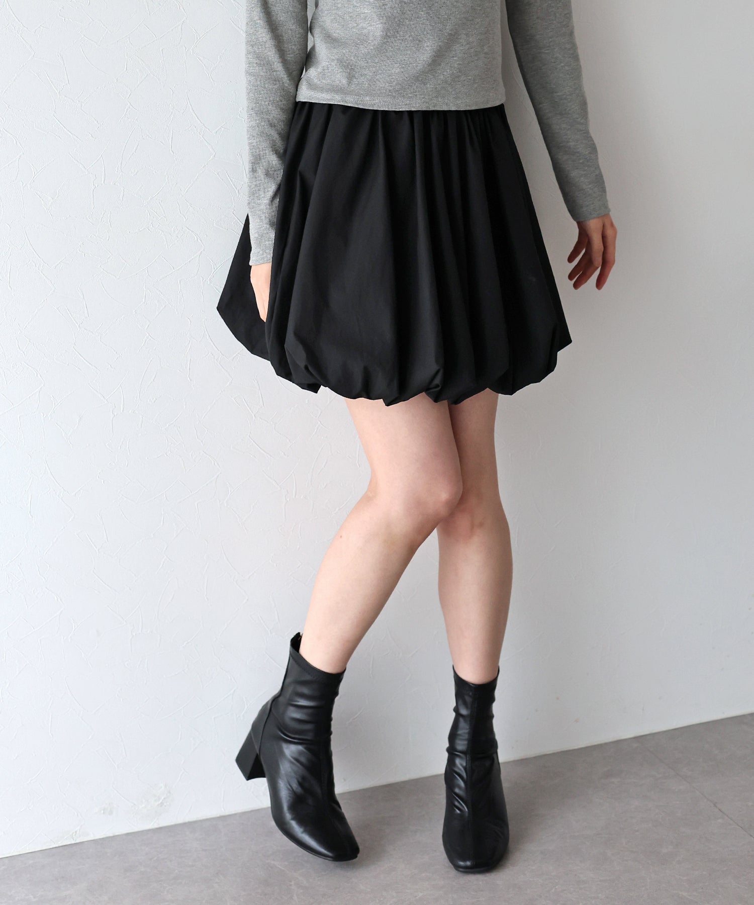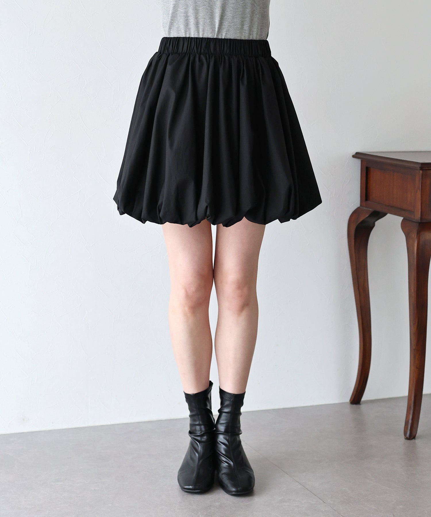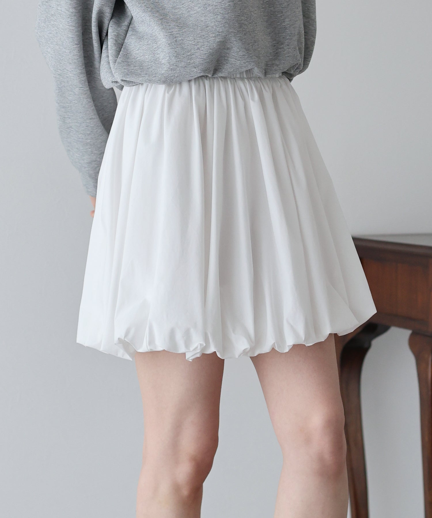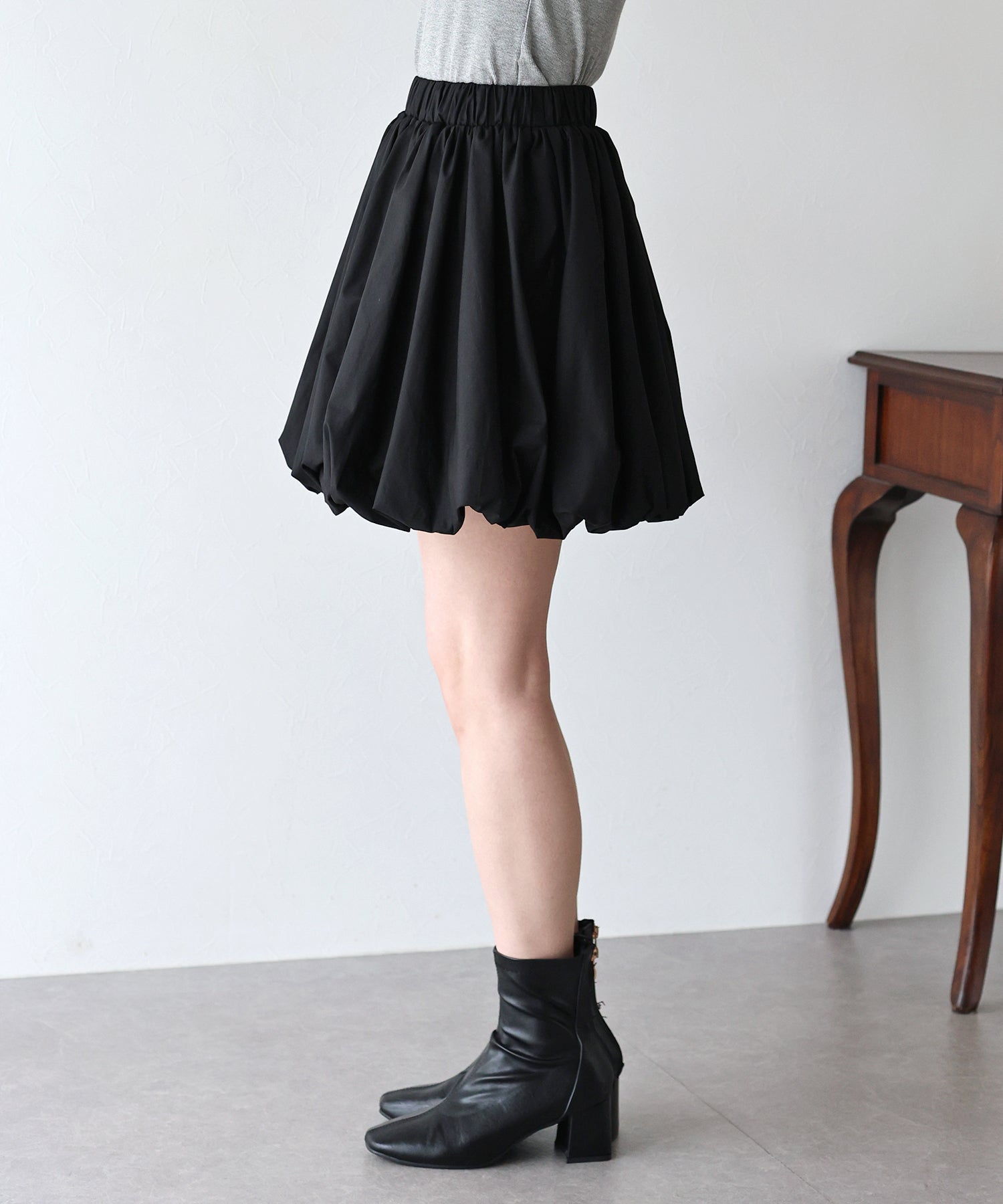 ふんわりとしたボリューム感が目を惹くトレンドガーリーなバルーンスカート ?POINT たっぷりとボリュームを出したバルーンシルエットで、より立体感のあるルックスに仕上げたミニスカート。 ハリ感のある素材感と内側のゴムできれいなシルエットをキープします。 腰回りと太ももの体形カバーをしてくれるので、メリハリが出てスタイリングアップ効果も◎ ウエスト部分がゴム仕様になっているので、ラクに着られます。 大人も着られる短すぎない丈感も嬉しいポイント! 一枚持っているだけでトレンド感のあるコーデがキマるおすすめアイテムです。