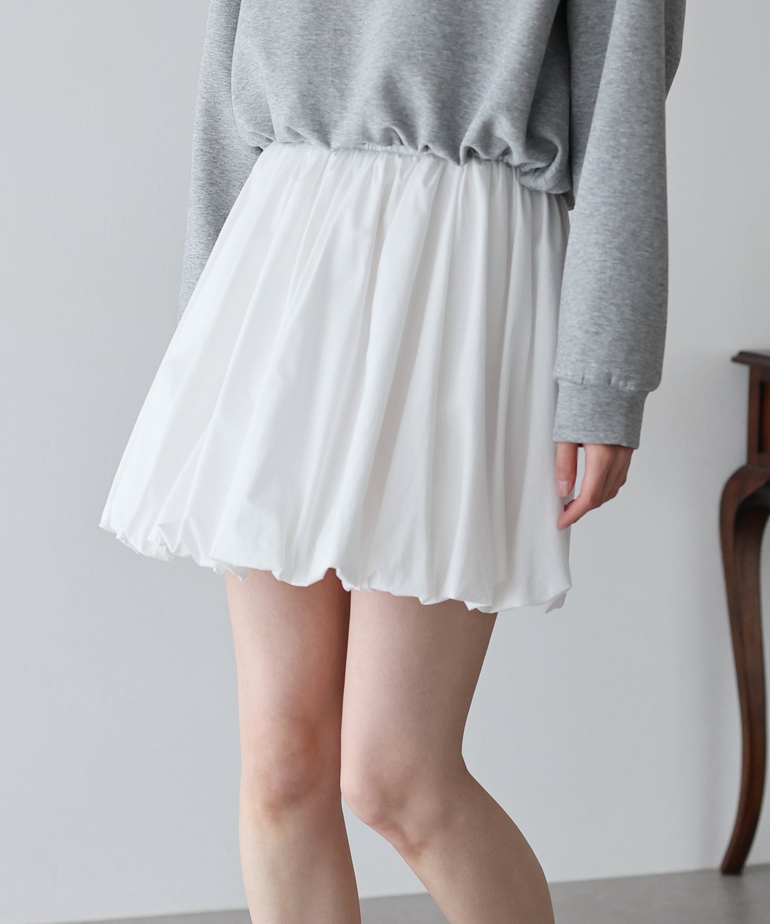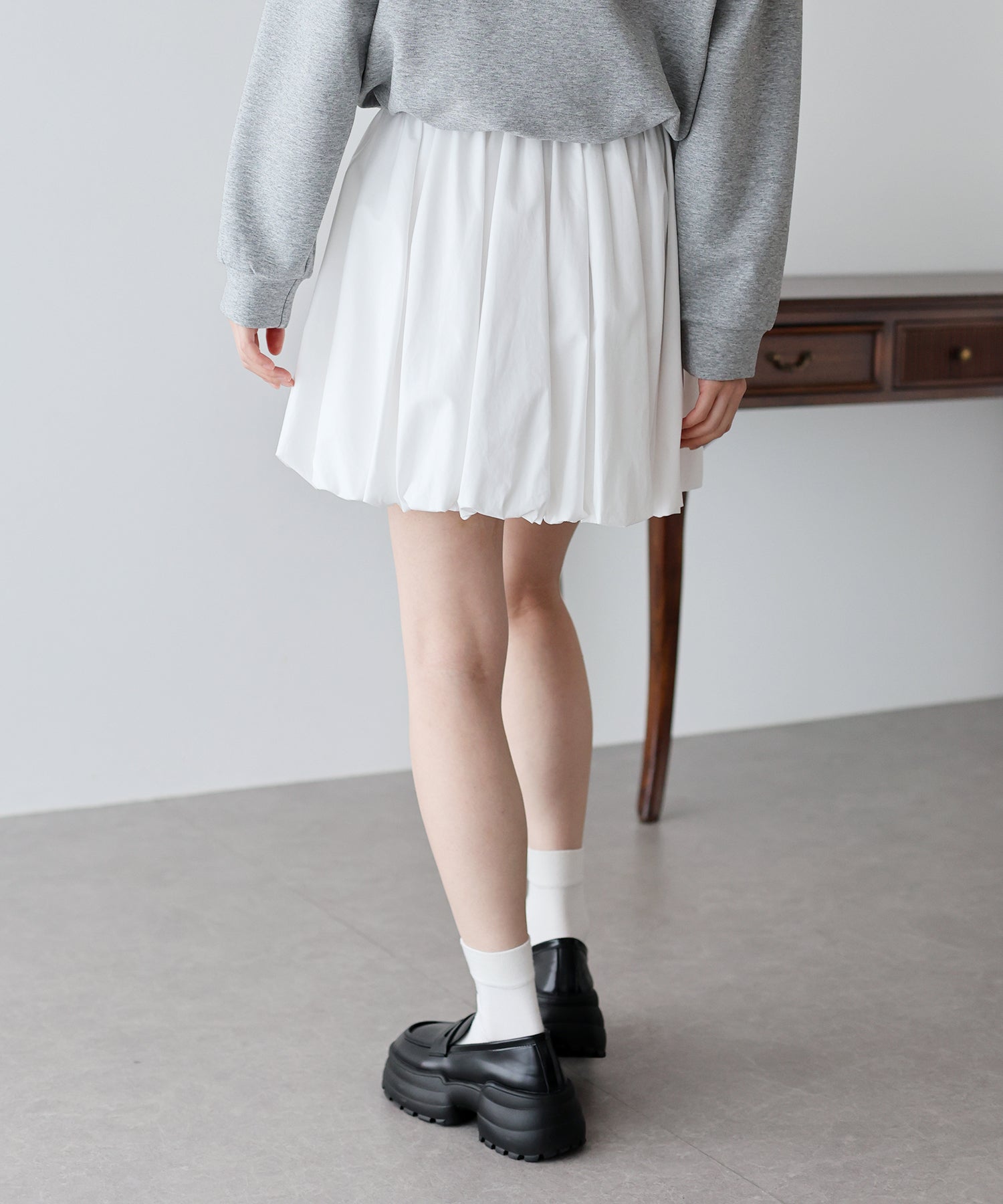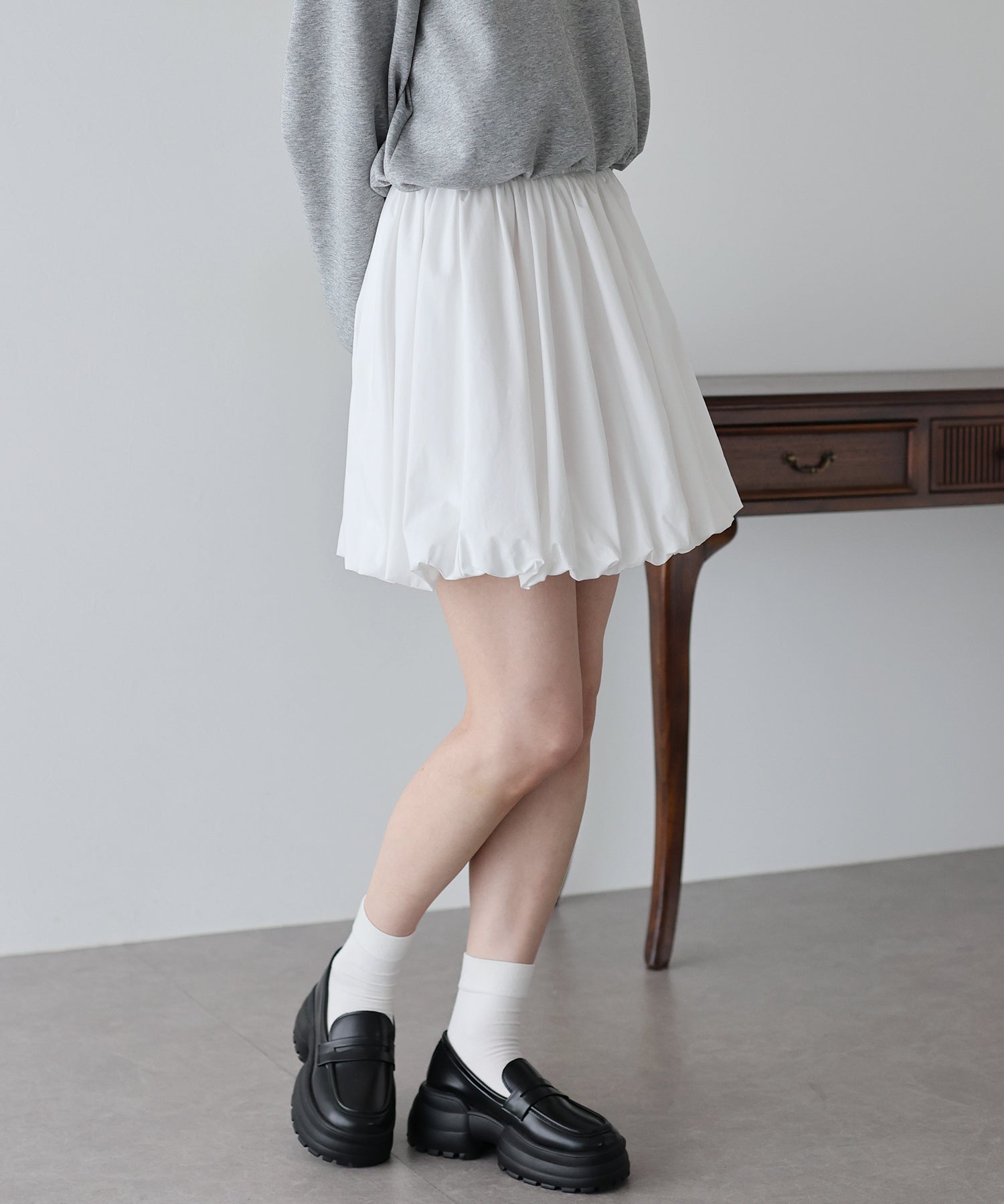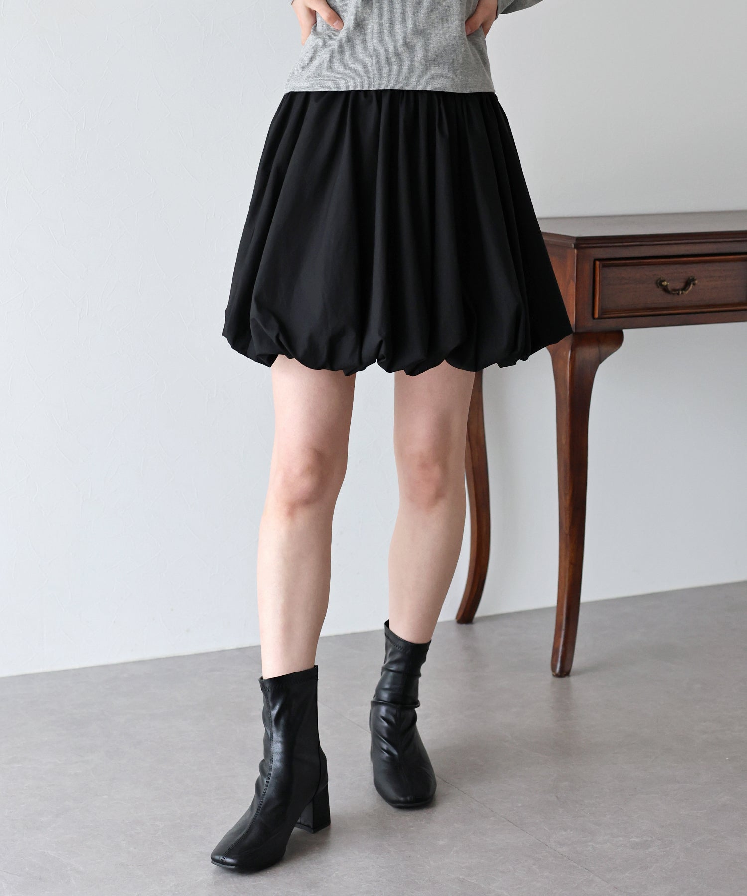 ふんわりとしたボリューム感が目を惹くトレンドガーリーなバルーンスカート ?POINT たっぷりとボリュームを出したバルーンシルエットで、より立体感のあるルックスに仕上げたミニスカート。 ハリ感のある素材感と内側のゴムできれいなシルエットをキープします。 腰回りと太ももの体形カバーをしてくれるので、メリハリが出てスタイリングアップ効果も◎ ウエスト部分がゴム仕様になっているので、ラクに着られます。 大人も着られる短すぎない丈感も嬉しいポイント! 一枚持っているだけでトレンド感のあるコーデがキマるおすすめアイテムです。
