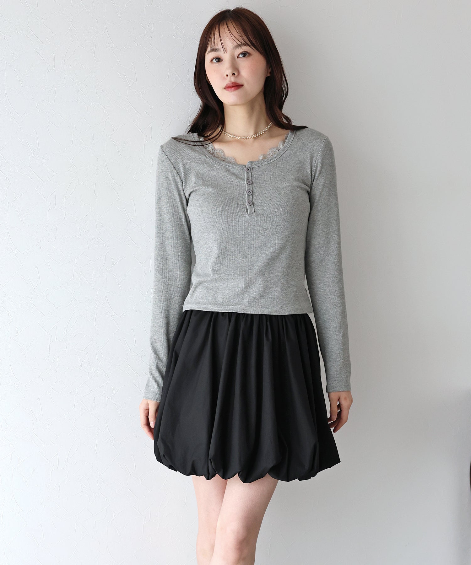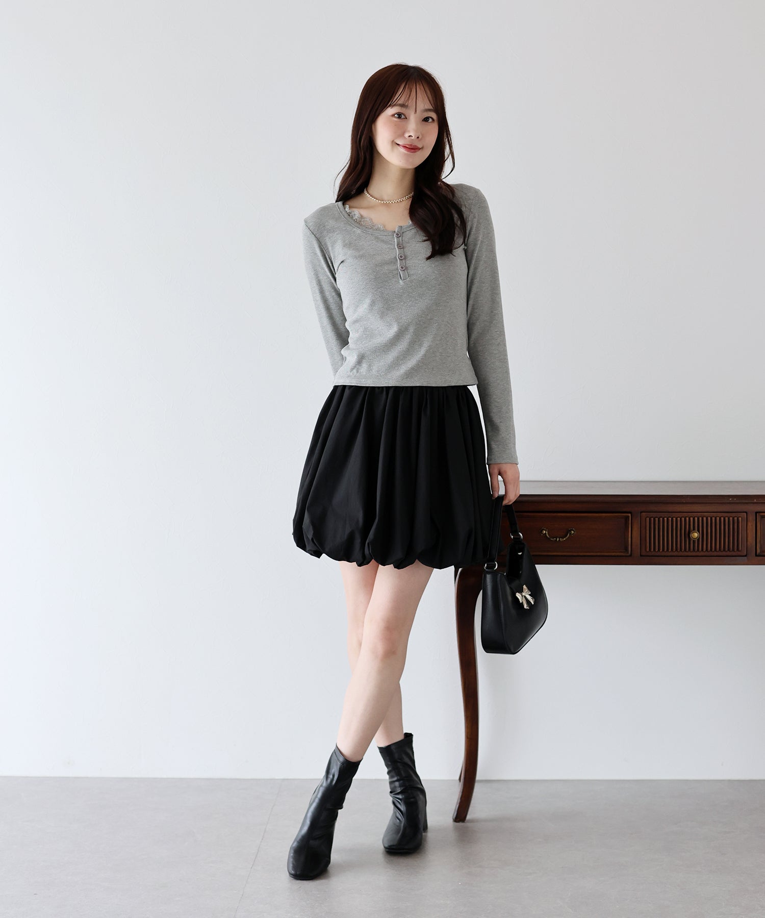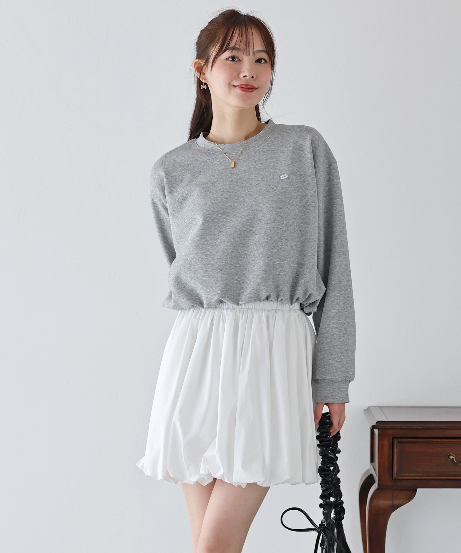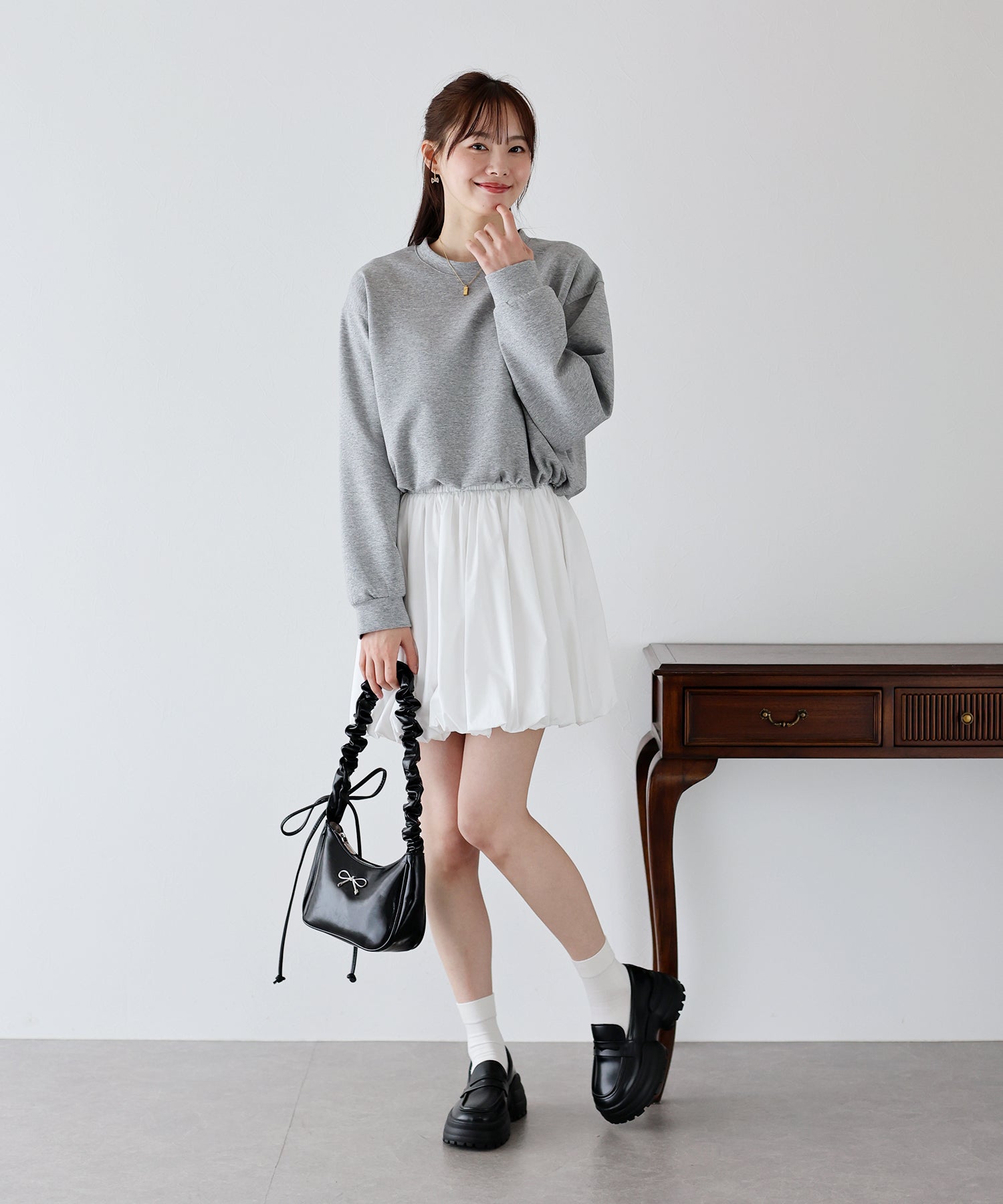 ふんわりとしたボリューム感が目を惹くトレンドガーリーなバルーンスカート ?POINT たっぷりとボリュームを出したバルーンシルエットで、より立体感のあるルックスに仕上げたミニスカート。 ハリ感のある素材感と内側のゴムできれいなシルエットをキープします。 腰回りと太ももの体形カバーをしてくれるので、メリハリが出てスタイリングアップ効果も◎ ウエスト部分がゴム仕様になっているので、ラクに着られます。 大人も着られる短すぎない丈感も嬉しいポイント! 一枚持っているだけでトレンド感のあるコーデがキマるおすすめアイテムです。