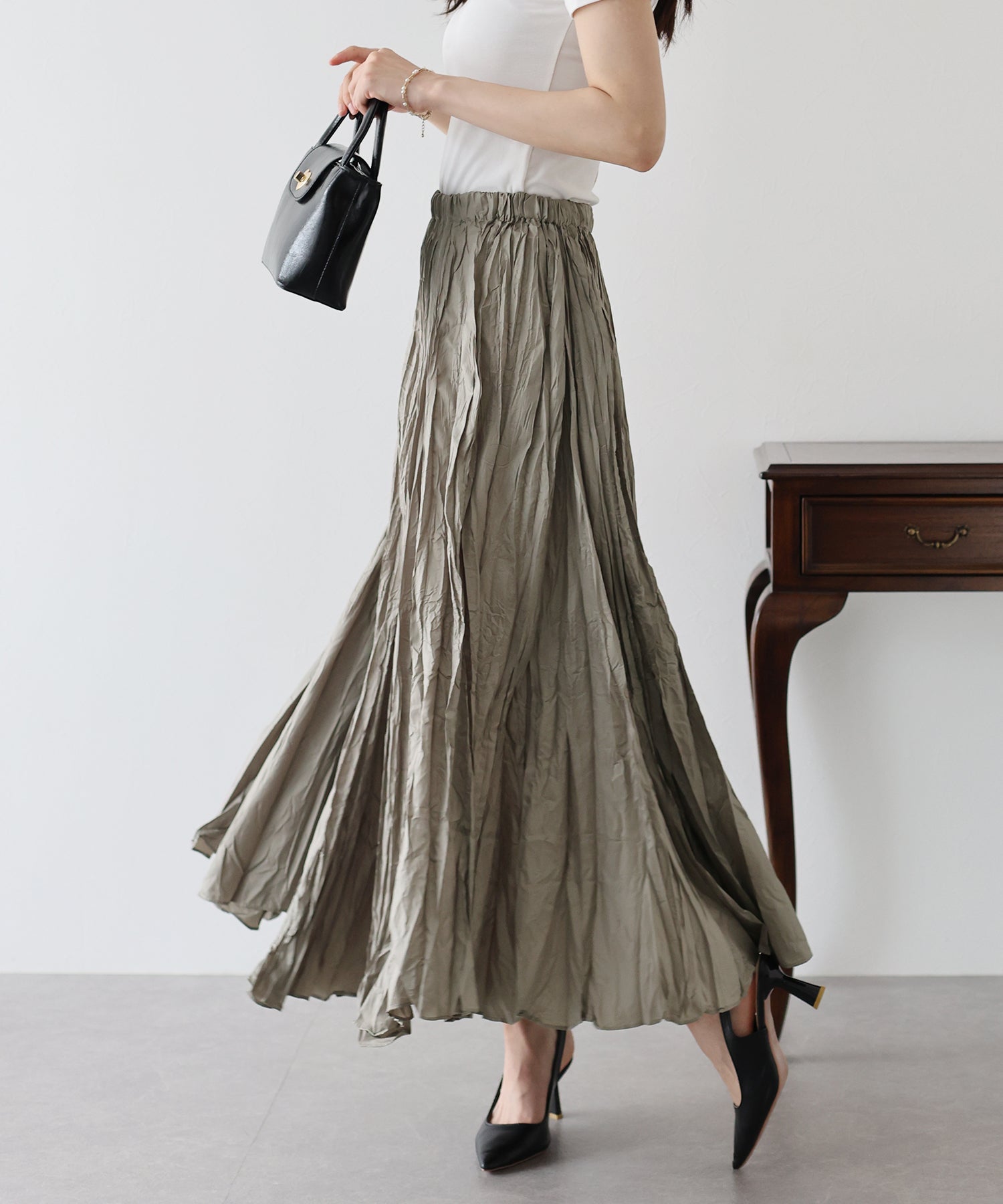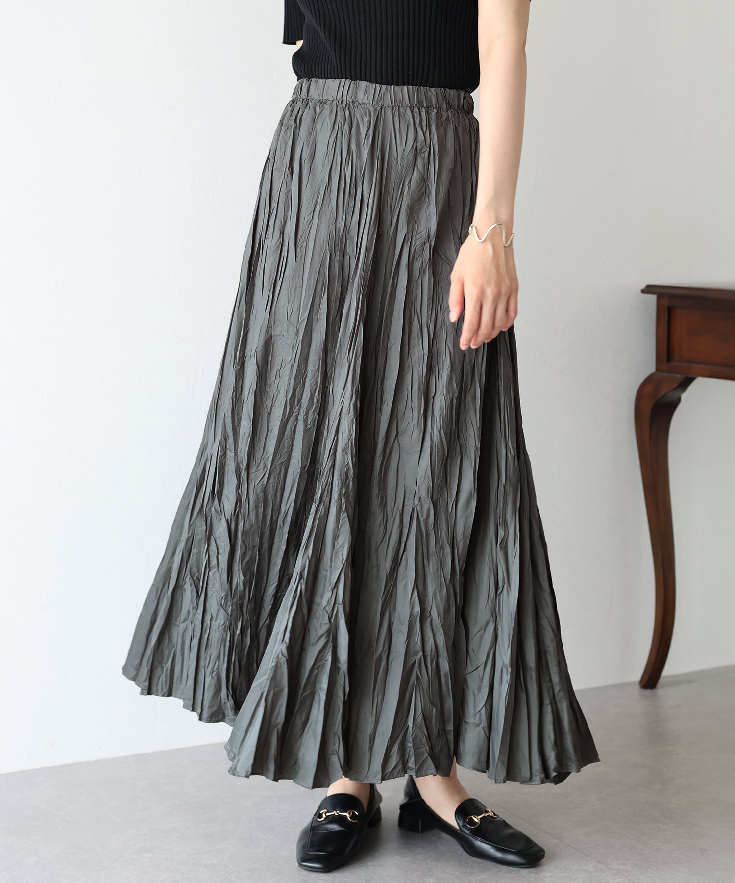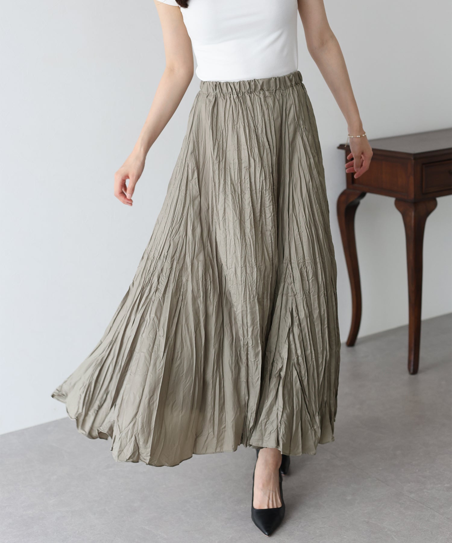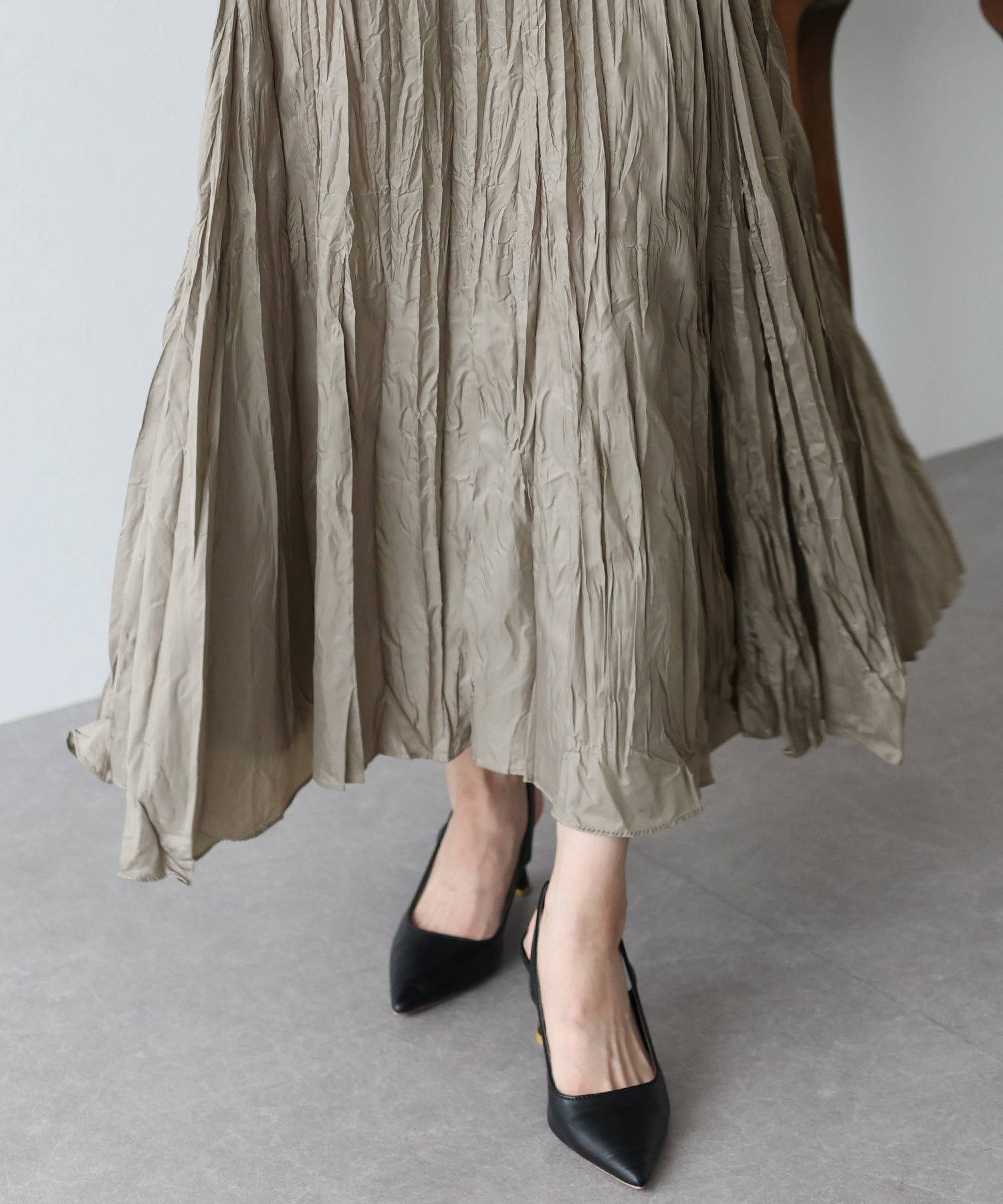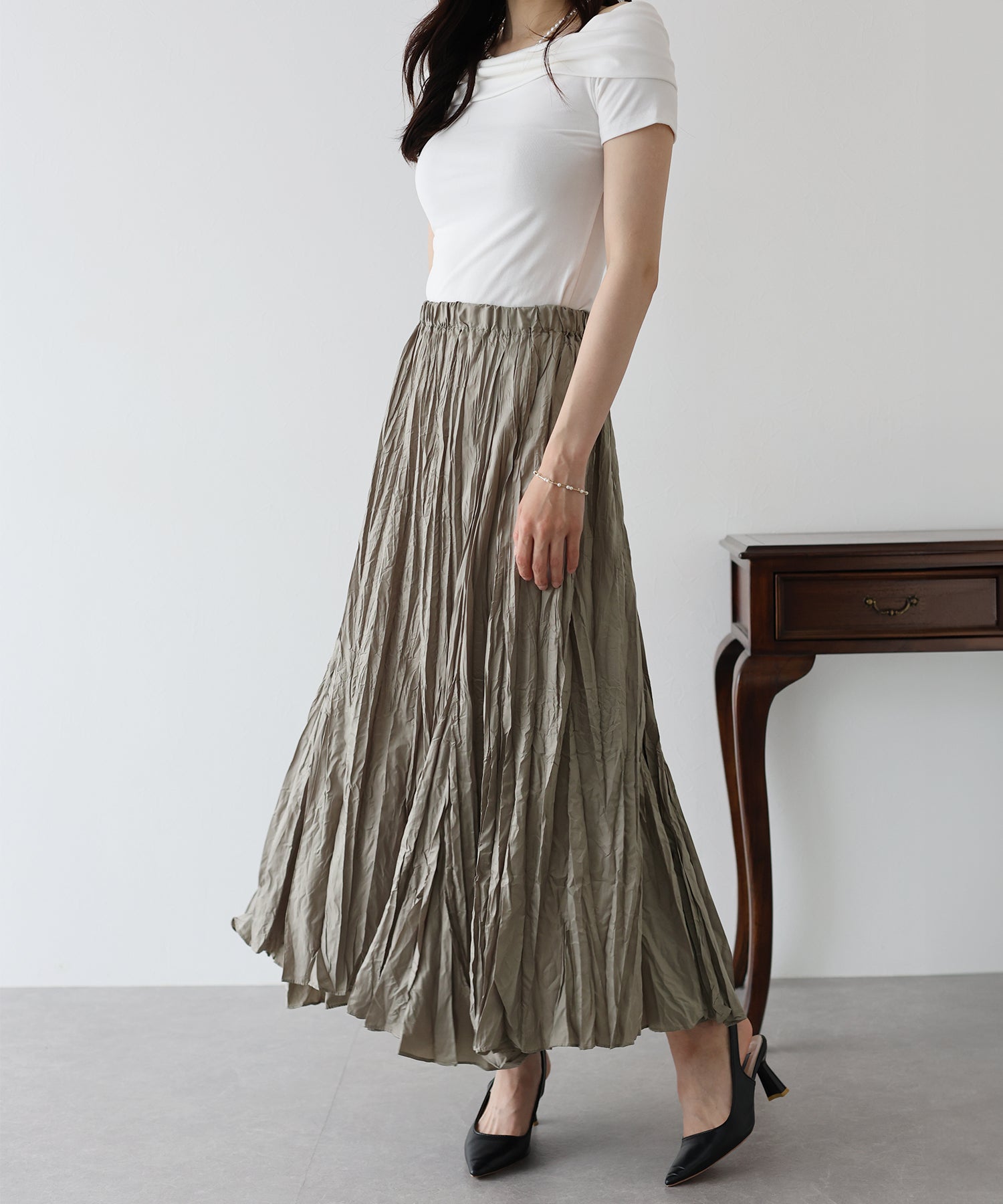 ふんわりと揺れるシワ加工されたプリーツで女性らしい雰囲気とこなれ感を演出し、着るだけでオシャレなコーデが完成します。