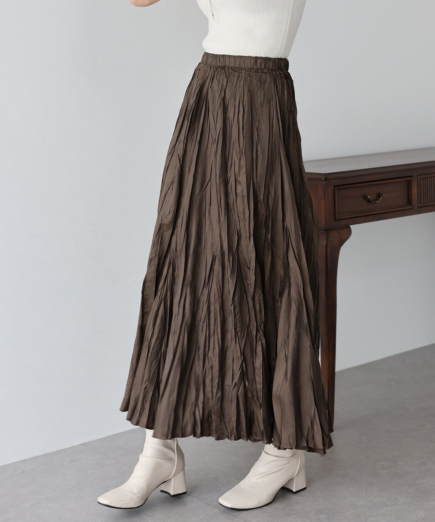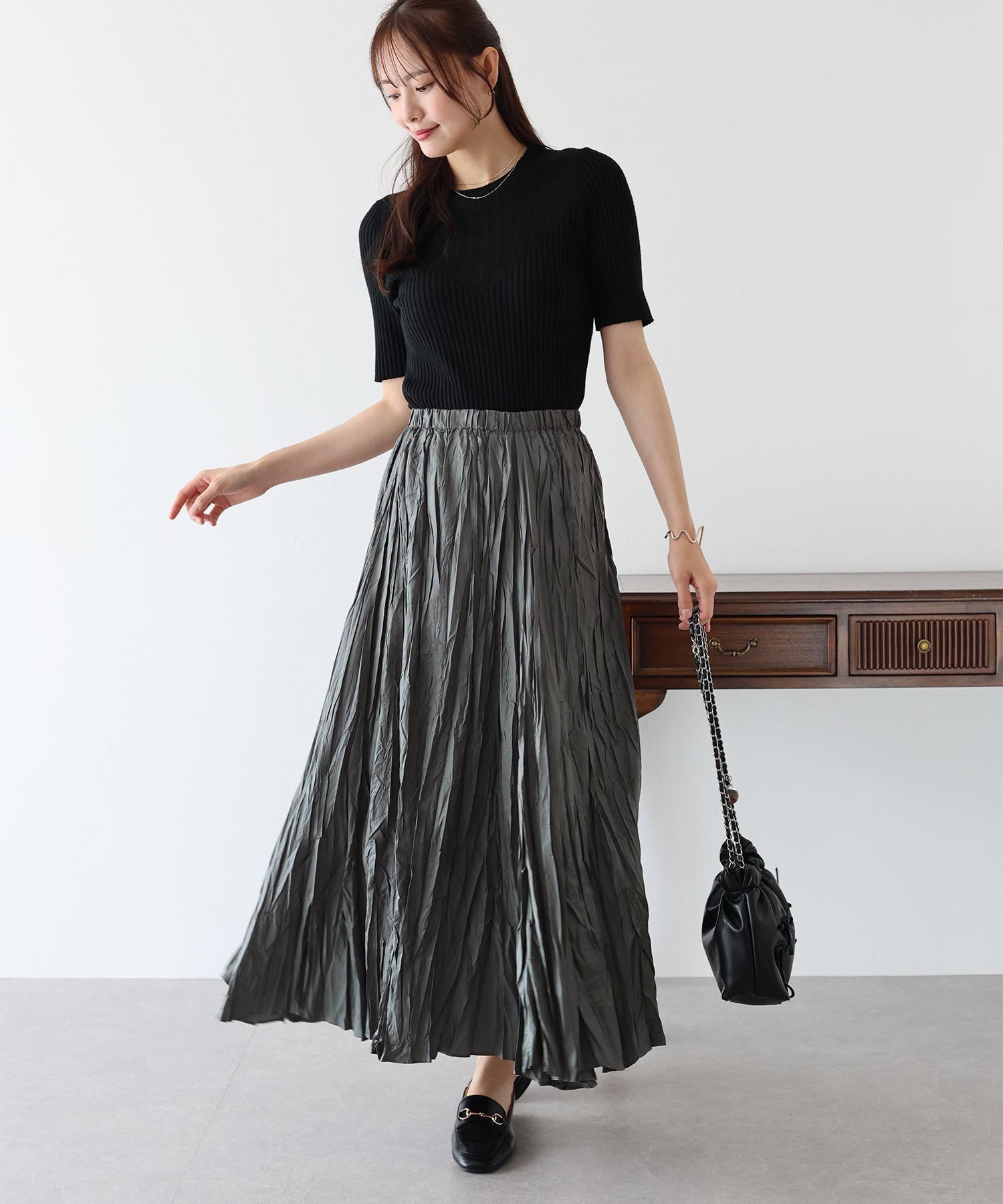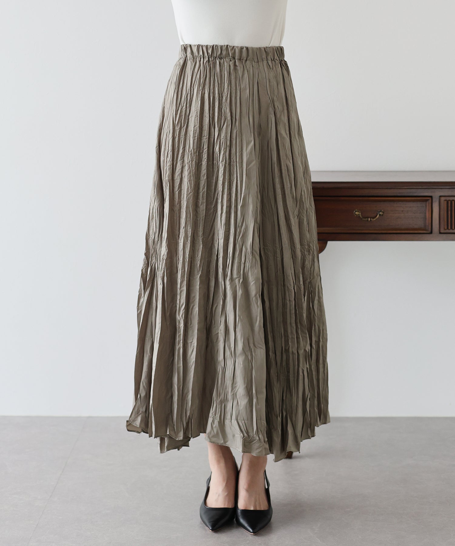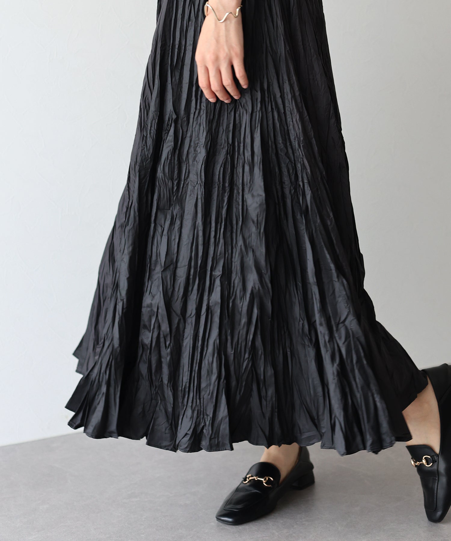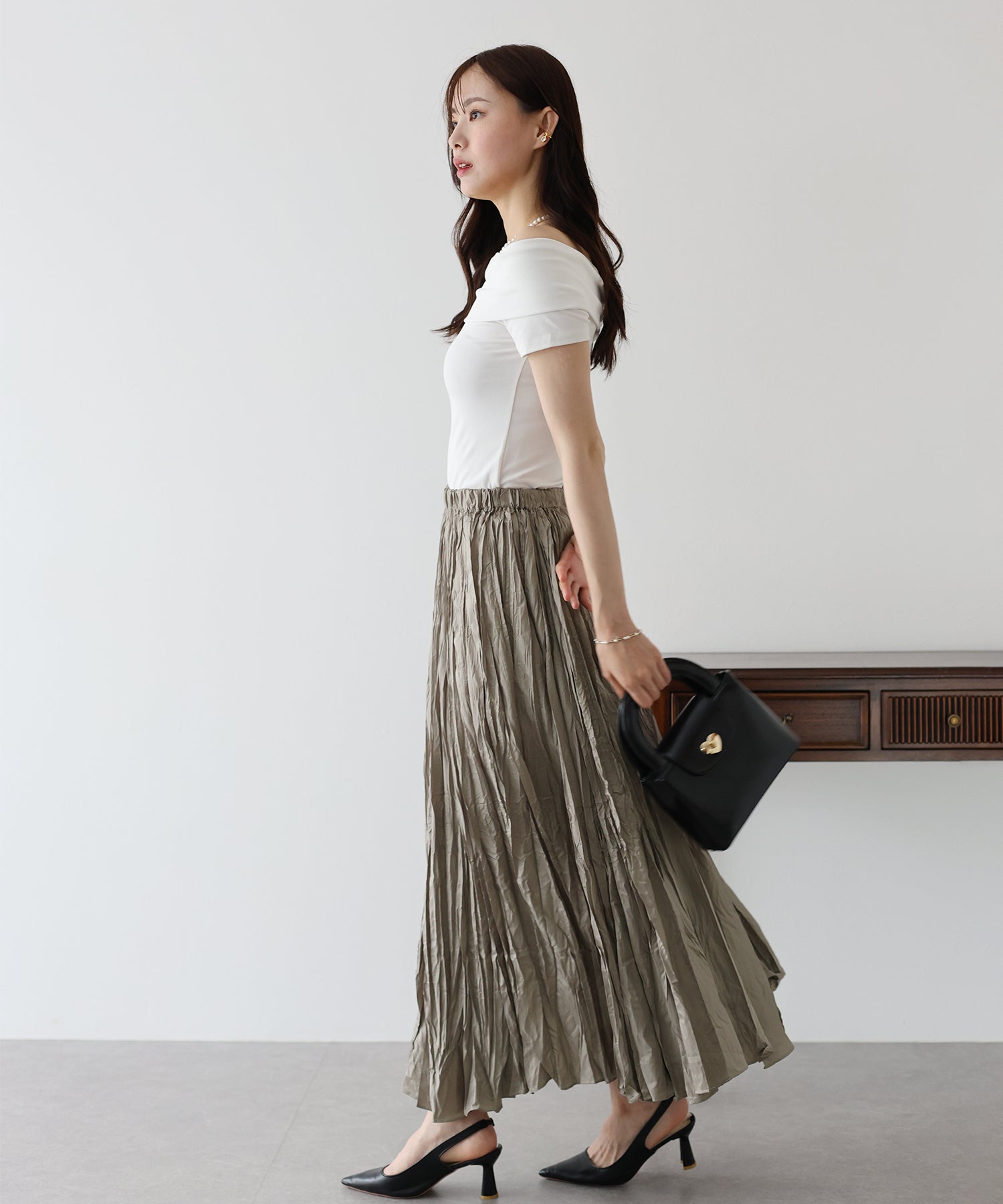 ふんわりと揺れるシワ加工されたプリーツで女性らしい雰囲気とこなれ感を演出し、着るだけでオシャレなコーデが完成します。