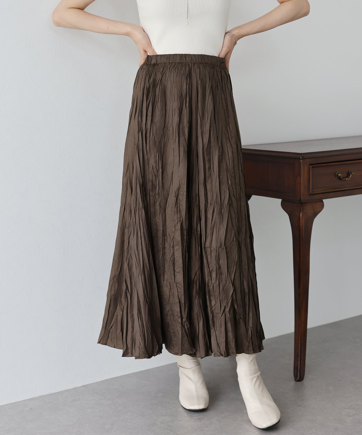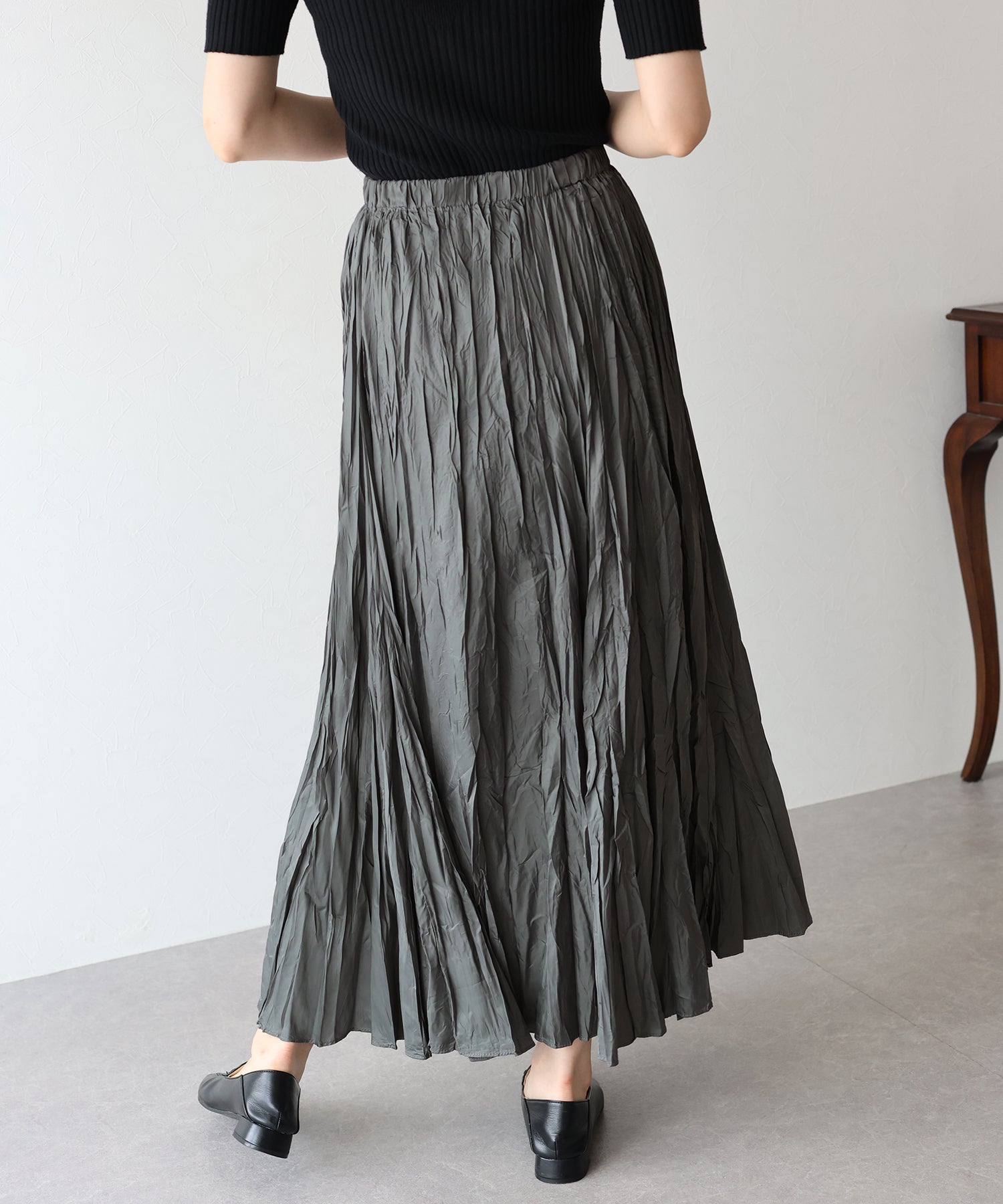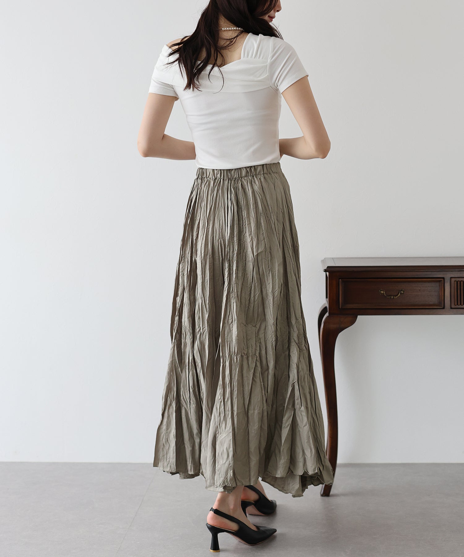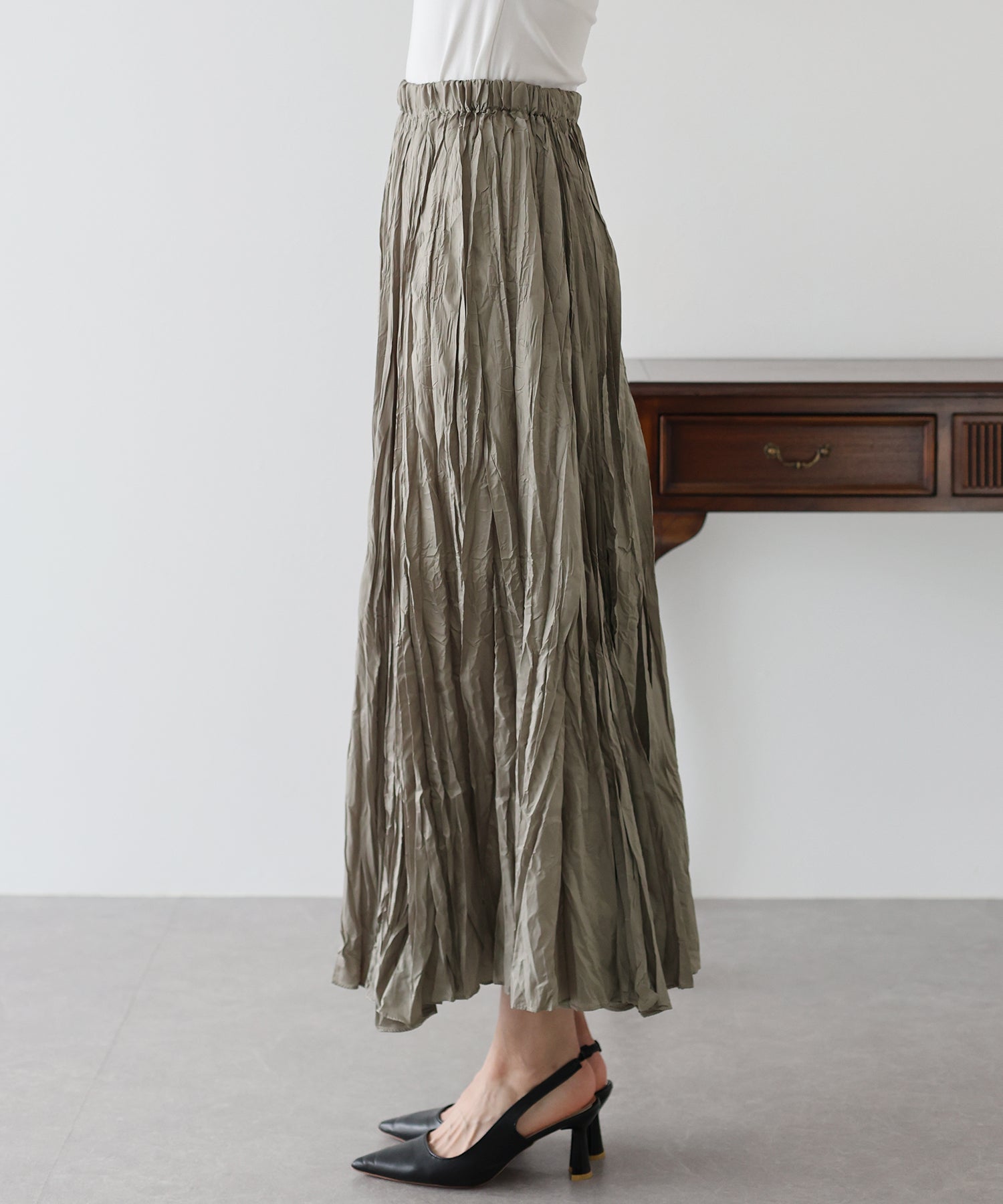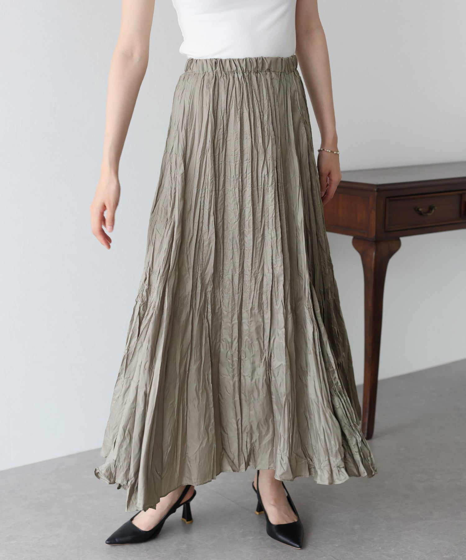 ふんわりと揺れるシワ加工されたプリーツで女性らしい雰囲気とこなれ感を演出し、着るだけでオシャレなコーデが完成します。