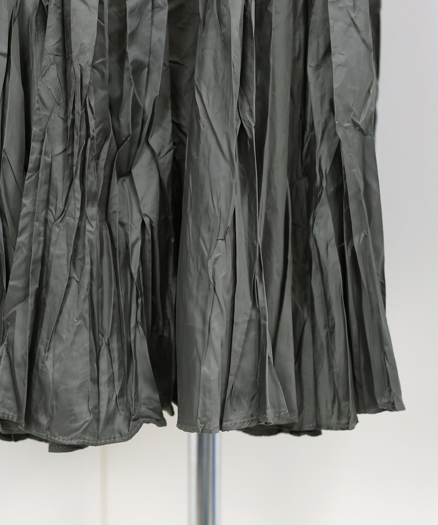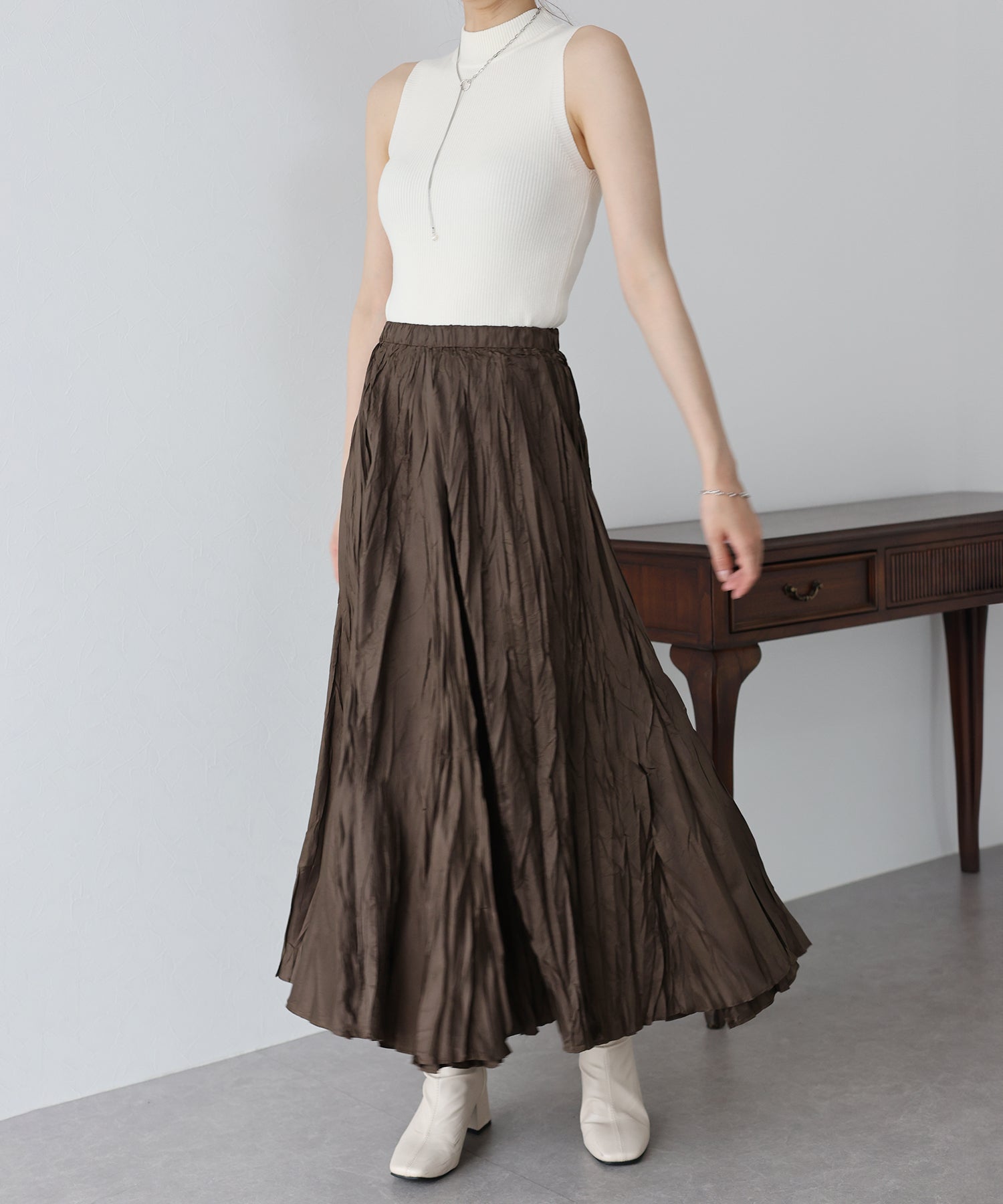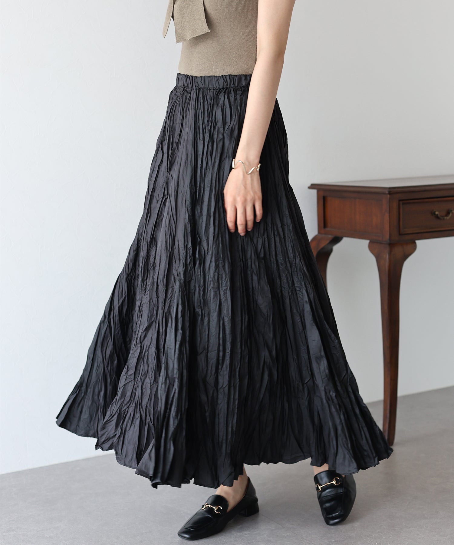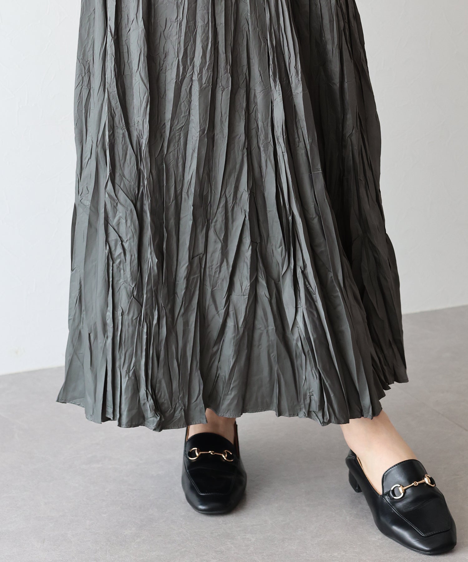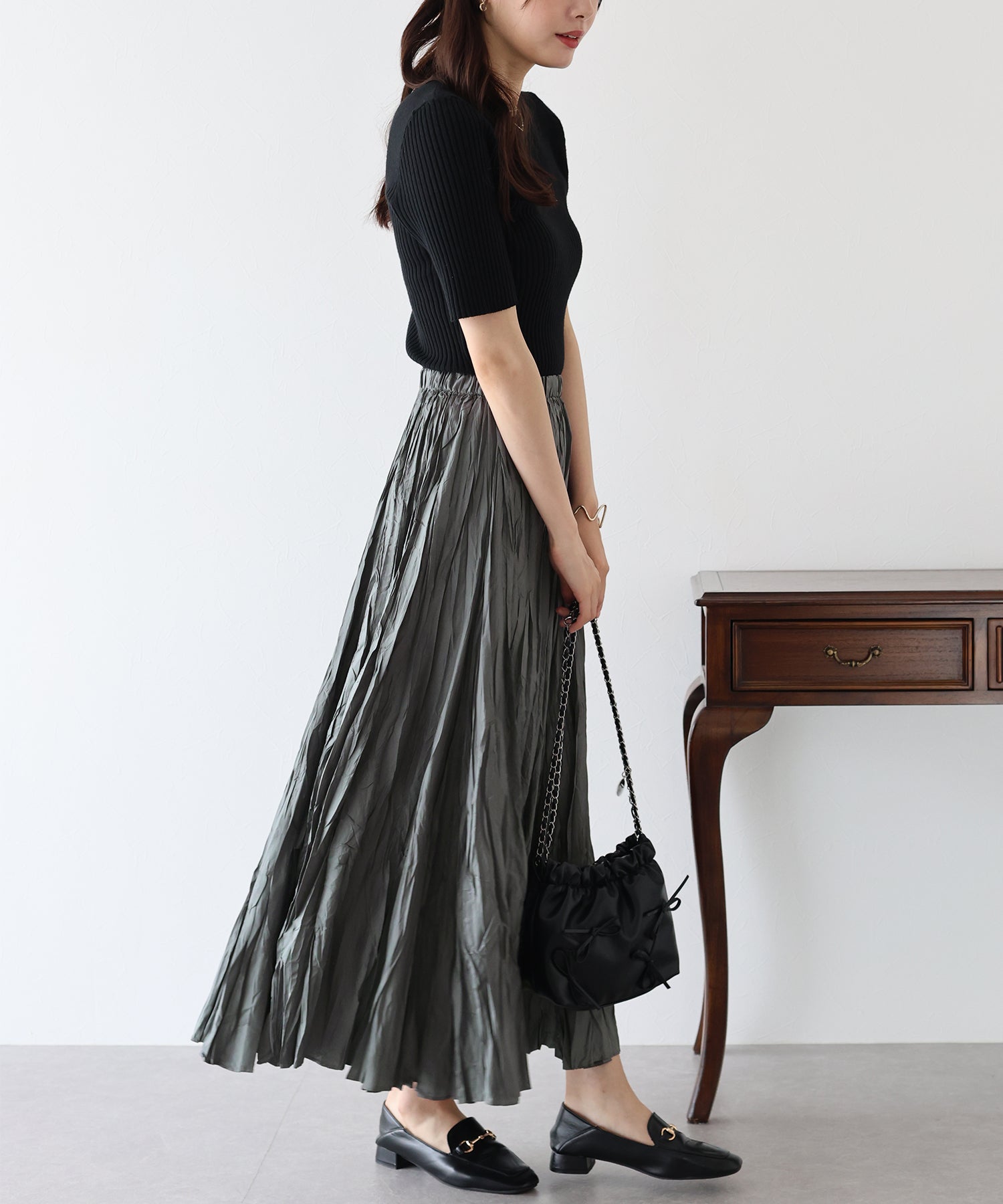 ふんわりと揺れるシワ加工されたプリーツで女性らしい雰囲気とこなれ感を演出し、着るだけでオシャレなコーデが完成します。