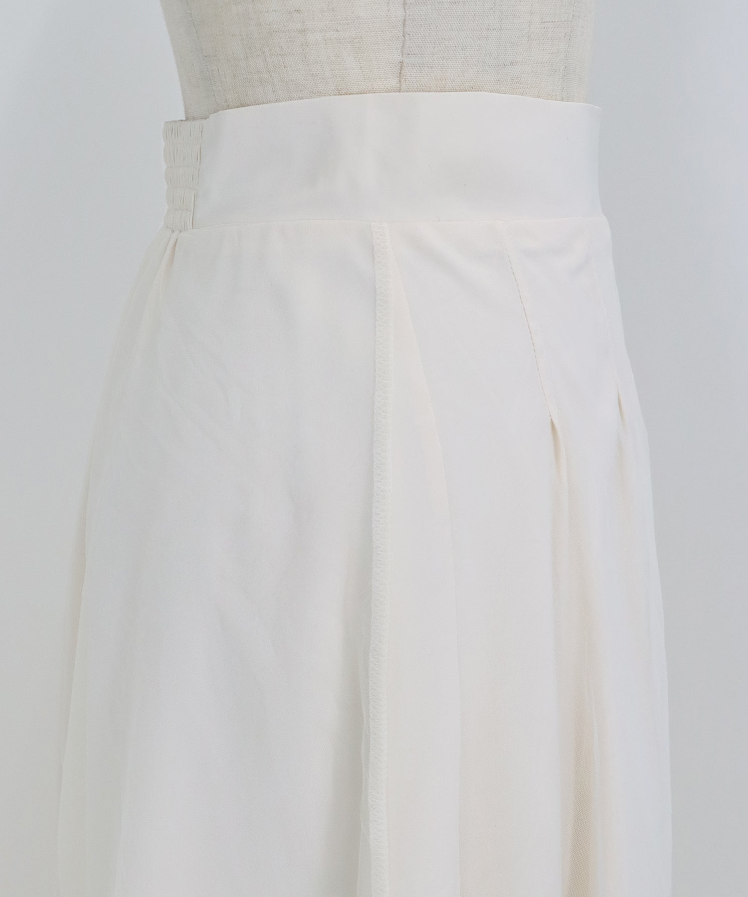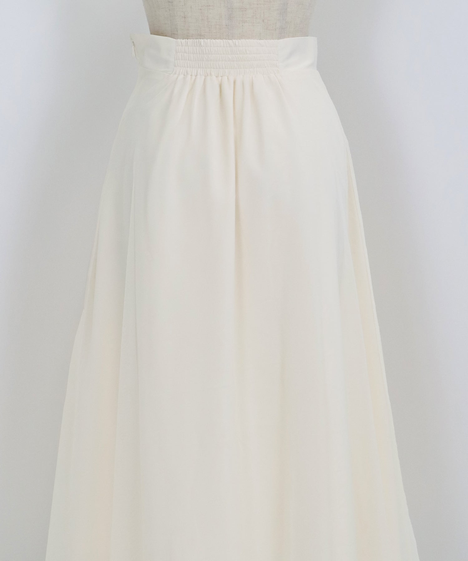 ウエストバックゴムとサイドファスナーでラクに着用でき、別布だけでなく裏地もあしらわれているため、透けにくく気軽に着られます。