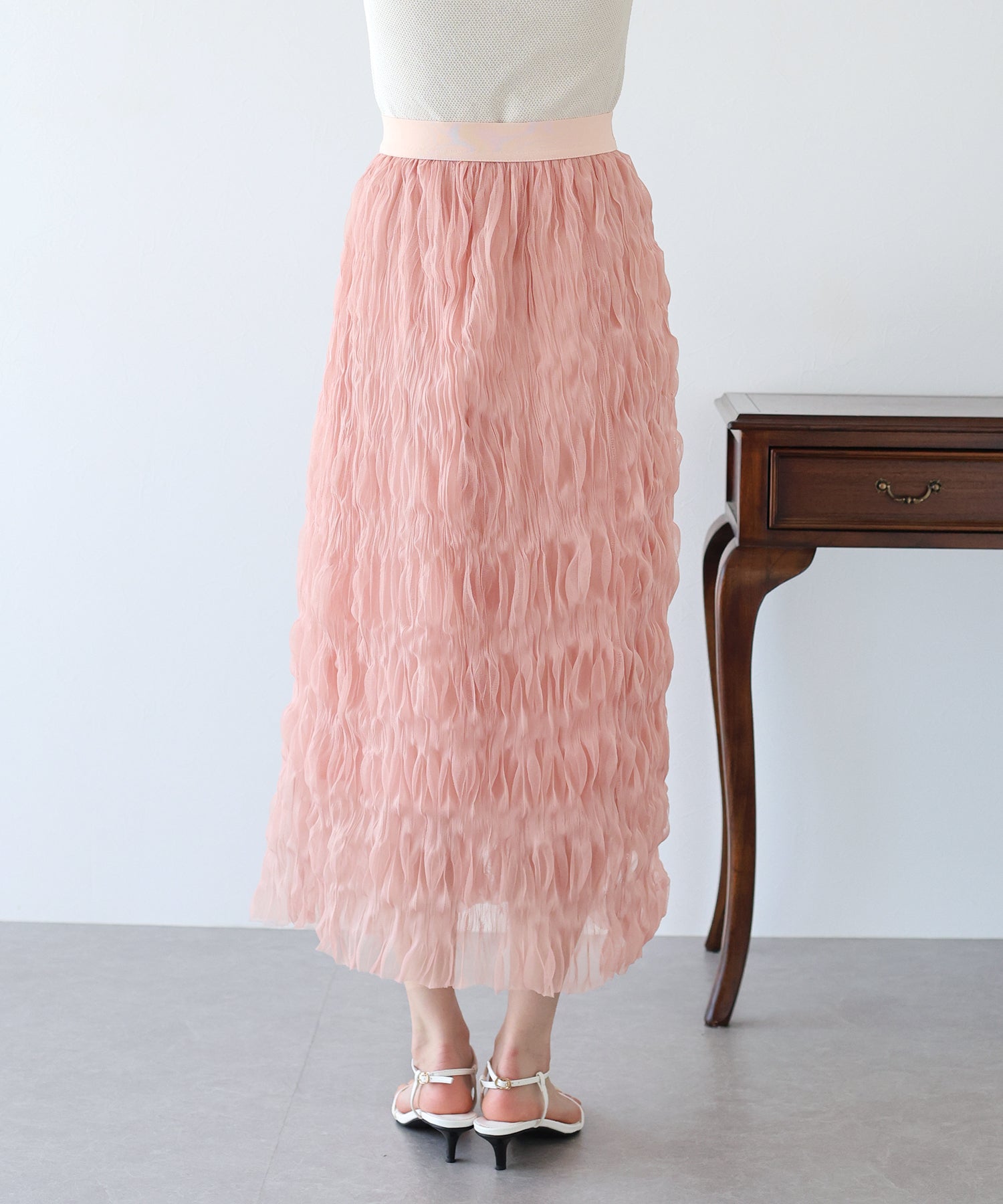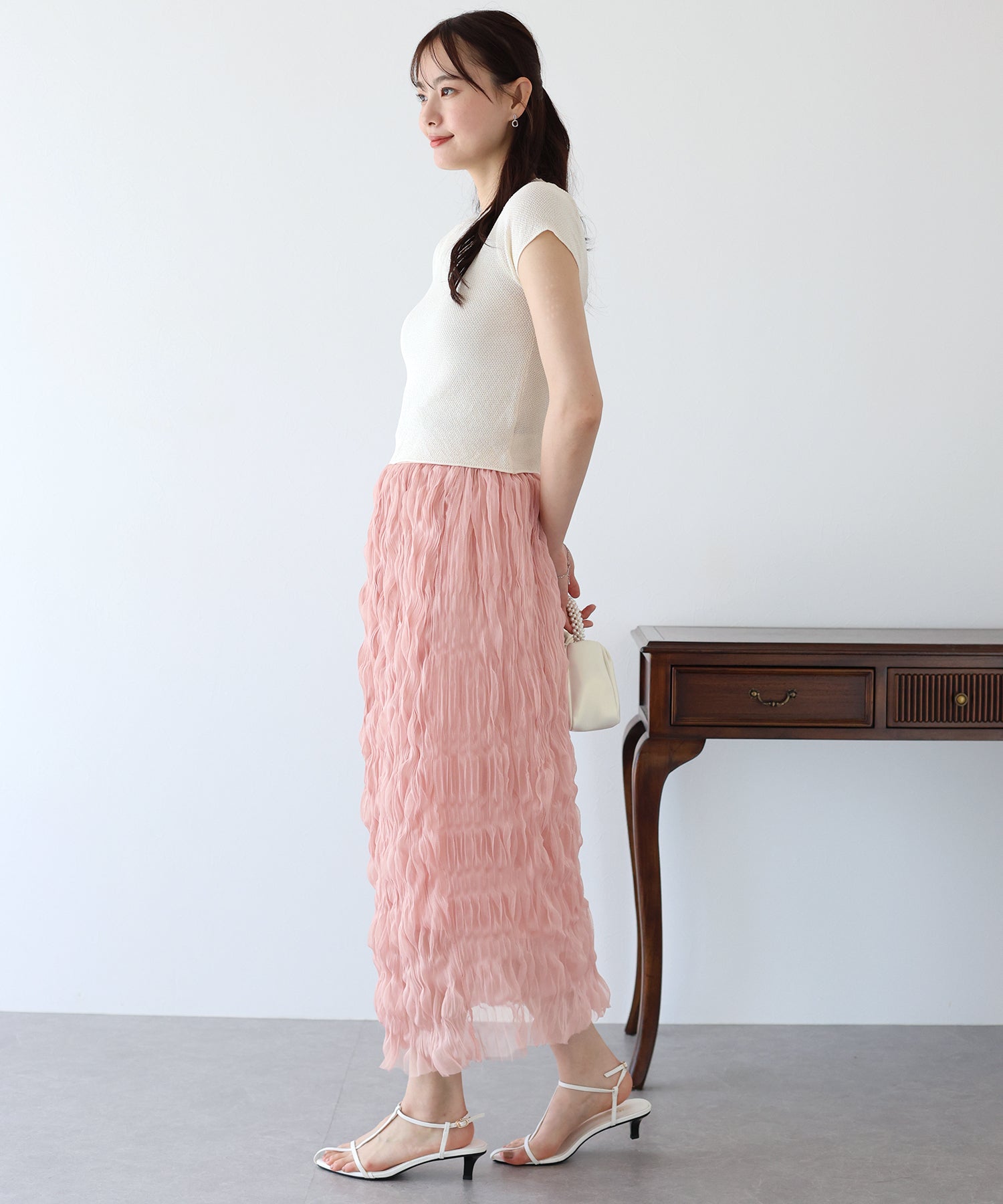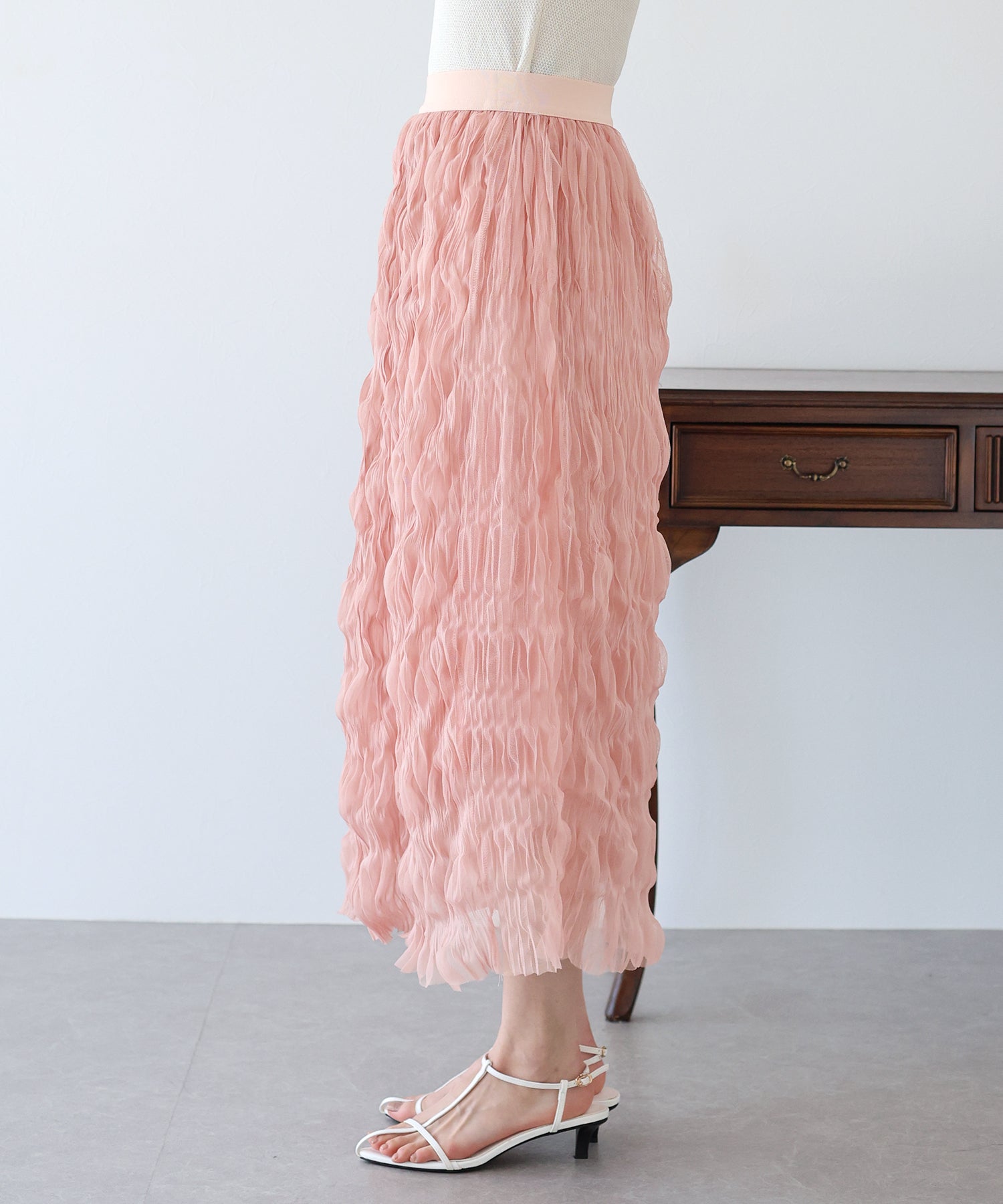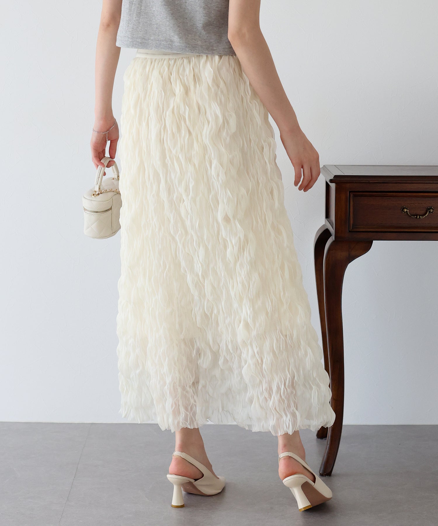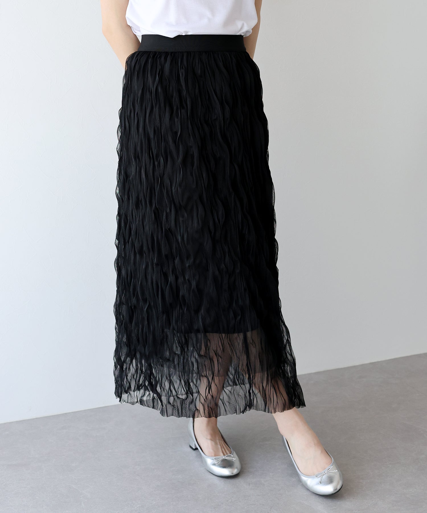 ホイップクリームのようなボリューム感のあるチュールスカート ?POINT ホイップをたっぷり絞ったようなボリュームとシアー感が華やかなチュールスカート。 チュールスカートには珍しいIラインシルエットで、身体のラインを拾いすぎずスッキリと見せてくれます。 ウエスト部分はゴム仕様なのでストレスなく着用いただけます。 シンプルなトップスに合わせるだけで華やかになる主役アイテムです。