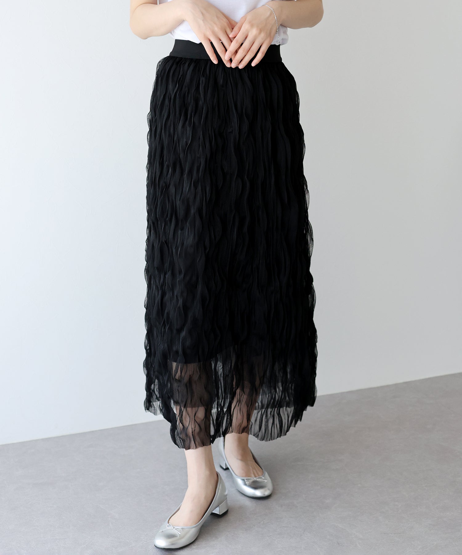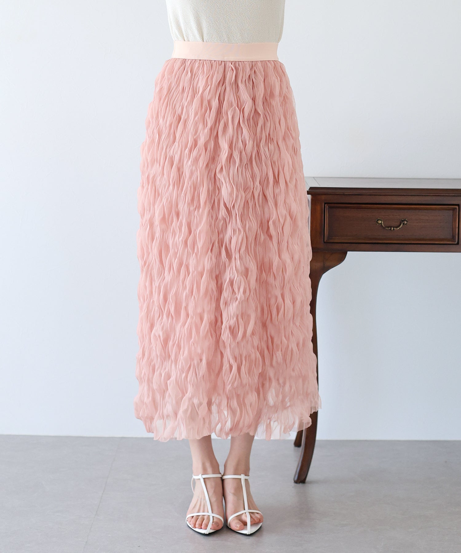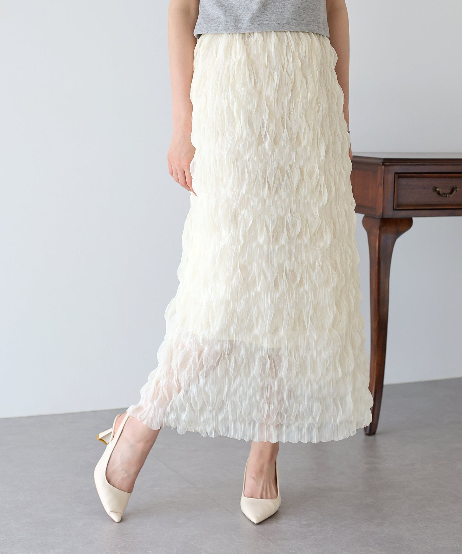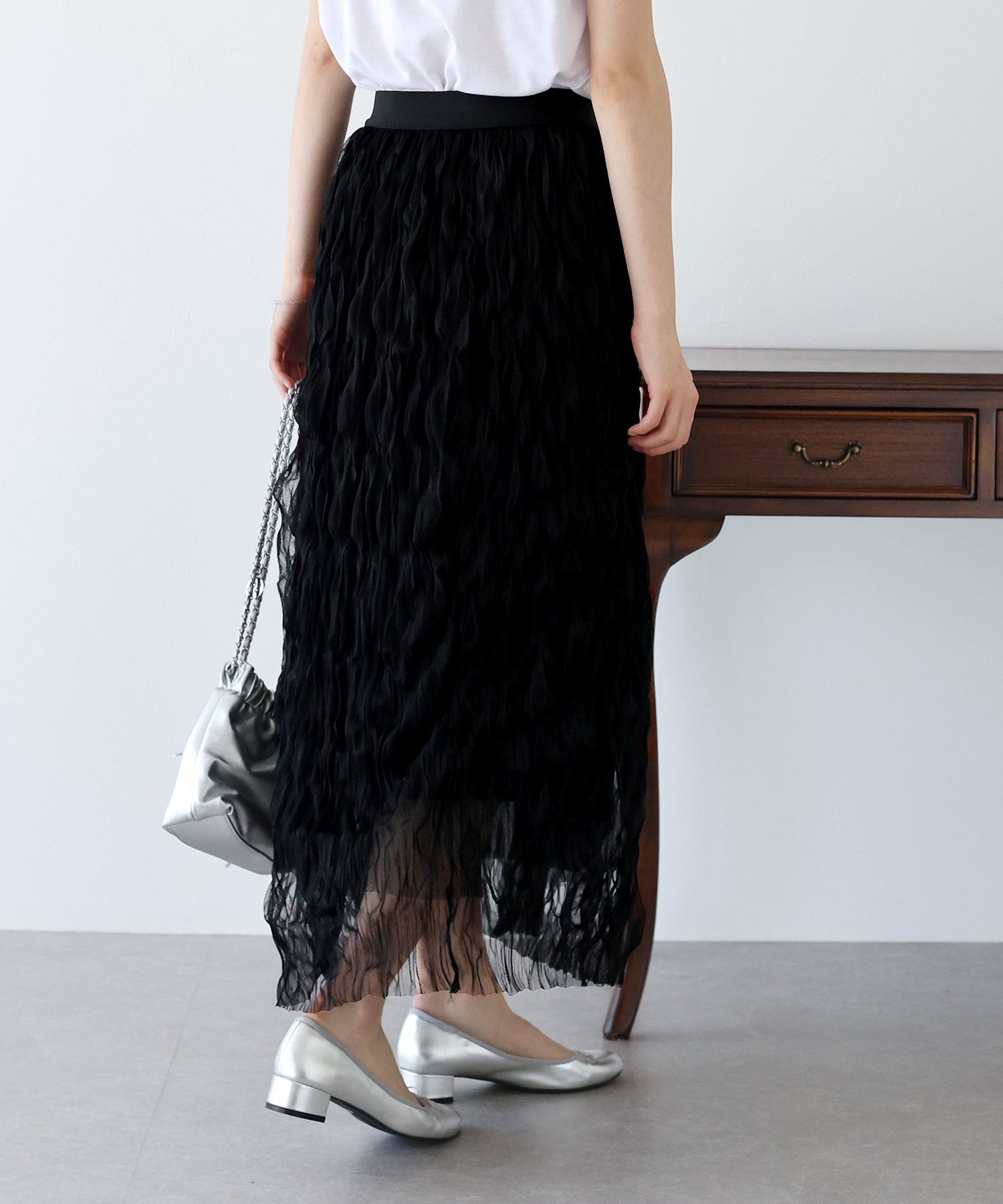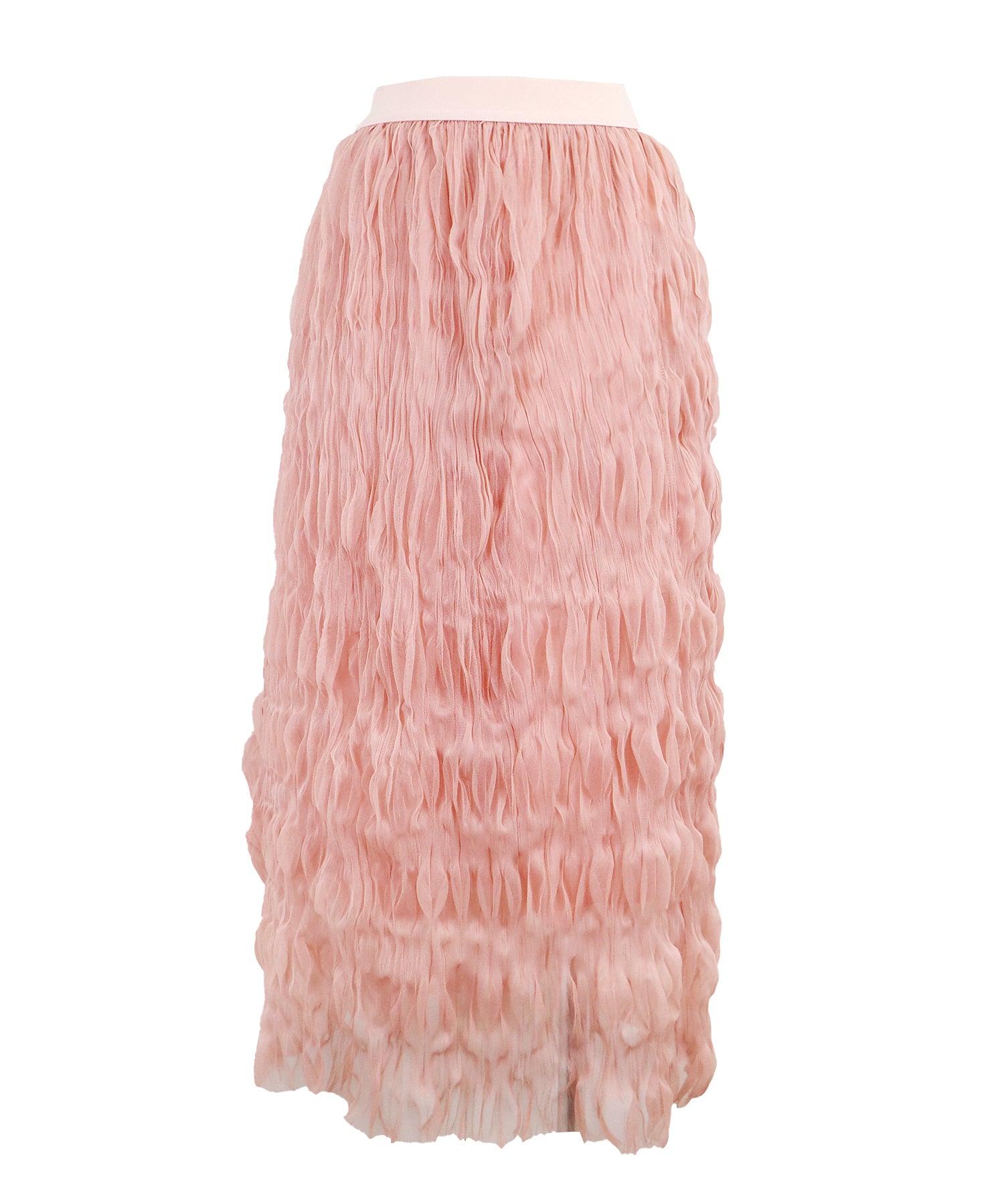 ホイップクリームのようなボリューム感のあるチュールスカート ?POINT ホイップをたっぷり絞ったようなボリュームとシアー感が華やかなチュールスカート。 チュールスカートには珍しいIラインシルエットで、身体のラインを拾いすぎずスッキリと見せてくれます。 ウエスト部分はゴム仕様なのでストレスなく着用いただけます。 シンプルなトップスに合わせるだけで華やかになる主役アイテムです。