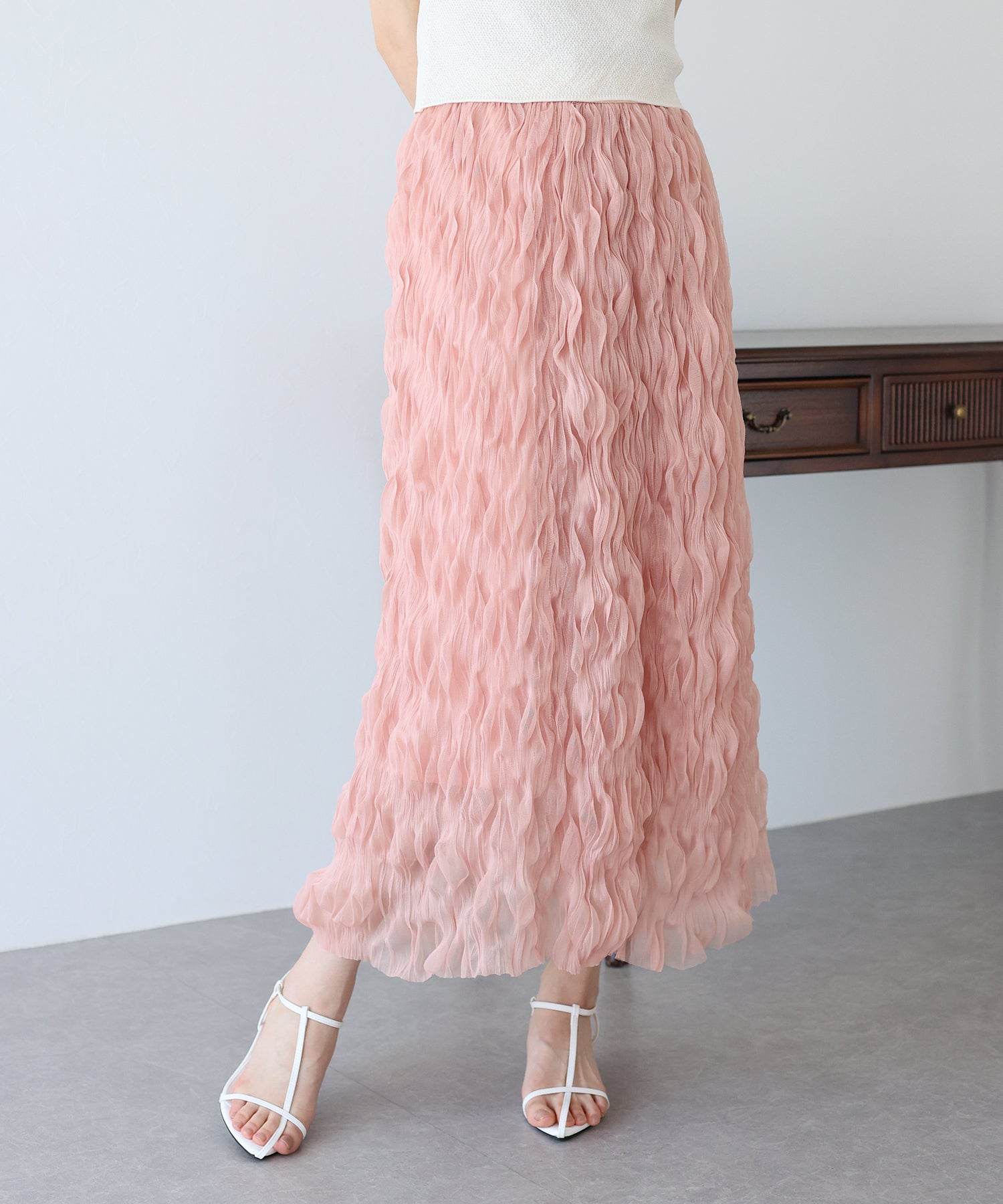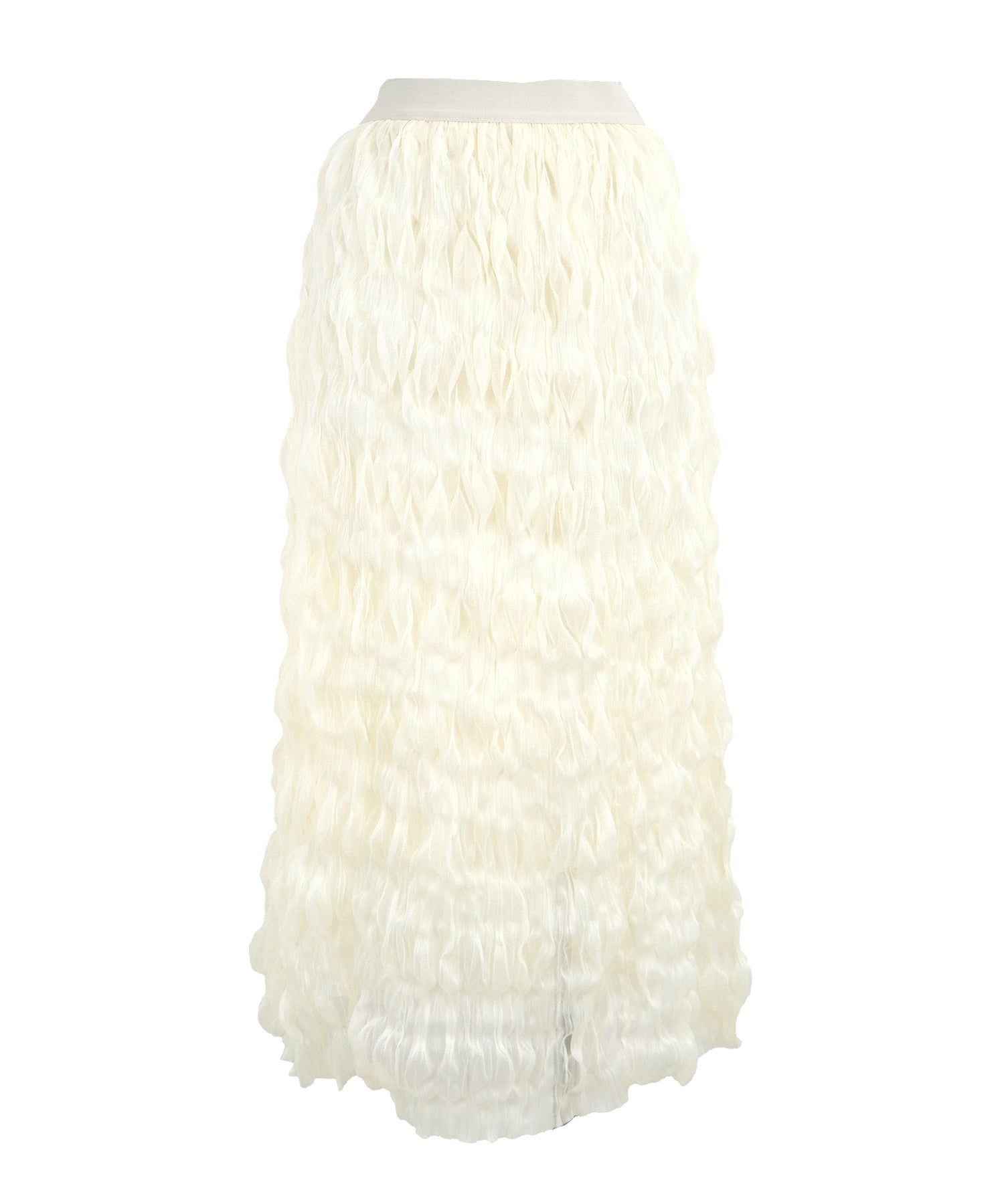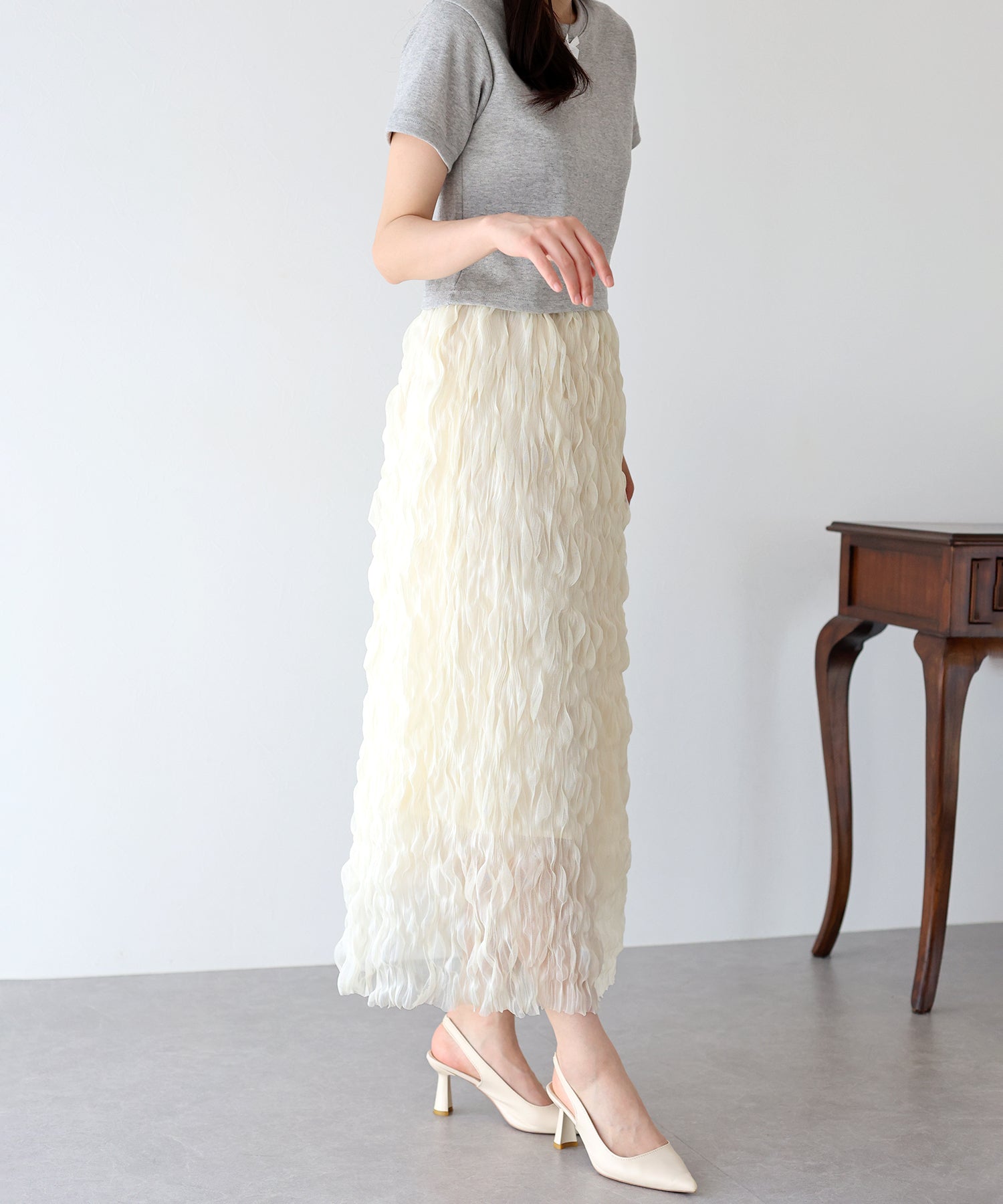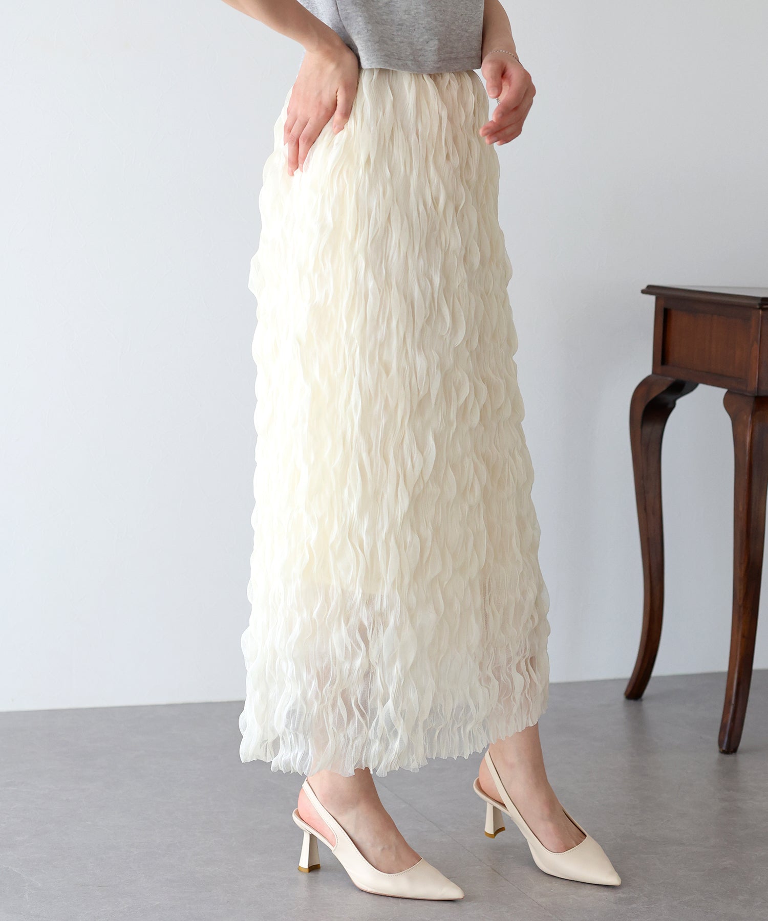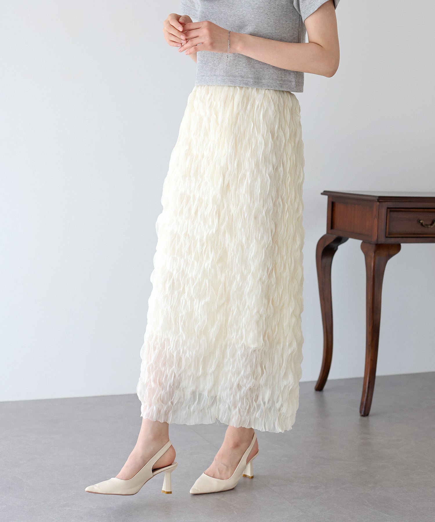 ホイップクリームのようなボリューム感のあるチュールスカート ?POINT ホイップをたっぷり絞ったようなボリュームとシアー感が華やかなチュールスカート。 チュールスカートには珍しいIラインシルエットで、身体のラインを拾いすぎずスッキリと見せてくれます。 ウエスト部分はゴム仕様なのでストレスなく着用いただけます。 シンプルなトップスに合わせるだけで華やかになる主役アイテムです。