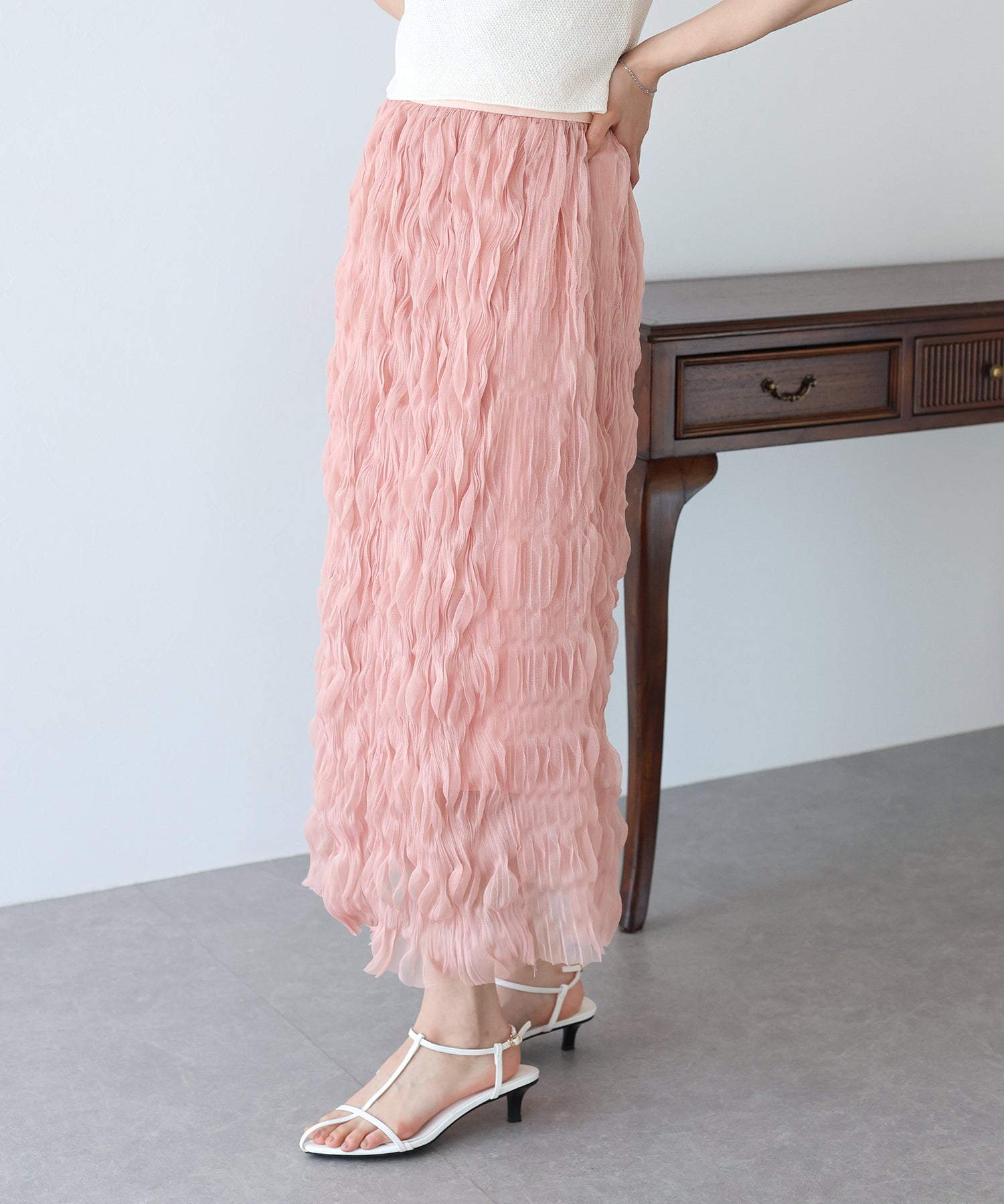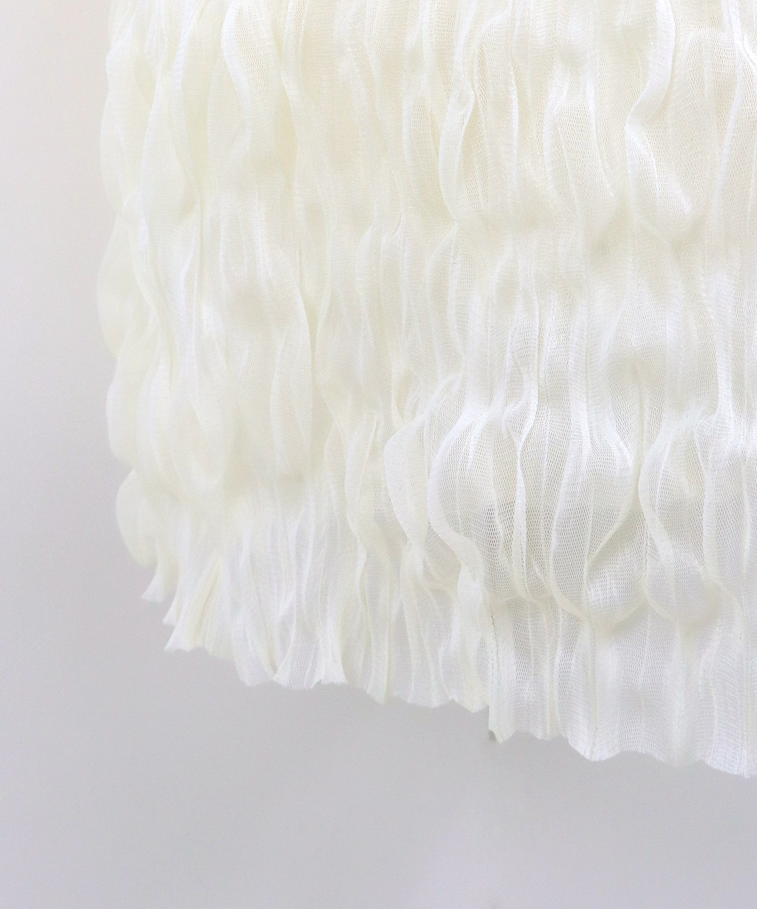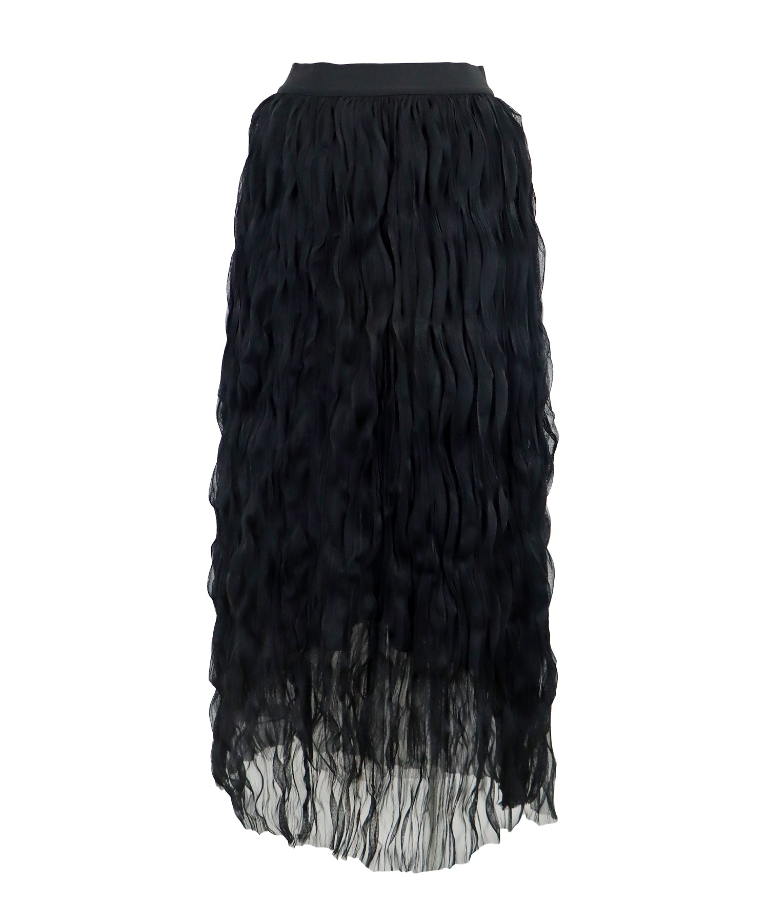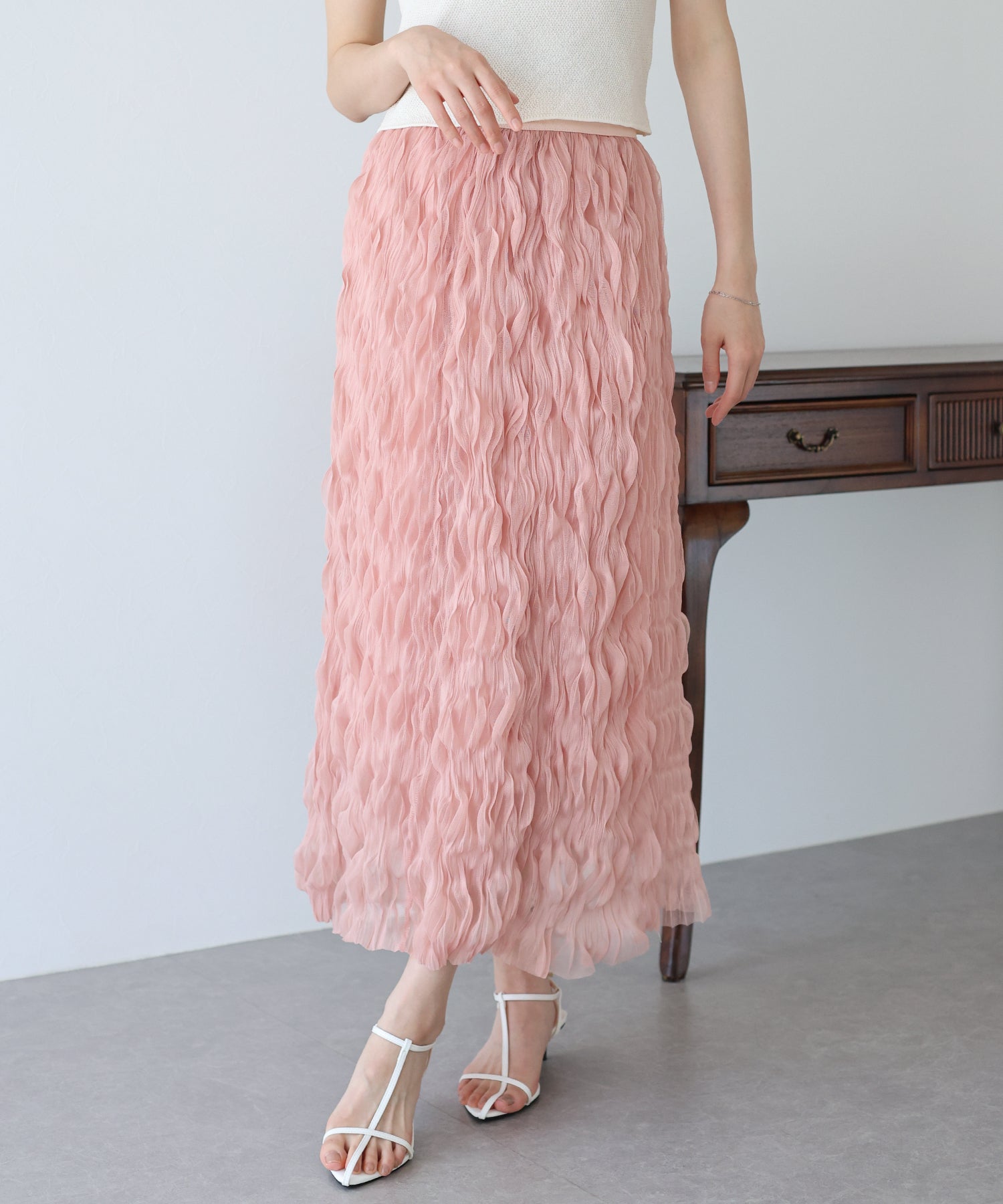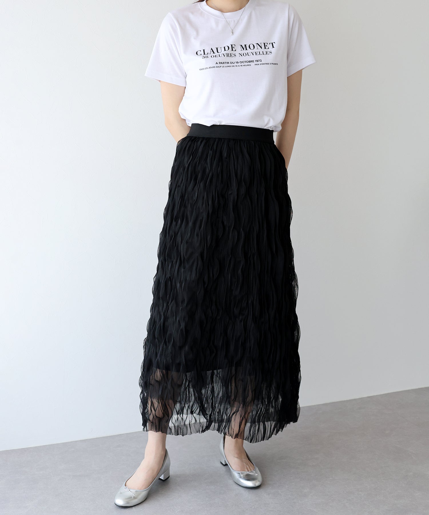 ホイップクリームのようなボリューム感のあるチュールスカート ?POINT ホイップをたっぷり絞ったようなボリュームとシアー感が華やかなチュールスカート。 チュールスカートには珍しいIラインシルエットで、身体のラインを拾いすぎずスッキリと見せてくれます。 ウエスト部分はゴム仕様なのでストレスなく着用いただけます。 シンプルなトップスに合わせるだけで華やかになる主役アイテムです。