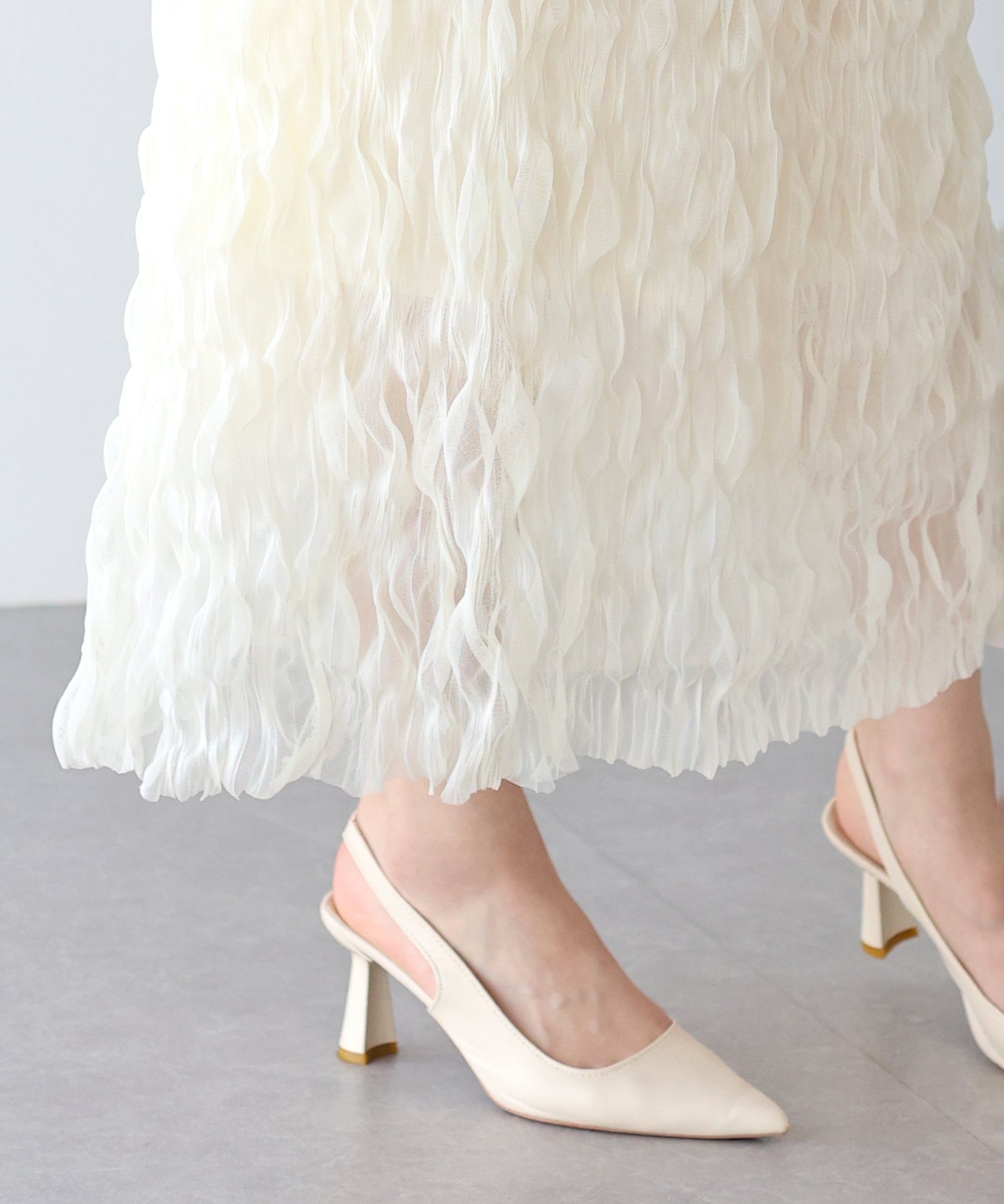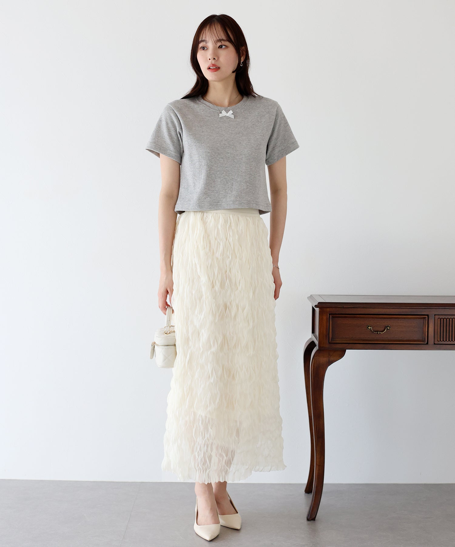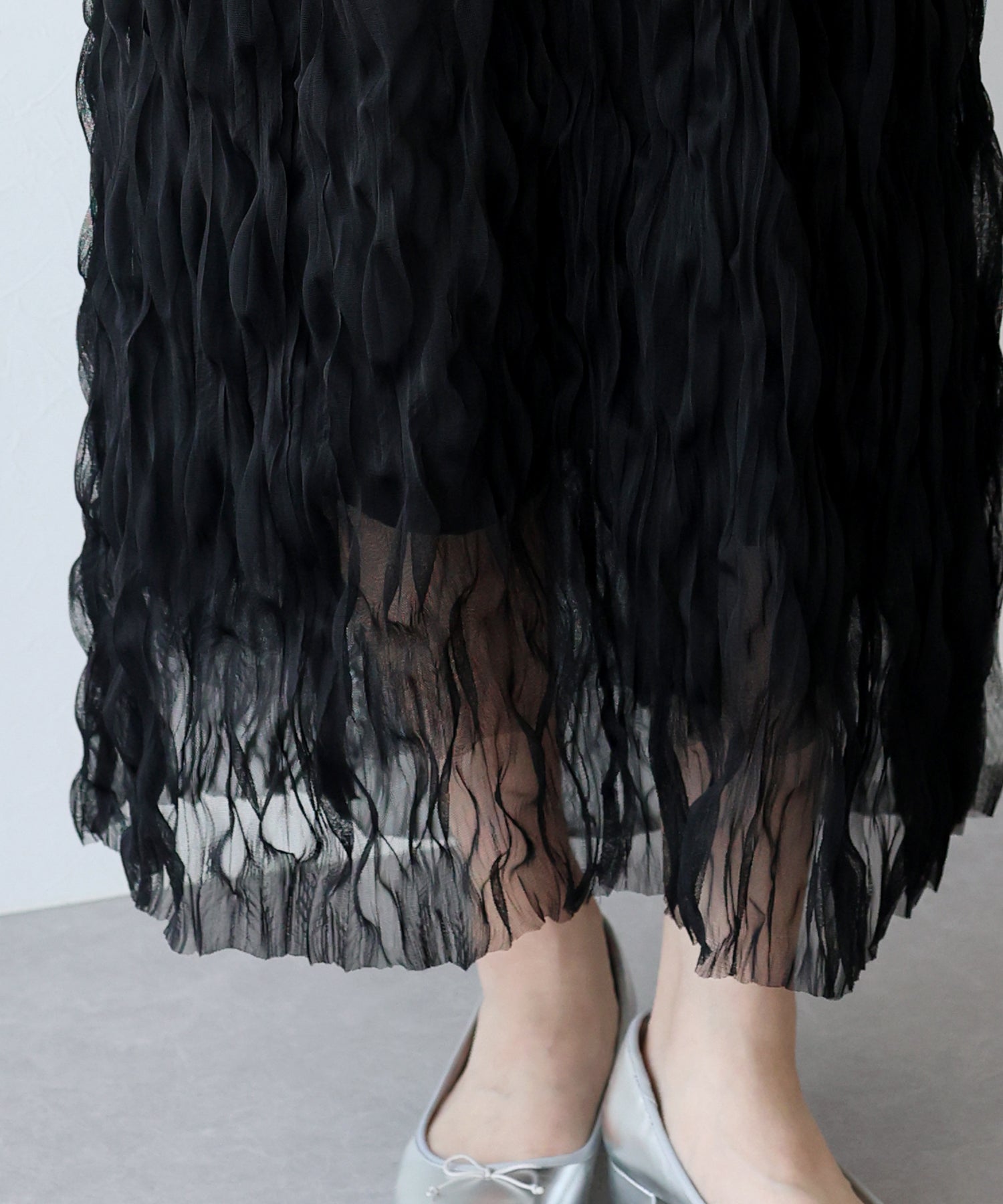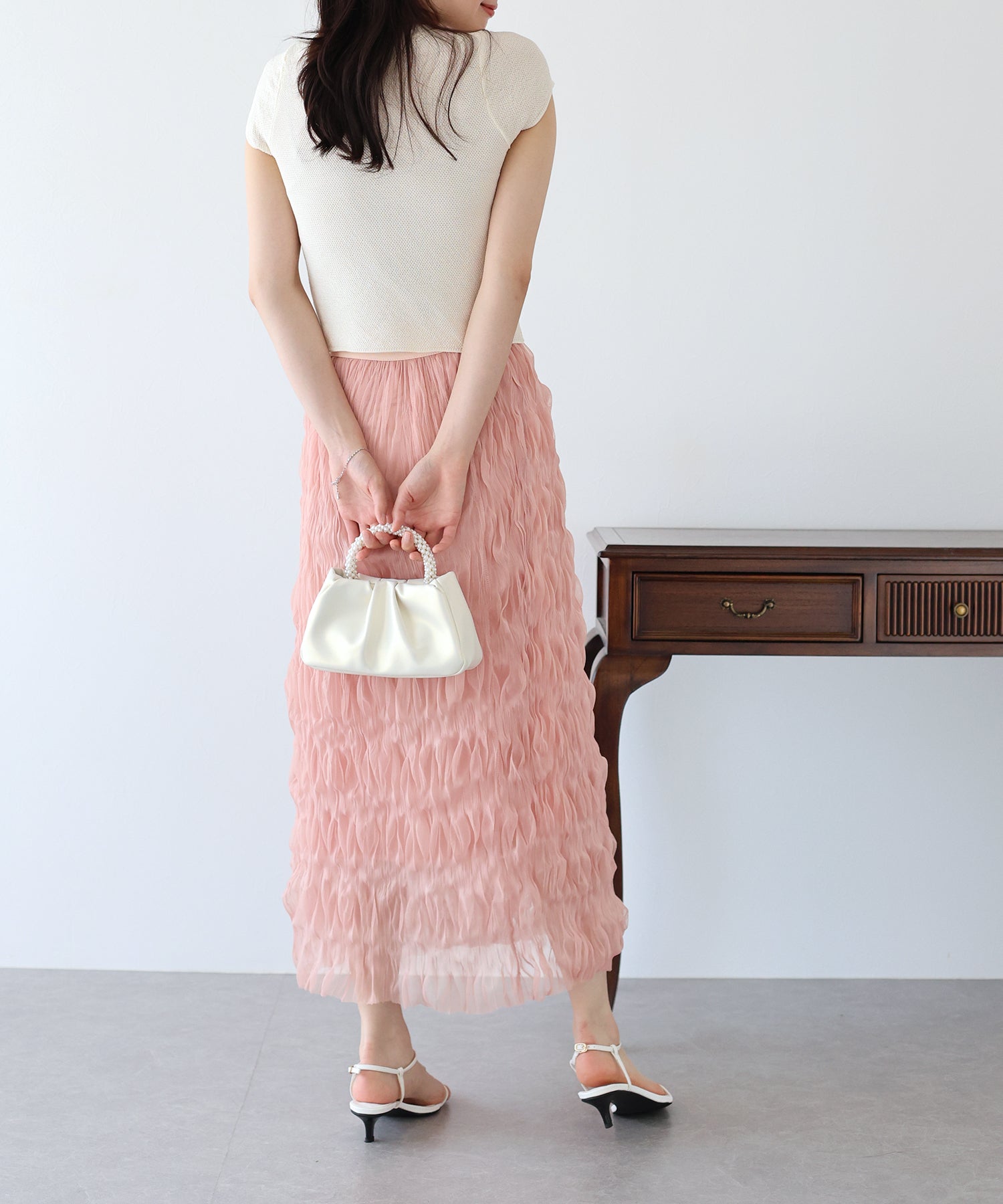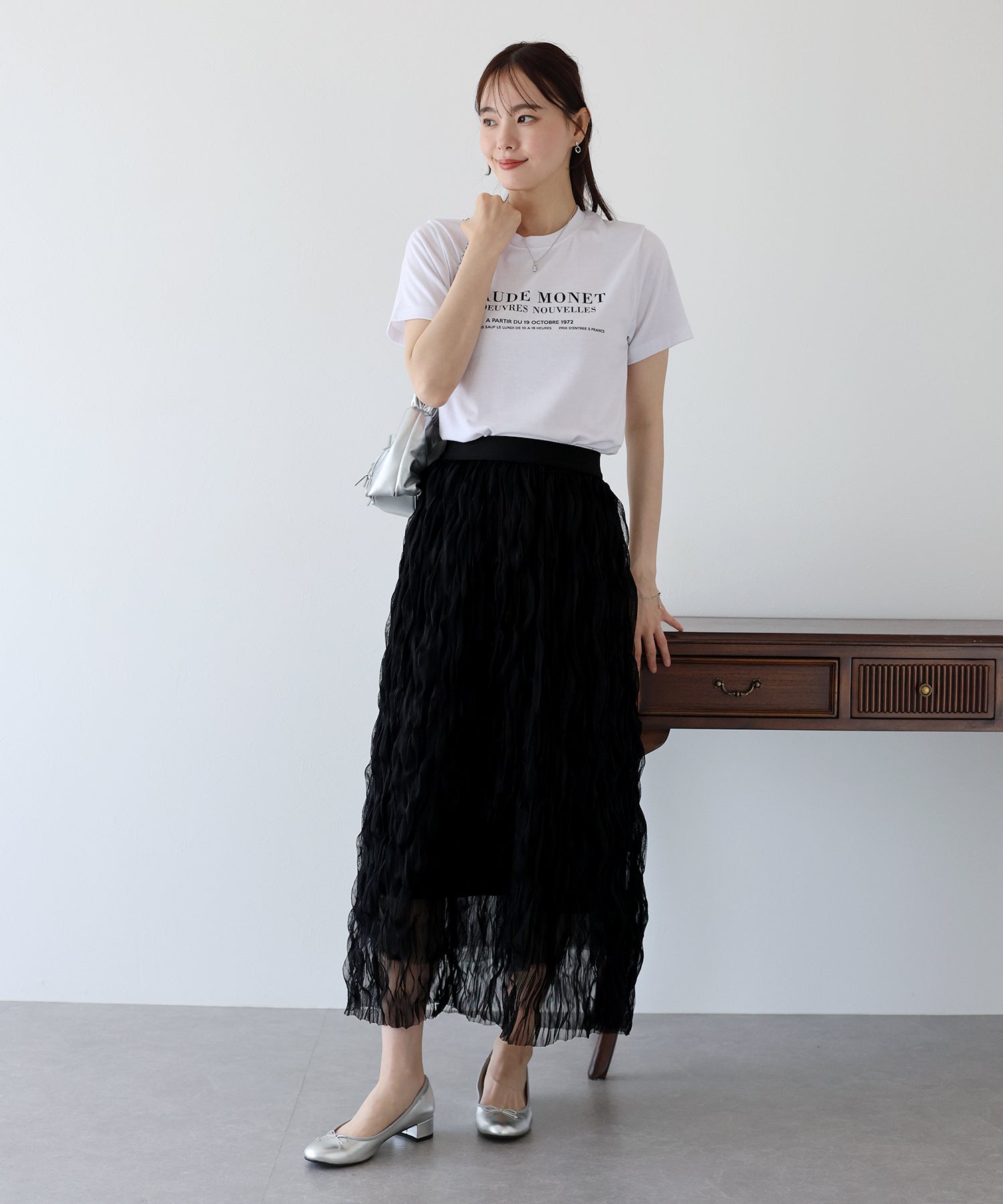 ホイップクリームのようなボリューム感のあるチュールスカート ?POINT ホイップをたっぷり絞ったようなボリュームとシアー感が華やかなチュールスカート。 チュールスカートには珍しいIラインシルエットで、身体のラインを拾いすぎずスッキリと見せてくれます。 ウエスト部分はゴム仕様なのでストレスなく着用いただけます。 シンプルなトップスに合わせるだけで華やかになる主役アイテムです。