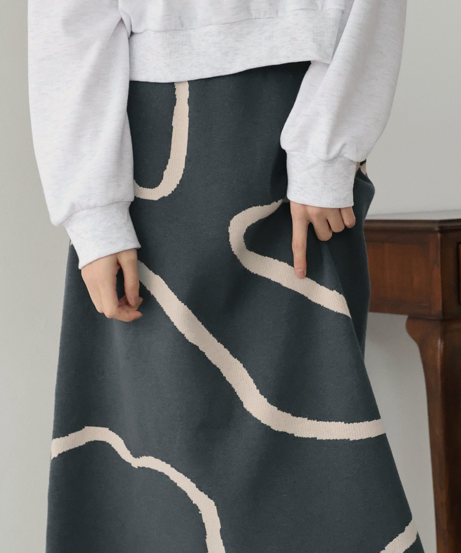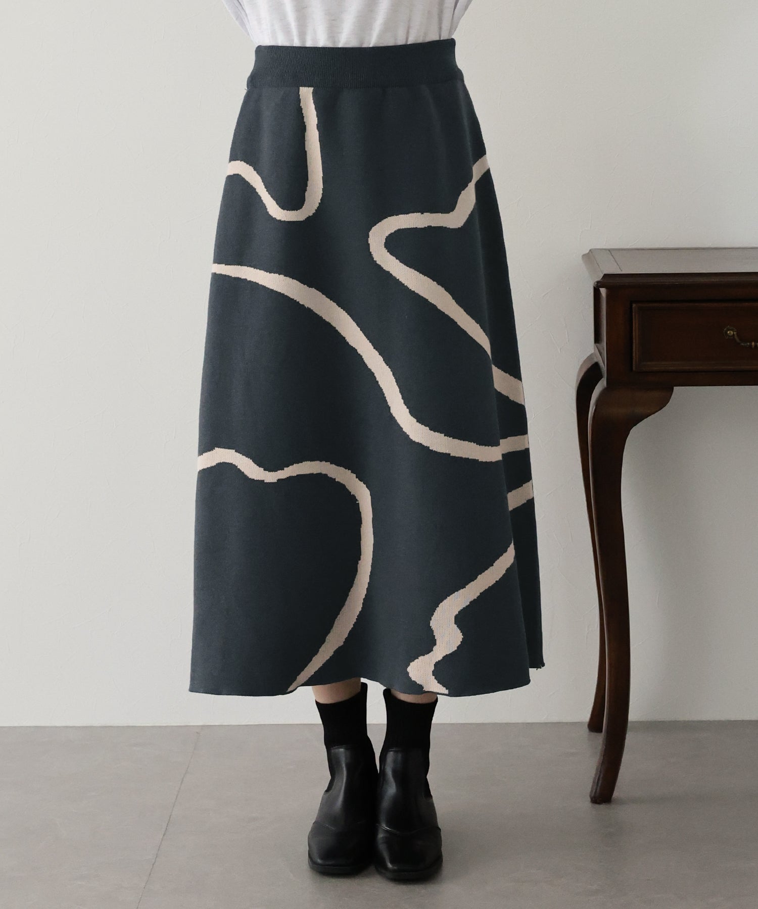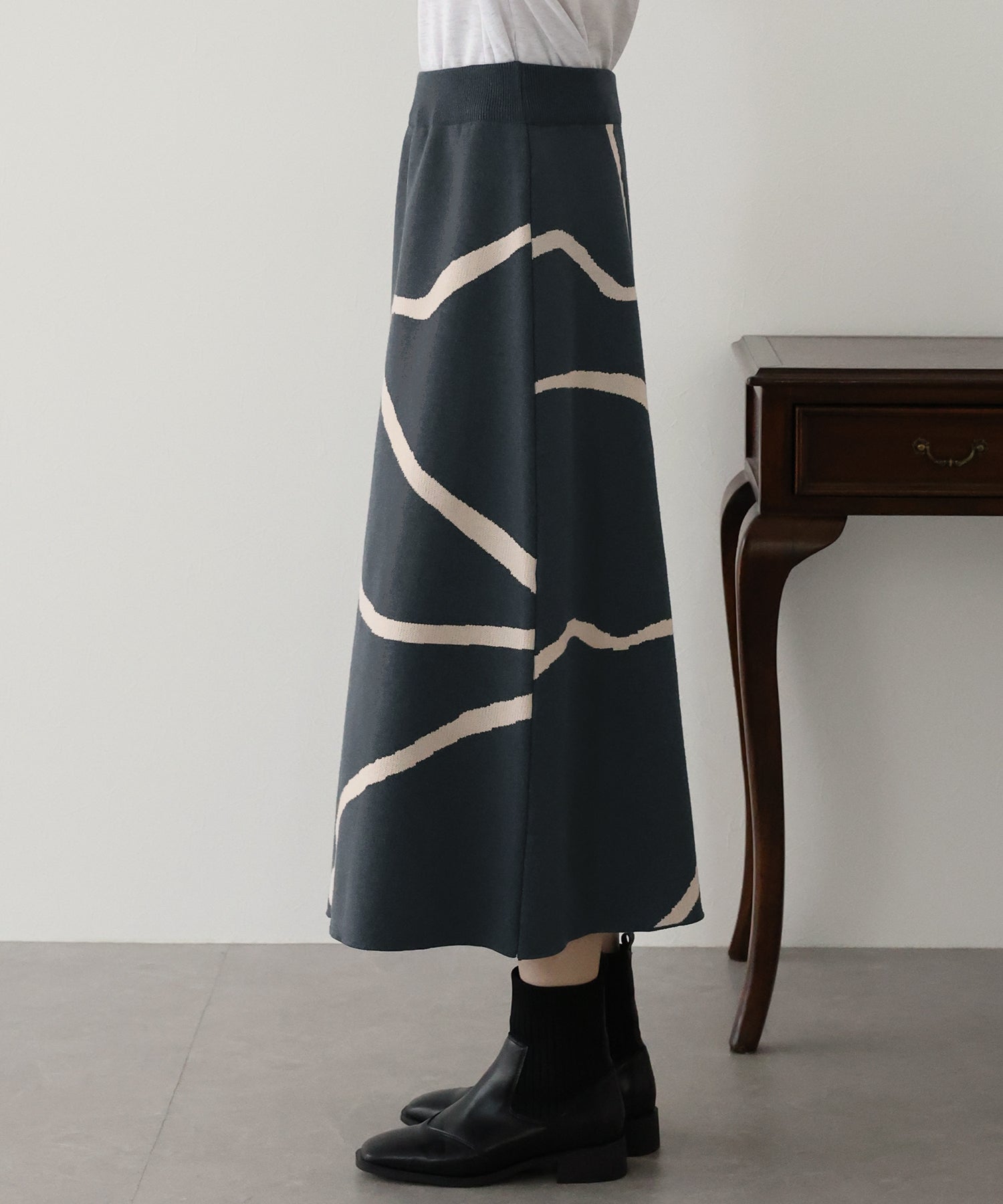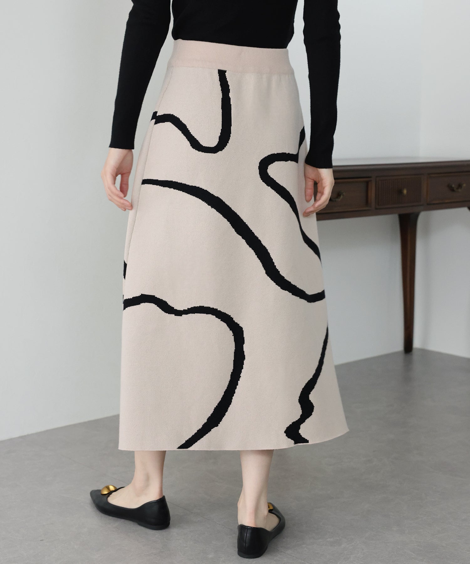 ?POINT ランダムな曲線が目を惹く、ニュアンス感漂うスカート。 大胆に入った配色ラインでインパクトのある見た目ながらも、 ベーシックな配色とすっきりとした台形のフレアーシルエットで大人っぽさをプラス。 優しい肌触りのニット素材&ウエストウエストゴムで履き心地も抜群◎ 厚みのあるしっかりとした生地感で暖かみもあり、秋冬の着こなしに華やかさを与えてくれる主役級スカートです。