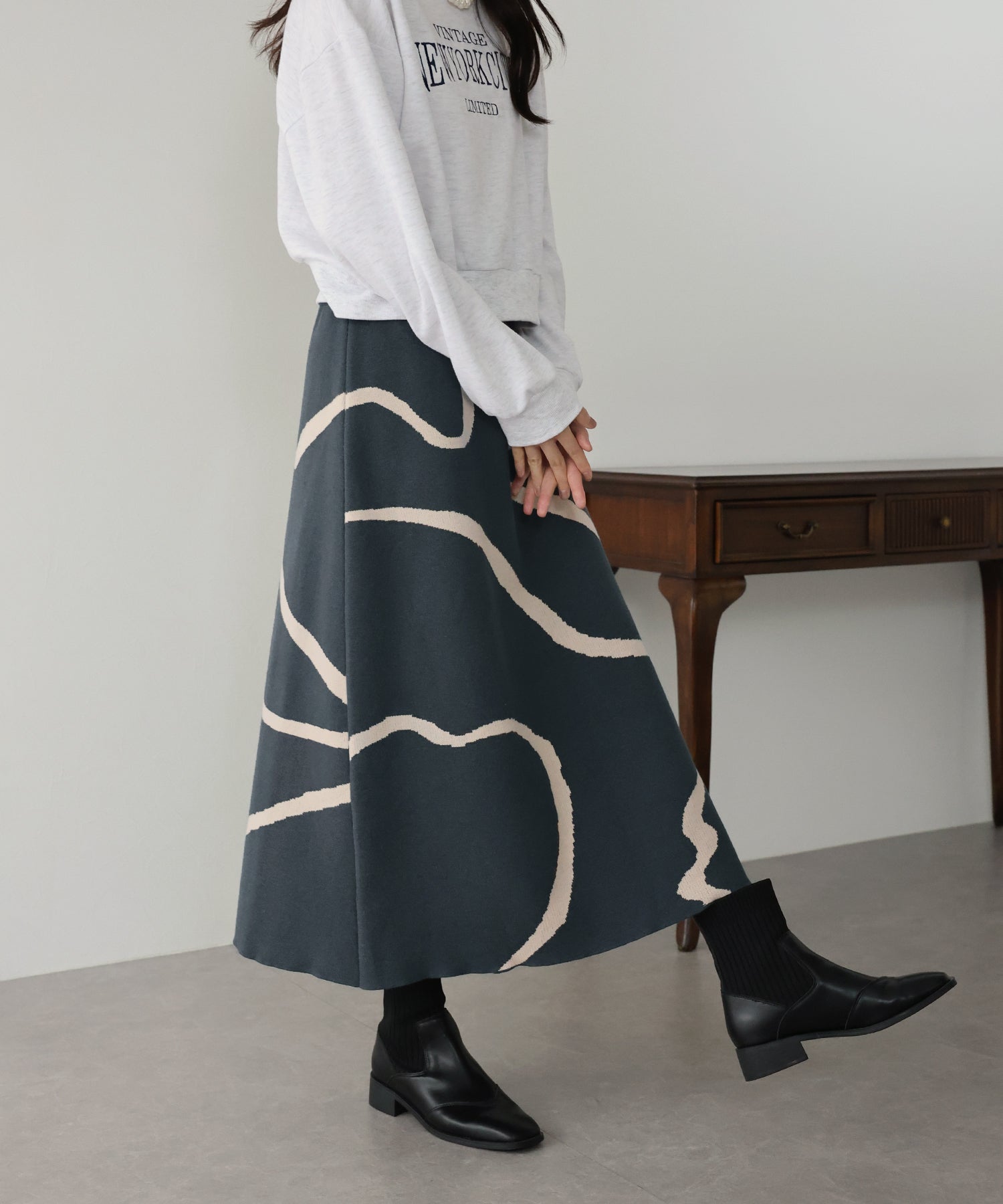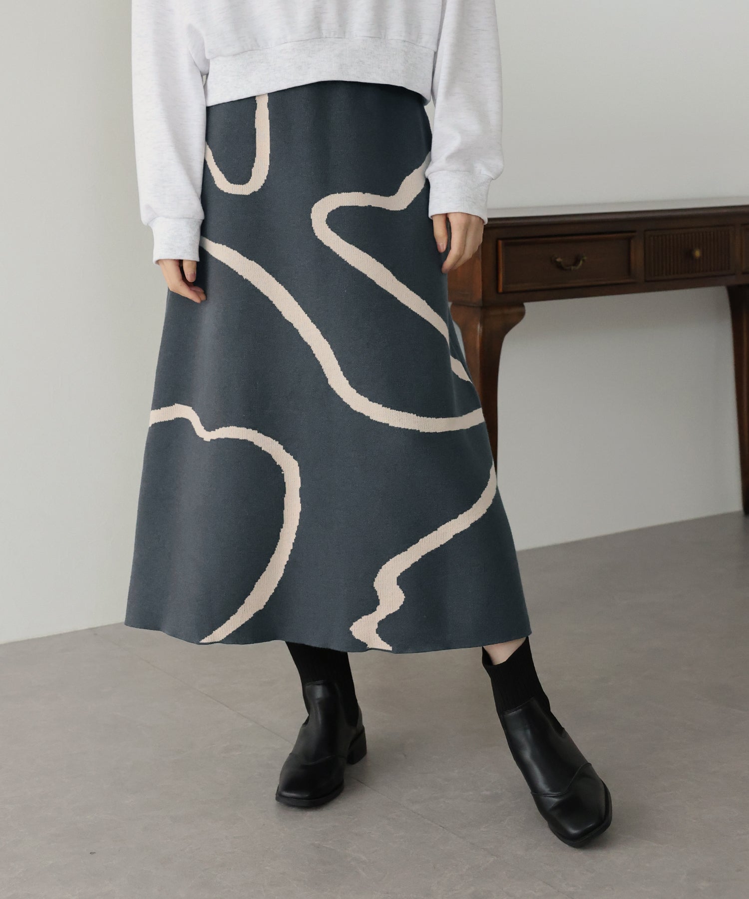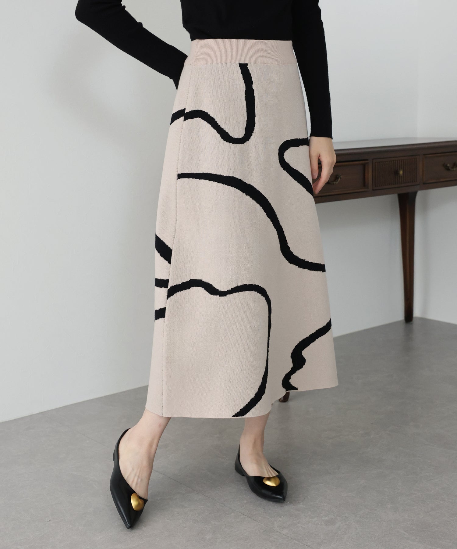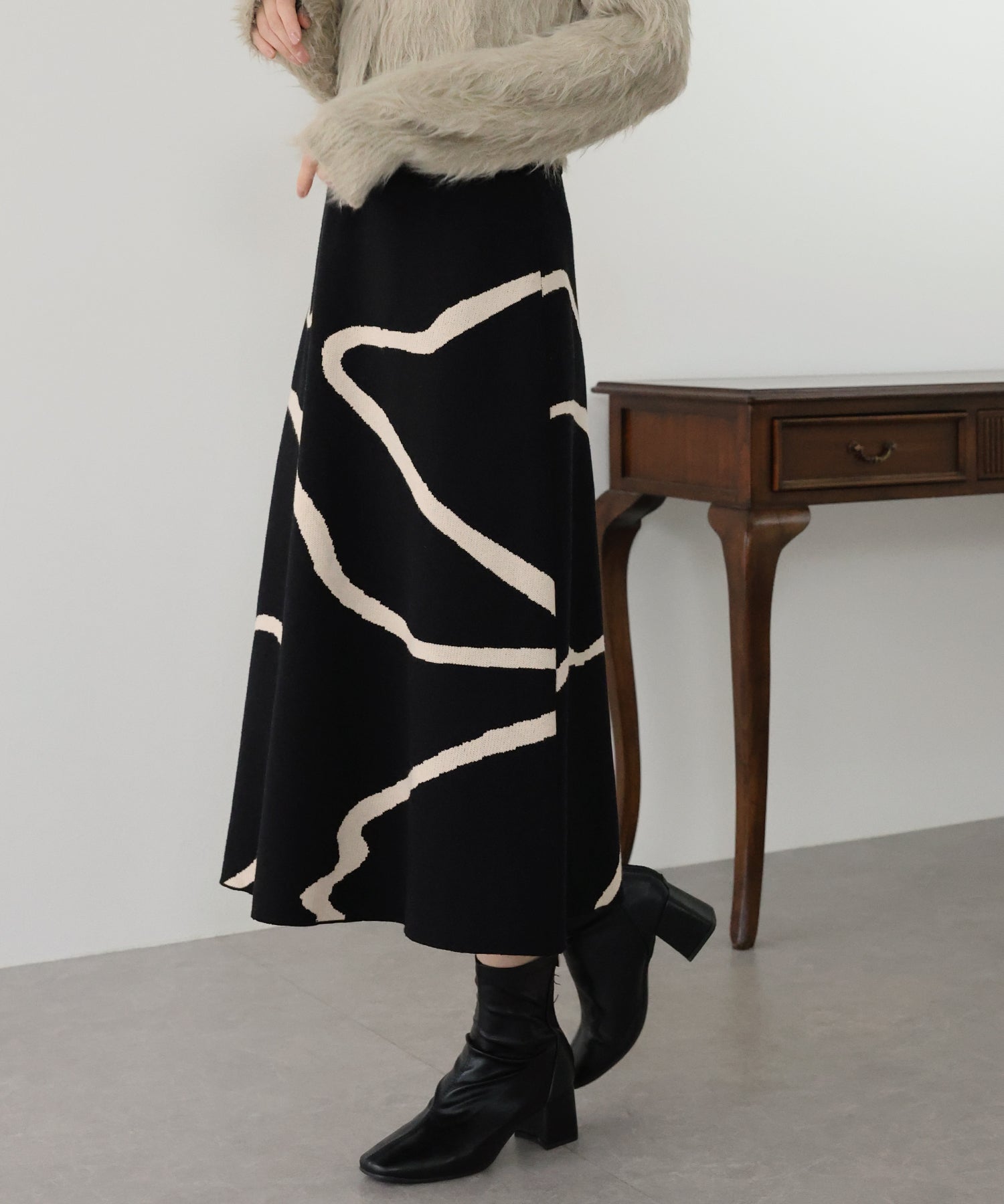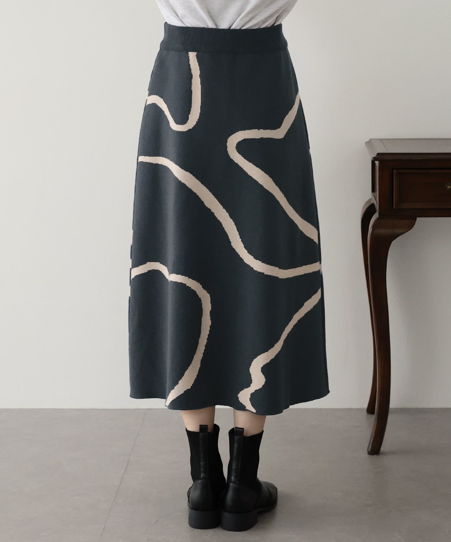 ?POINT ランダムな曲線が目を惹く、ニュアンス感漂うスカート。 大胆に入った配色ラインでインパクトのある見た目ながらも、 ベーシックな配色とすっきりとした台形のフレアーシルエットで大人っぽさをプラス。 優しい肌触りのニット素材&ウエストウエストゴムで履き心地も抜群◎ 厚みのあるしっかりとした生地感で暖かみもあり、秋冬の着こなしに華やかさを与えてくれる主役級スカートです。