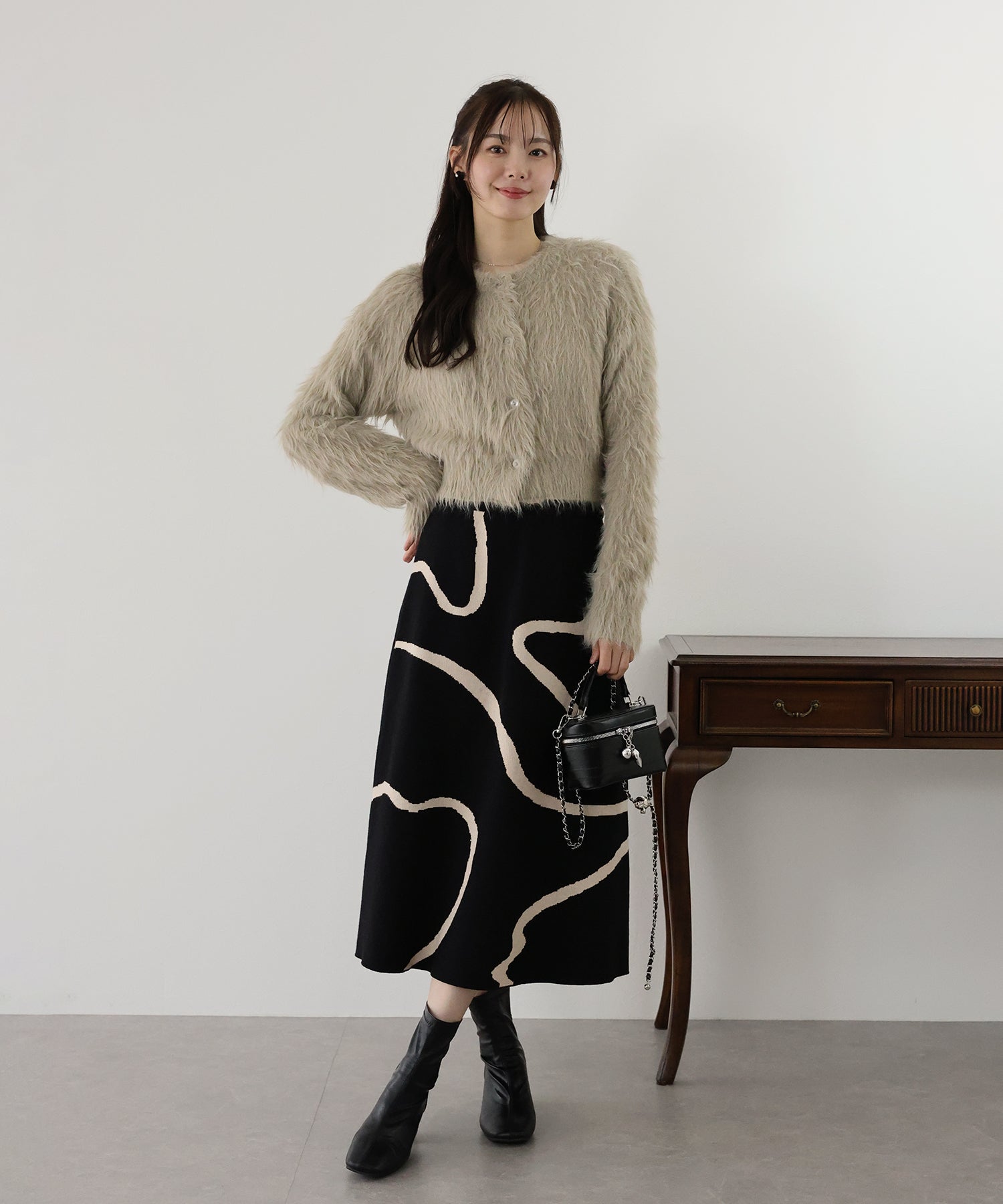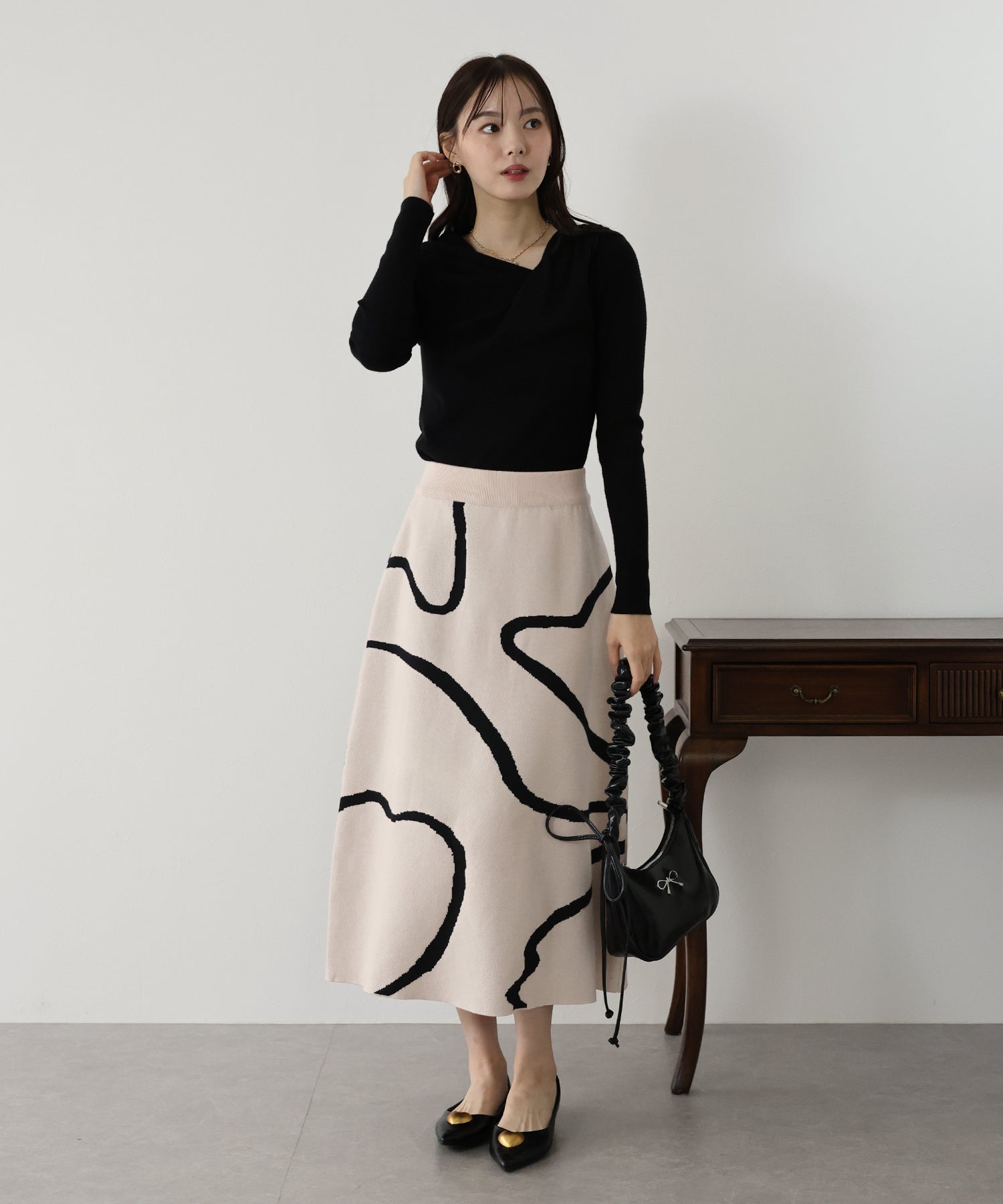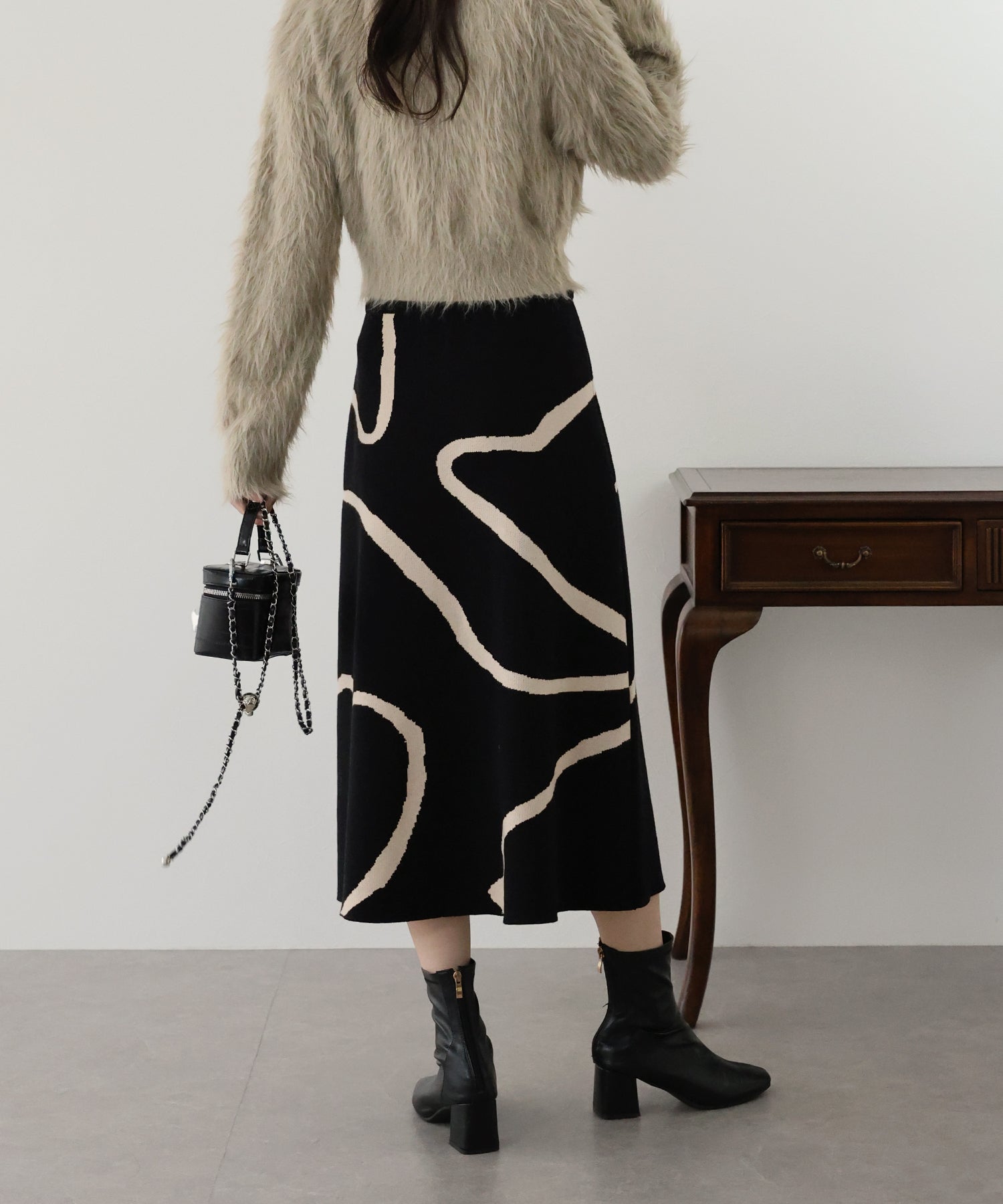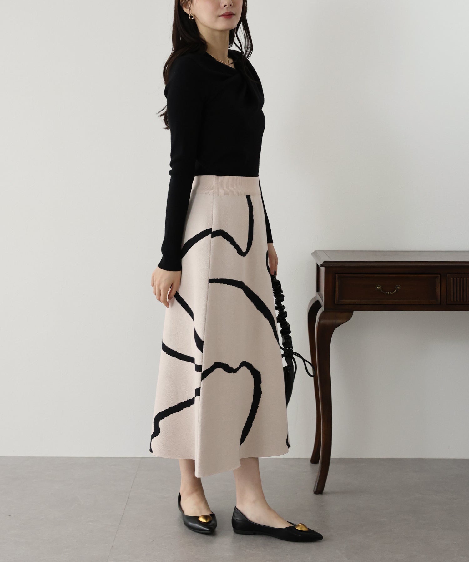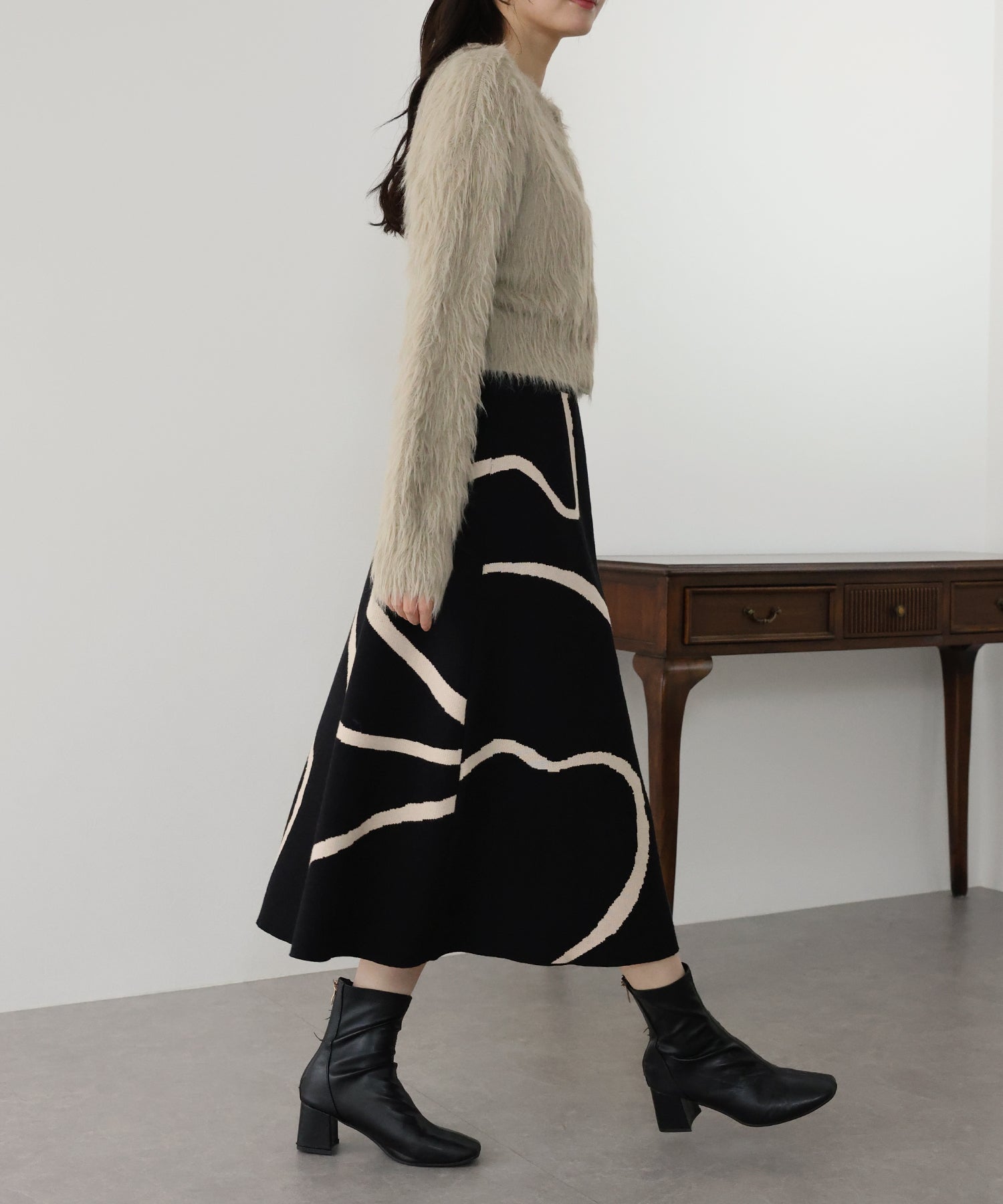 ?POINT ランダムな曲線が目を惹く、ニュアンス感漂うスカート。 大胆に入った配色ラインでインパクトのある見た目ながらも、 ベーシックな配色とすっきりとした台形のフレアーシルエットで大人っぽさをプラス。 優しい肌触りのニット素材&ウエストウエストゴムで履き心地も抜群◎ 厚みのあるしっかりとした生地感で暖かみもあり、秋冬の着こなしに華やかさを与えてくれる主役級スカートです。