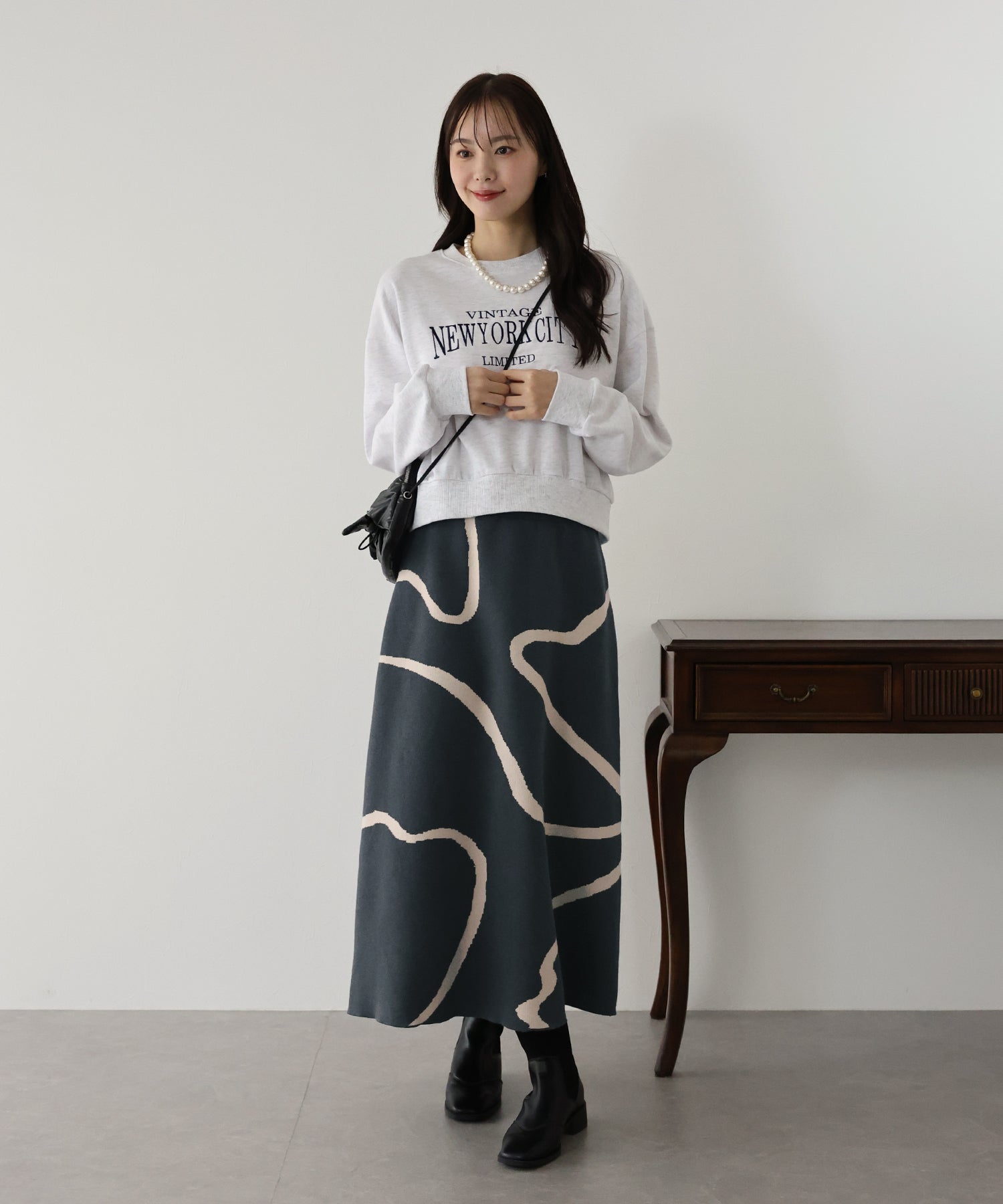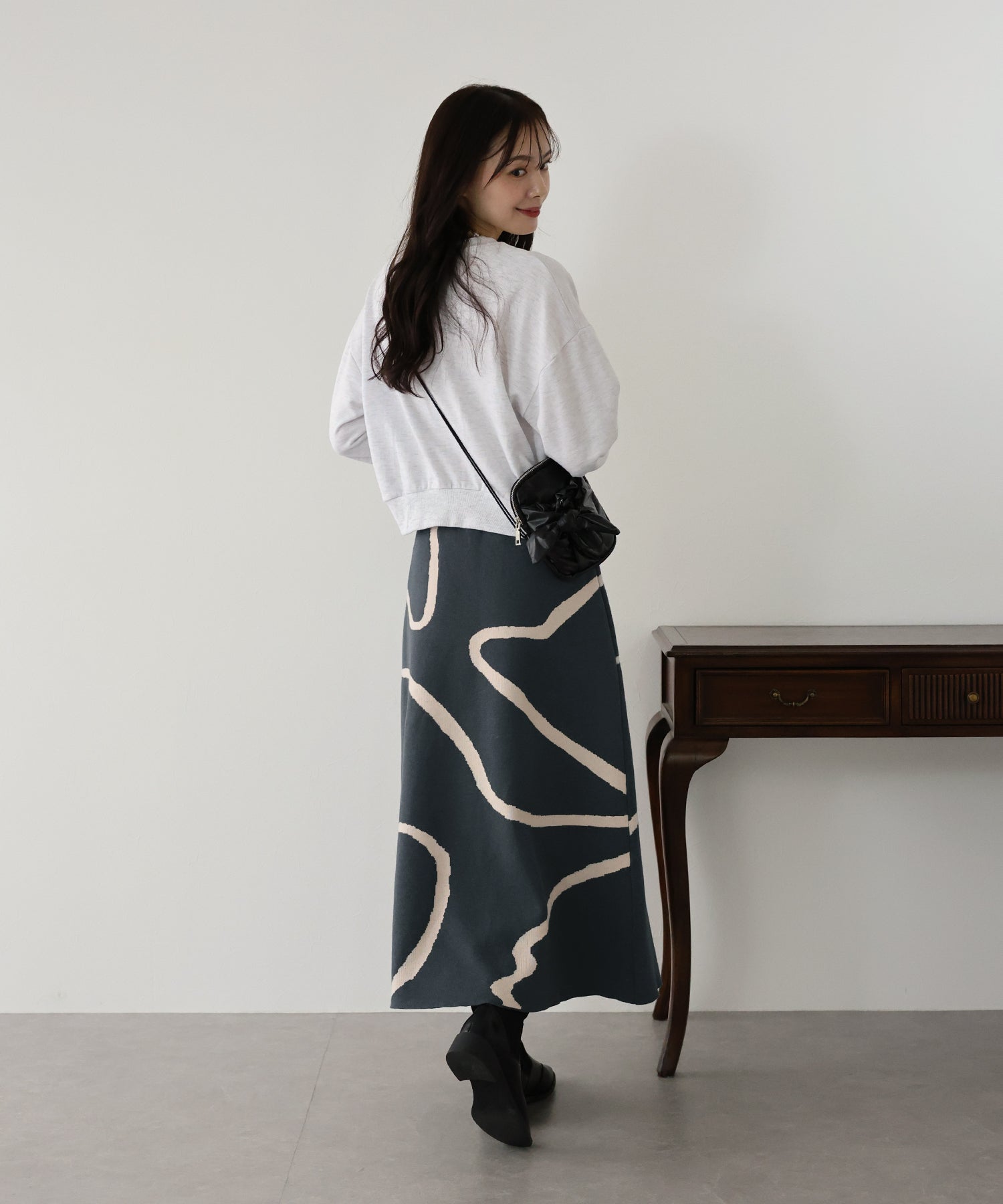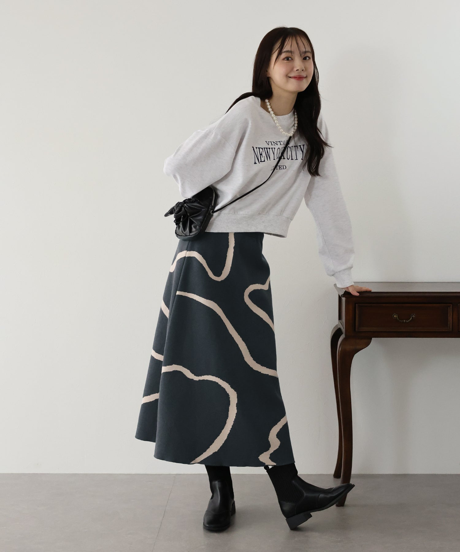 ?STYLING 着るだけでコーデが華やかになるので、シンプルなトップスと合わせてスカートのデザインを引き立てると◎ シャギーニットやブラウスを合わせたキレイめコーデやパーカー、スウェットと合わせて カジュアルダウンさせたコーデもおすすめ!