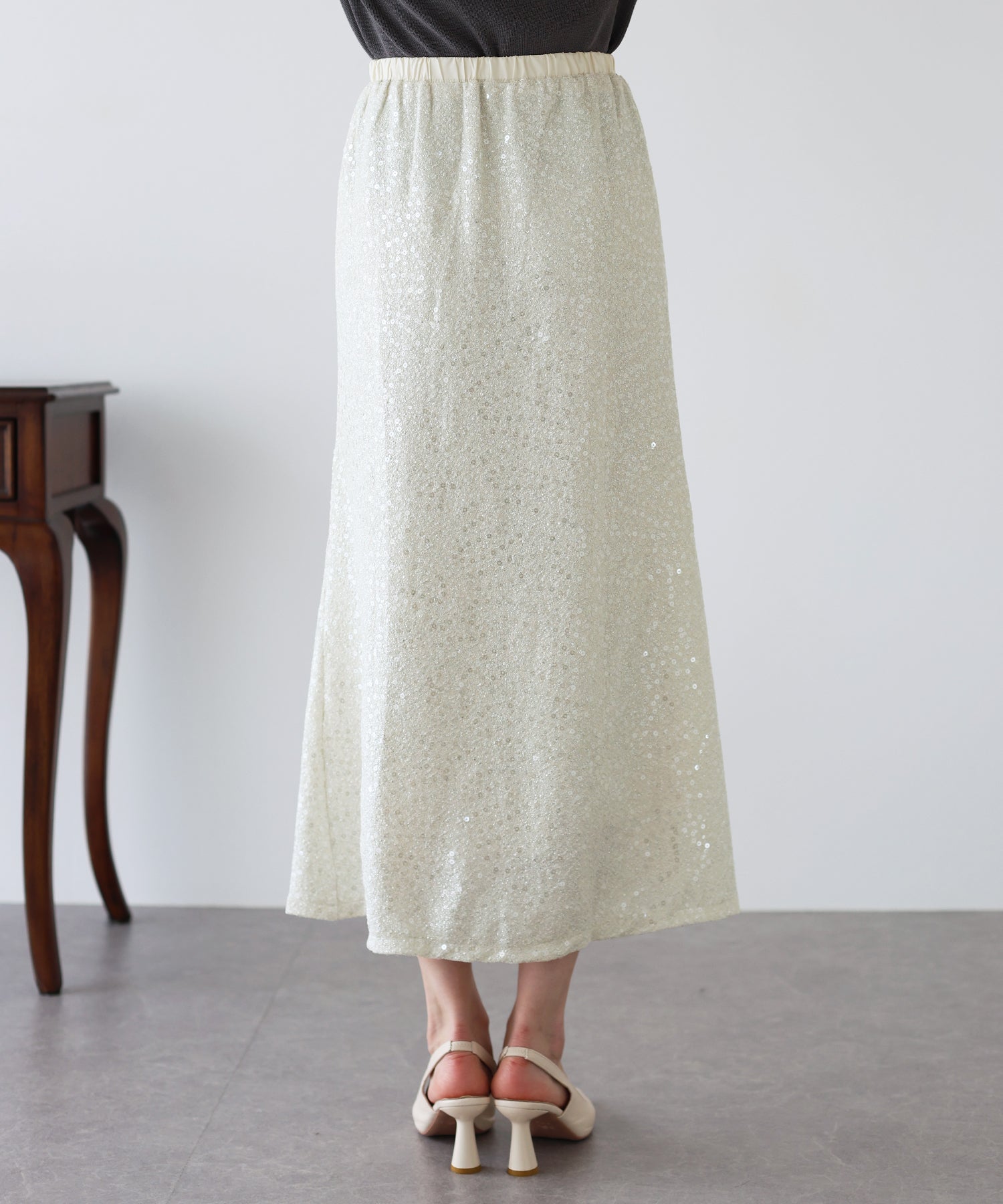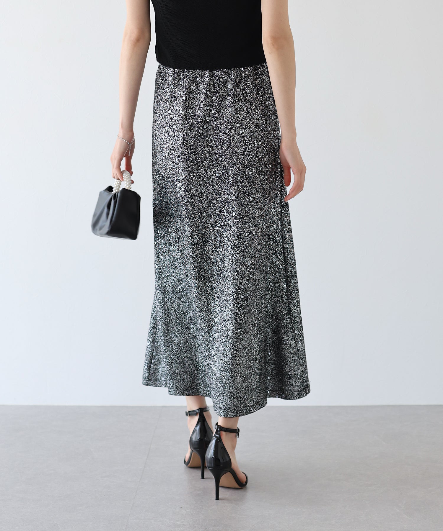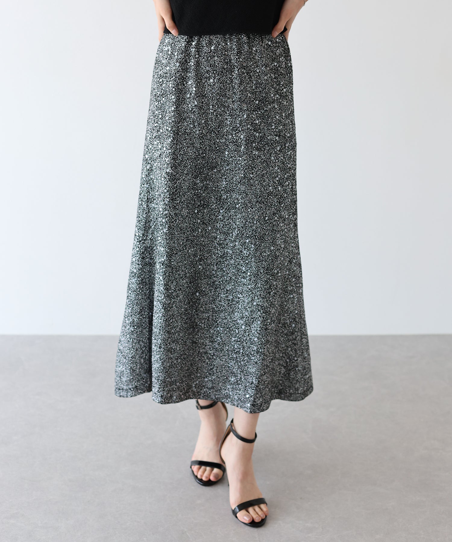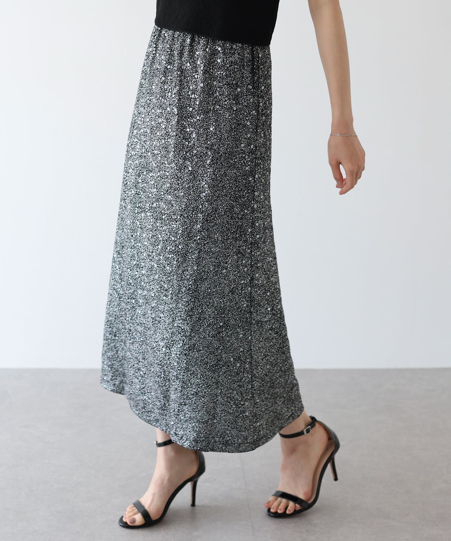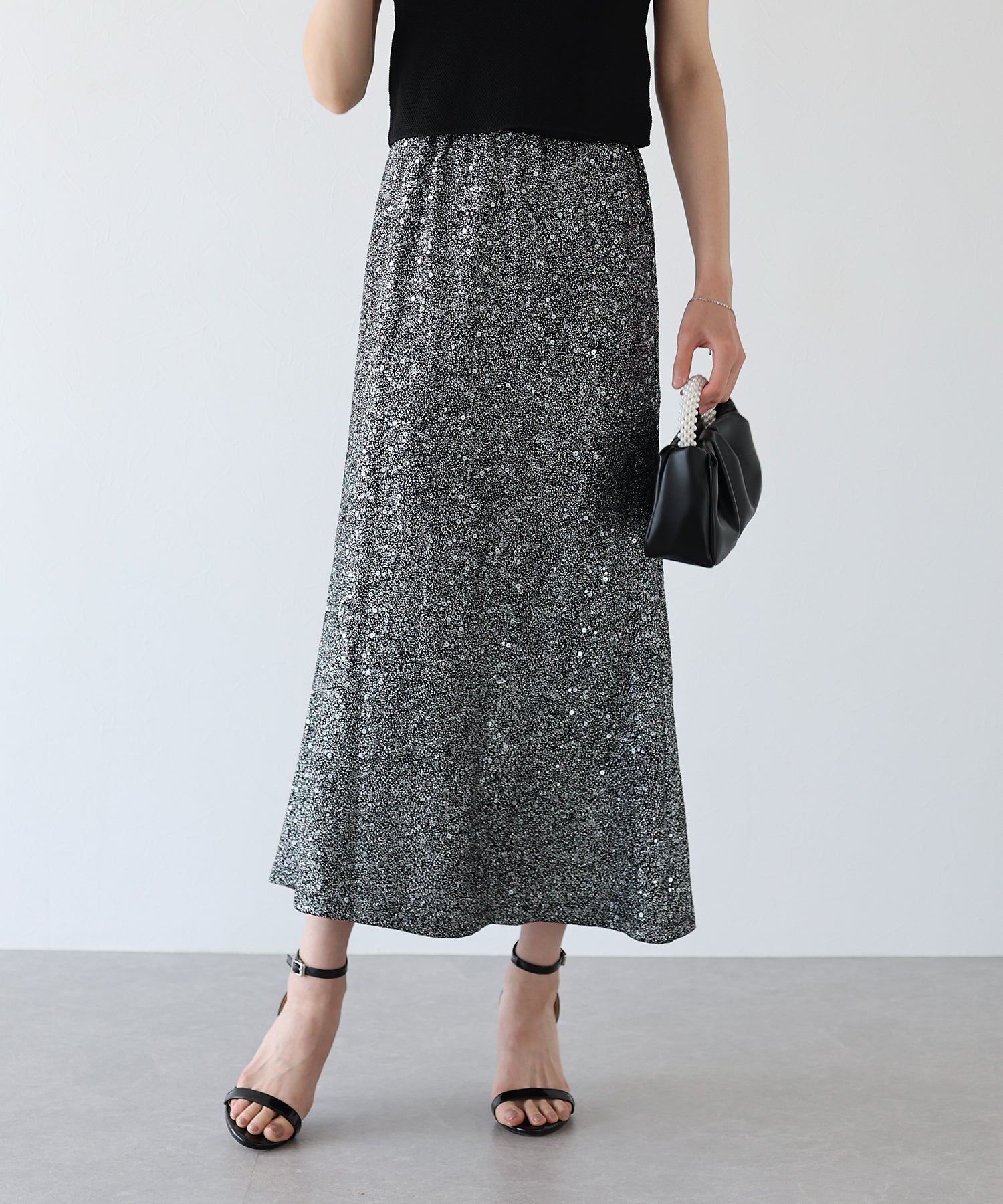 キラキラと光る素材感がオシャレなスパンコールラメスカート ?POINT 動くたびにキラキラと輝くスパンコールやラメが目を惹く、トレンドライクな1枚。 脚長効果が期待できるロングな丈感にスパンコールとラメをたっぷりと付けました。 キラキラと動くたびに輝き、コーデを華やかに仕上げます。 タイトすぎないマーメイドシルエットとウエストゴムで身体のラインを拾いすぎず、ラクに着用いただけます。
