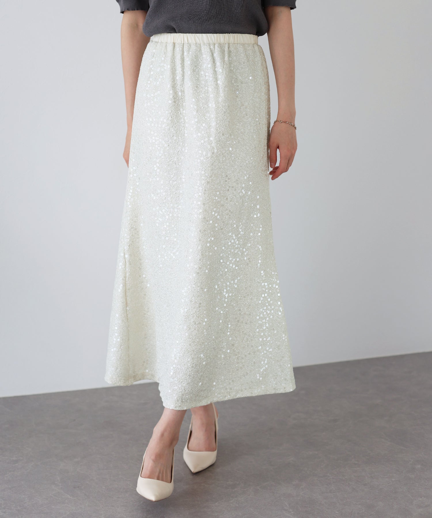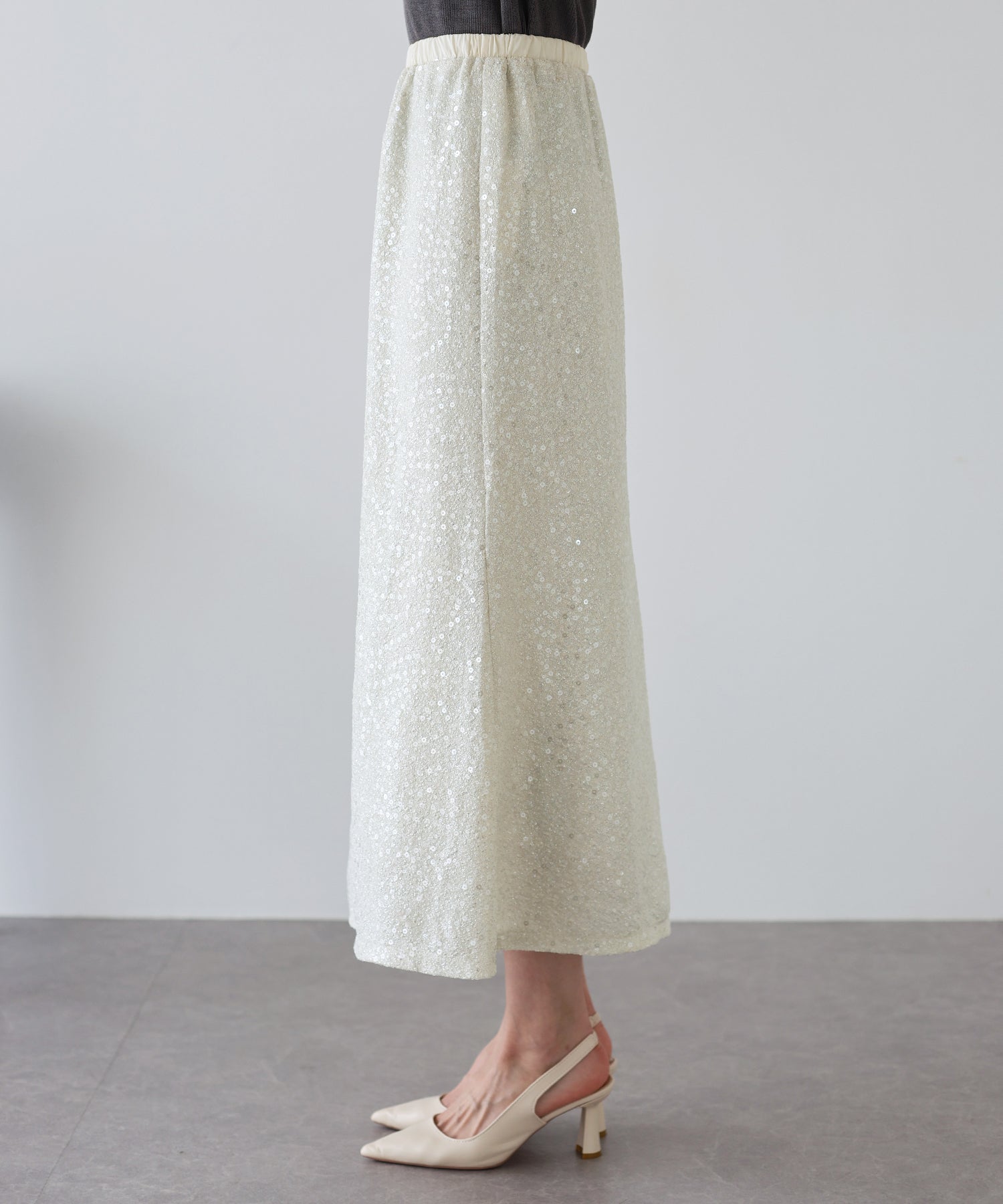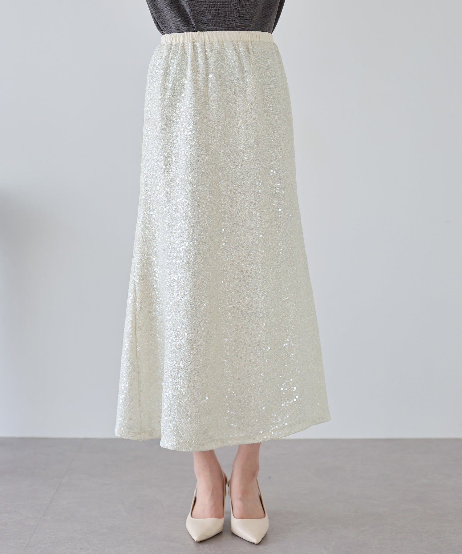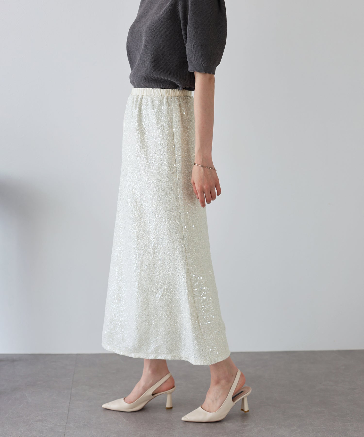 キラキラと光る素材感がオシャレなスパンコールラメスカート ?POINT 動くたびにキラキラと輝くスパンコールやラメが目を惹く、トレンドライクな1枚。 脚長効果が期待できるロングな丈感にスパンコールとラメをたっぷりと付けました。 キラキラと動くたびに輝き、コーデを華やかに仕上げます。 タイトすぎないマーメイドシルエットとウエストゴムで身体のラインを拾いすぎず、ラクに着用いただけます。