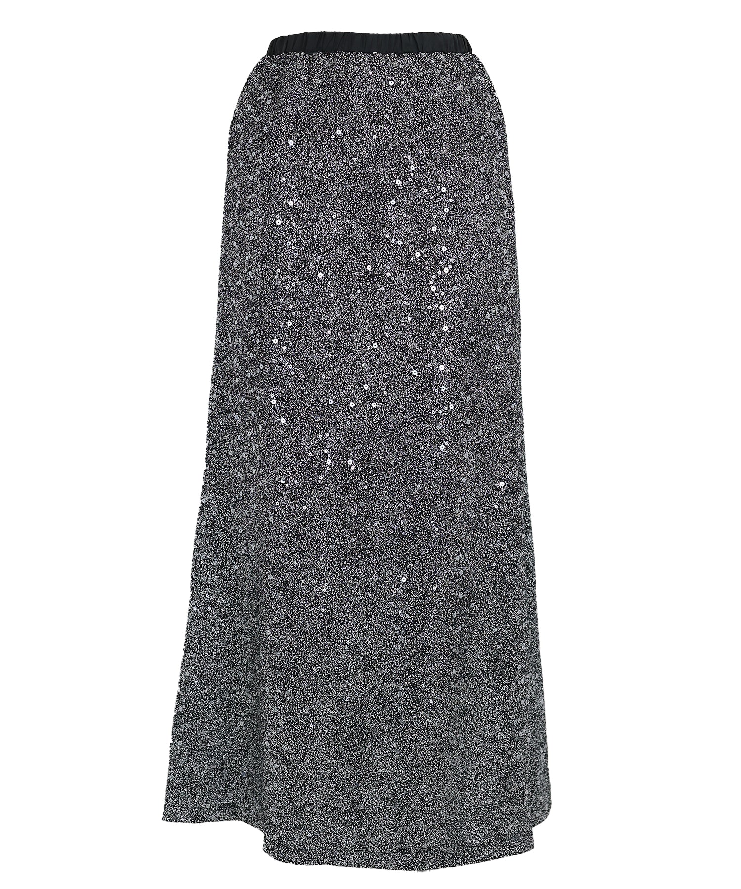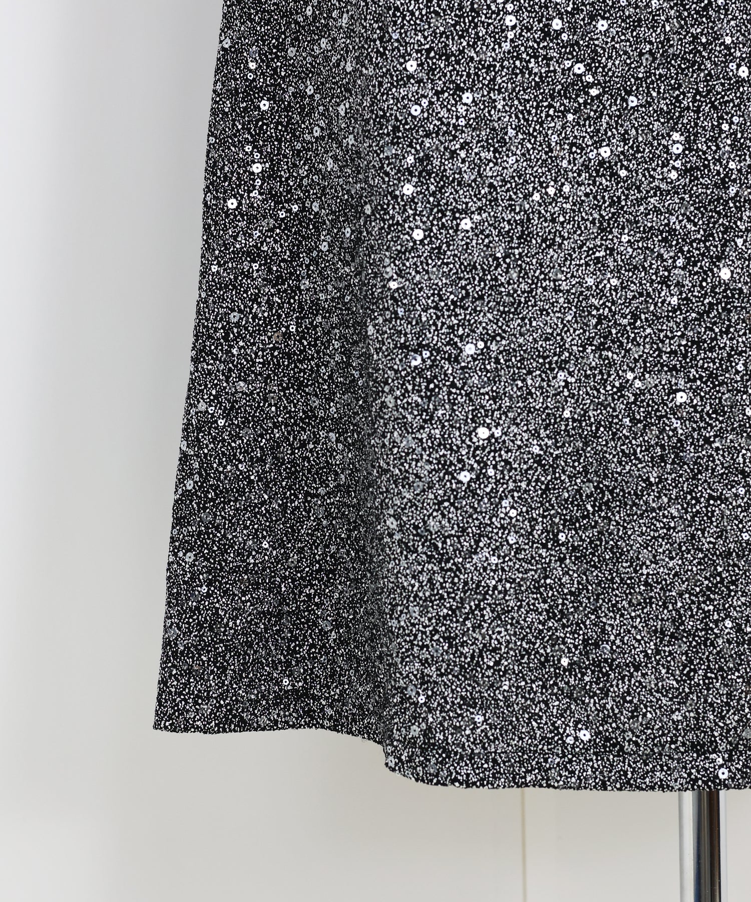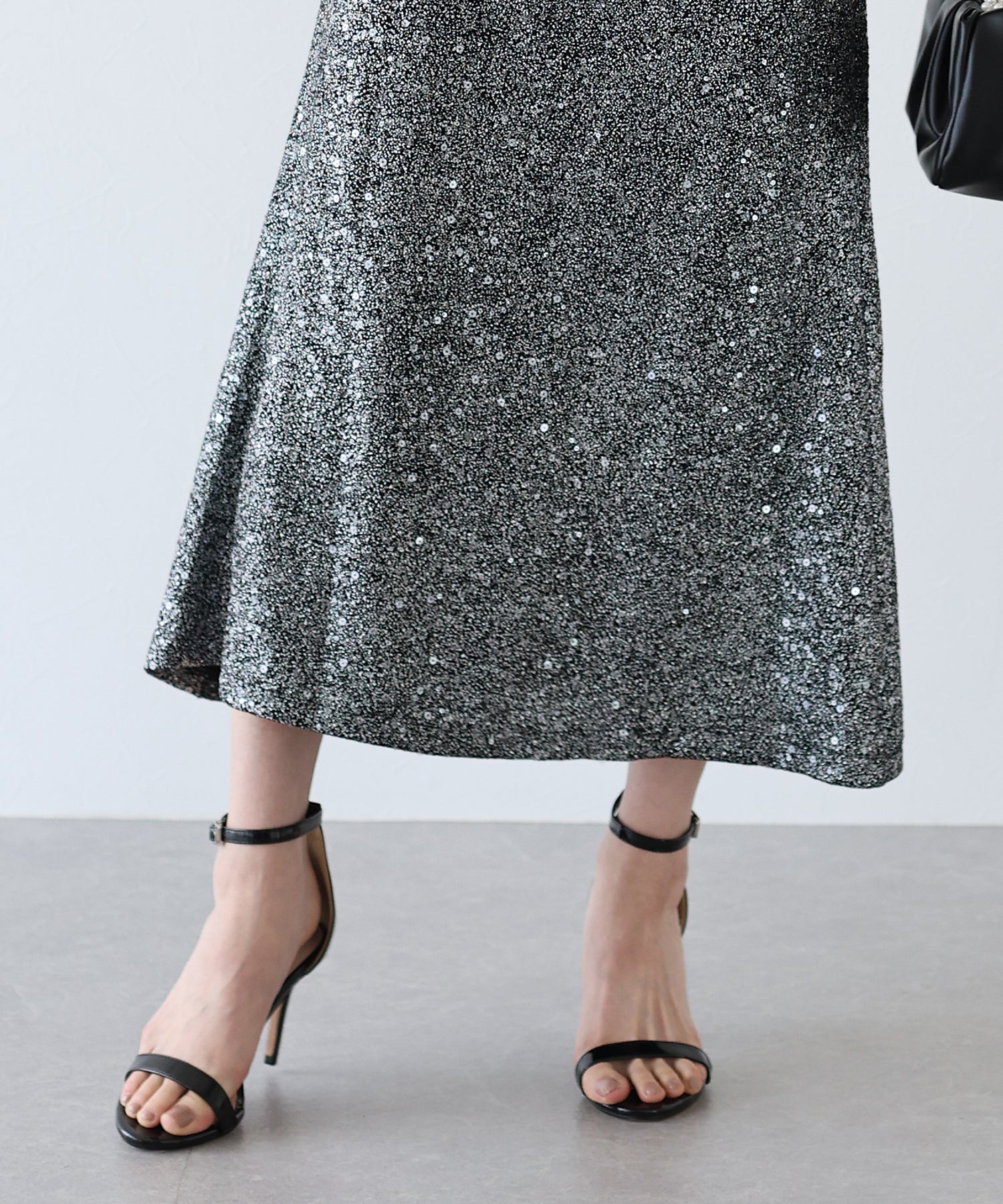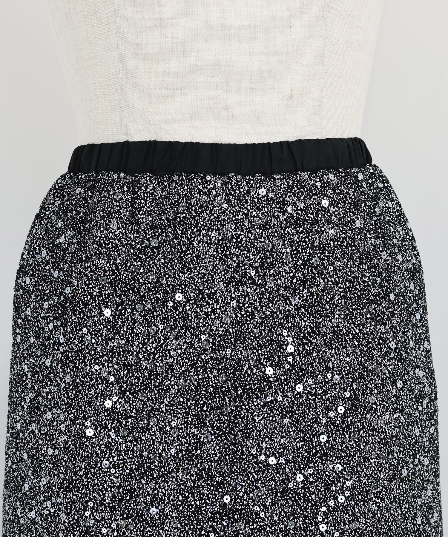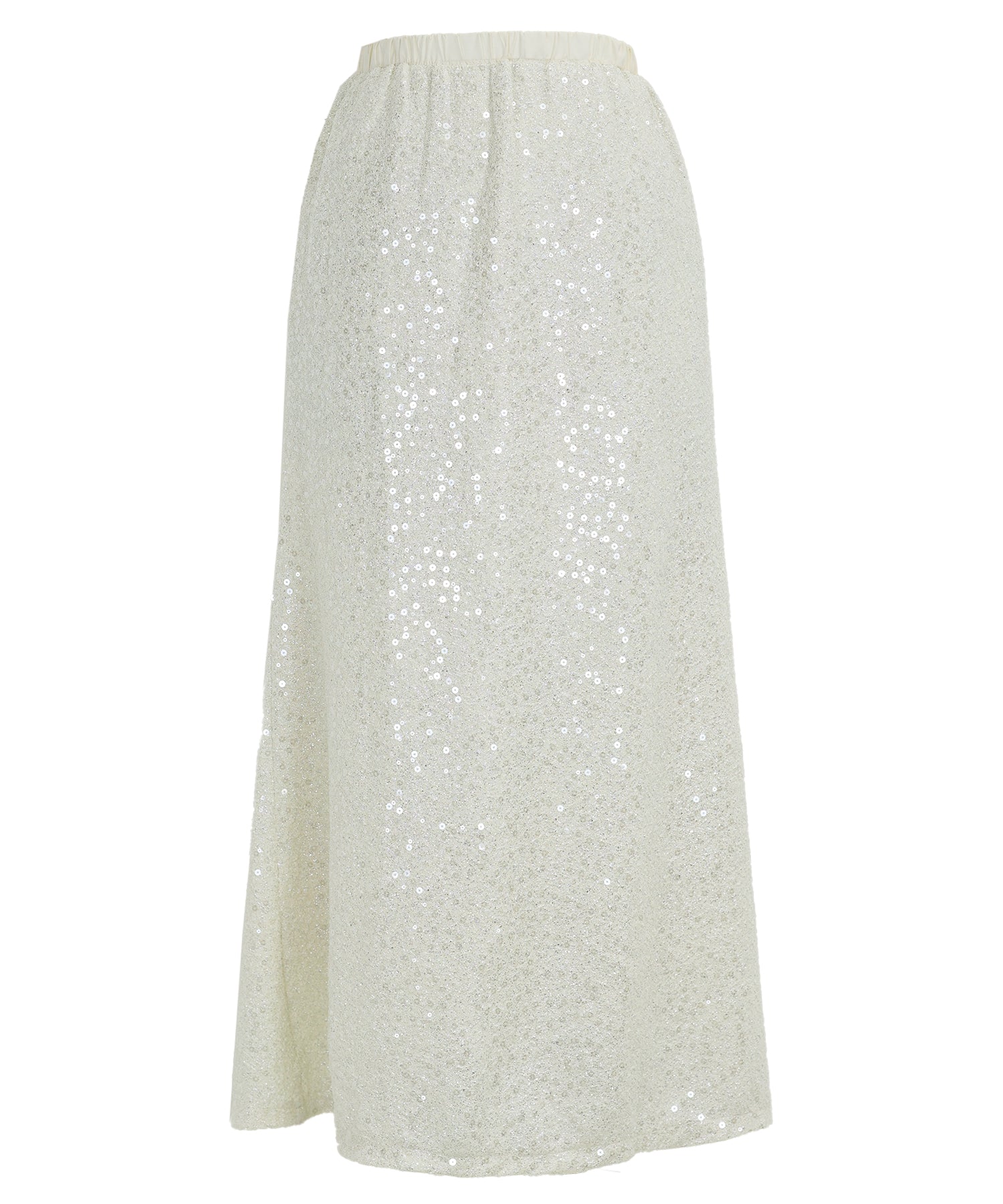 キラキラと光る素材感がオシャレなスパンコールラメスカート ?POINT 動くたびにキラキラと輝くスパンコールやラメが目を惹く、トレンドライクな1枚。 脚長効果が期待できるロングな丈感にスパンコールとラメをたっぷりと付けました。 キラキラと動くたびに輝き、コーデを華やかに仕上げます。 タイトすぎないマーメイドシルエットとウエストゴムで身体のラインを拾いすぎず、ラクに着用いただけます。