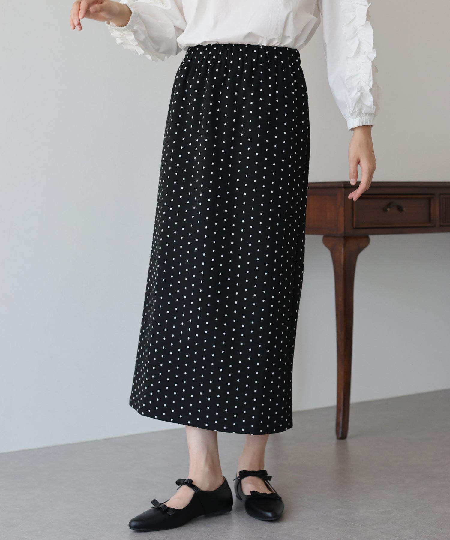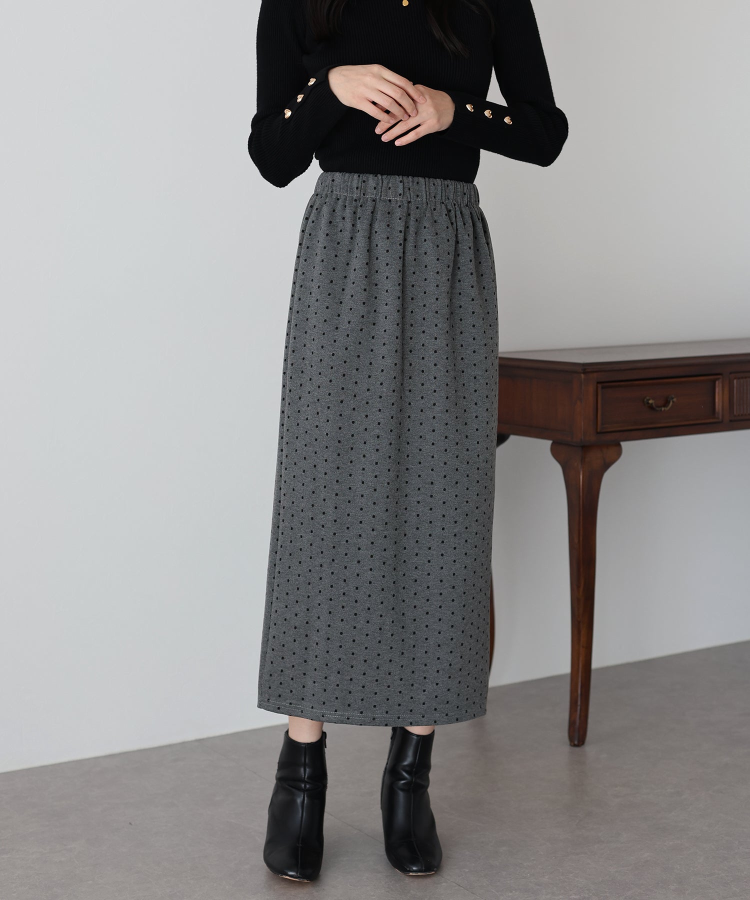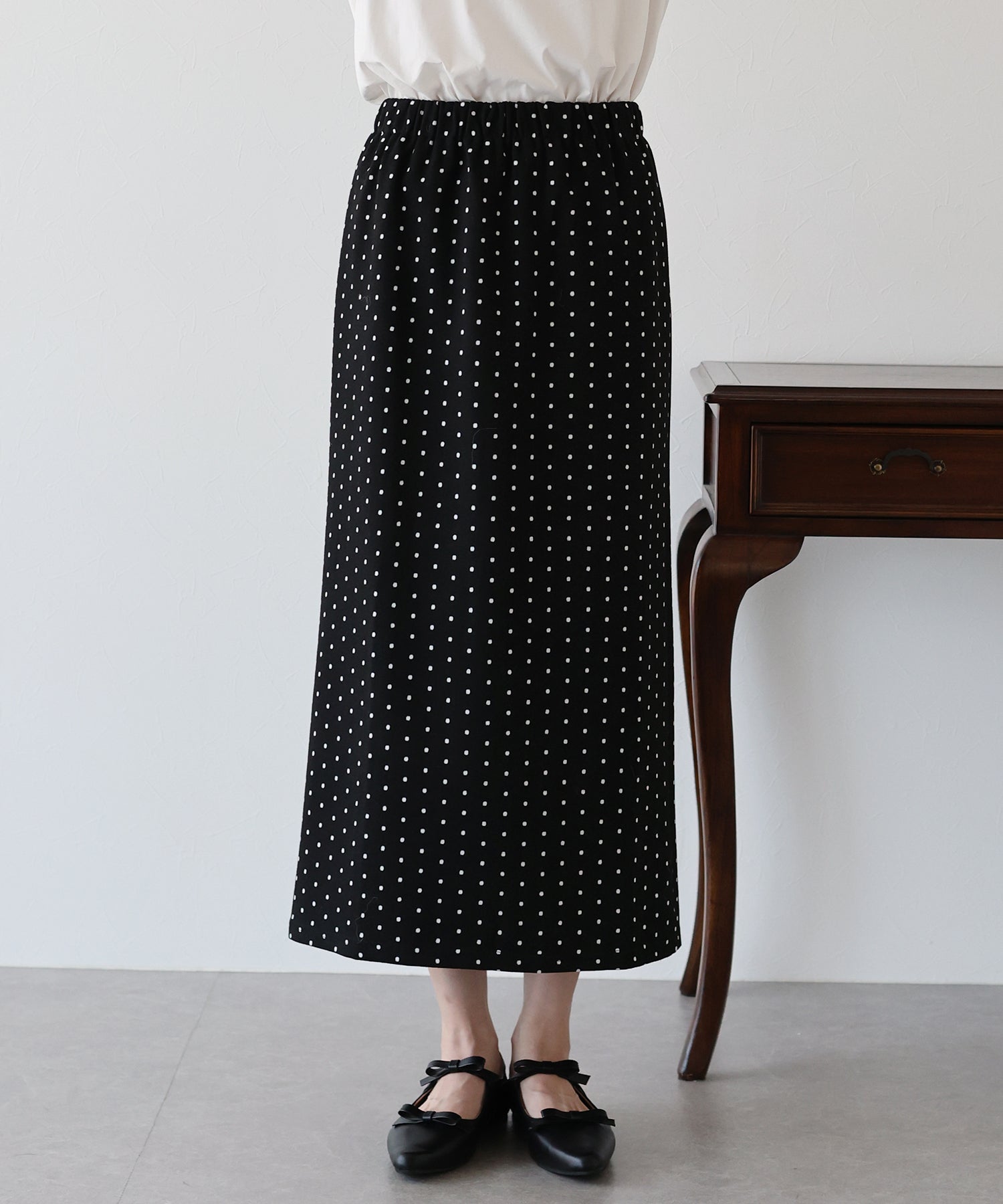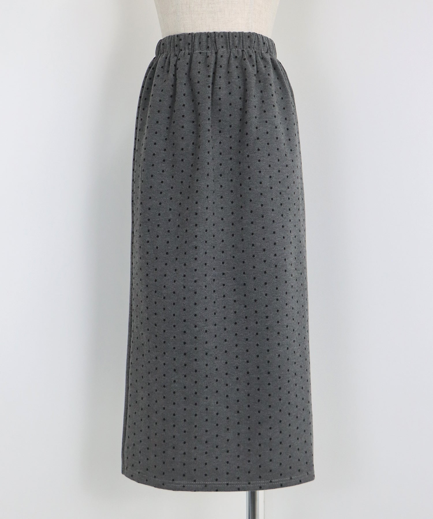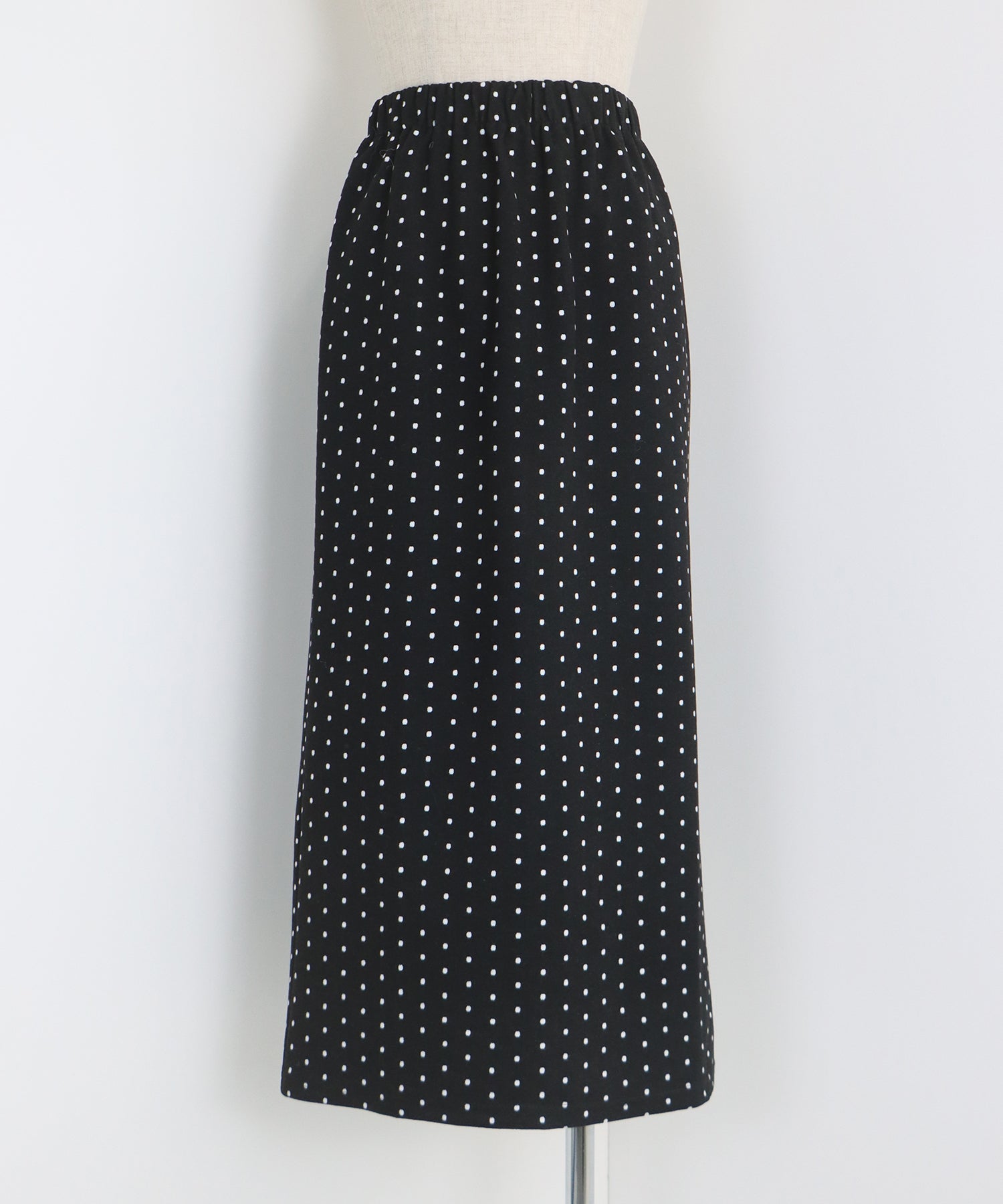 ?POINT ドット柄が大人可愛いタイトスカート。 タイトなシルエットで女性らしさを加え、ドット柄でラブリーさをプラス。 ウエストゴムでラクに着用でき、バックスリットで抜け感を出しました。 厚みのあるしっかりとした生地で、暖かく春?秋~冬などのロングシーズン、デイリーにお使いいただけます。
