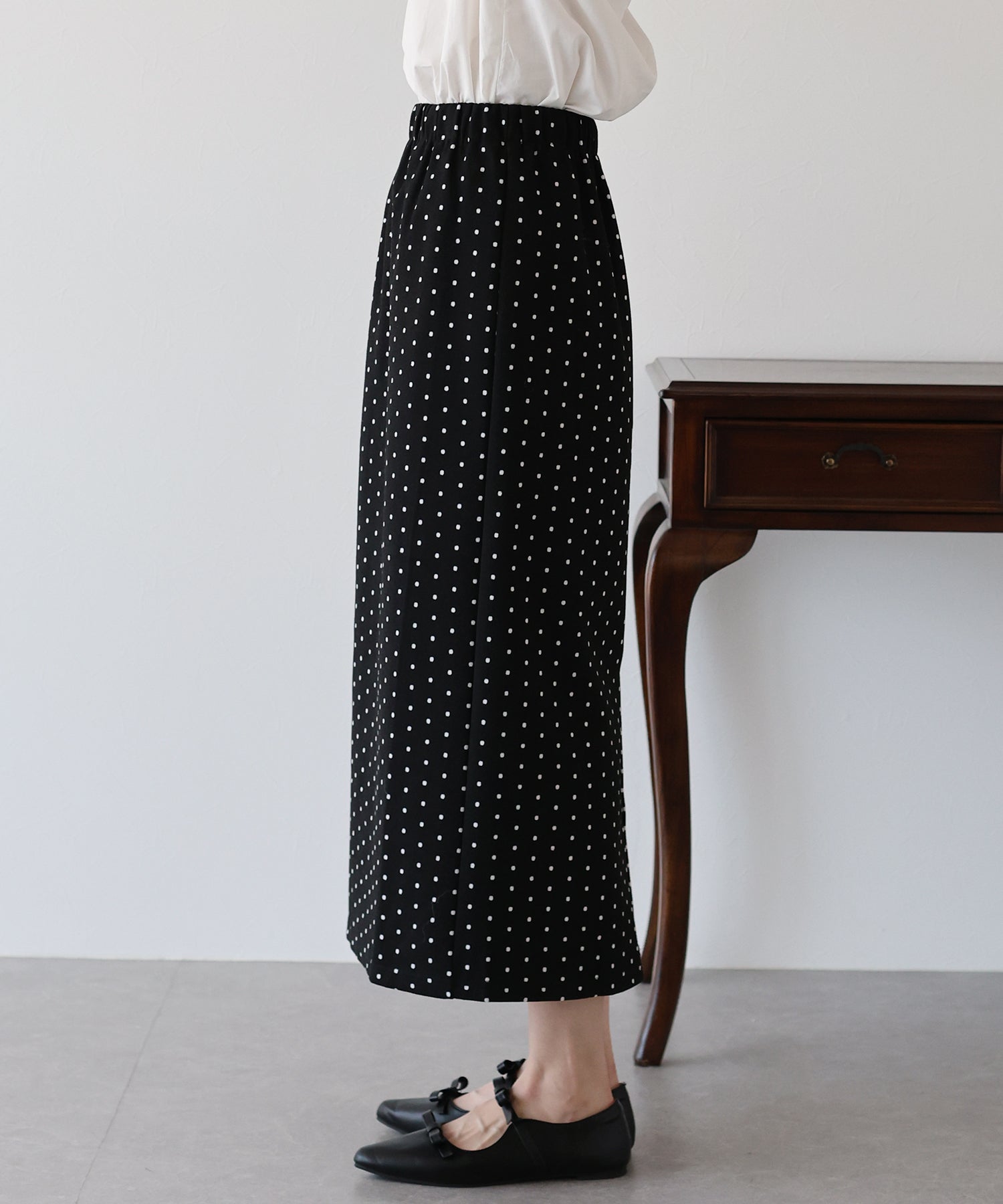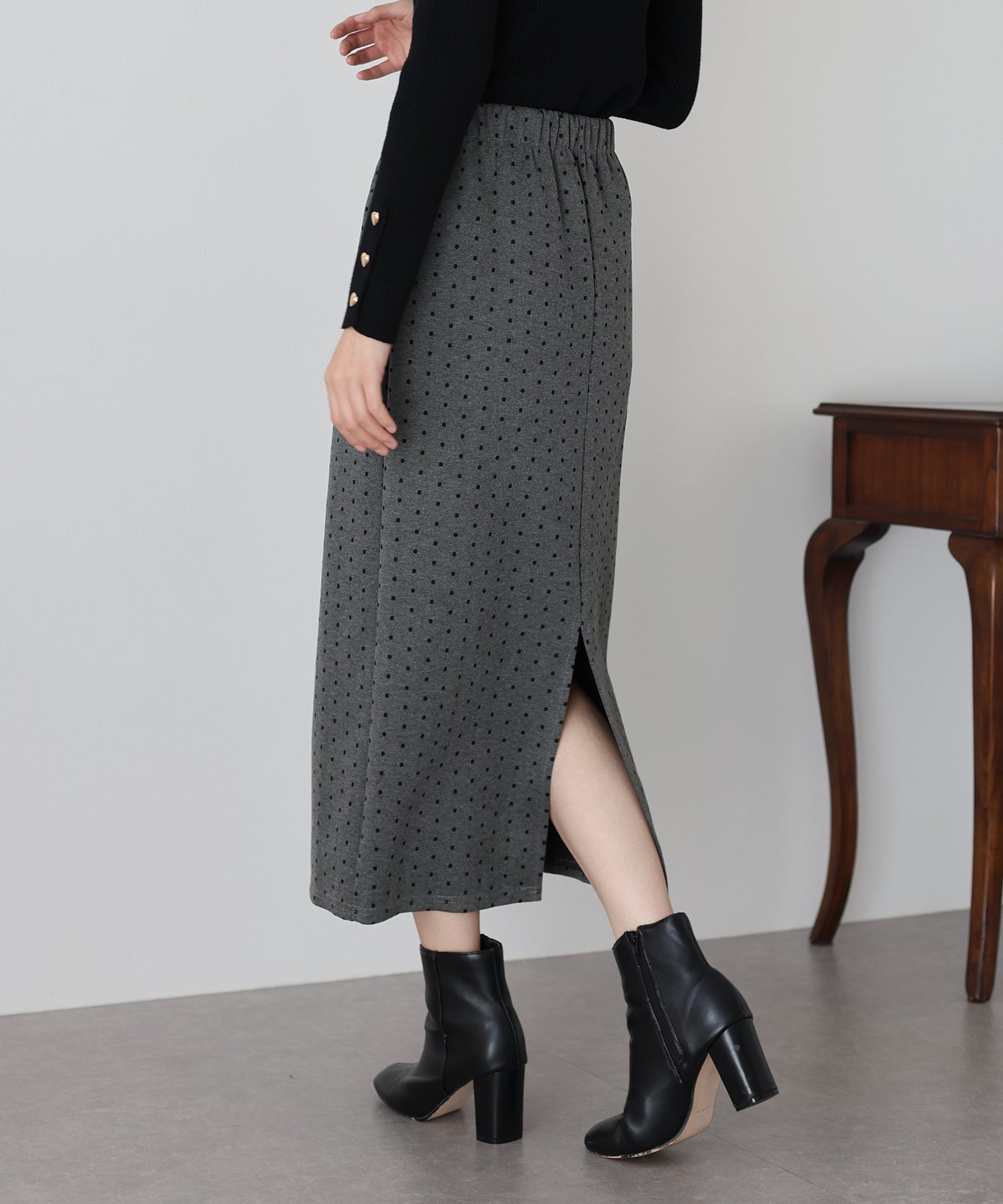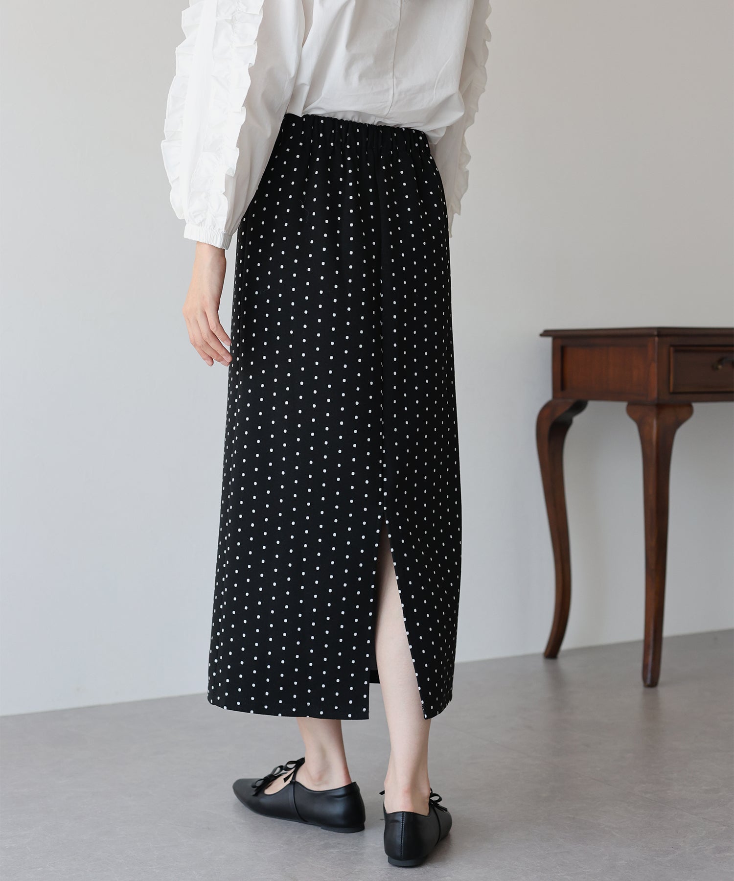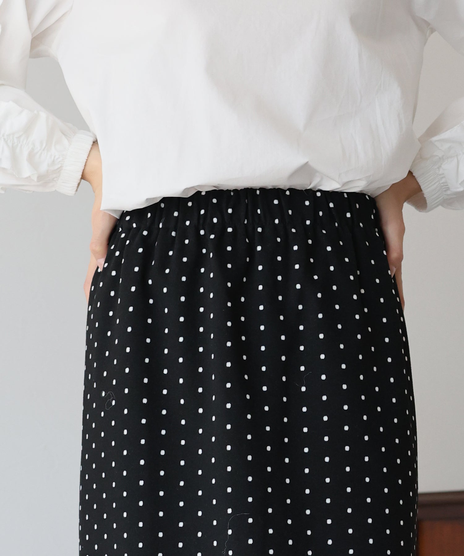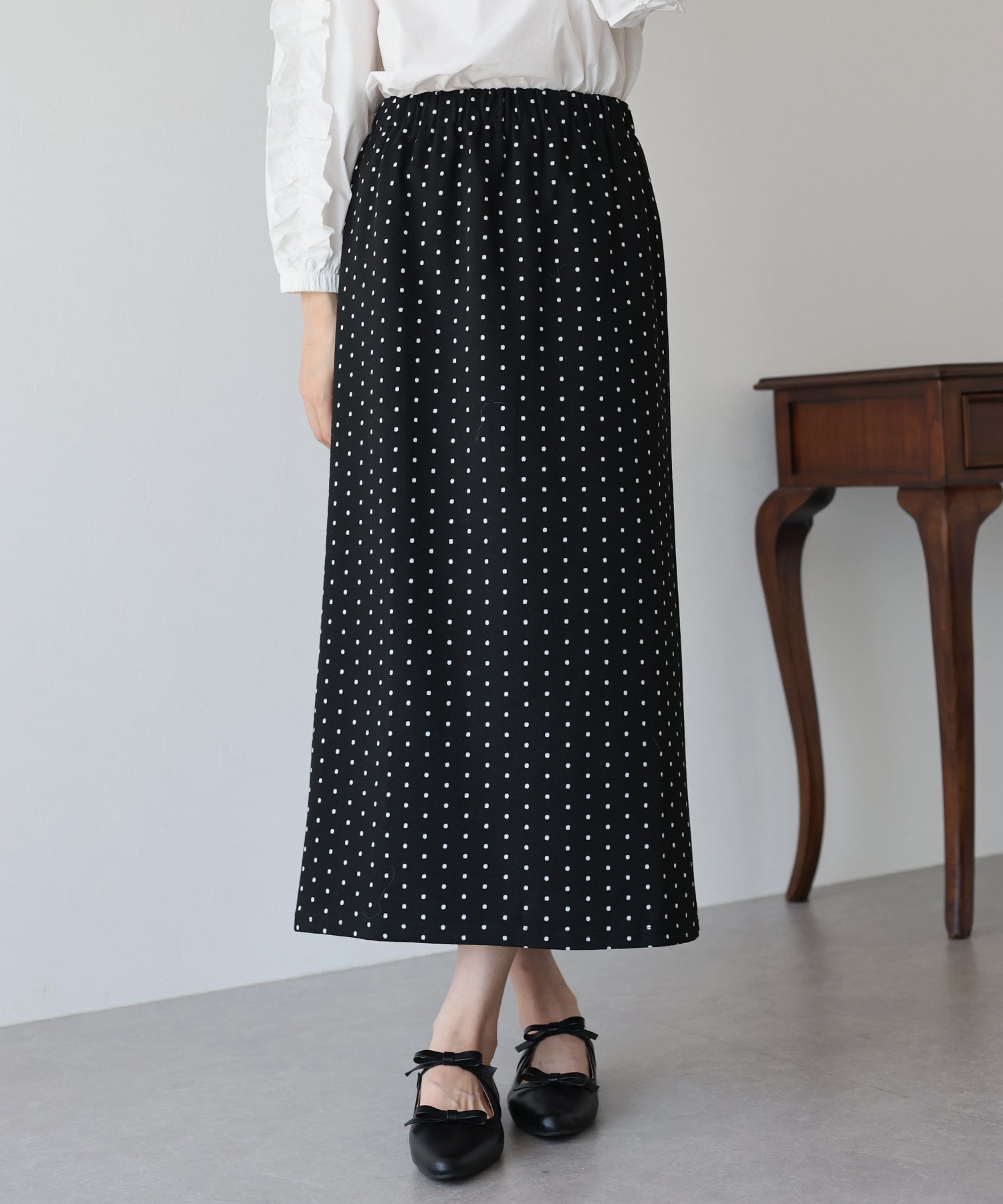 ?POINT ドット柄が大人可愛いタイトスカート。 タイトなシルエットで女性らしさを加え、ドット柄でラブリーさをプラス。 ウエストゴムでラクに着用でき、バックスリットで抜け感を出しました。 厚みのあるしっかりとした生地で、暖かく春?秋~冬などのロングシーズン、デイリーにお使いいただけます。