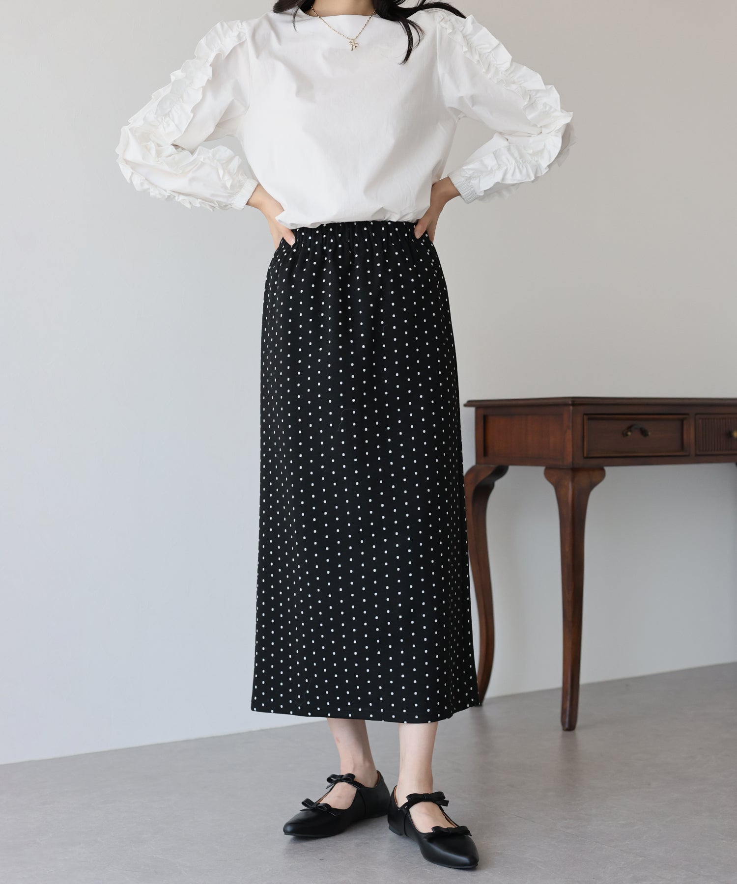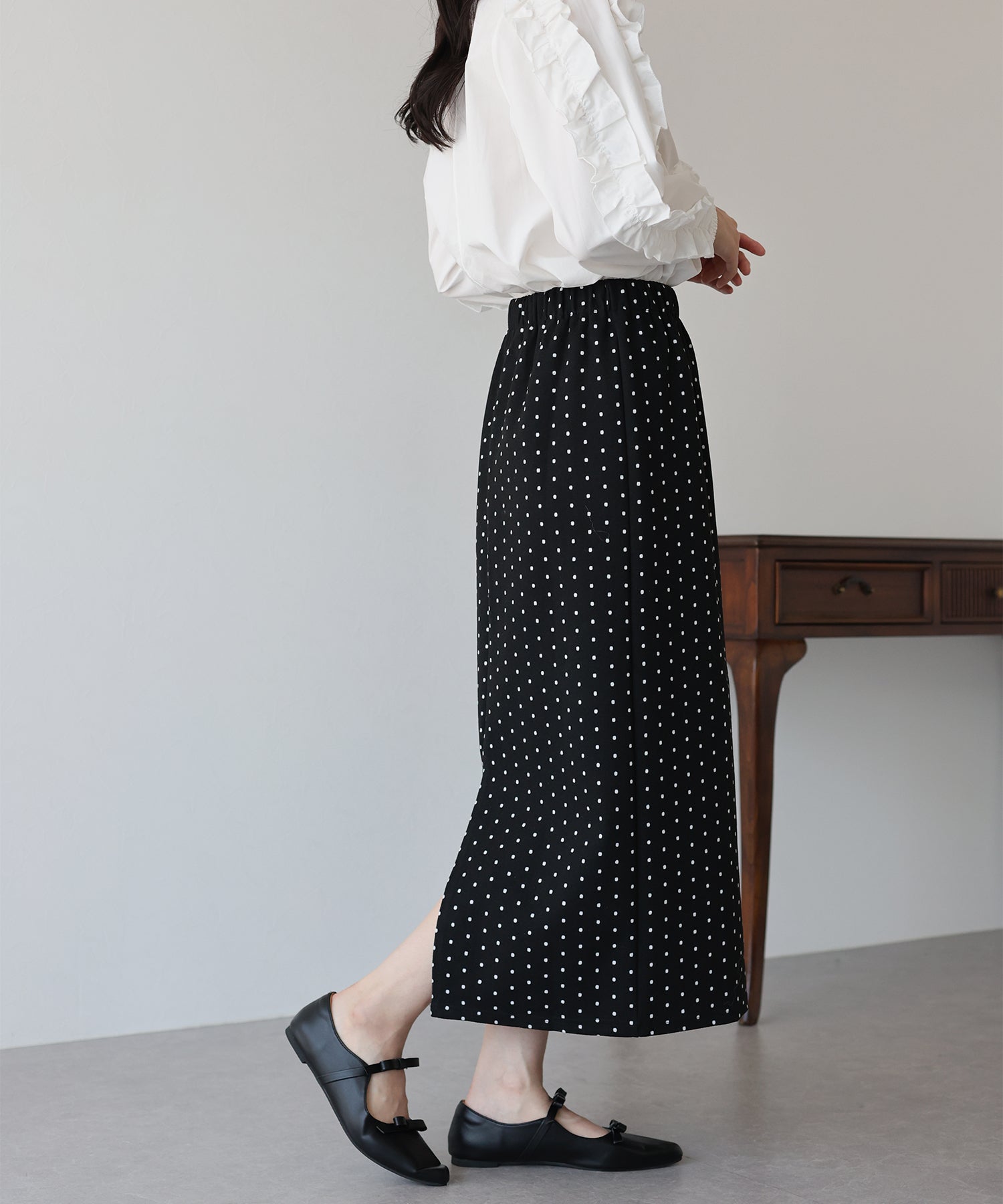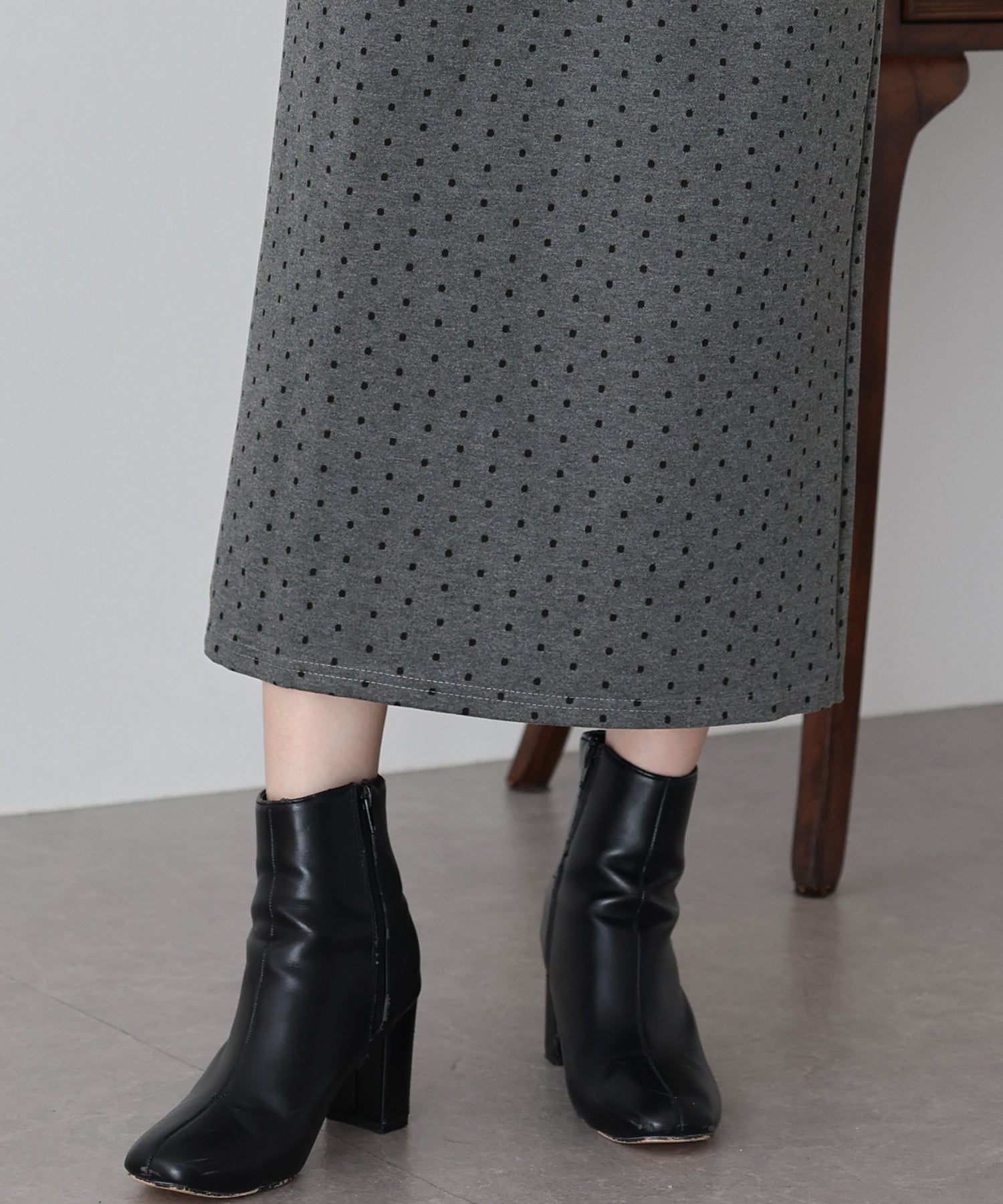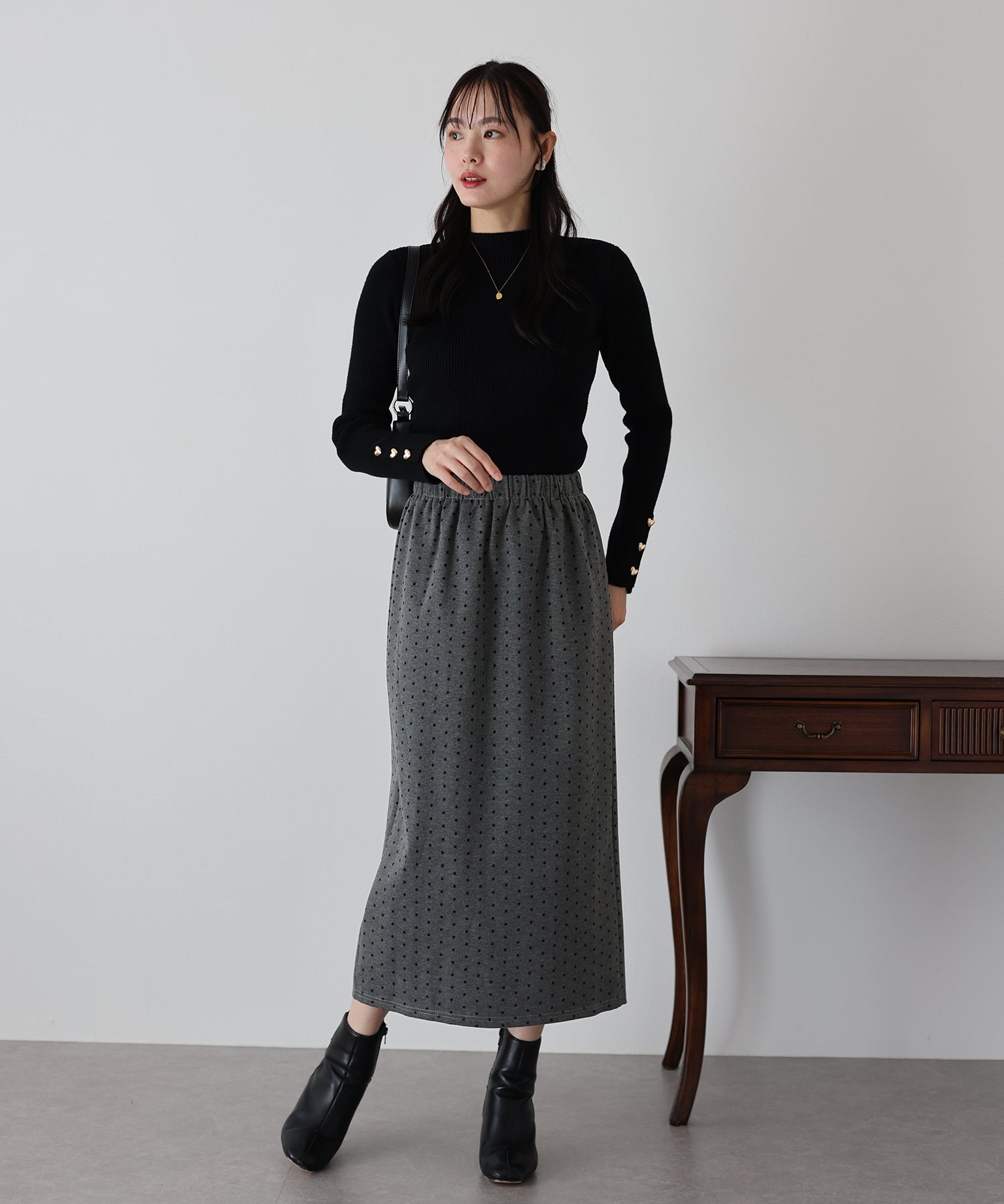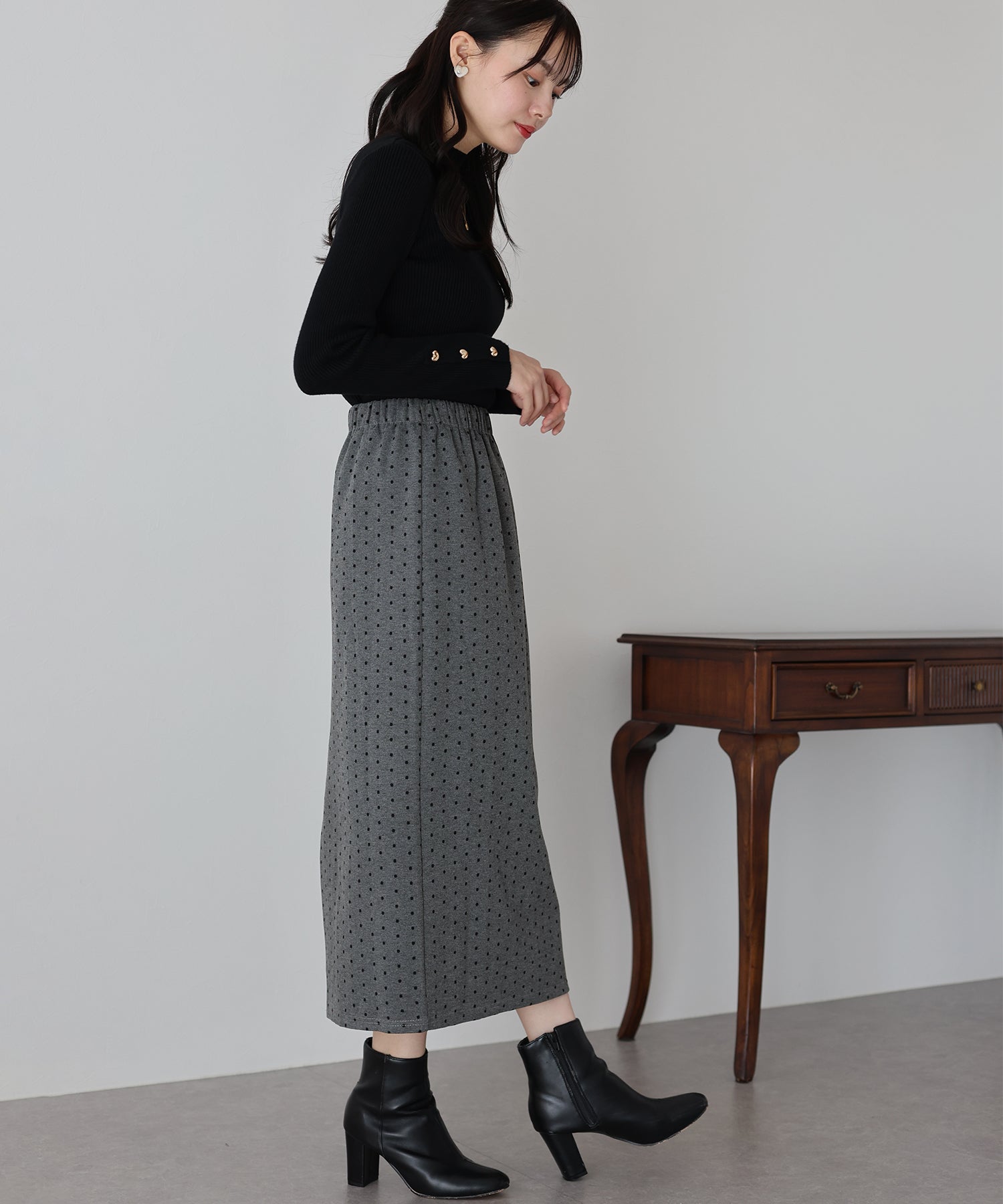 ?POINT ドット柄が大人可愛いタイトスカート。 タイトなシルエットで女性らしさを加え、ドット柄でラブリーさをプラス。 ウエストゴムでラクに着用でき、バックスリットで抜け感を出しました。 厚みのあるしっかりとした生地で、暖かく春?秋~冬などのロングシーズン、デイリーにお使いいただけます。