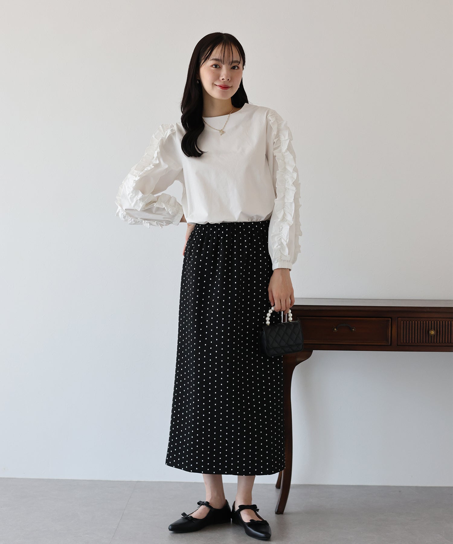 ?STYLING シンプルなトップスと合わせるだけで華やかなコーデが完成します。 シャギーニットやブラウスを合わせたキレイめコーデやパーカー、スウェットと合わせて カジュアルダウンさせたコーデも◎