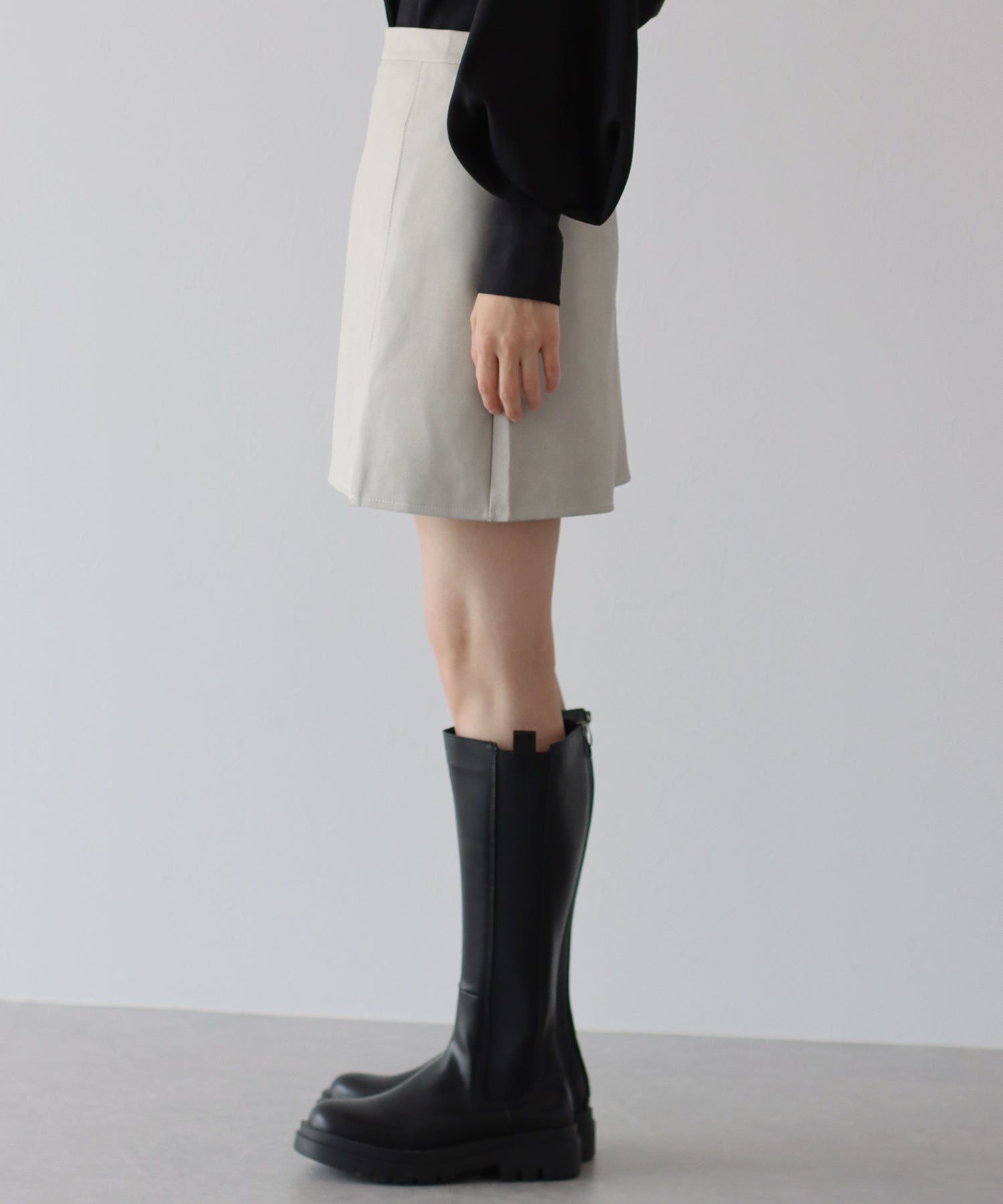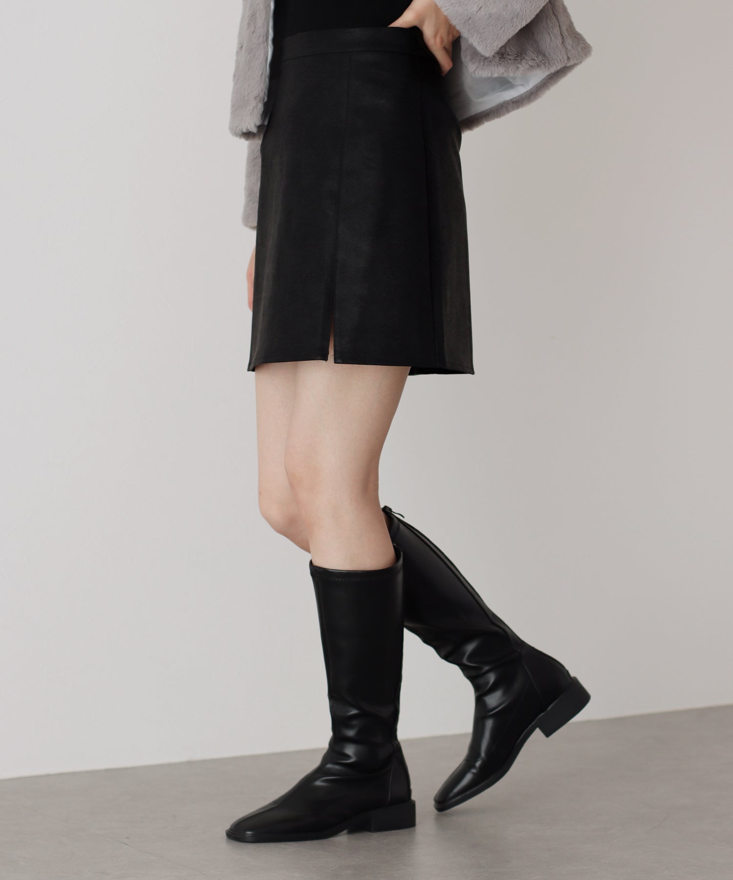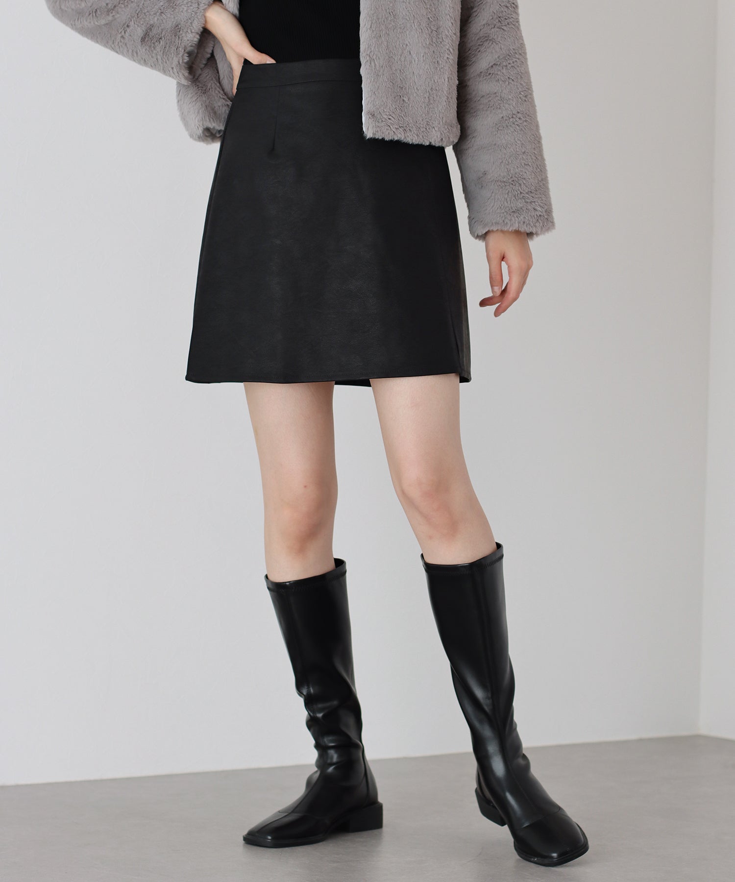 無駄のないシンプルなデザインで、どんなトップスとも馴染むミニスカート。 ミニ丈の台形シルエットスカートは脚長効果を期待できて、ロングブーツと合わせればトレンド感&美脚見え◎ ミニ丈なのでレザーでも重たくならず、スリットがアクセントに。 裏地がペチパンツタイプ仕様になっているのでミニ丈でも安心して着られます。 カラーはベーシックなブラック、チャコールグレーと春先にも楽しめるアイボリーの3色展開。 どんなトップスにも好相性でコーデにクールさをプラスできる、大活躍間違いなしのアイテムです。