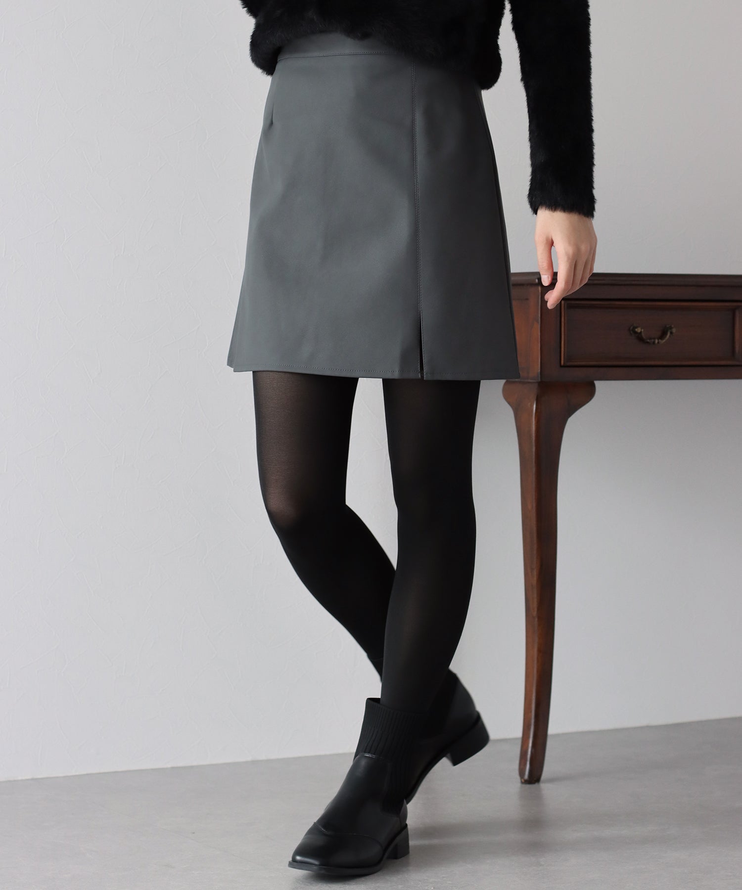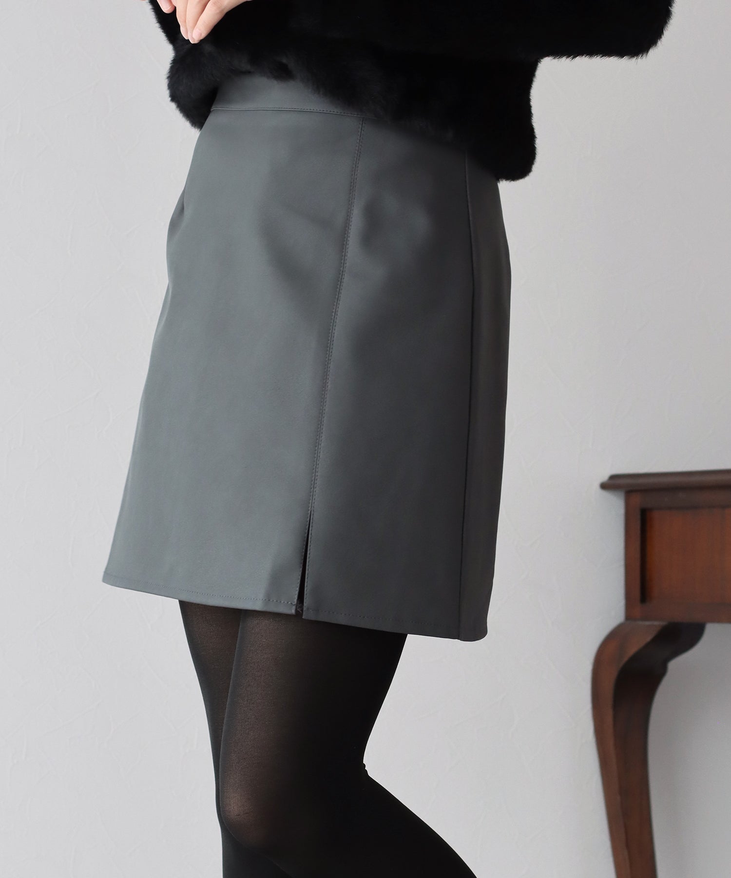 大人な印象をプラスし、腰回りのすっきり見えを叶えてくれるレザーミニスカート ?POINT