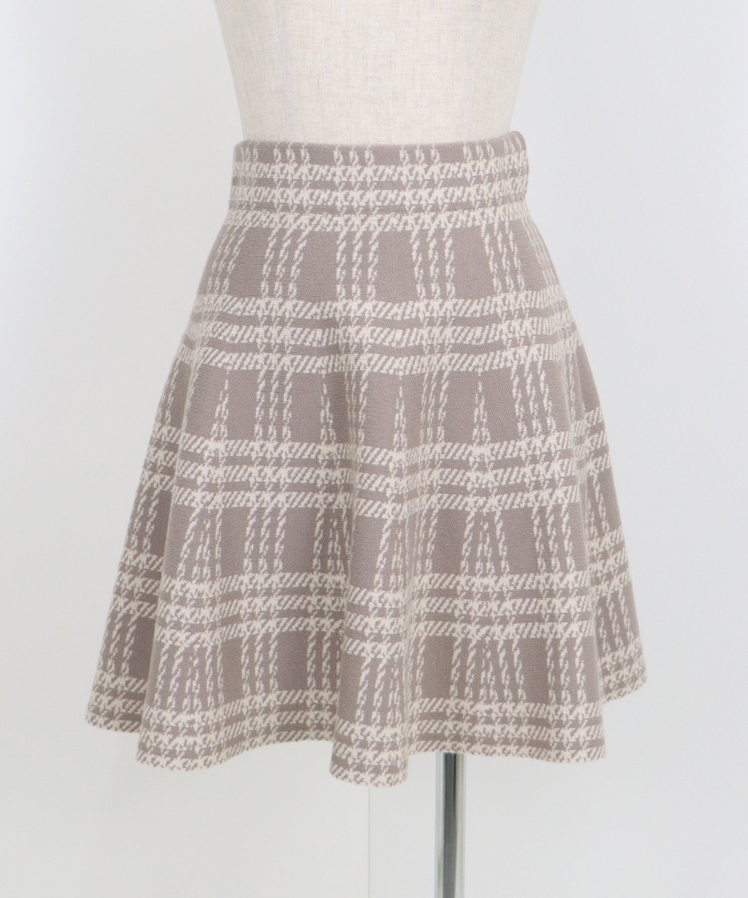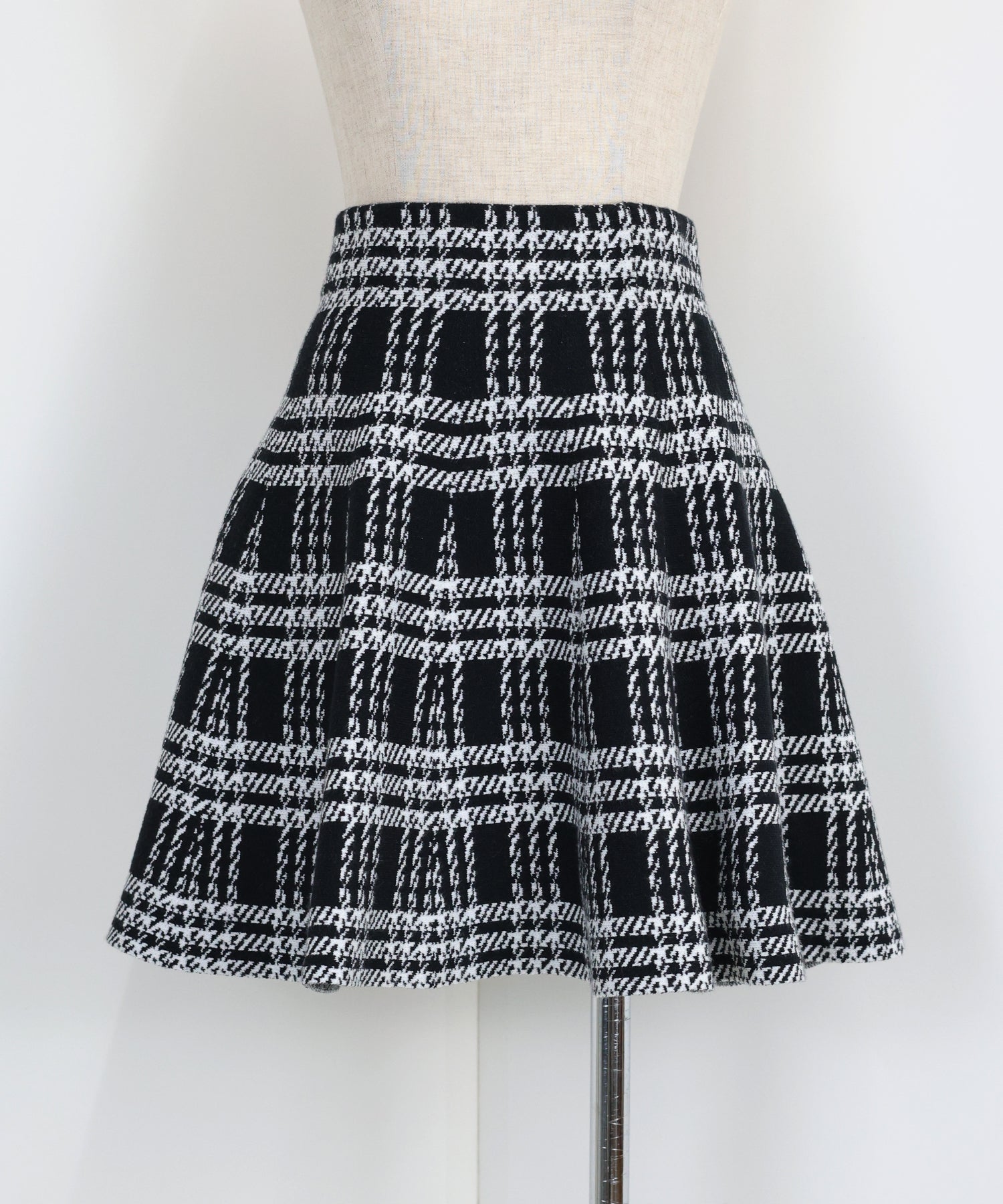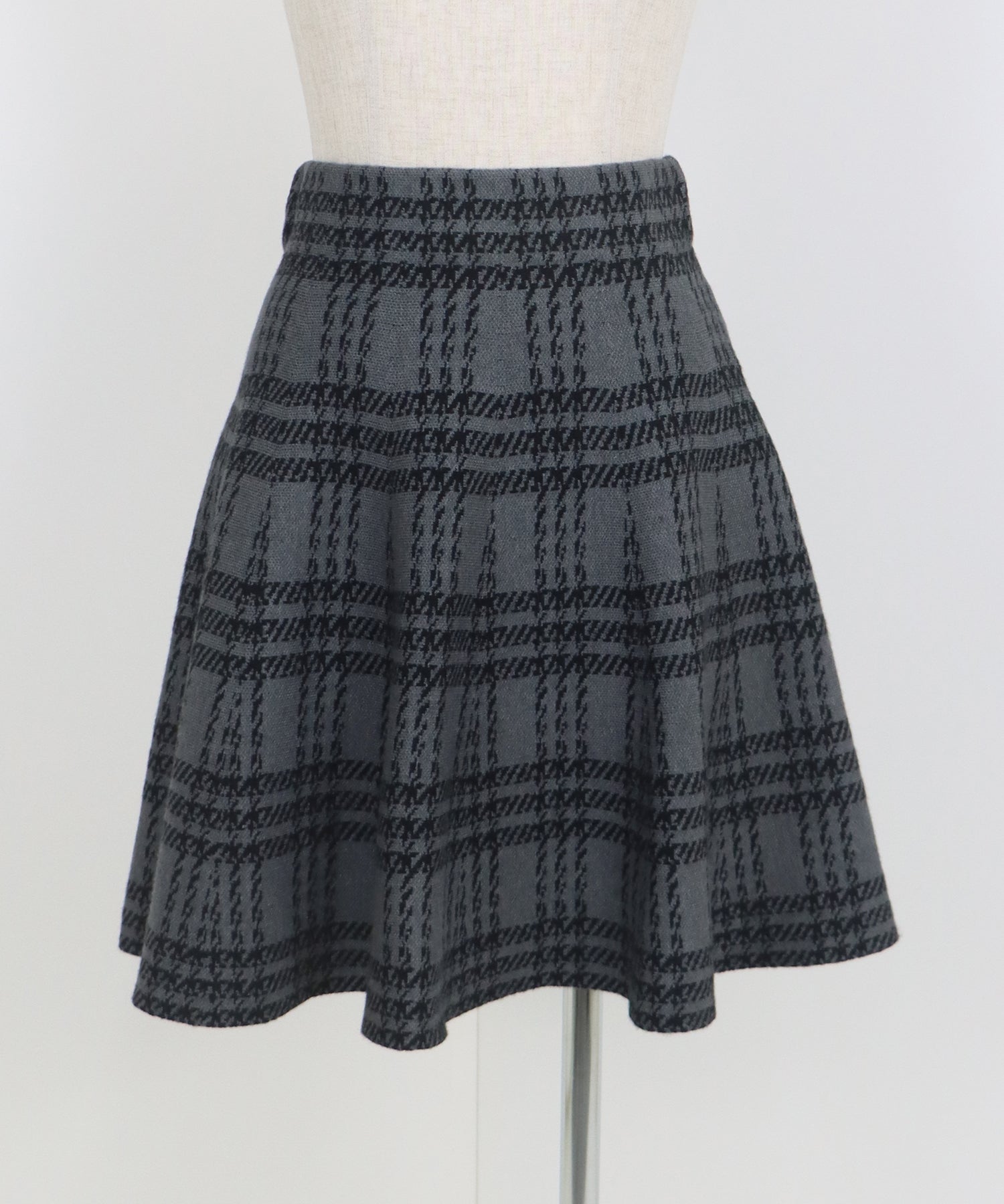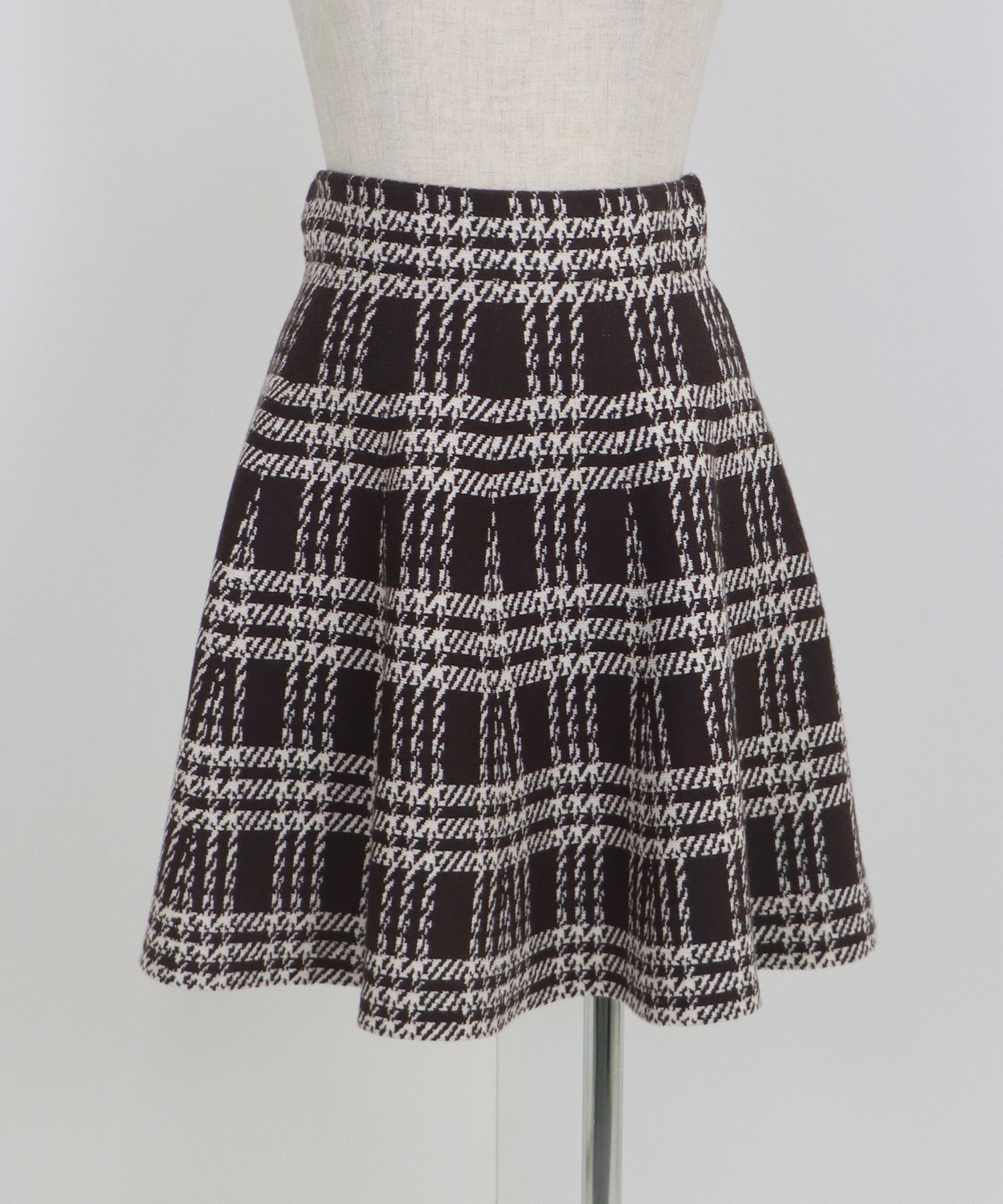 シーズンムード高まるチェック柄ミニスカート ?POINT ミニ丈のフレアシルエットが可愛いフェミニンなニットスカート。 腰回りはぴたっとフィットしてウエストをシェイプしてくれるハイウエストで着膨れせず 裾にかけてふんわりとしたフレアーシルエットで気になる部分を隠せて、脚長効果抜群なスタイルアップシルエット! スタイル良く見えるように拘った、裾に向かって広がって見えるような縦長のチェック柄を編み立てました。 ニット生地でウエストゴム入りなのでストレスフリーに着用でき、 厚みがある素材で、透けを気にせずに安心してお召しいただけます◎