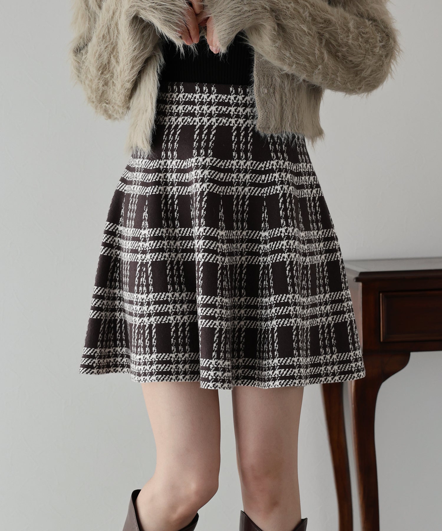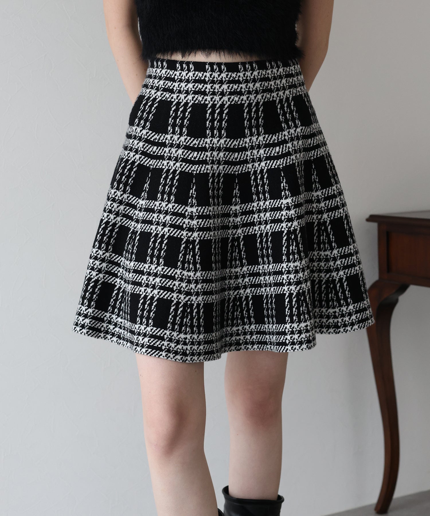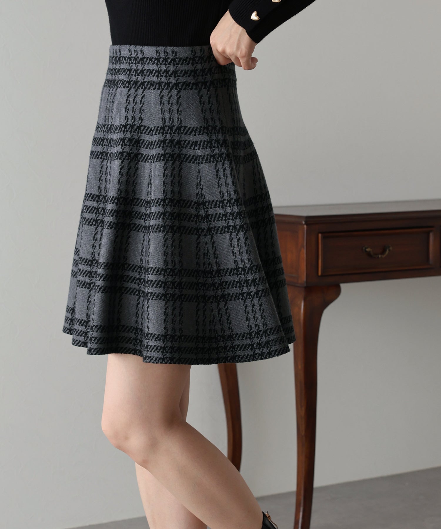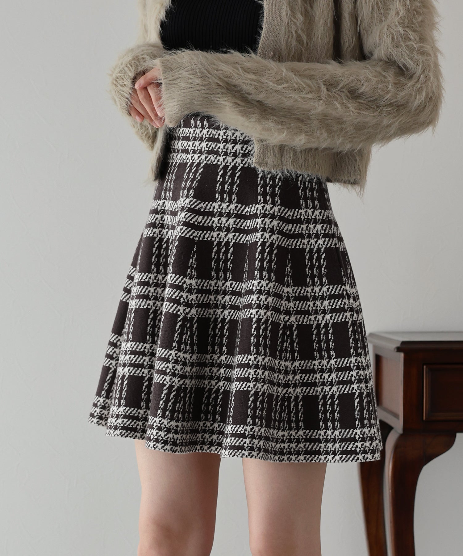 シーズンムード高まるチェック柄ミニスカート ?POINT ミニ丈のフレアシルエットが可愛いフェミニンなニットスカート。 腰回りはぴたっとフィットしてウエストをシェイプしてくれるハイウエストで着膨れせず 裾にかけてふんわりとしたフレアーシルエットで気になる部分を隠せて、脚長効果抜群なスタイルアップシルエット! スタイル良く見えるように拘った、裾に向かって広がって見えるような縦長のチェック柄を編み立てました。 ニット生地でウエストゴム入りなのでストレスフリーに着用でき、 厚みがある素材で、透けを気にせずに安心してお召しいただけます◎