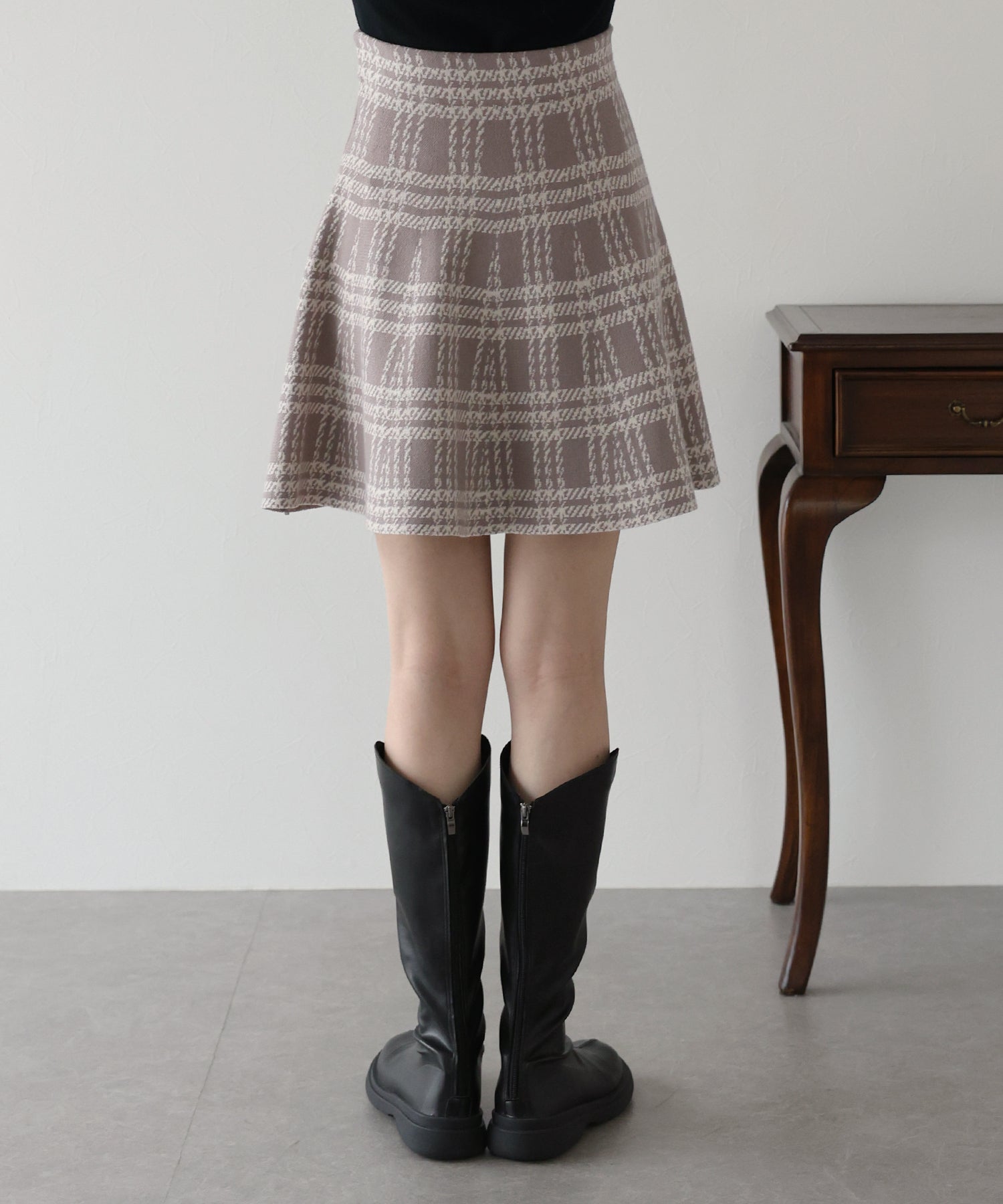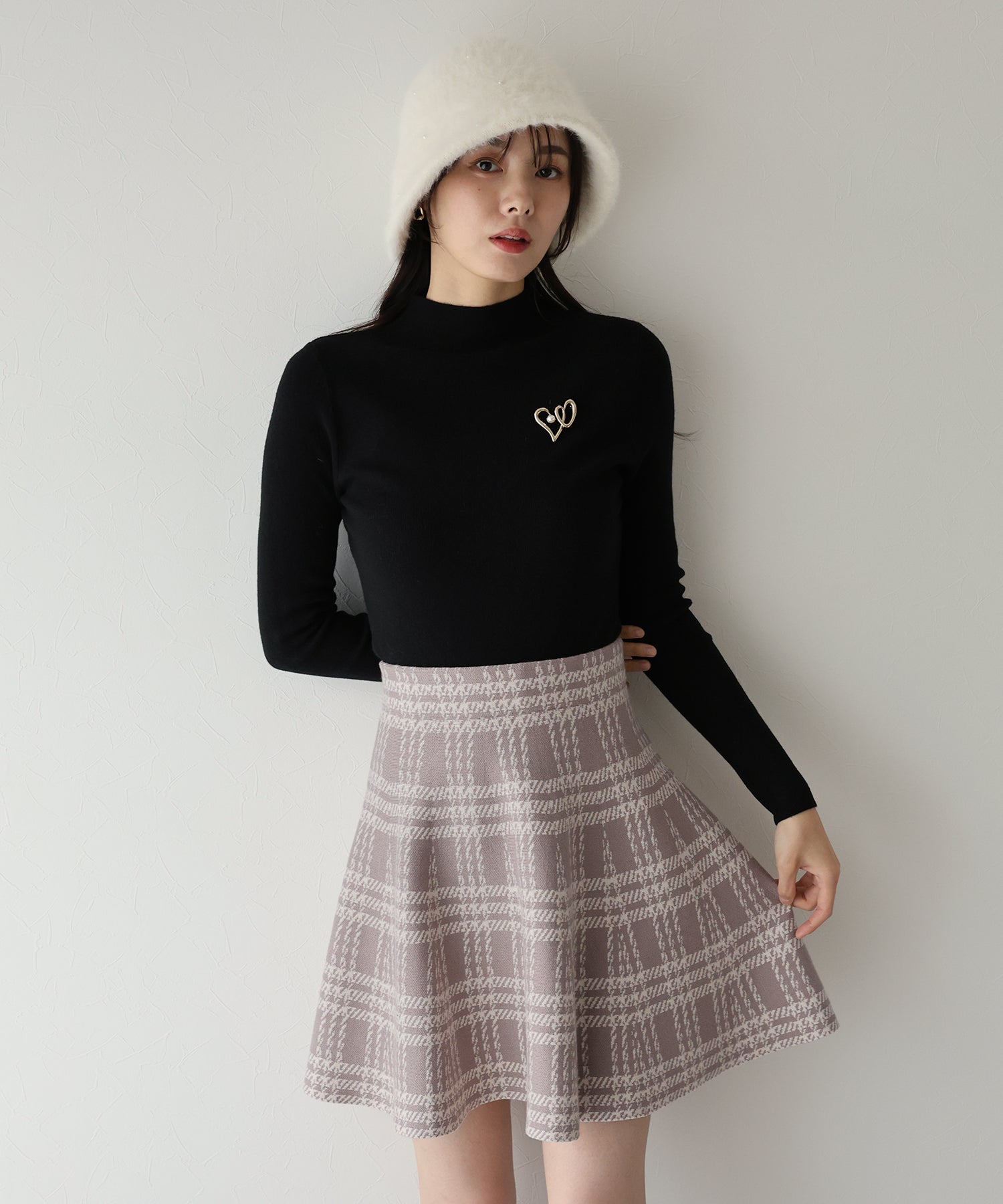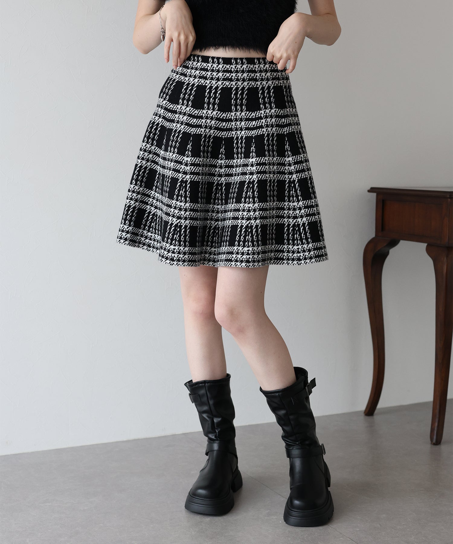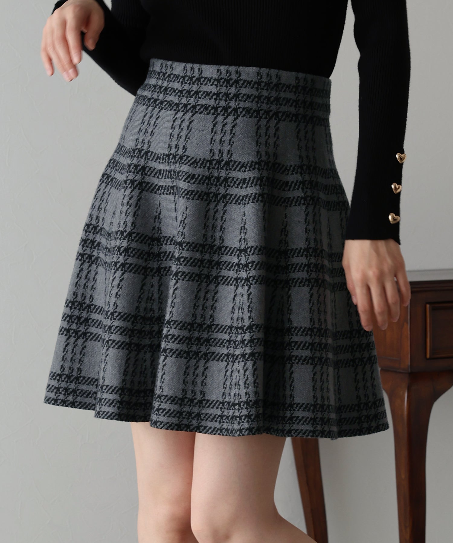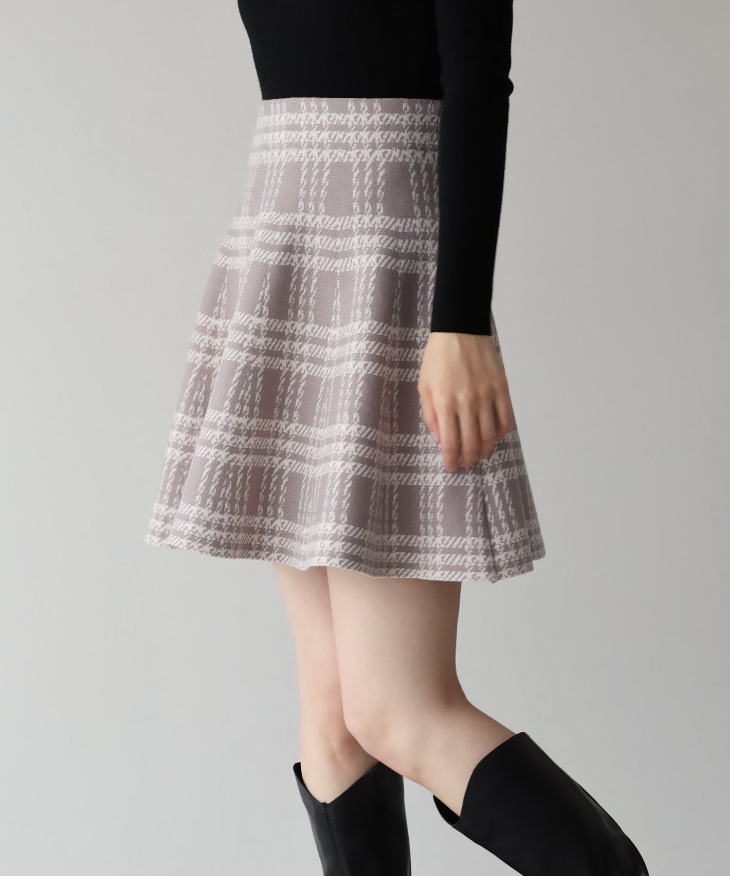 シーズンムード高まるチェック柄ミニスカート ?POINT ミニ丈のフレアシルエットが可愛いフェミニンなニットスカート。 腰回りはぴたっとフィットしてウエストをシェイプしてくれるハイウエストで着膨れせず 裾にかけてふんわりとしたフレアーシルエットで気になる部分を隠せて、脚長効果抜群なスタイルアップシルエット! スタイル良く見えるように拘った、裾に向かって広がって見えるような縦長のチェック柄を編み立てました。 ニット生地でウエストゴム入りなのでストレスフリーに着用でき、 厚みがある素材で、透けを気にせずに安心してお召しいただけます◎