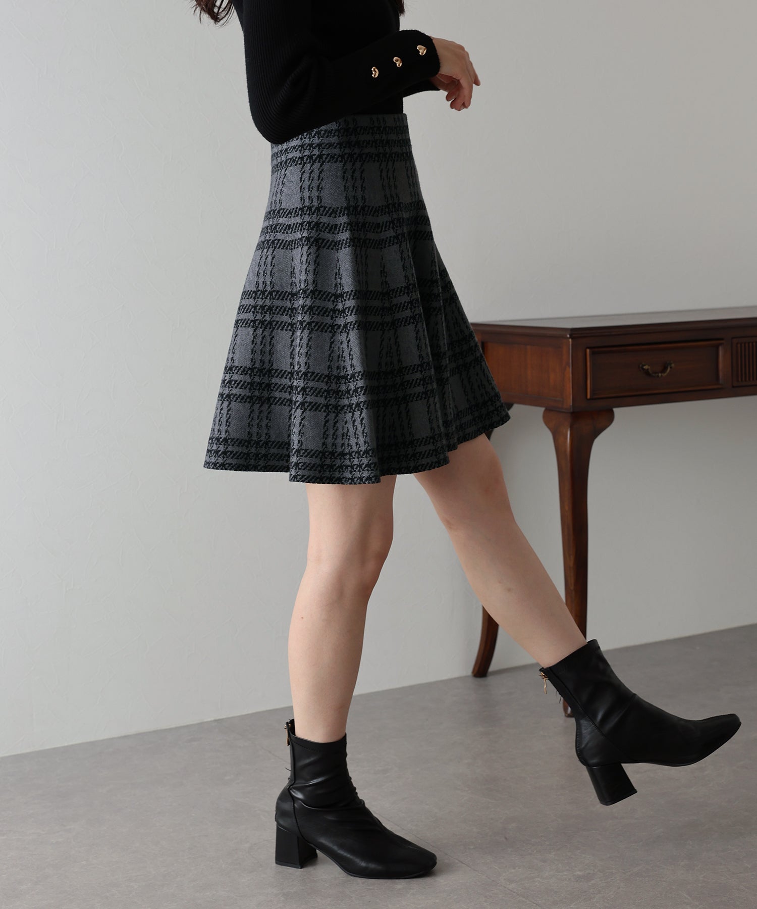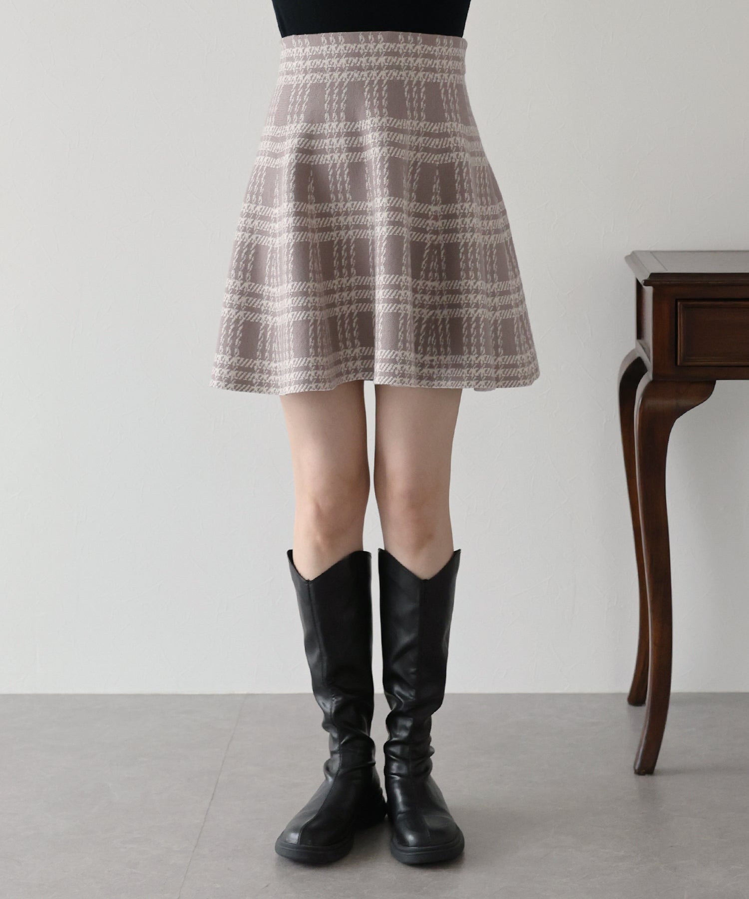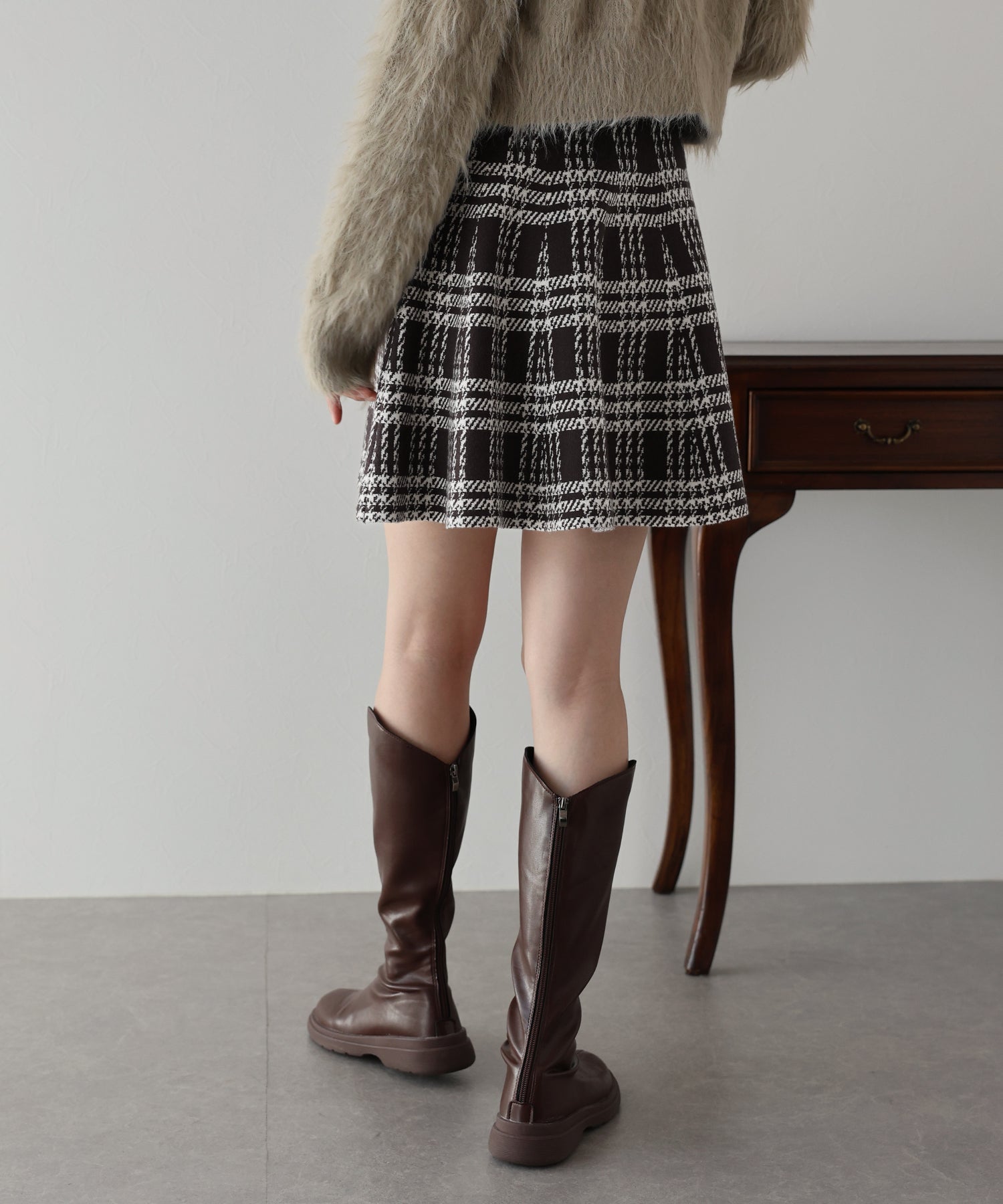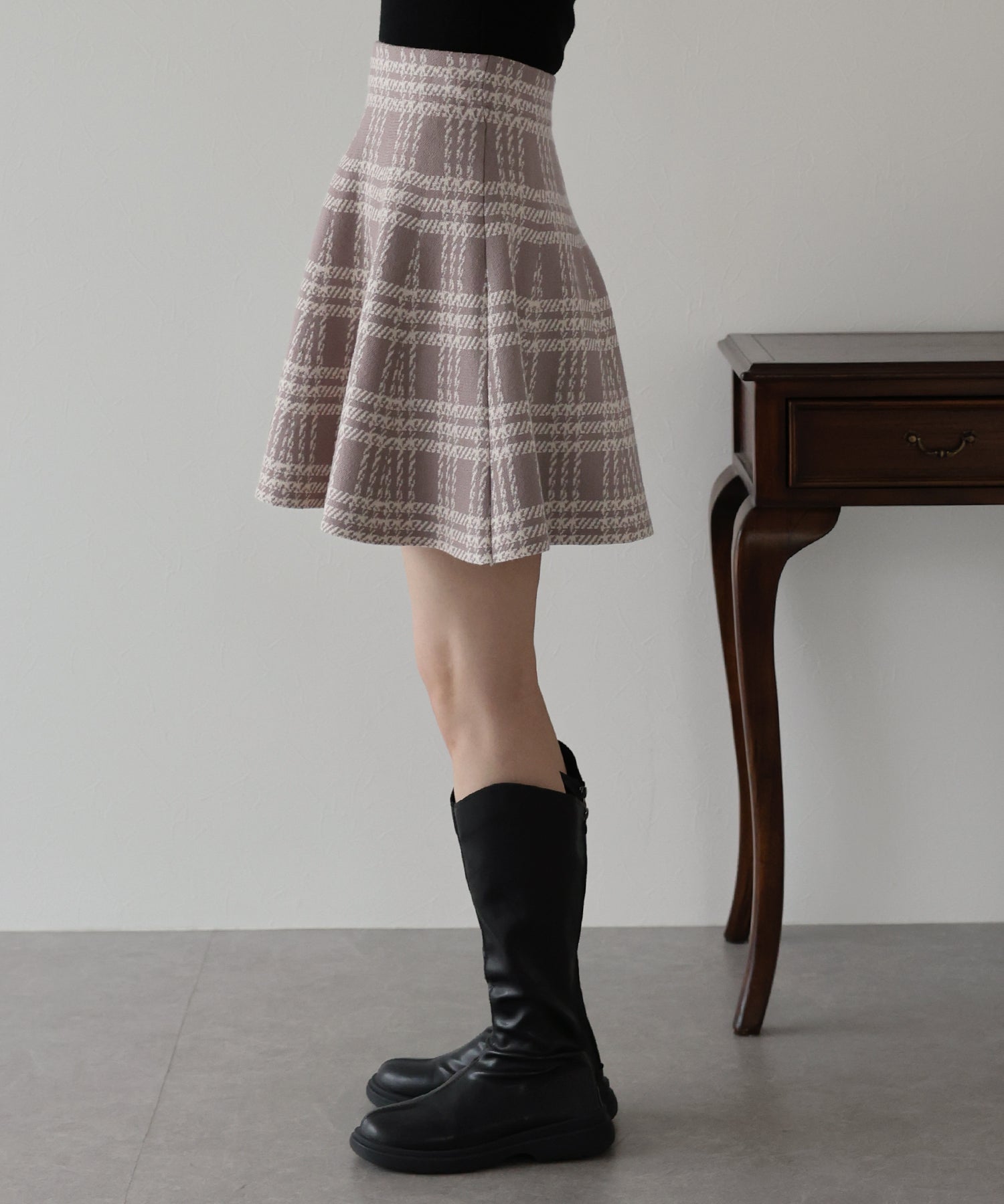 シーズンムード高まるチェック柄ミニスカート ?POINT ミニ丈のフレアシルエットが可愛いフェミニンなニットスカート。 腰回りはぴたっとフィットしてウエストをシェイプしてくれるハイウエストで着膨れせず 裾にかけてふんわりとしたフレアーシルエットで気になる部分を隠せて、脚長効果抜群なスタイルアップシルエット! スタイル良く見えるように拘った、裾に向かって広がって見えるような縦長のチェック柄を編み立てました。 ニット生地でウエストゴム入りなのでストレスフリーに着用でき、 厚みがある素材で、透けを気にせずに安心してお召しいただけます◎