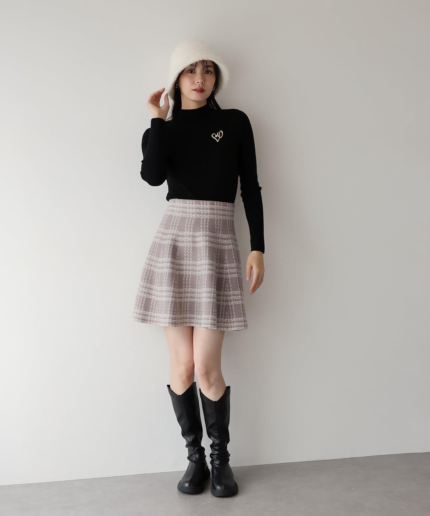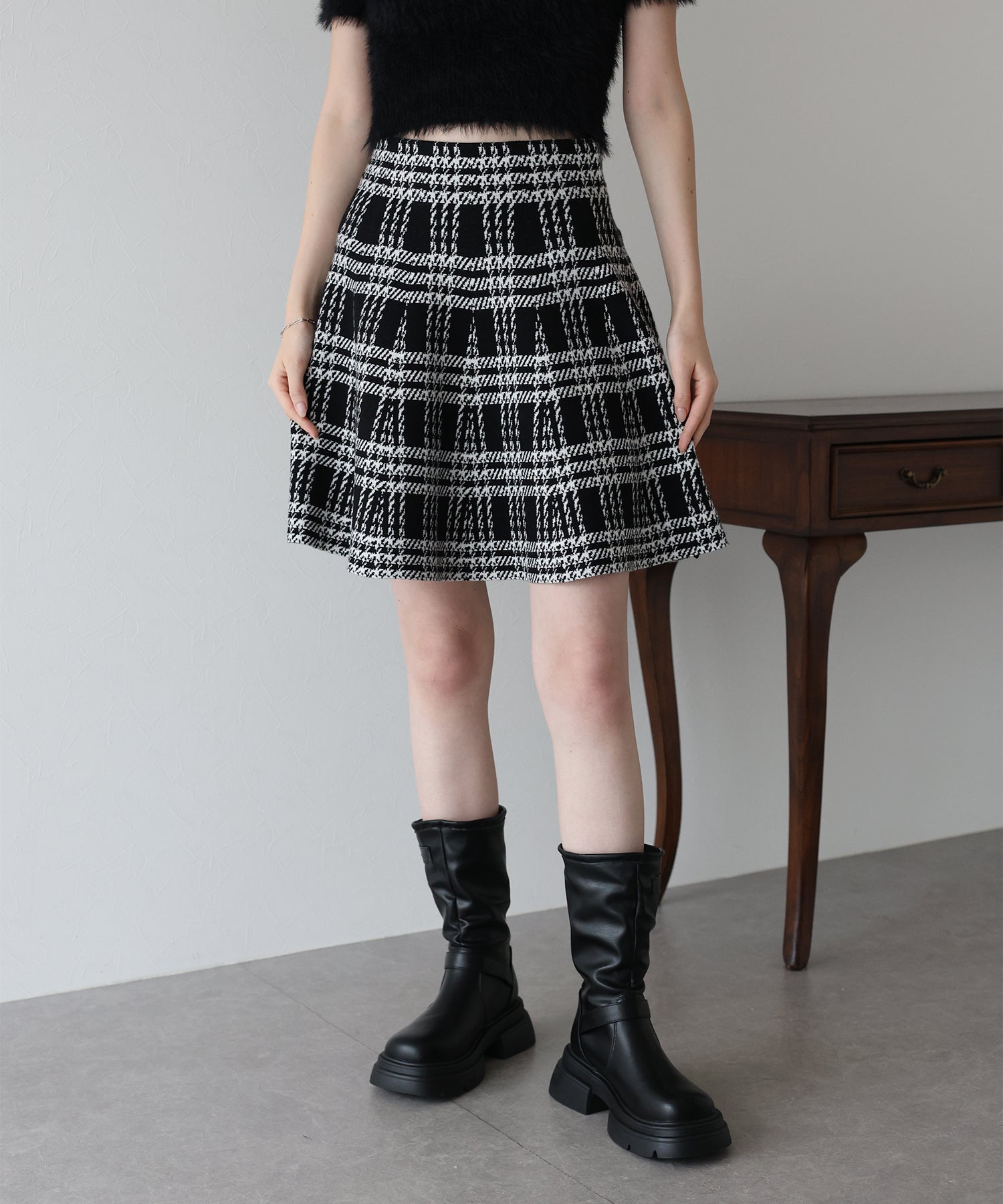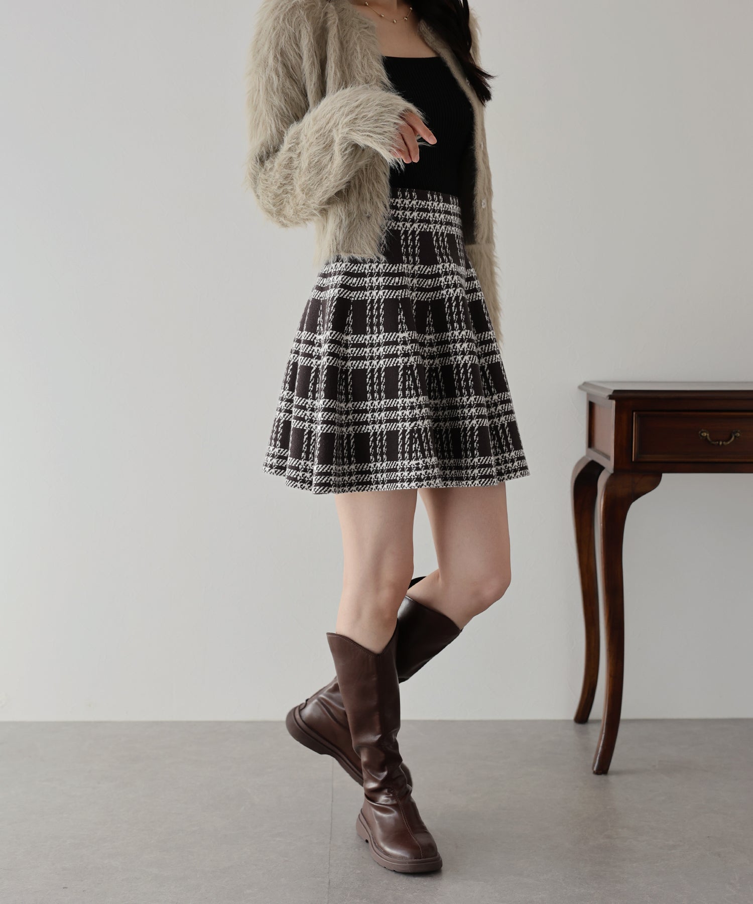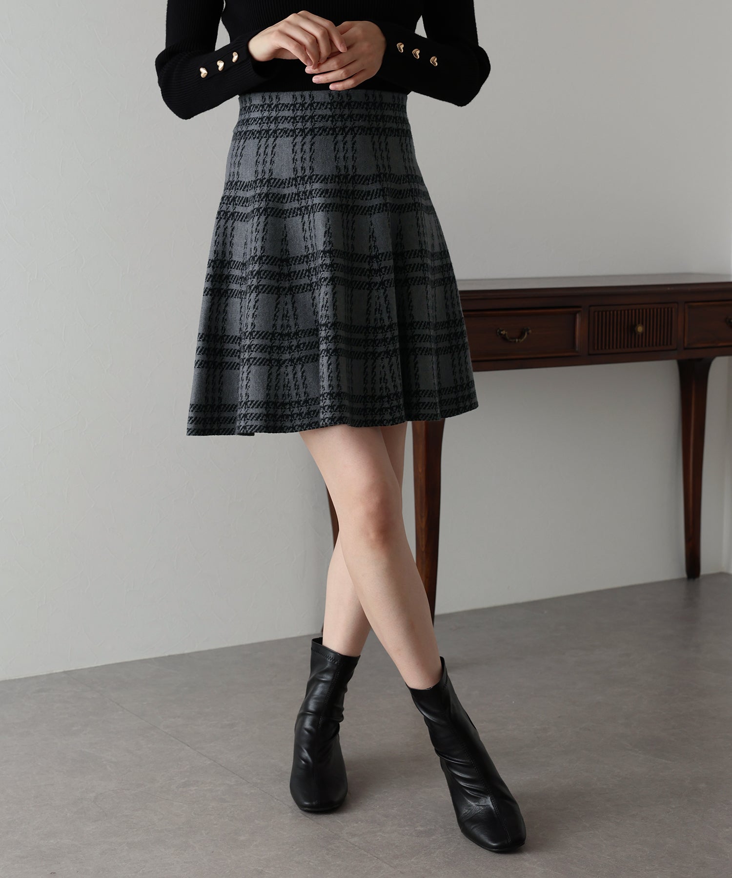 シーズンムード高まるチェック柄ミニスカート ?POINT ミニ丈のフレアシルエットが可愛いフェミニンなニットスカート。 腰回りはぴたっとフィットしてウエストをシェイプしてくれるハイウエストで着膨れせず 裾にかけてふんわりとしたフレアーシルエットで気になる部分を隠せて、脚長効果抜群なスタイルアップシルエット! スタイル良く見えるように拘った、裾に向かって広がって見えるような縦長のチェック柄を編み立てました。 ニット生地でウエストゴム入りなのでストレスフリーに着用でき、 厚みがある素材で、透けを気にせずに安心してお召しいただけます◎