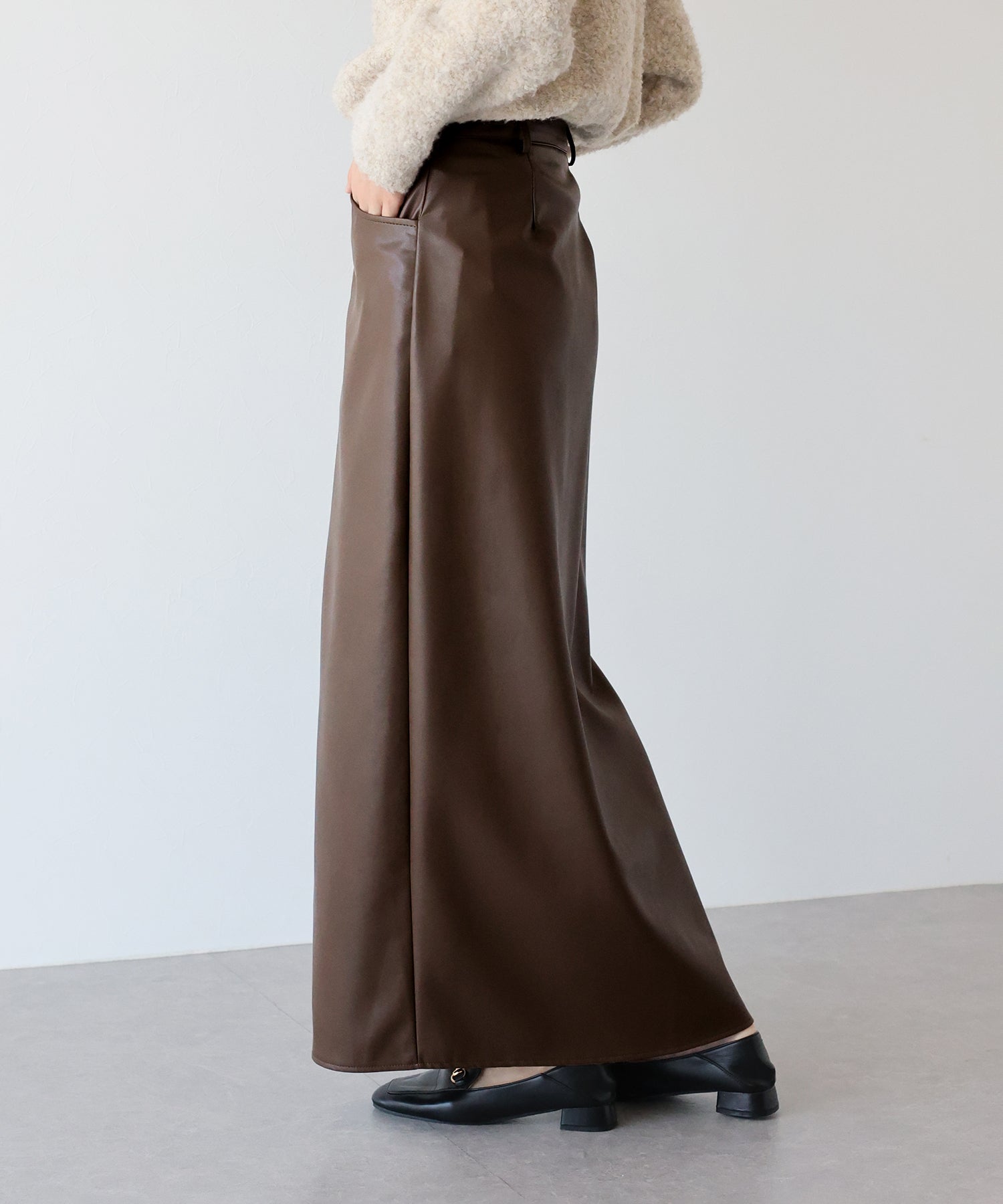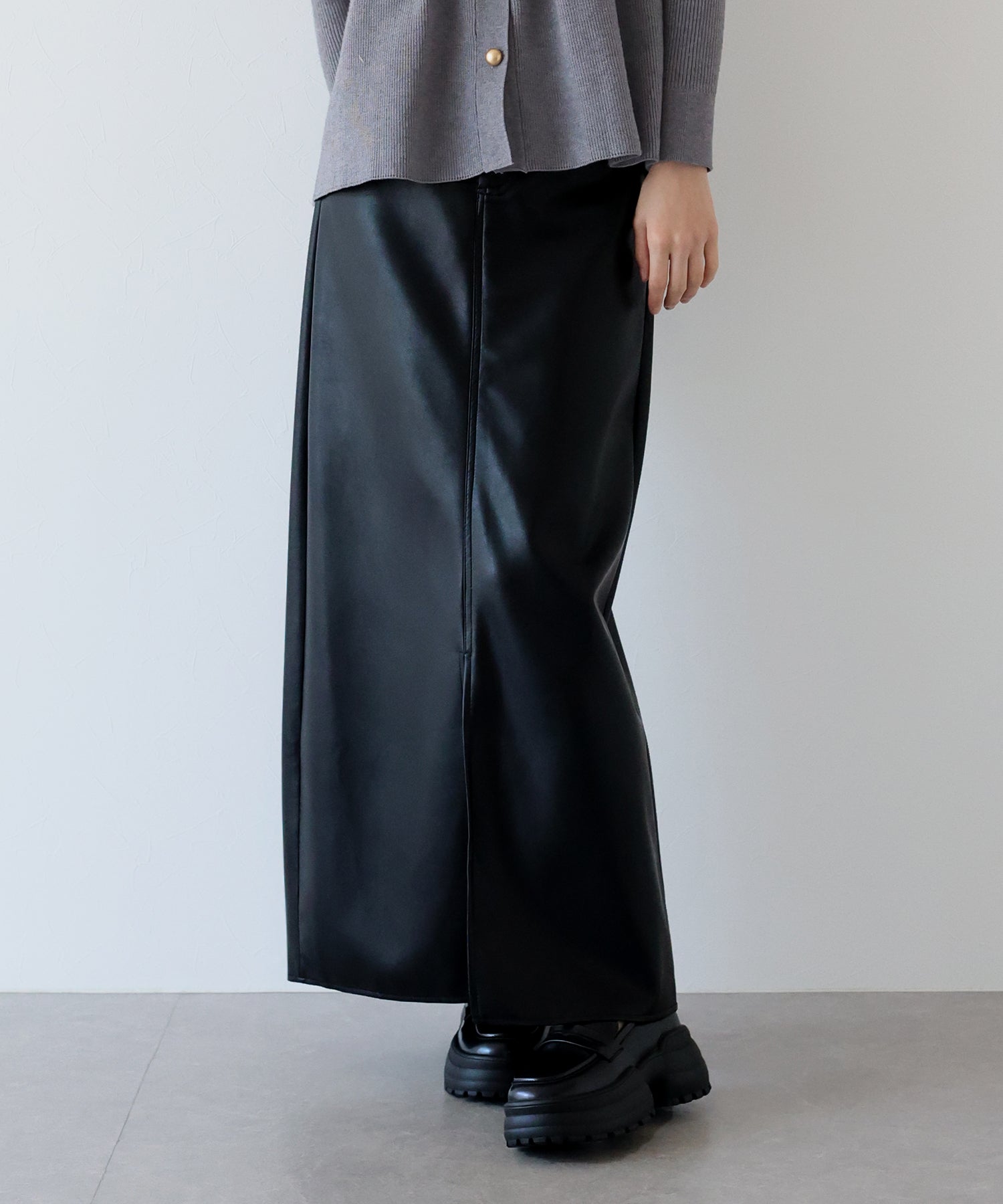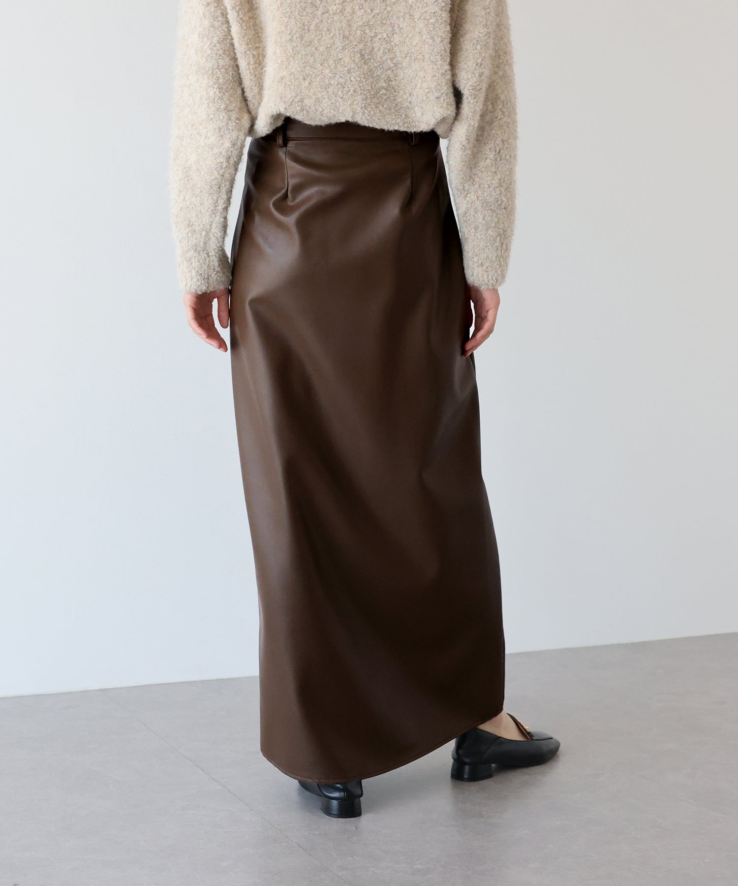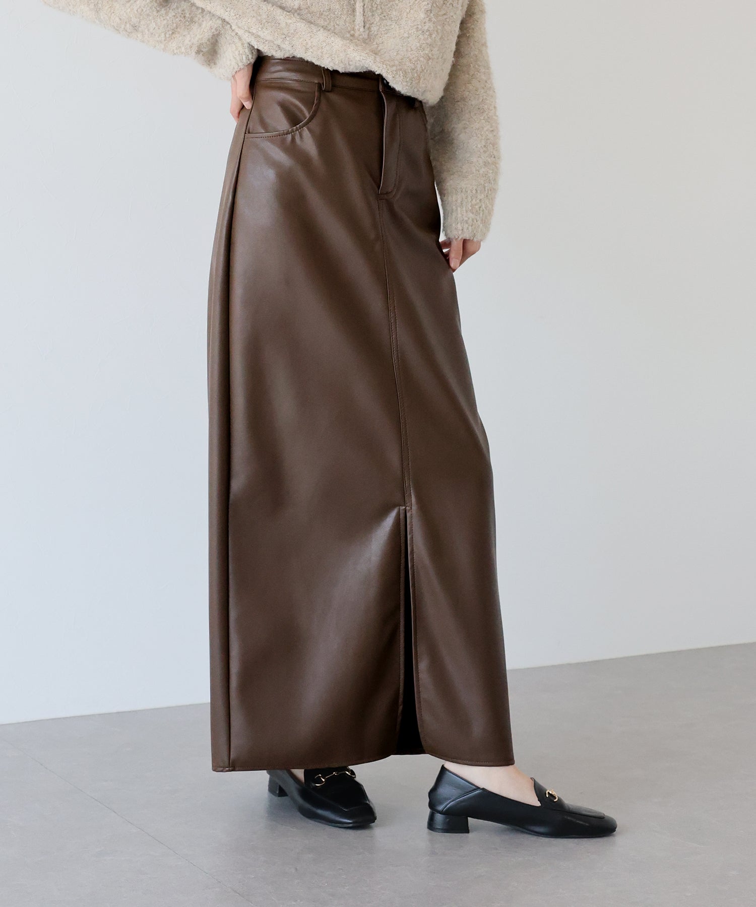 シーズンムードが高まるヴィンテージライクなレザータイトスカート ?POINT 滑らかさとしっとりとした光沢のある質感を持ち合わせたレザー素材を使用したスカート。 タイトシルエットとロング丈で大人の女性にぴったりのバランスに仕上げました。 動くたびにフロントスリットからちらっと脚が覗き、ヘルシー&抜け感のあるアクセントに。 きれいめにもカジュアルにも、様々なテイストのスタイリングが楽しめる 一着有れば重宝すること間違いなしのスカートです。