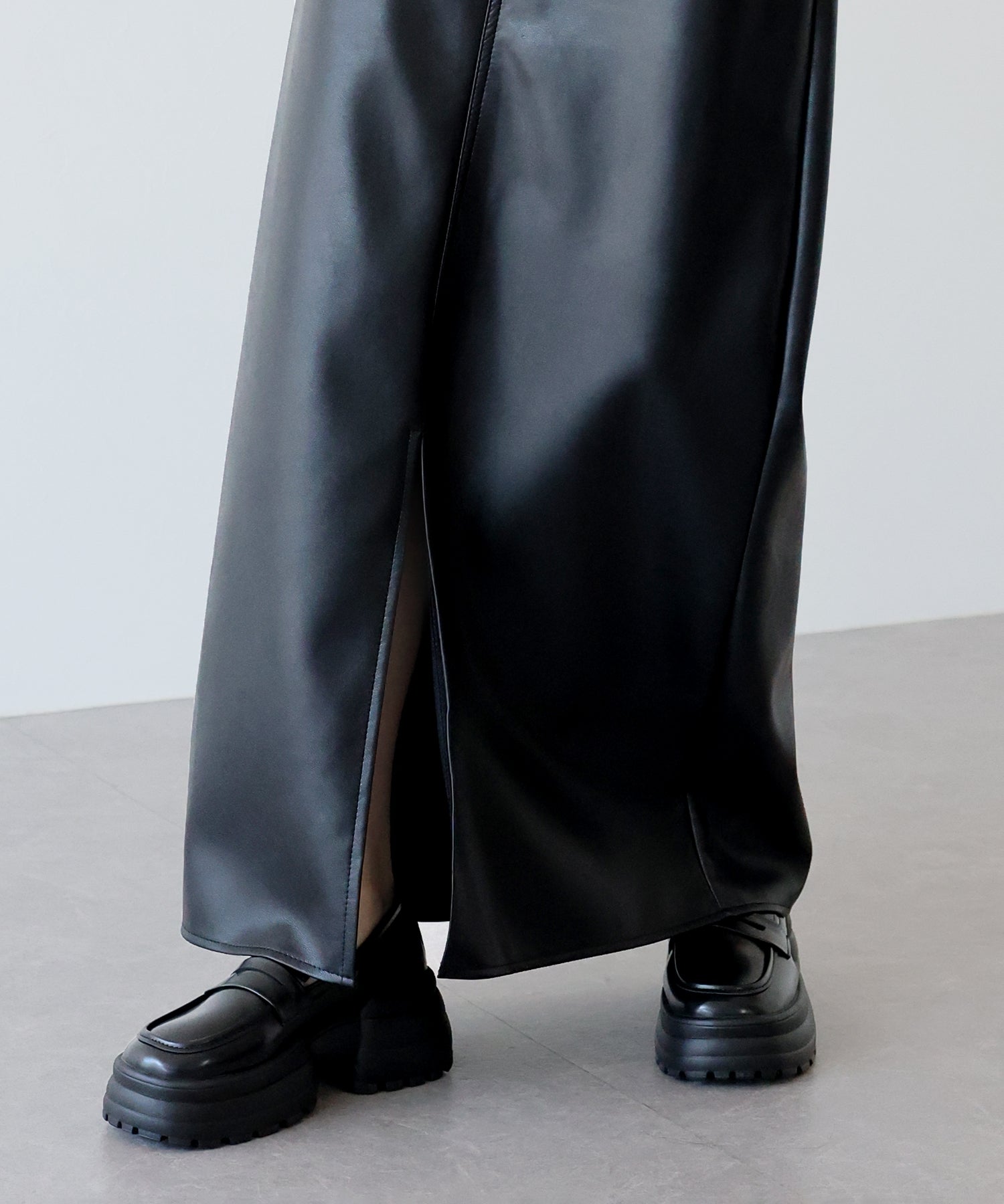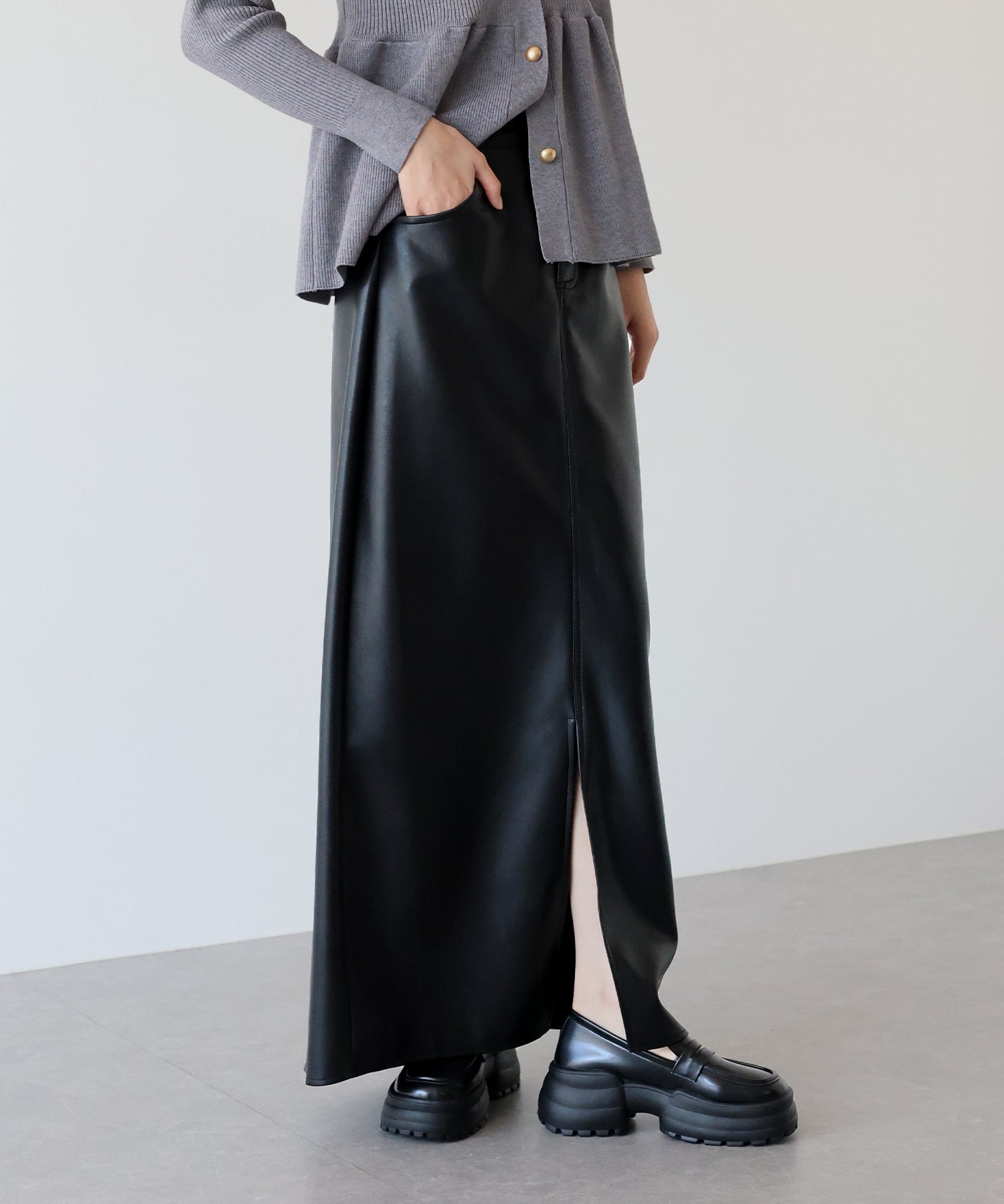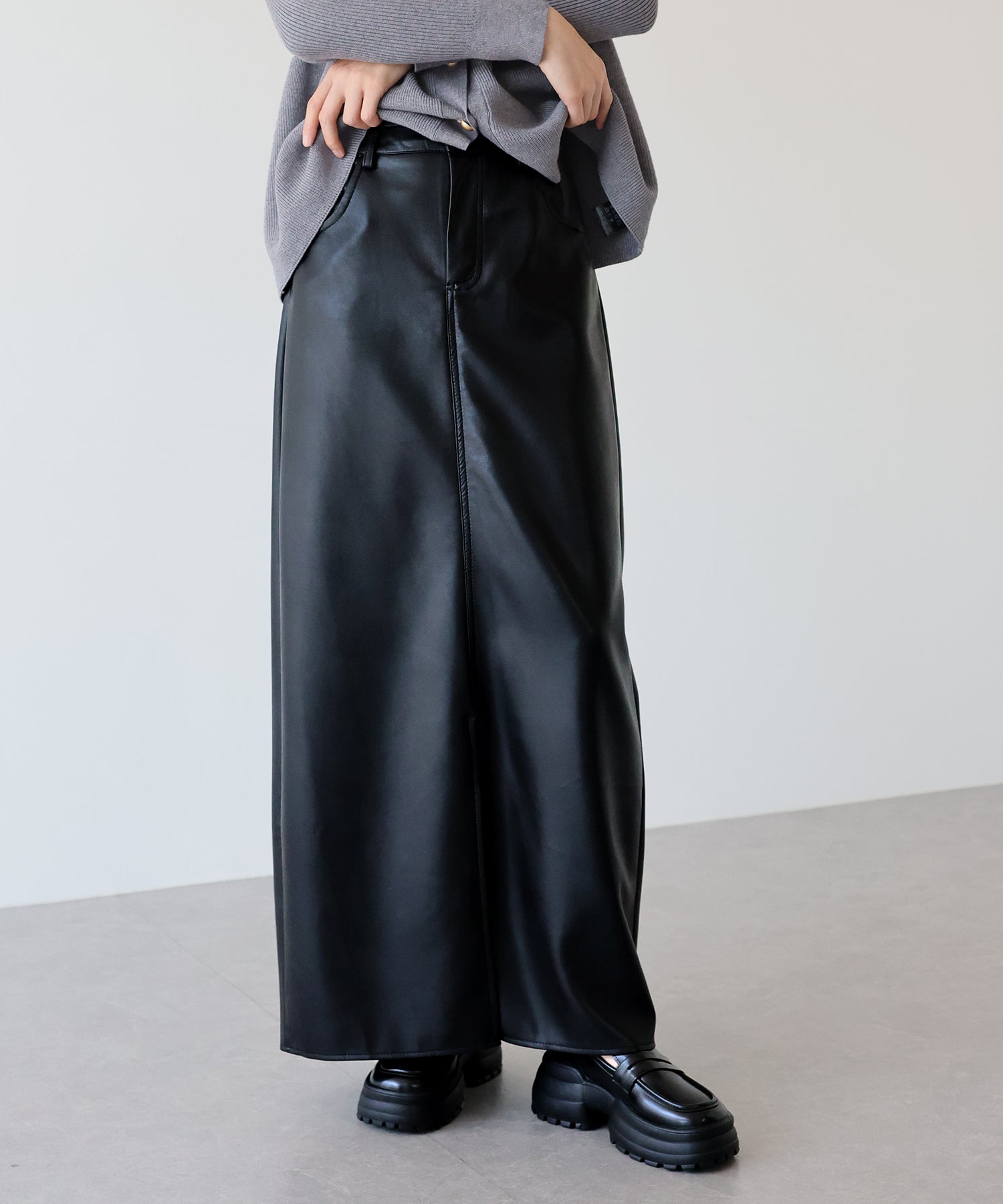 シーズンムードが高まるヴィンテージライクなレザータイトスカート ?POINT 滑らかさとしっとりとした光沢のある質感を持ち合わせたレザー素材を使用したスカート。 タイトシルエットとロング丈で大人の女性にぴったりのバランスに仕上げました。 動くたびにフロントスリットからちらっと脚が覗き、ヘルシー&抜け感のあるアクセントに。 きれいめにもカジュアルにも、様々なテイストのスタイリングが楽しめる 一着有れば重宝すること間違いなしのスカートです。