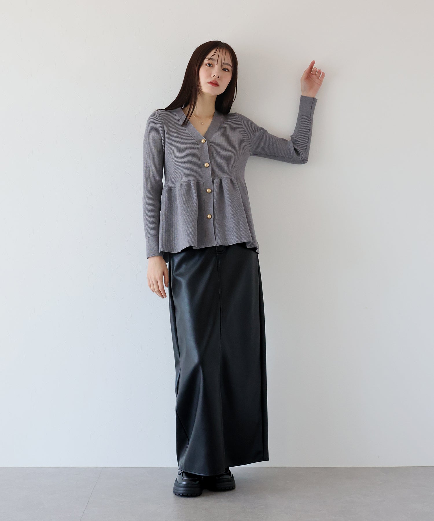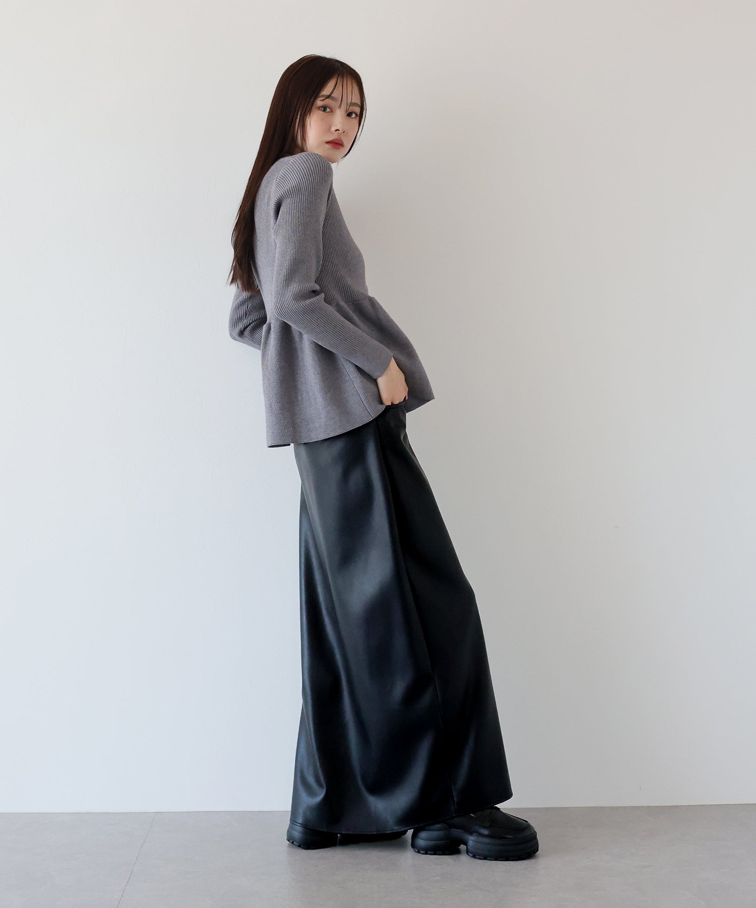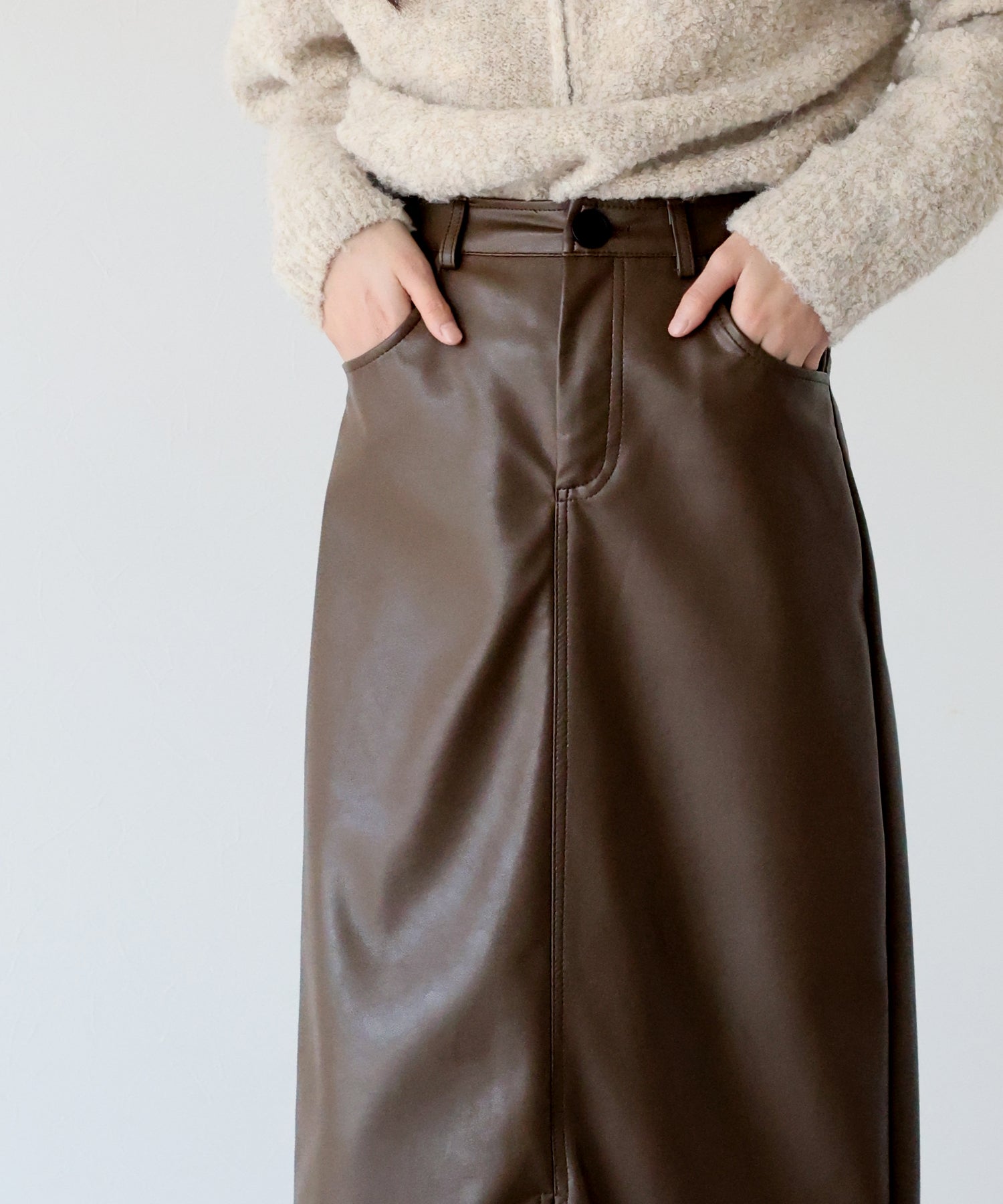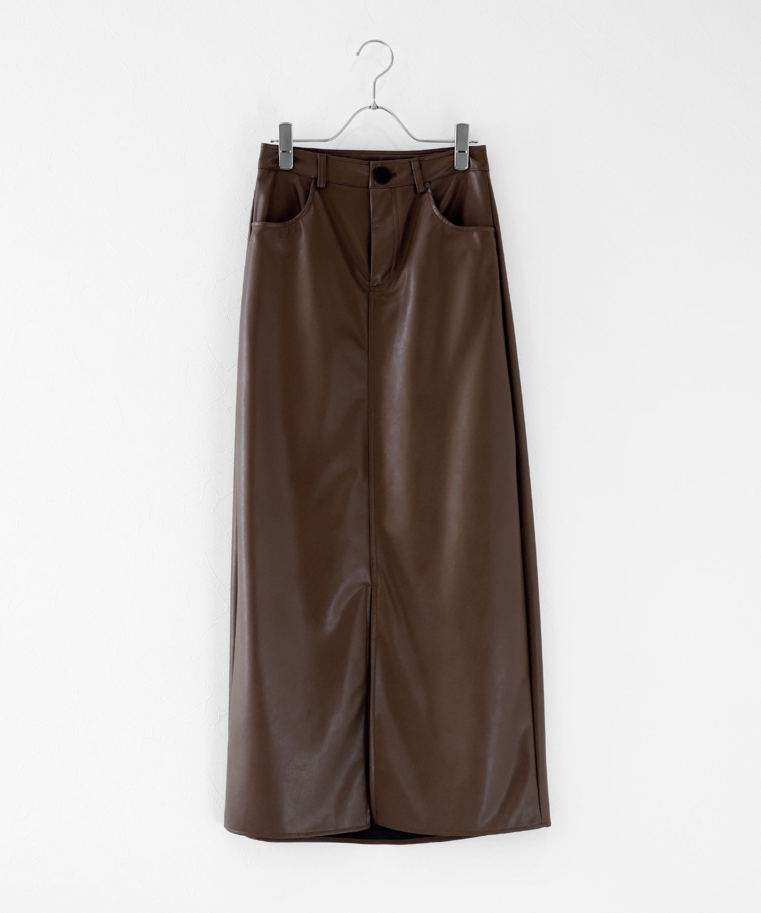 シーズンムードが高まるヴィンテージライクなレザータイトスカート ?POINT 滑らかさとしっとりとした光沢のある質感を持ち合わせたレザー素材を使用したスカート。 タイトシルエットとロング丈で大人の女性にぴったりのバランスに仕上げました。 動くたびにフロントスリットからちらっと脚が覗き、ヘルシー&抜け感のあるアクセントに。 きれいめにもカジュアルにも、様々なテイストのスタイリングが楽しめる 一着有れば重宝すること間違いなしのスカートです。