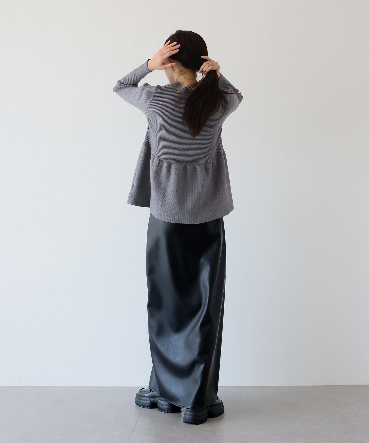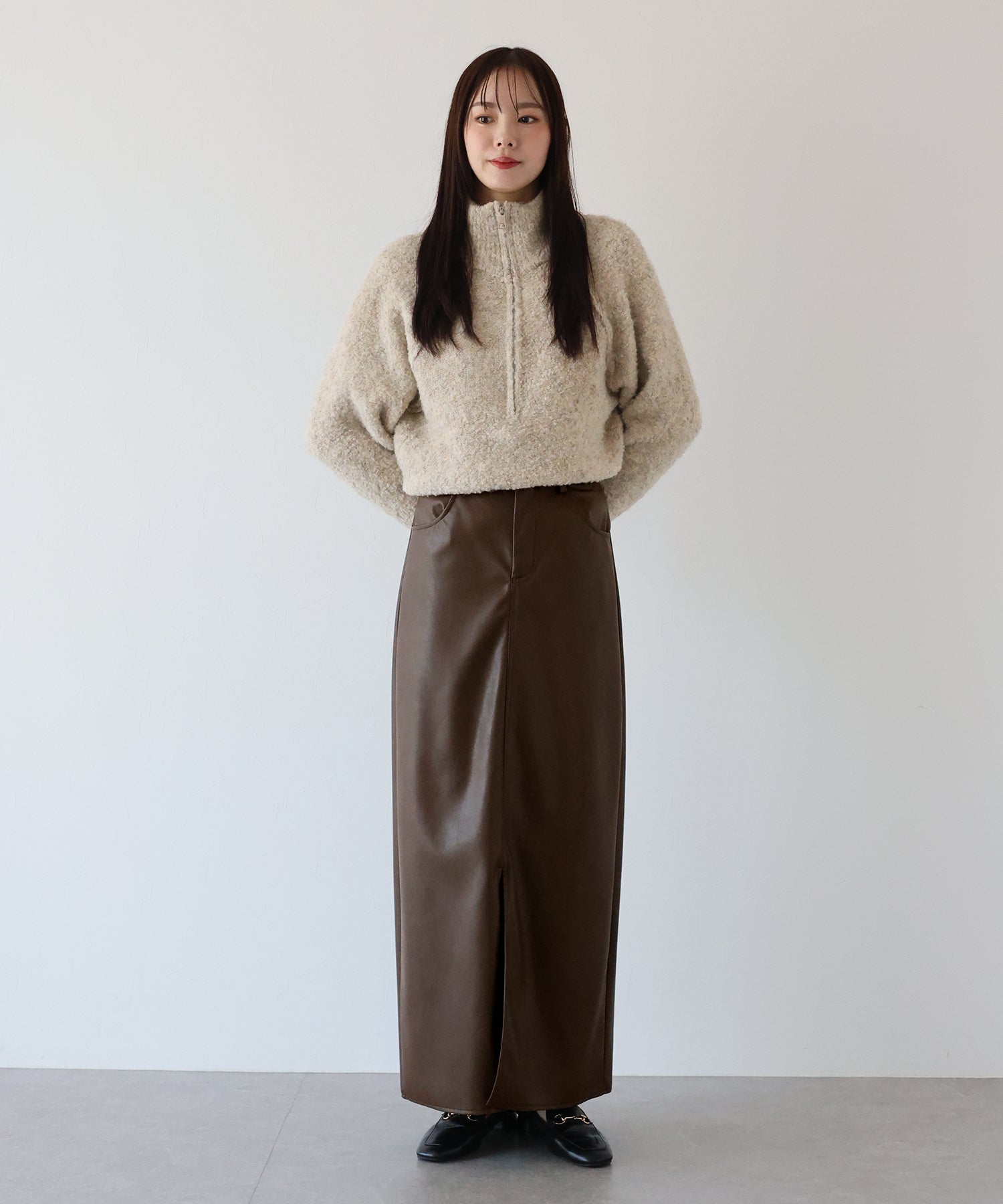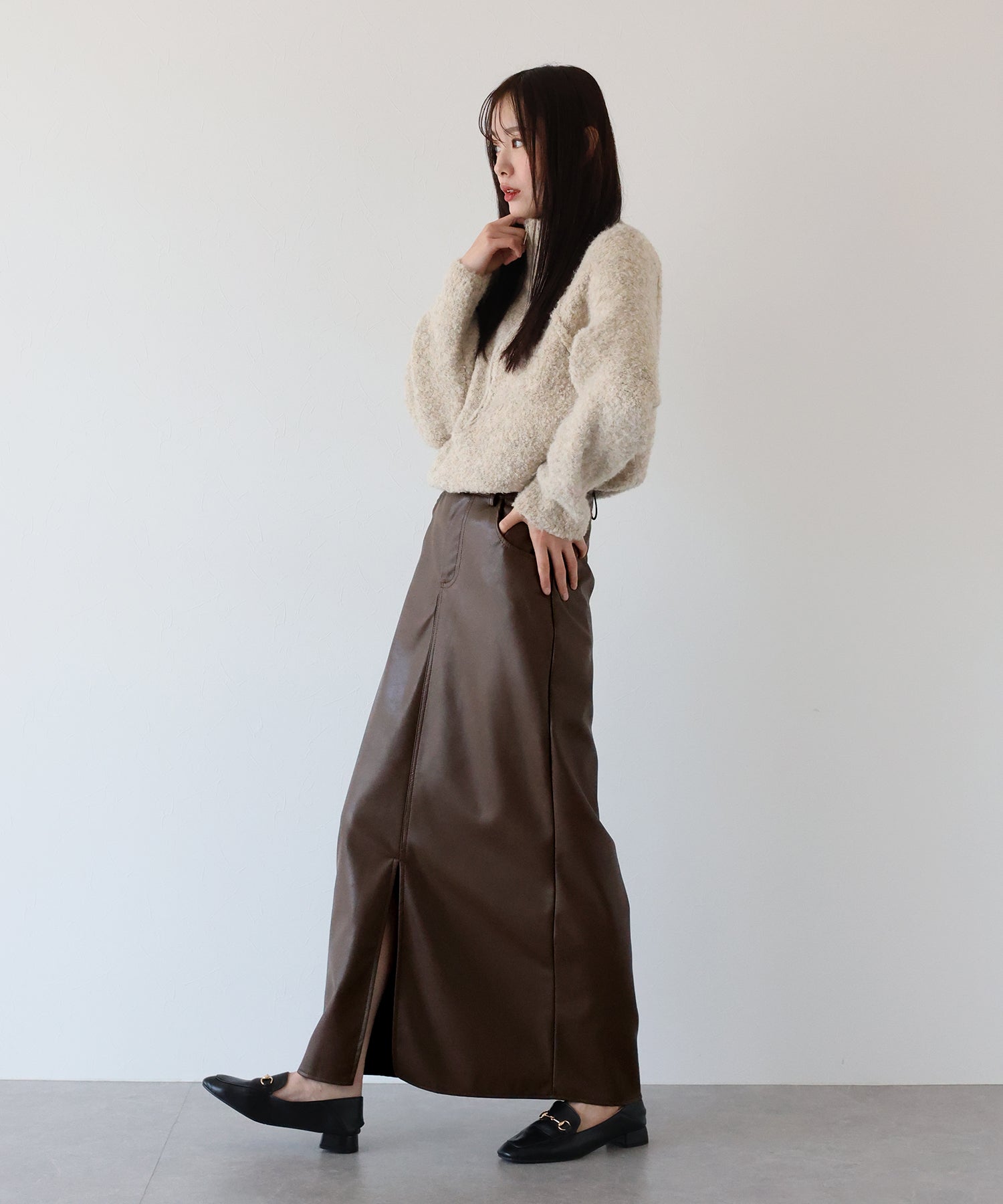 ?STYLING シンプルなニットやシャツを合わせるだけで、異素材ミックス のワンランク上のスタイリングが完成します。 短め丈のトップスと合わせるとバランスがとれたコーディネートに◎ カジュアルなアイテムはもちろん、メンズライクな印象のレザーなので キレイめなハイネックニットや流行のフェザーニットを合わせてコーデを甘辛MIXに仕上げるのも◎ 幅広いアイテムと相性が良く、デイリーお出かけ用として多様なシーンにお使いいただけます。
