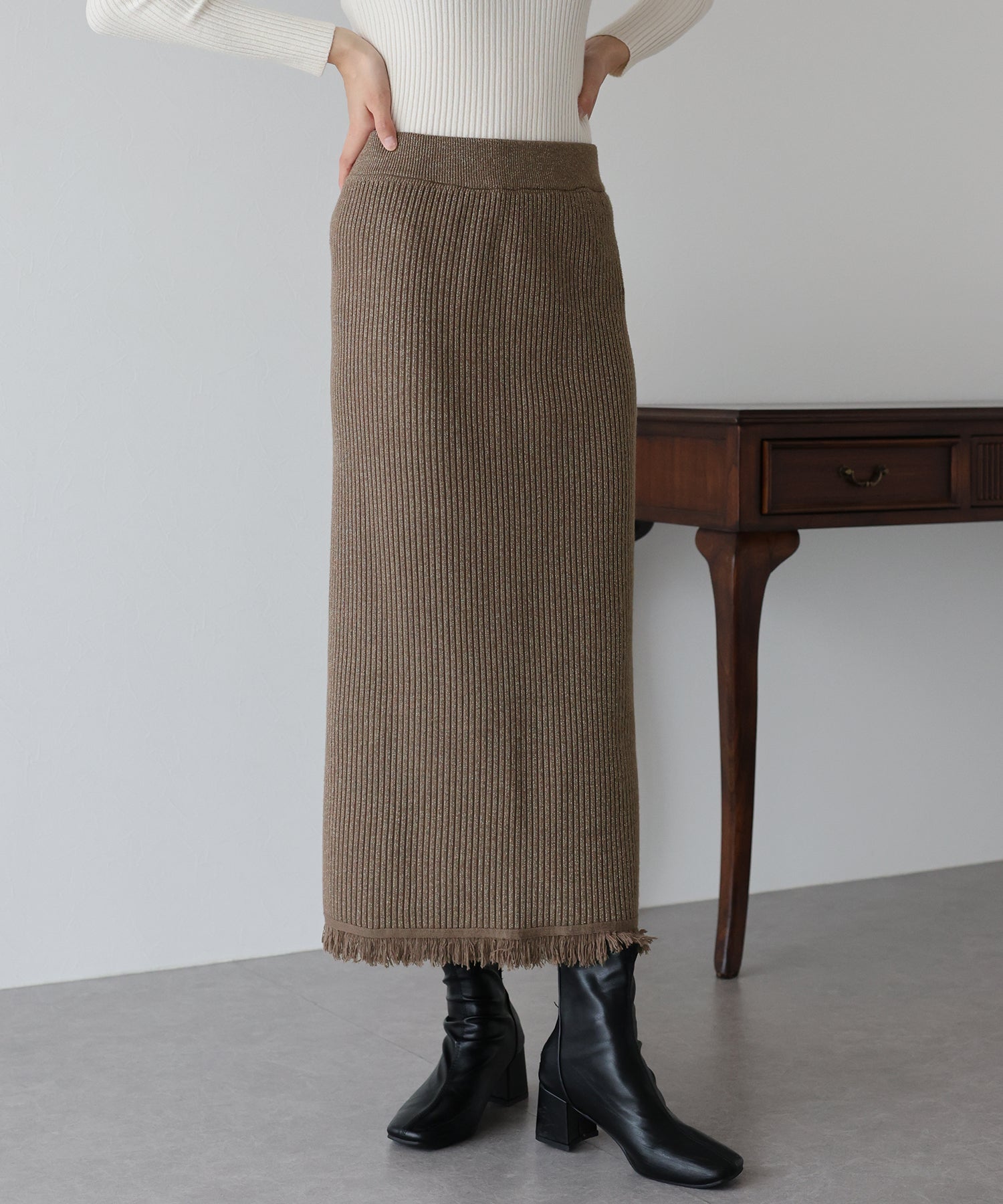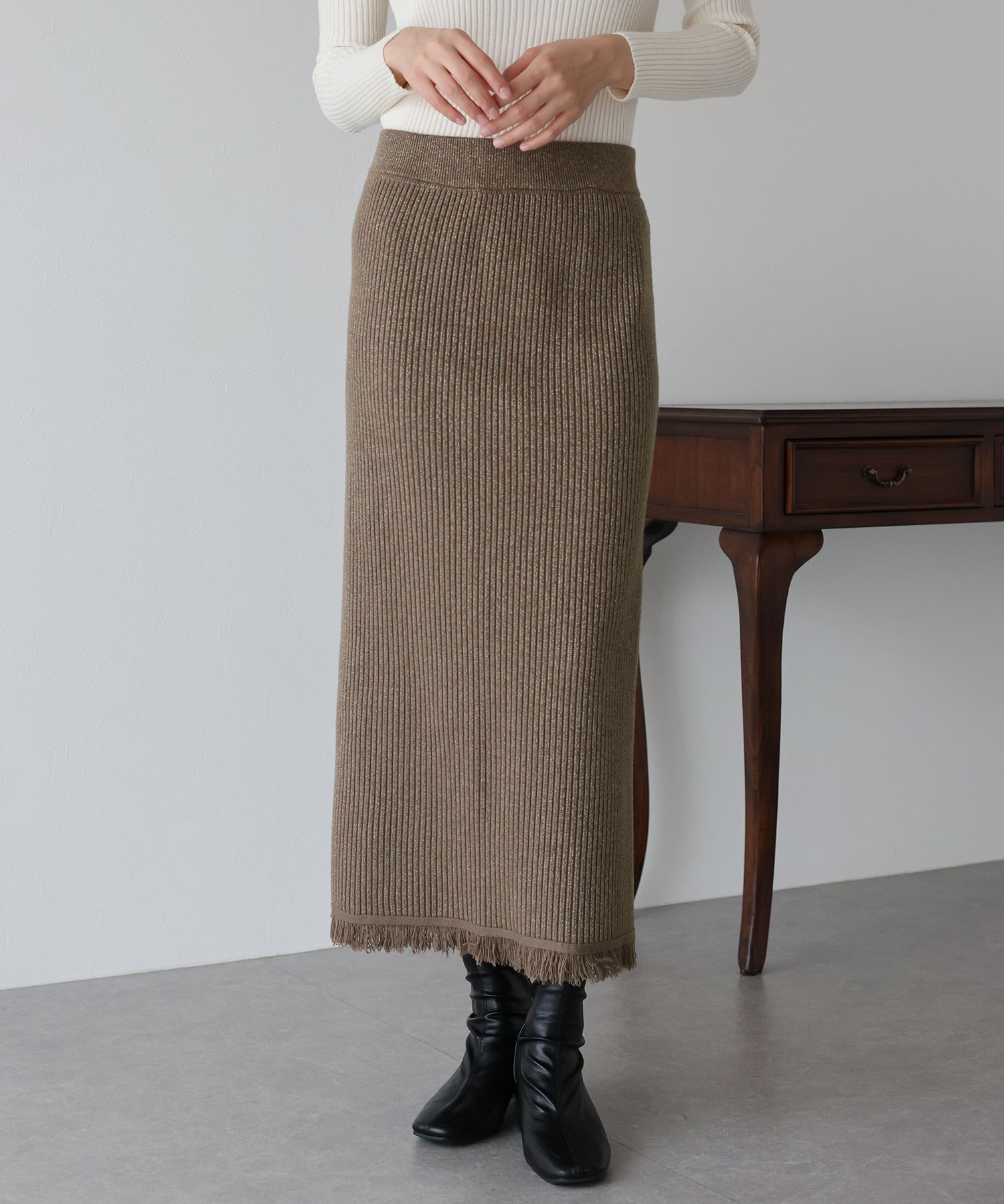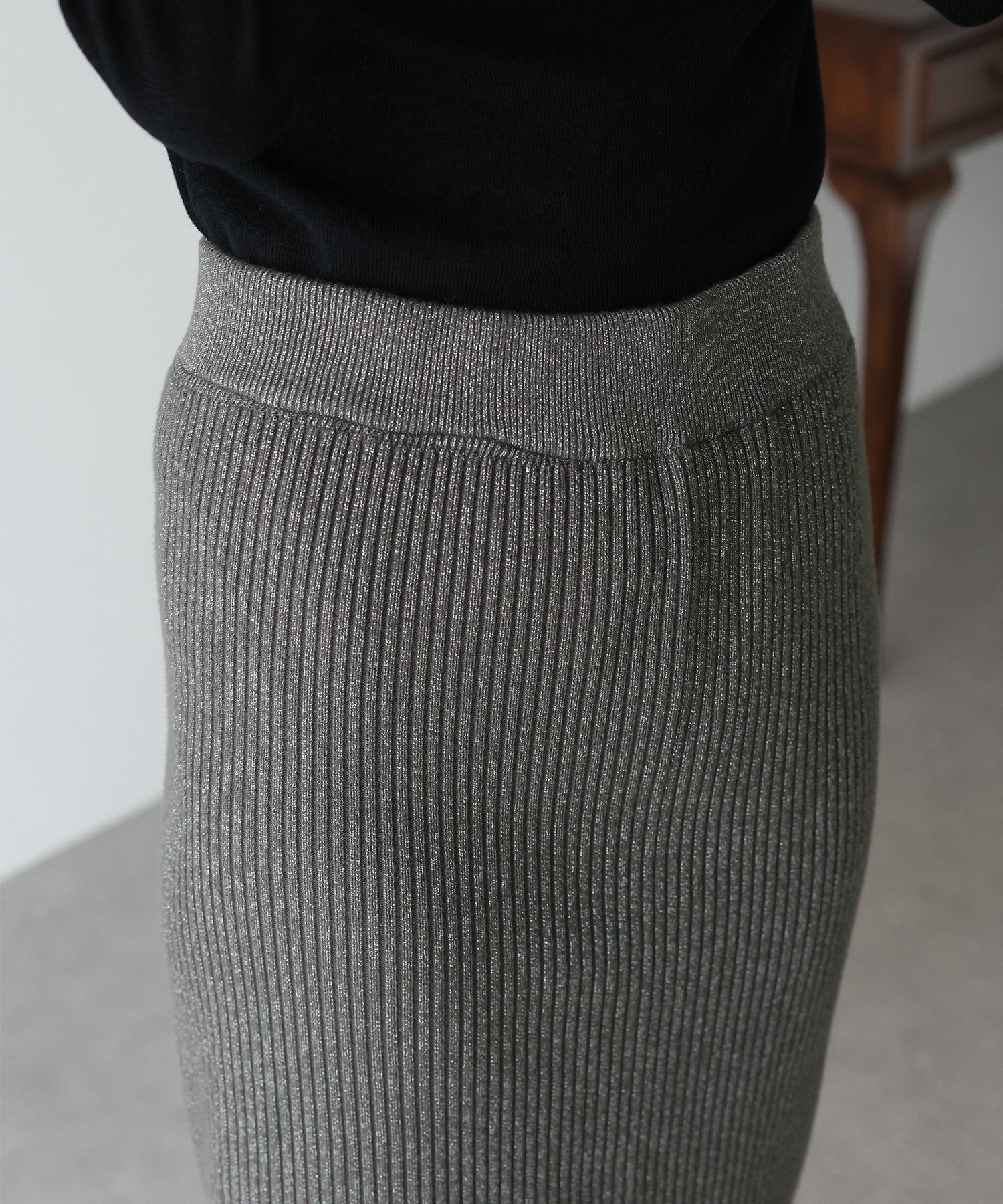 細かなリブの素材感で縦のラインを強調し、スッキリとした女性らしいラインを引き出してくれます。