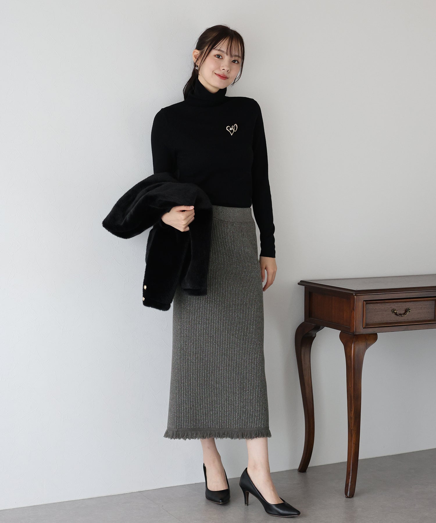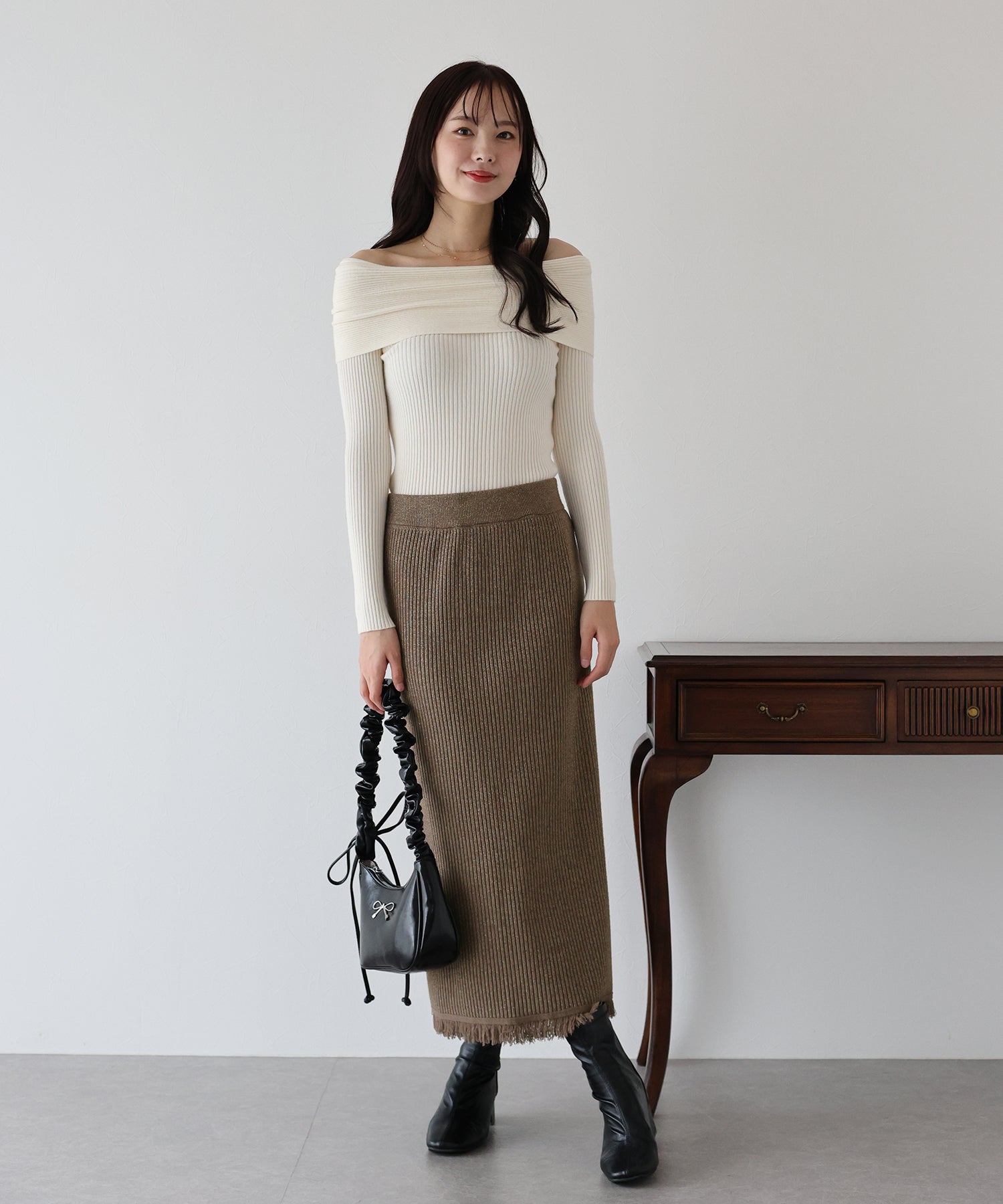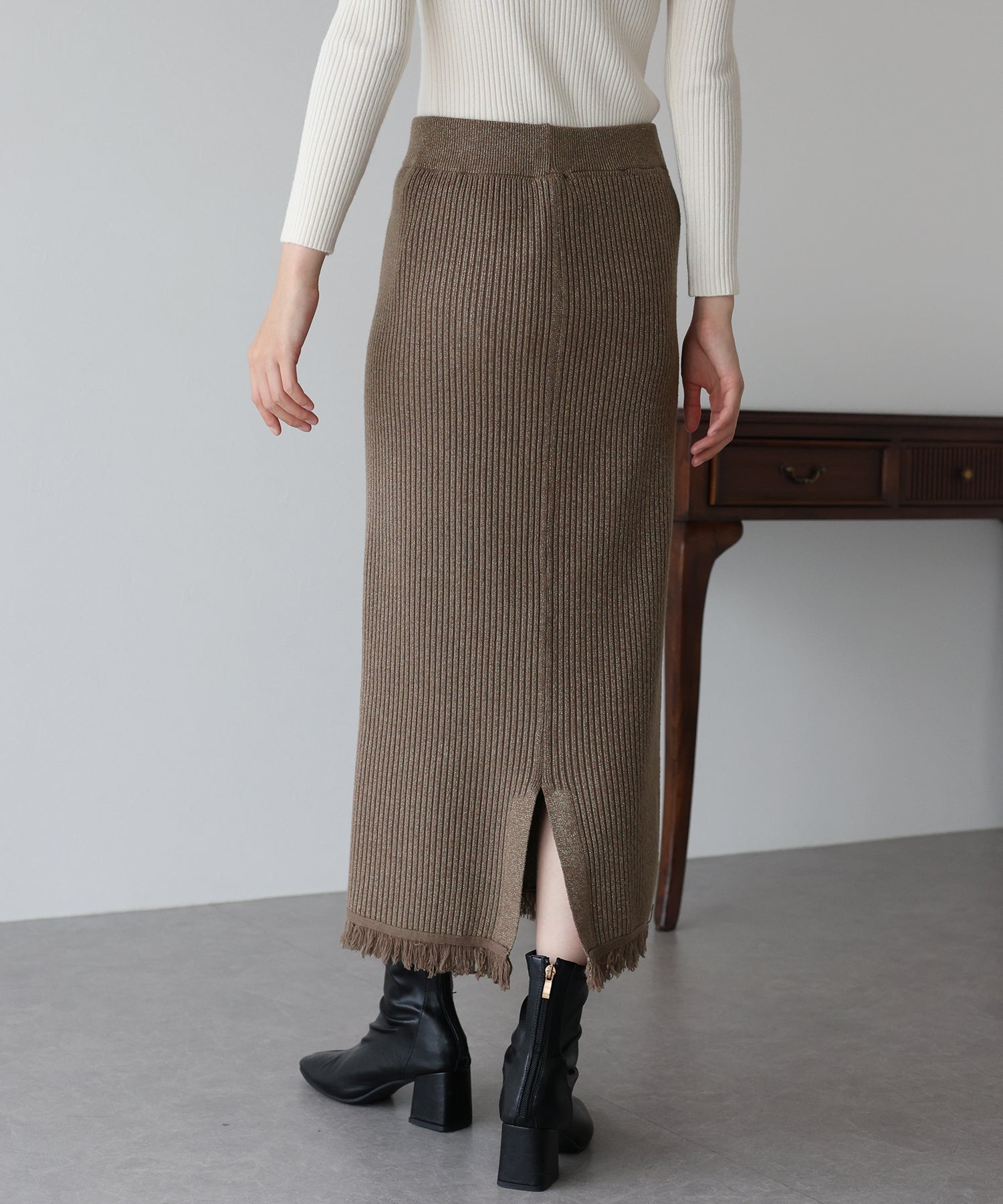 細かなリブの素材感で縦のラインを強調し、スッキリとした女性らしいラインを引き出してくれます。